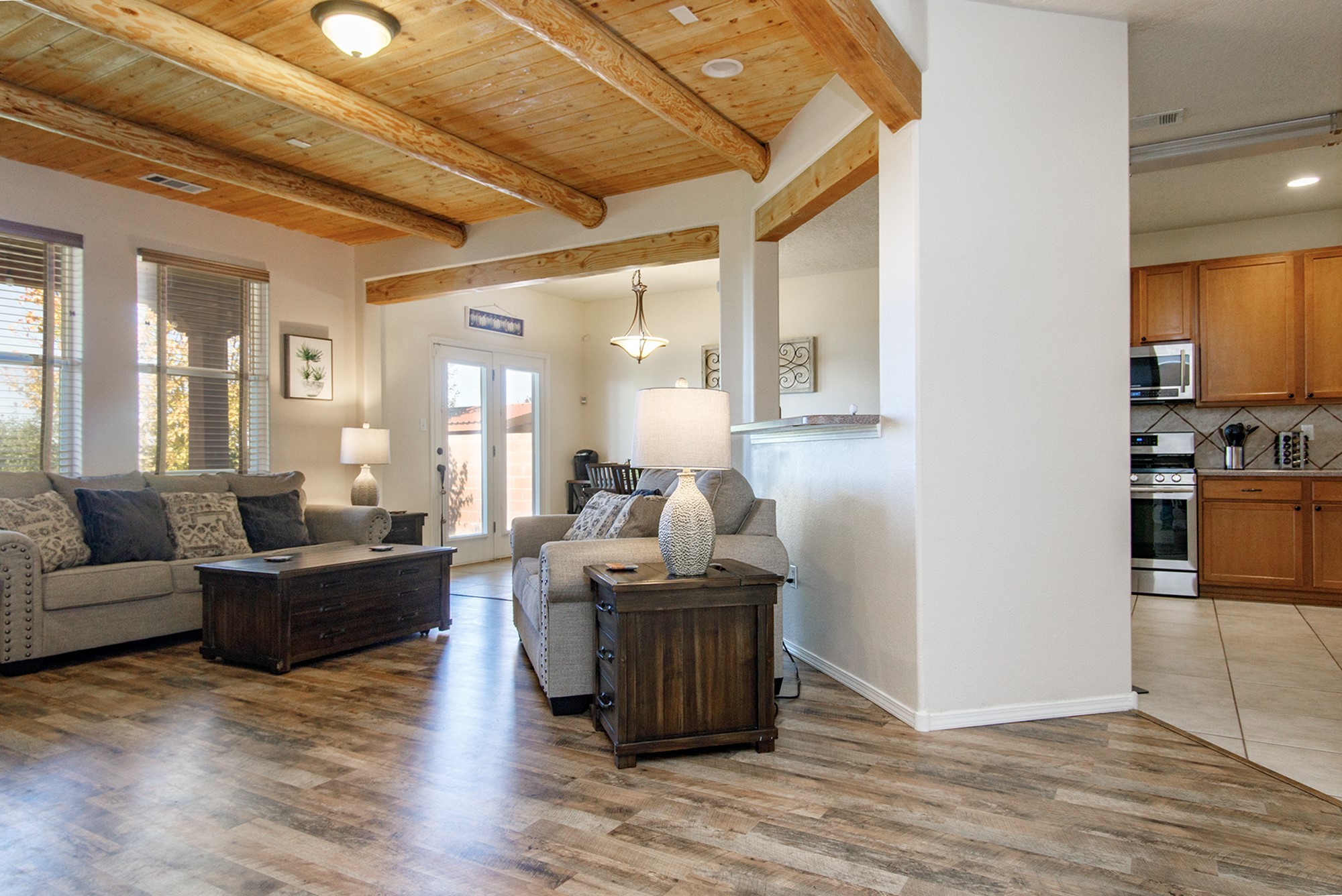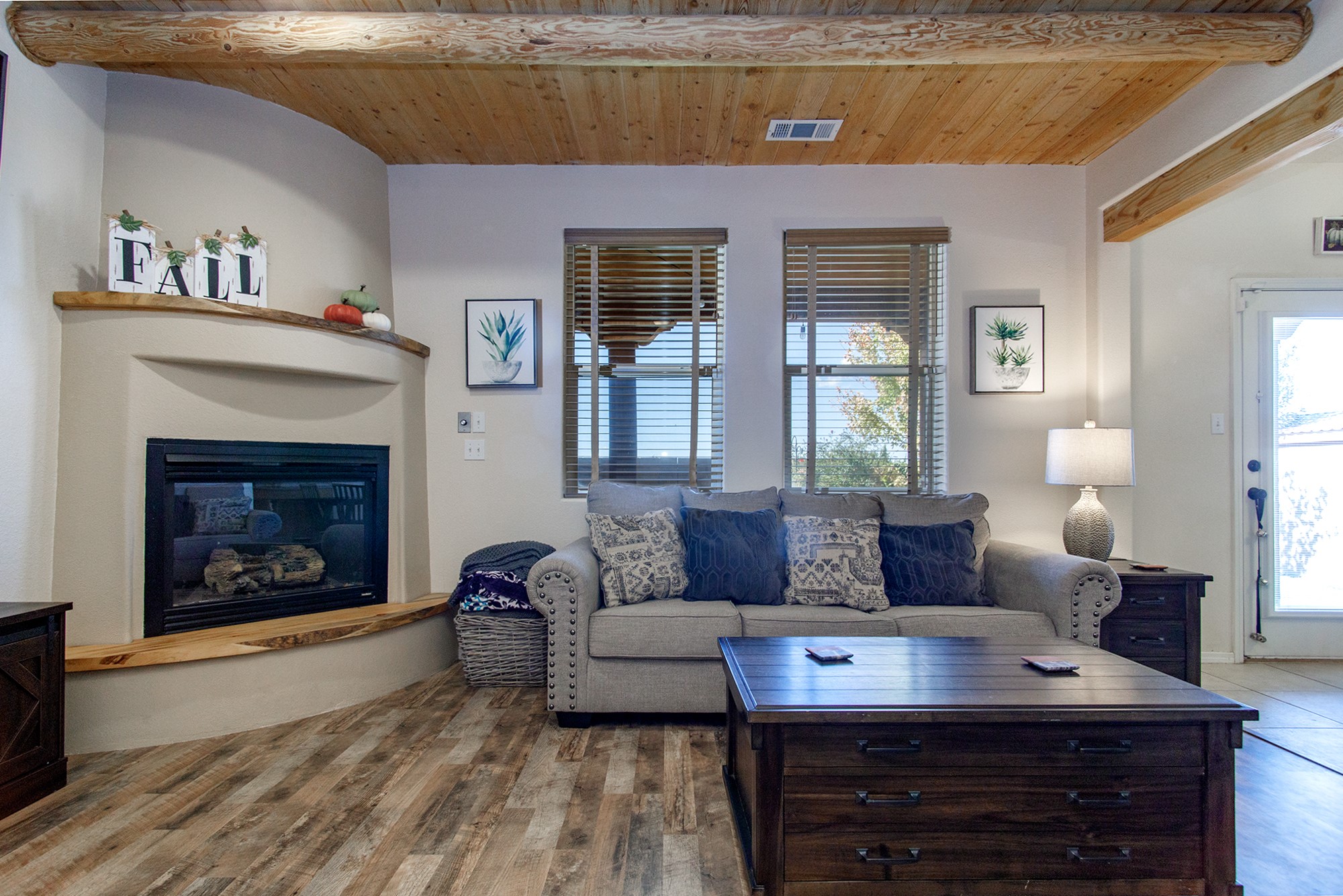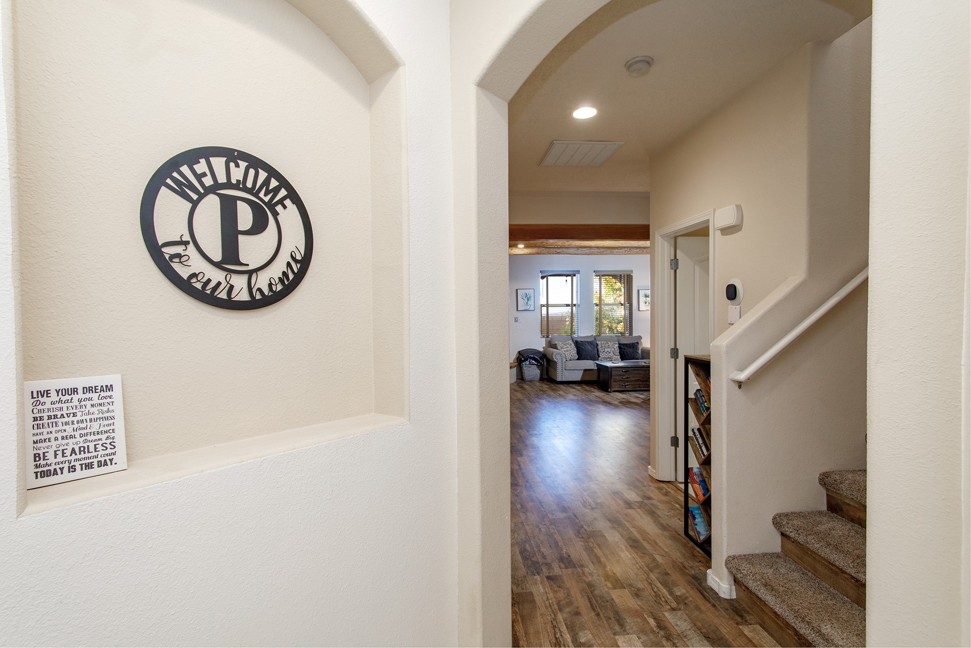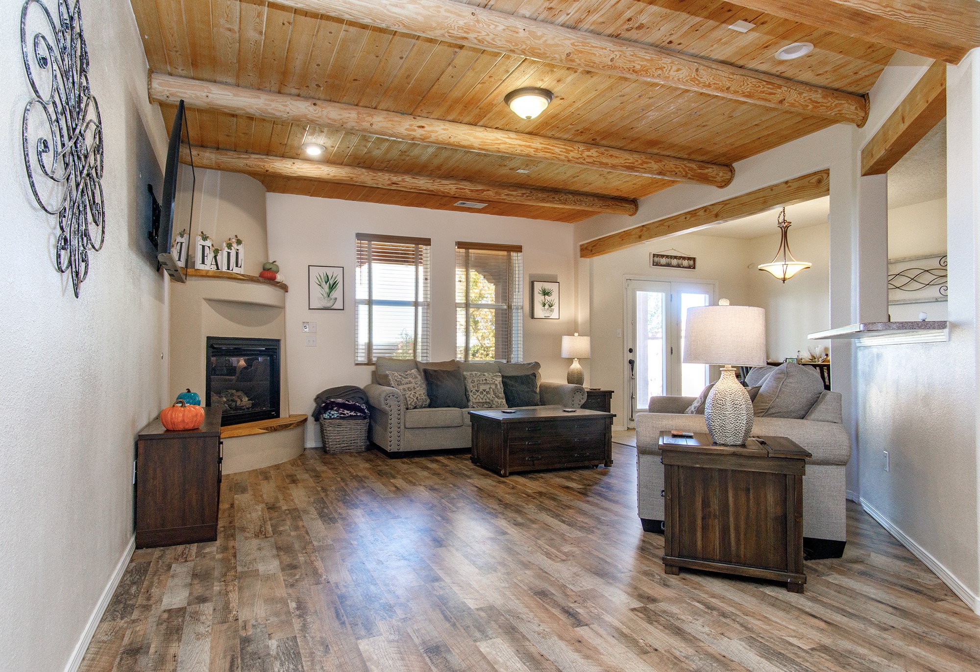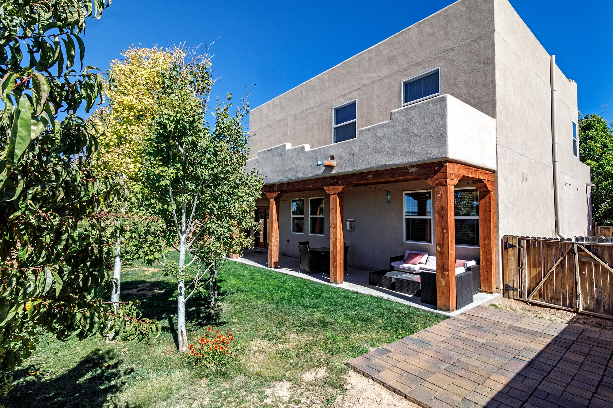 Pristine 4bedroom/3bath home in the heart of Santa Fe. This immaculate home has high ceilings with vigas, a kiva fireplace and all the Santa Fe charm you desire. The kitchen is second to none with tons of space and cabinets. The open floor plan is great for entertaining. Enjoy your days and evening sunsets in the fully landscaped back yard with a gorgeous high end portal. Great separation between the bedrooms. The huge primary suite is situated on the first level and 3 bedrooms plus a den are located on the 2nd level. This exceptional shows like a model home and is near shopping, groceries, public transportation, restaurants, and schools.