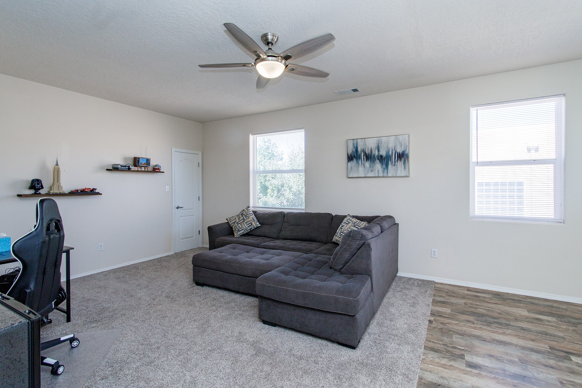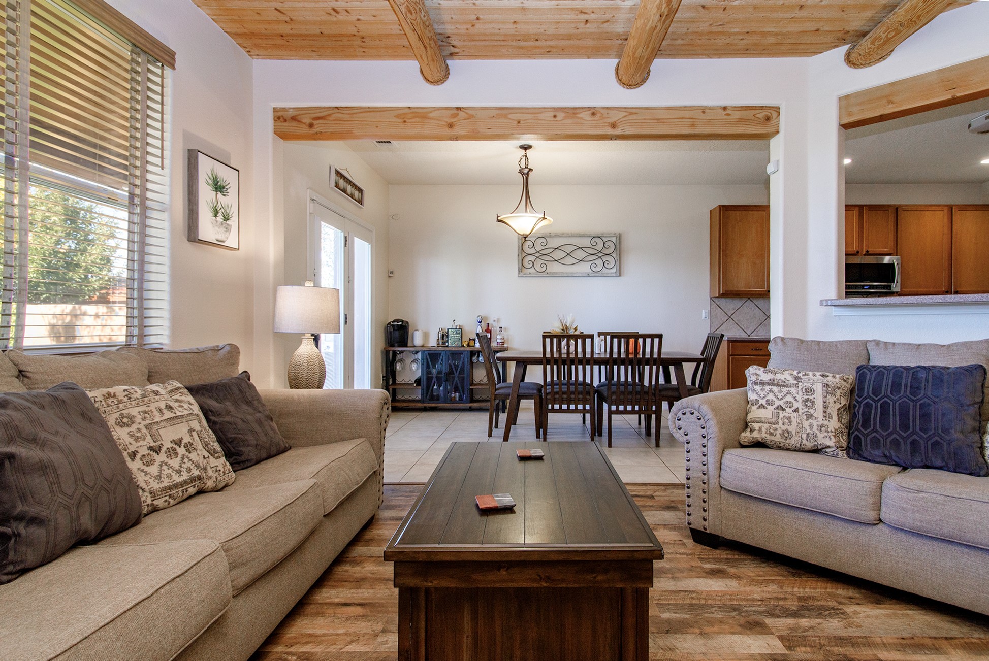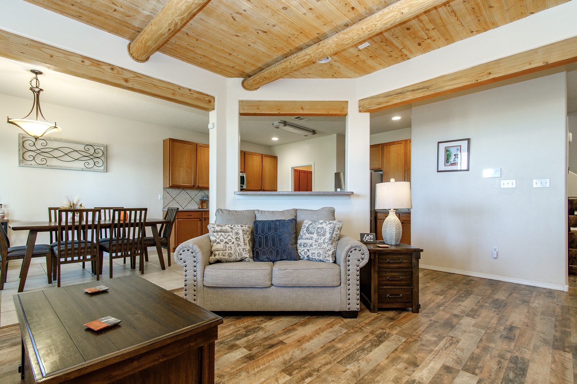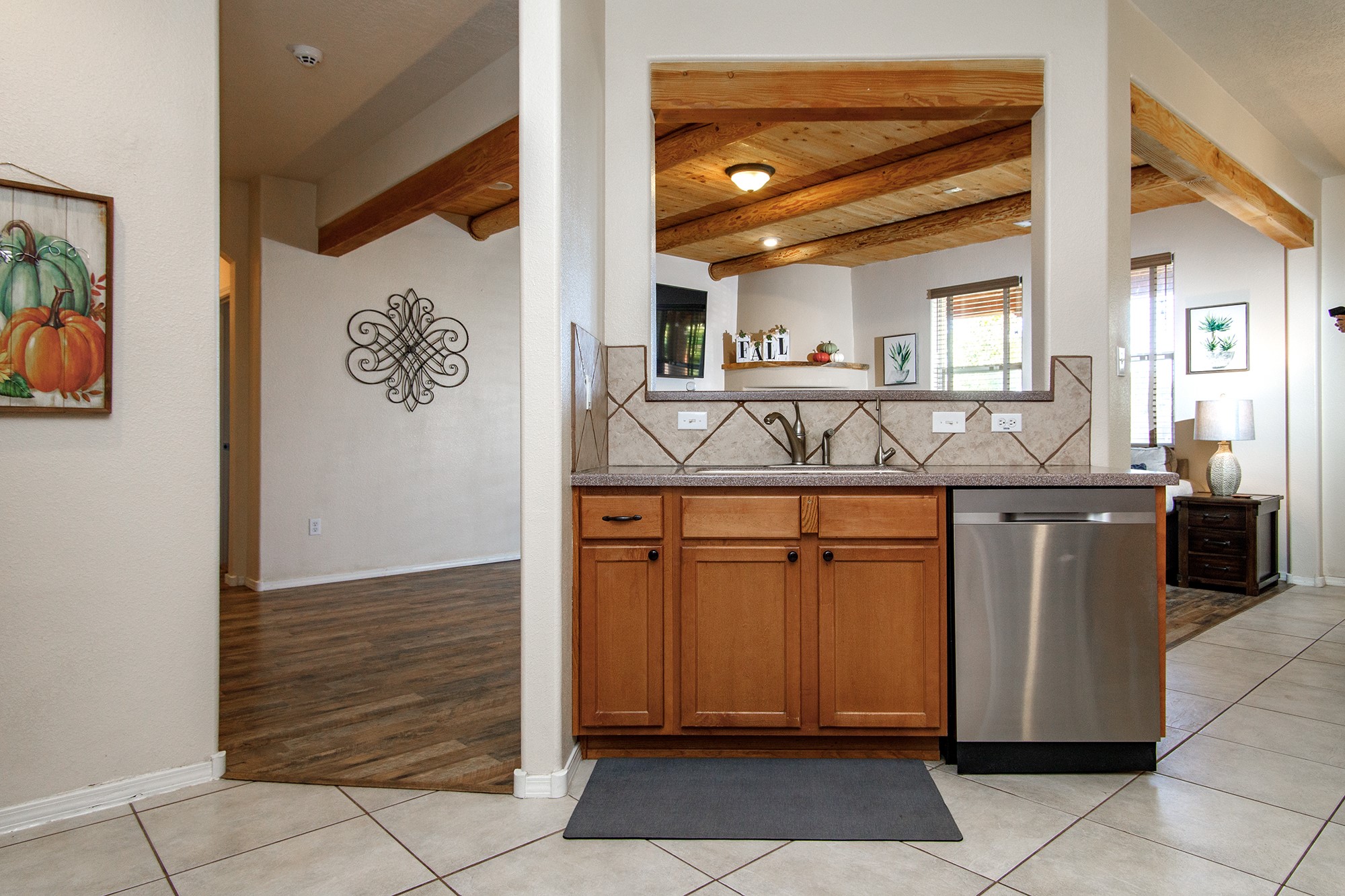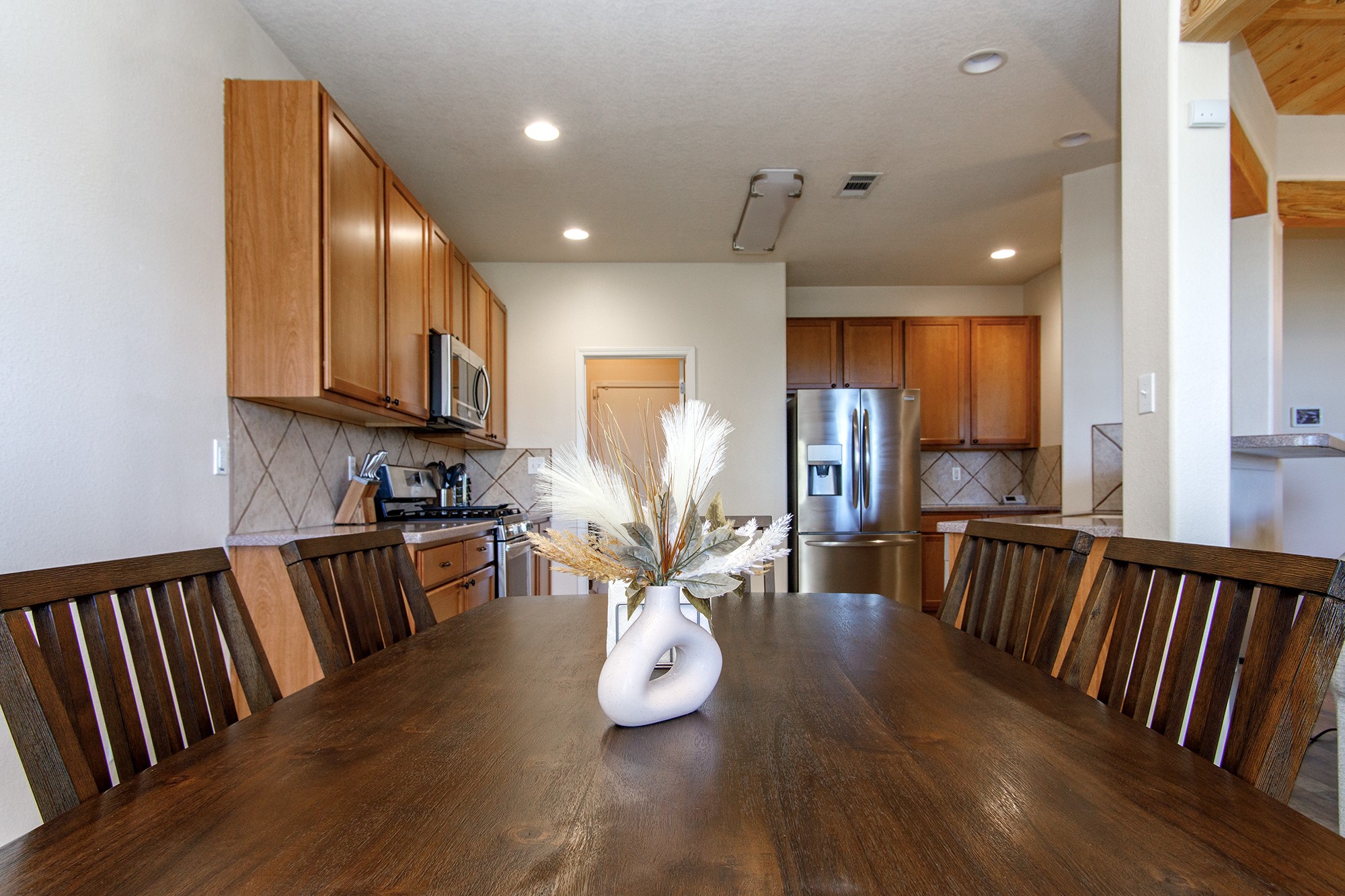 Pristine 4bedroom/3bath home in the heart of Santa Fe. This immaculate home has high ceilings with vigas, a kiva fireplace and all the Santa Fe charm you desire. The kitchen is second to none with tons of space and cabinets. The open floor plan is great for entertaining. Enjoy your days and evening sunsets in the fully landscaped back yard with a gorgeous high end portal. Great separation between the bedrooms. The huge primary suite is situated on the first level and 3 bedrooms plus a den are located on the 2nd level. This exceptional shows like a model home and is near shopping, groceries, public transportation, restaurants, and schools.