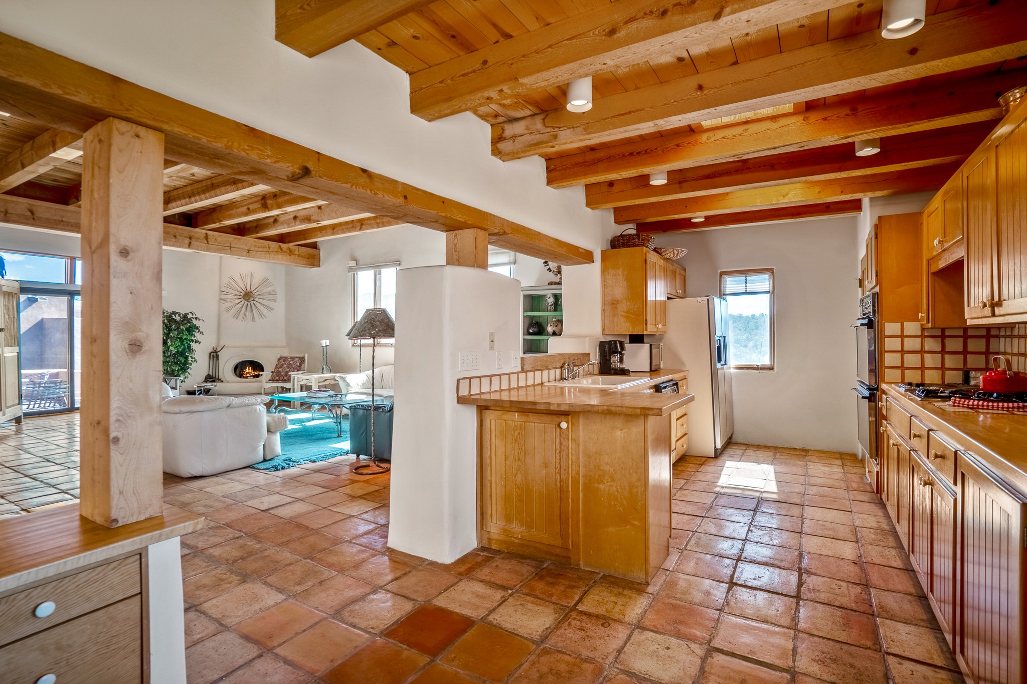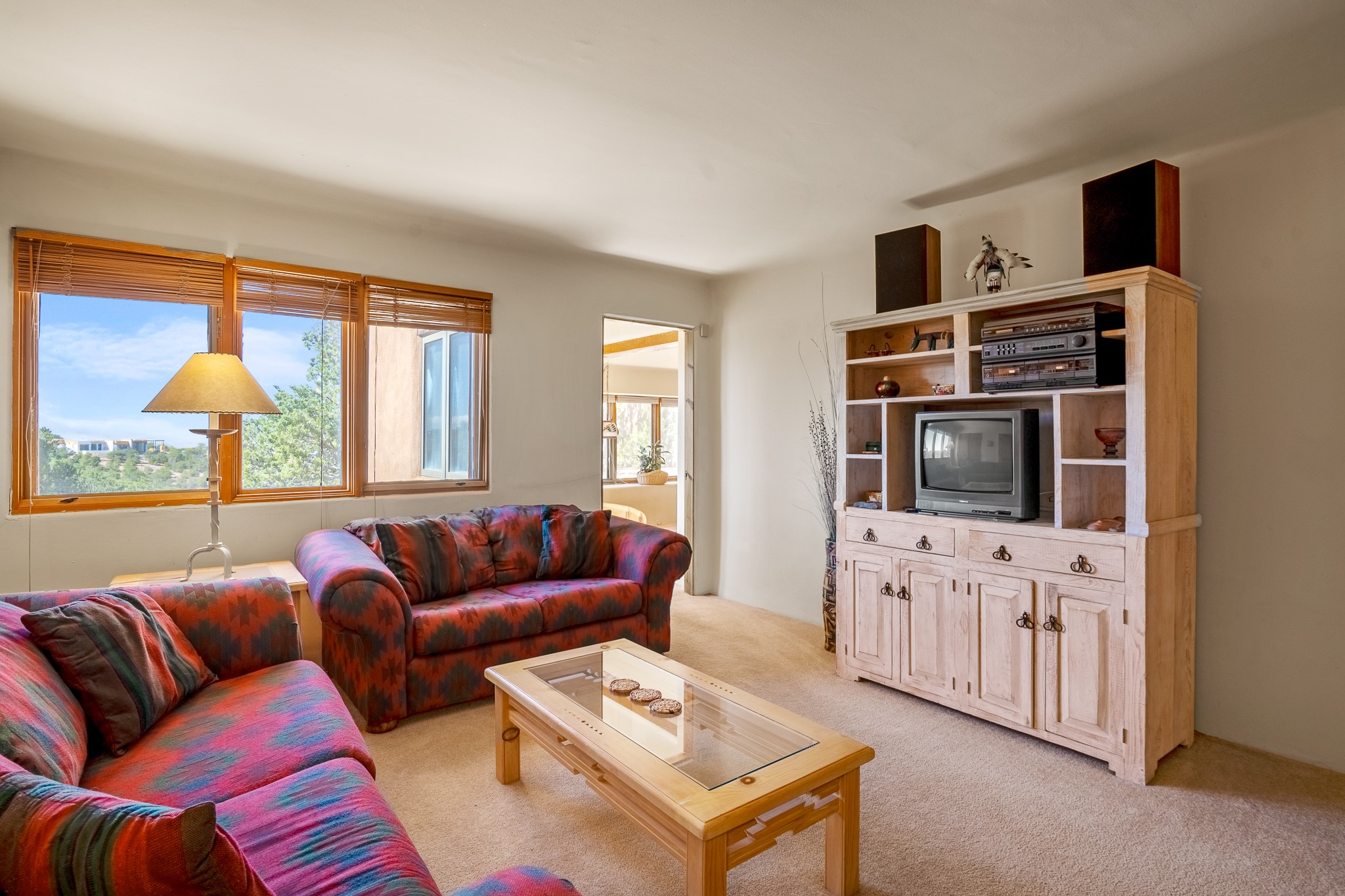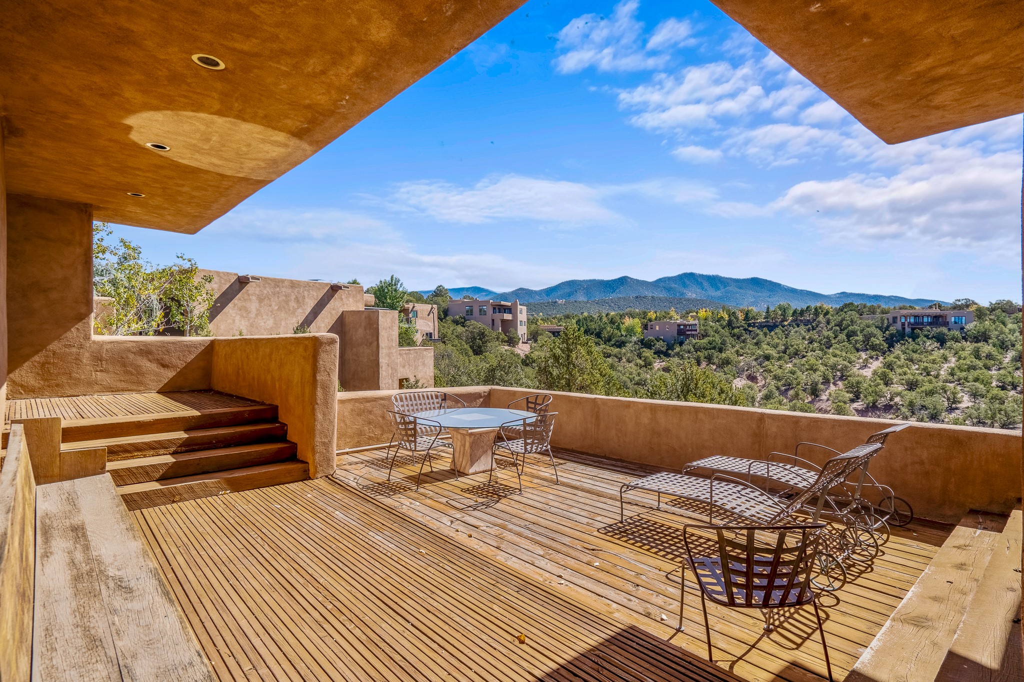 Just minutes from the plaza, this spacious home offers breathtaking views while providing unsurpassed comfort. High beamed ceilings and Saltillo tile floors, accented by abundant sunlight provide you with the warmth of the rich Santa Fe Culture. Over 3,100 square feet of floor space feature open living space on the main level with additional rooms, bathroom and den/play area for kids or entertaining guests. Two decks, one with a private courtyard and hot tub and the other offering fantastic views of the Sangre de Cristo mountains, expand upon the awe-inspiring living experience this condo offers. With a two-car garage, central A/C and heating, manicured grounds, and gated access, this property is an incredible opportunity for the discerning buyer.