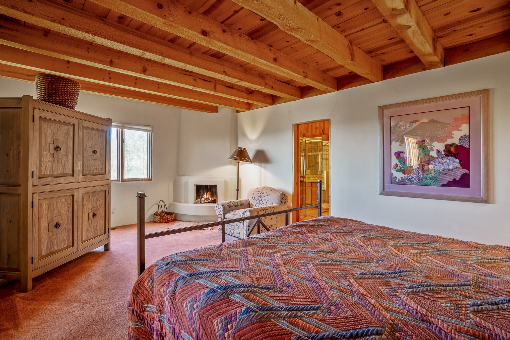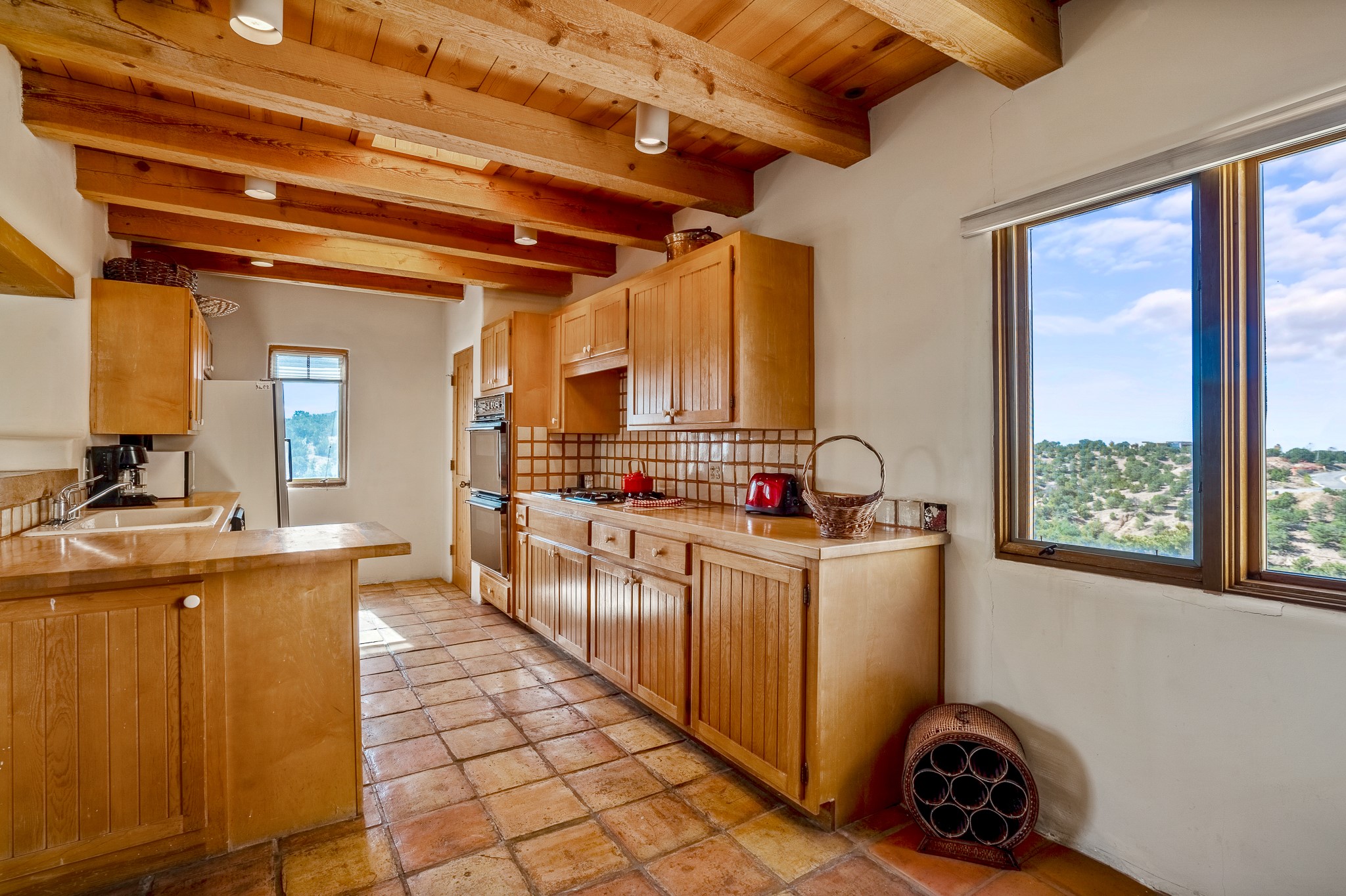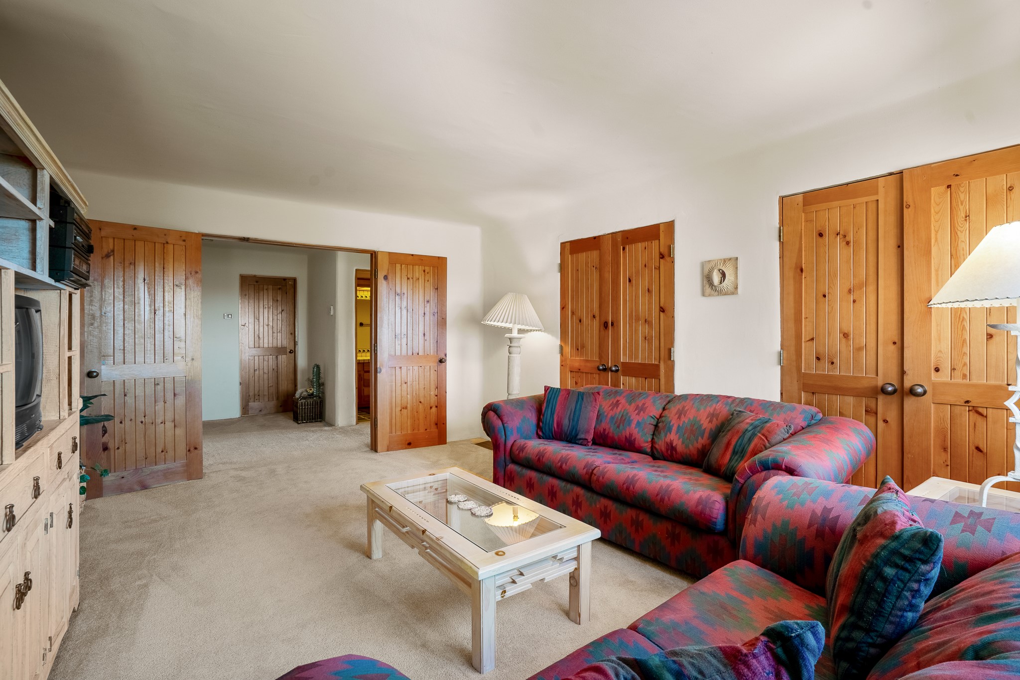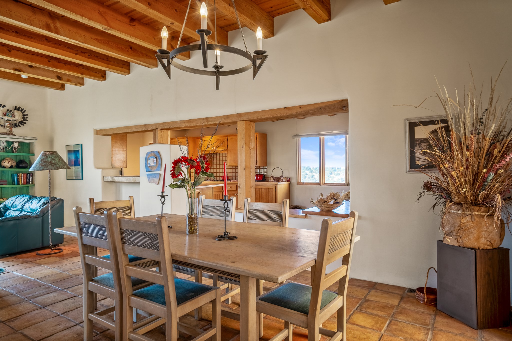 Just minutes from the plaza, this spacious home offers breathtaking views while providing unsurpassed comfort. High beamed ceilings and Saltillo tile floors, accented by abundant sunlight provide you with the warmth of the rich Santa Fe Culture. Over 3,100 square feet of floor space feature open living space on the main level with additional rooms, bathroom and den/play area for kids or entertaining guests. Two decks, one with a private courtyard and hot tub and the other offering fantastic views of the Sangre de Cristo mountains, expand upon the awe-inspiring living experience this condo offers. With a two-car garage, central A/C and heating, manicured grounds, and gated access, this property is an incredible opportunity for the discerning buyer.