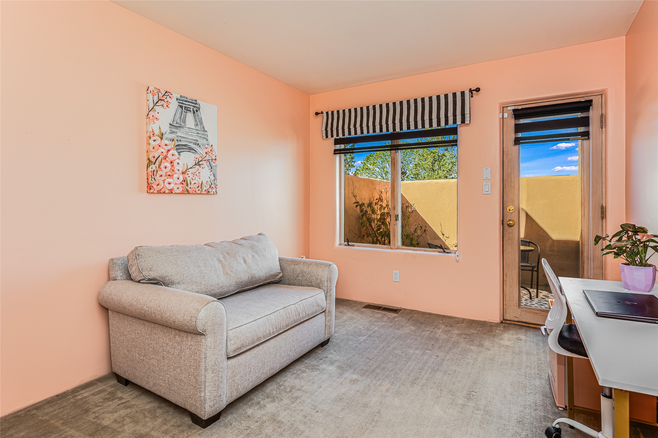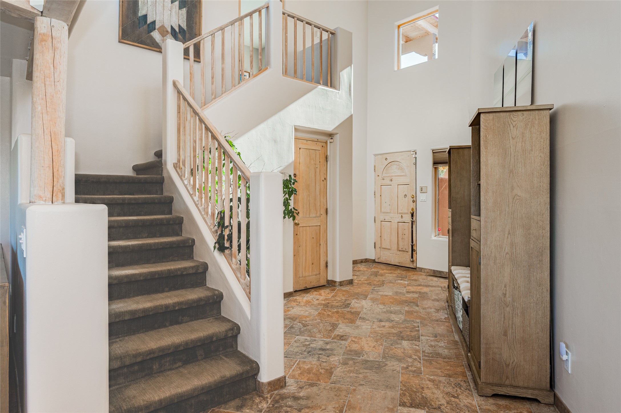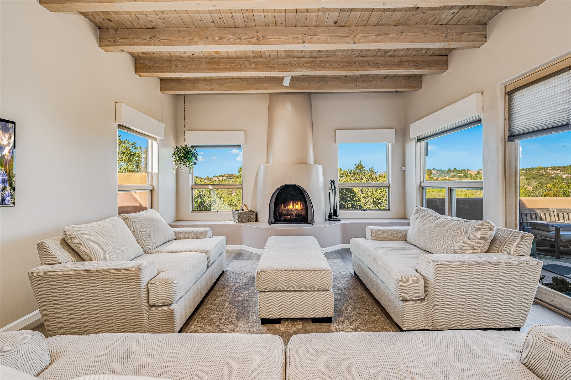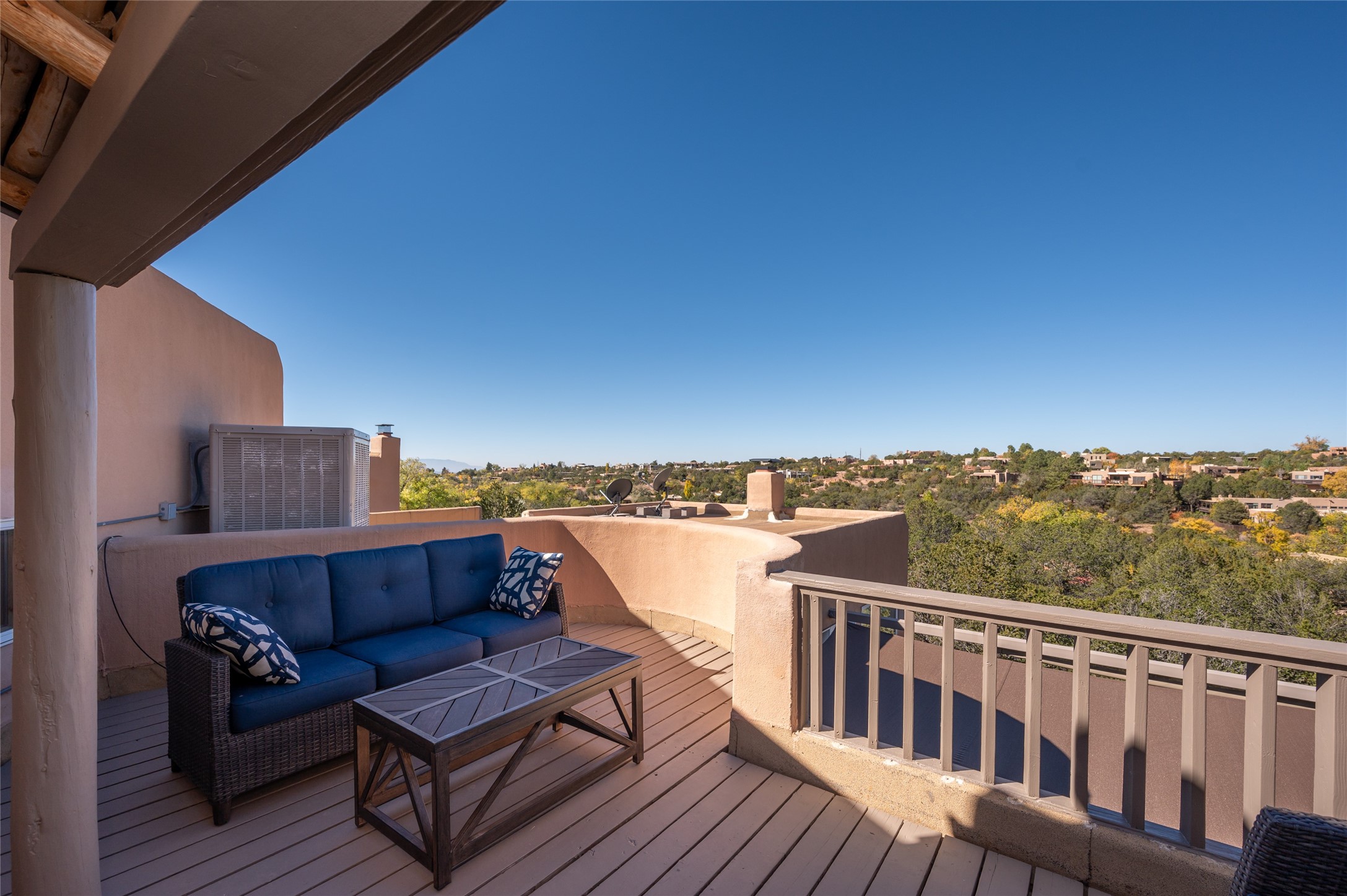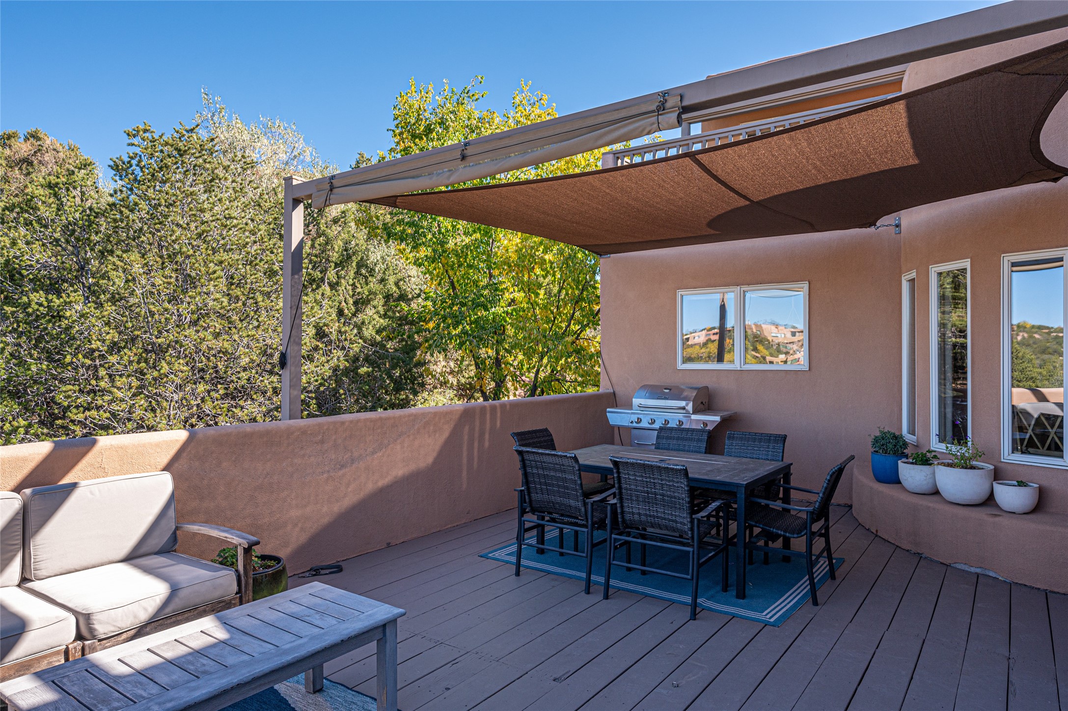 A true walk to the historic Santa Fe plaza, located in a quiet cul-de-sac, this home is nestled in the hills of downtown Santa Fe. There are 2 lovely decks to enjoy the peaceful blue skies of New Mexico! The airy, light and bright entryway lends itself to a feeling of warmth upon arrival. The Santa Fe style home has unique features such as beams, wood burning fireplaces, and nichos. The open floor plan and high ceilings give the house a spacious feel. There is nice separation between the upstairs primary suite and downstairs guest rooms. The primary suite has a private deck to sit and enjoy the outdoors! There are many updates throughout the home which has been pre-inspected. There is a gated, private courtyard leading to the front door and a 2 car garage, with direct entry. The outdoor spaces are so serene and enjoyable! The home is located near walking trails, a recreation center, downtown, schools, fabulous restaurants, shopping and an easy commute to Los Alamos! The views are astounding and the home has wonderful features throughout!