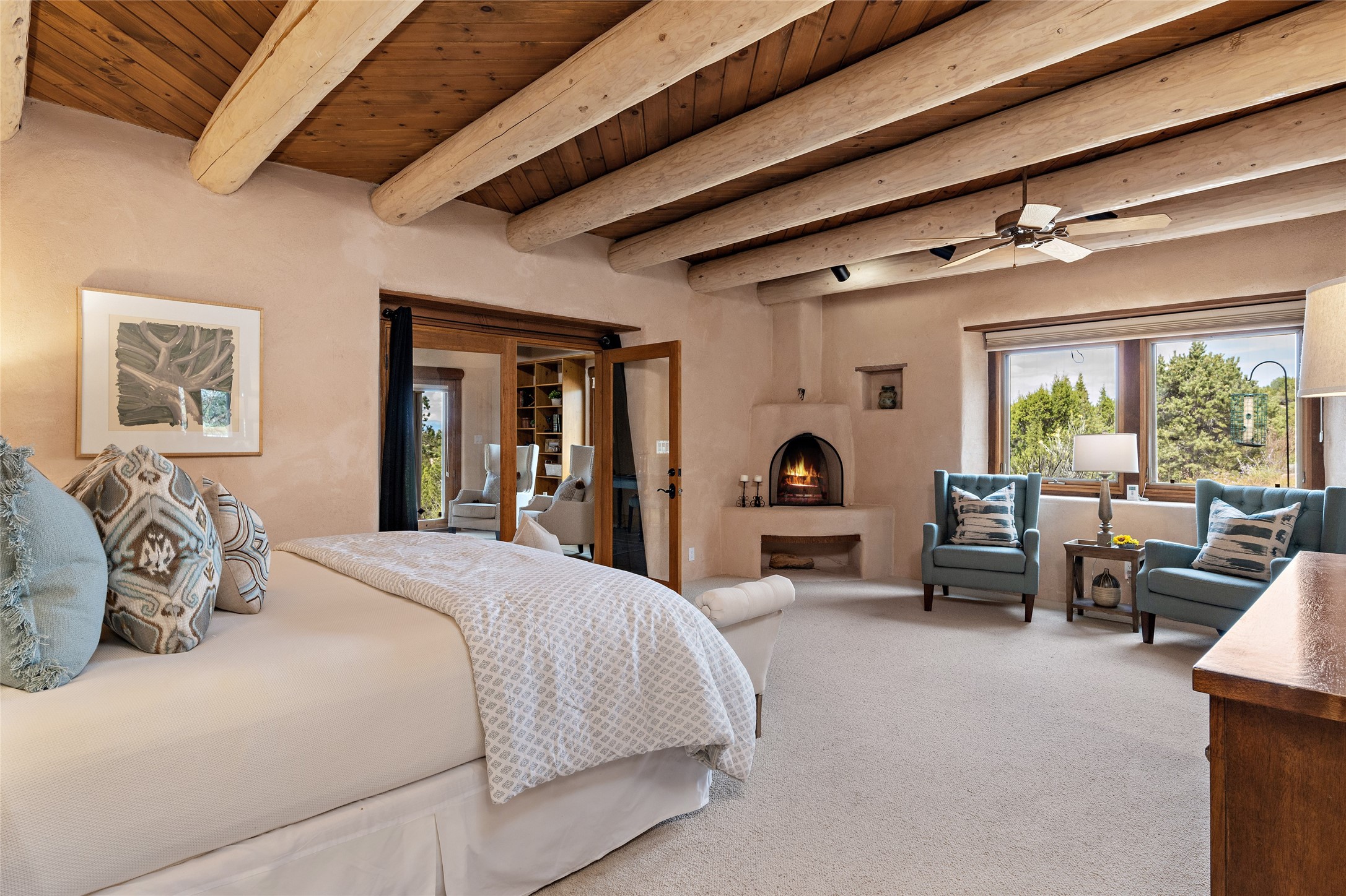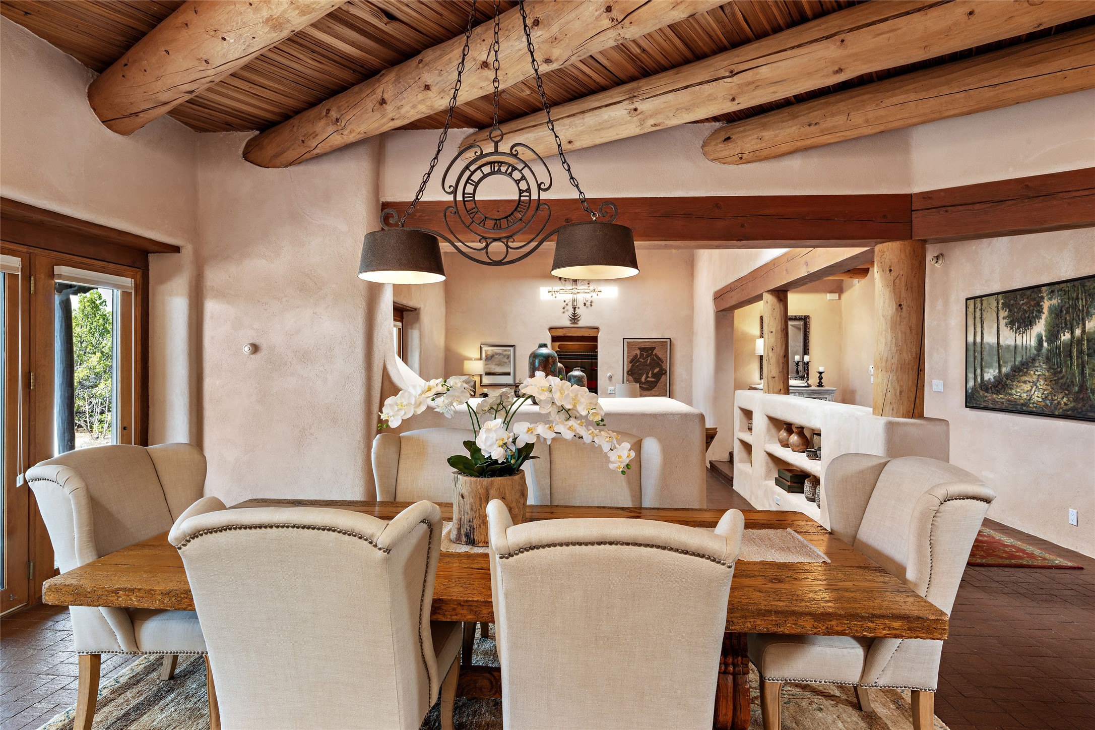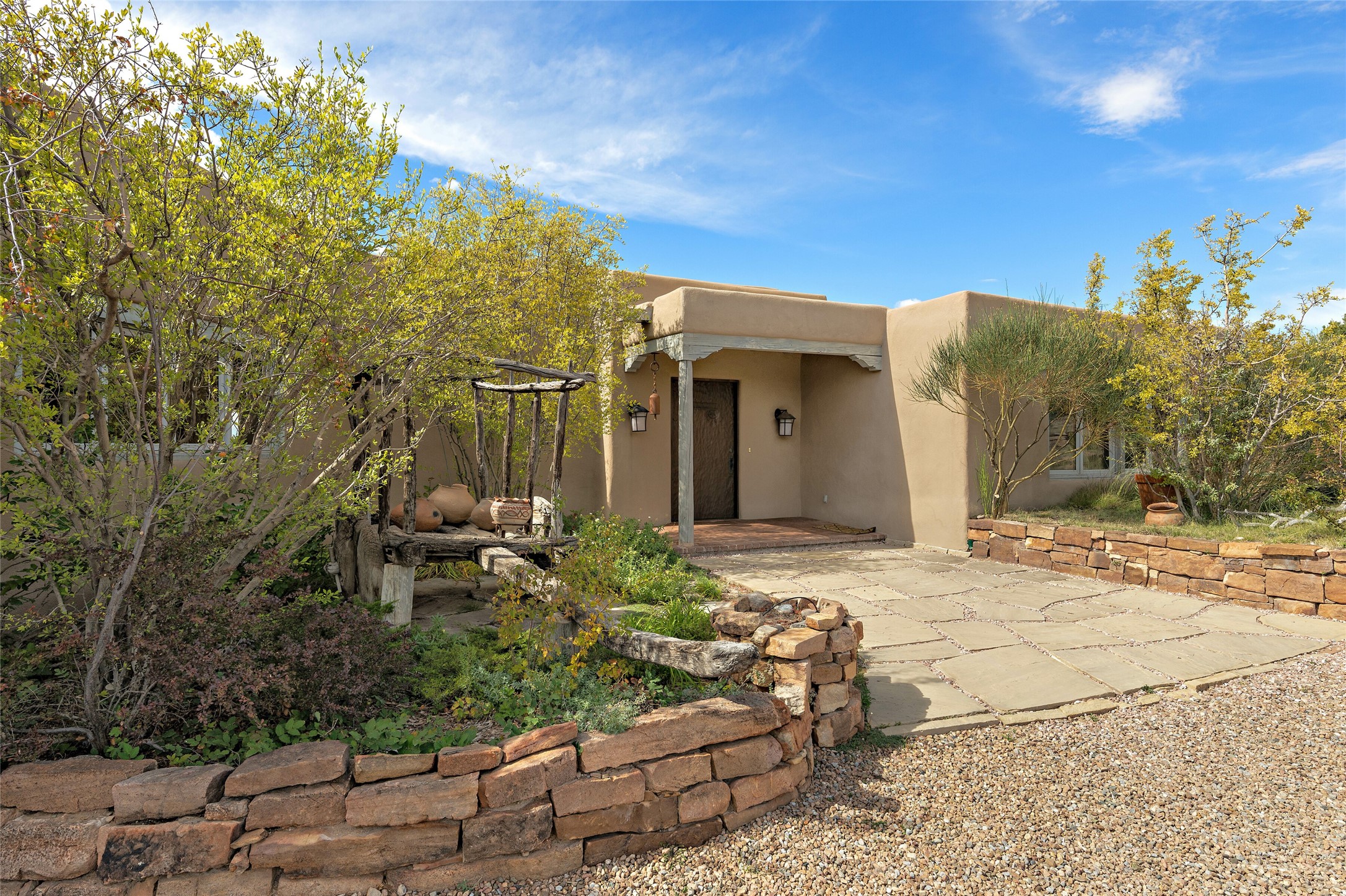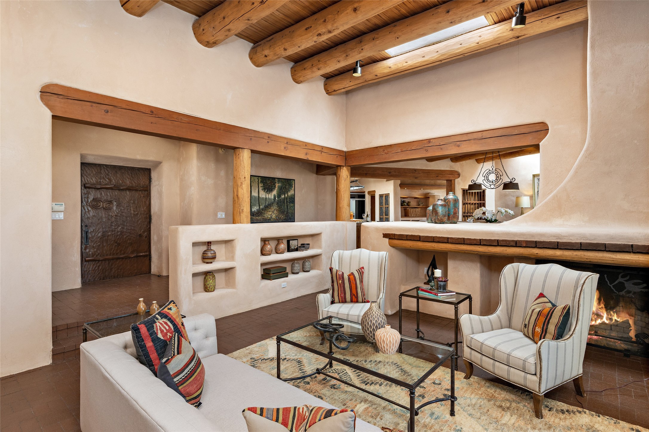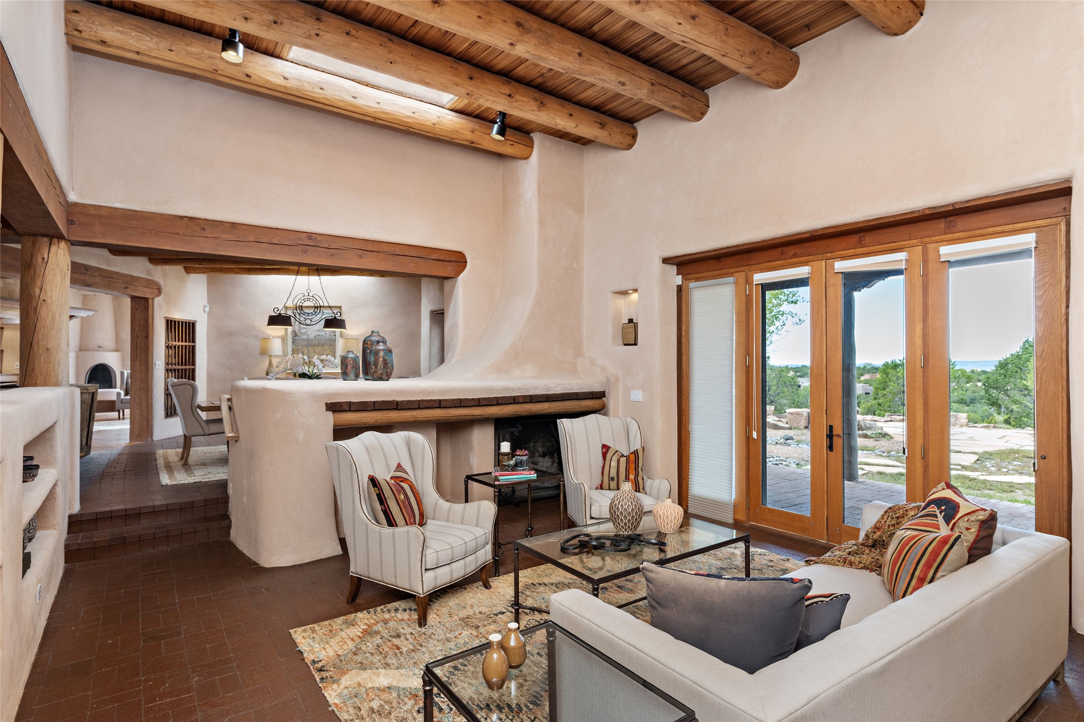 Welcome to your dream home in the prestigious gated community of Las Campanas, where you can enjoy the beauty and tranquility of Santa Fe with miles of walking trails, mountain views, 24/7 security, and stargazing at night. This single-level custom traditional style home has a hand-crafted sculptural essence - and is presently configured as a 2-bedroom 2 office home yet can also serve as a 3-bedroom home with an office/den off the primary suite. Lots of flexibility here! Wonderful living spaces with vigas and beams, troweled walls, and nichos for your treasures; a real nod to Santa Fe history with a welcoming yet relaxed Hacienda feel. Five wood-burning fireplaces throughout the home (and portal) create a cozy and inviting atmosphere. A 2+ acre lot affords privacy and is surrounded by native landscaping. The open gourmet kitchen boasts an AGA stove, wonderful authentic wood cabinetry design and a separate dining area plus convenient open pantry and laundry room. A cozy family area off the kitchen with a kiva fireplace, space for TV and access to the rear garden is the best part! Bedrooms are separated from the living area for privacy and comfort. The owner's suite has a fireplace, a walk-in closet, and a luxurious bathroom with a soaking tub and a separate shower. The home also has a large, covered portal and two-car garage. This home is a rare opportunity to own a piece of Santa Fe history and charm, in our coveted Las Campanas community at a comparably affordable price.