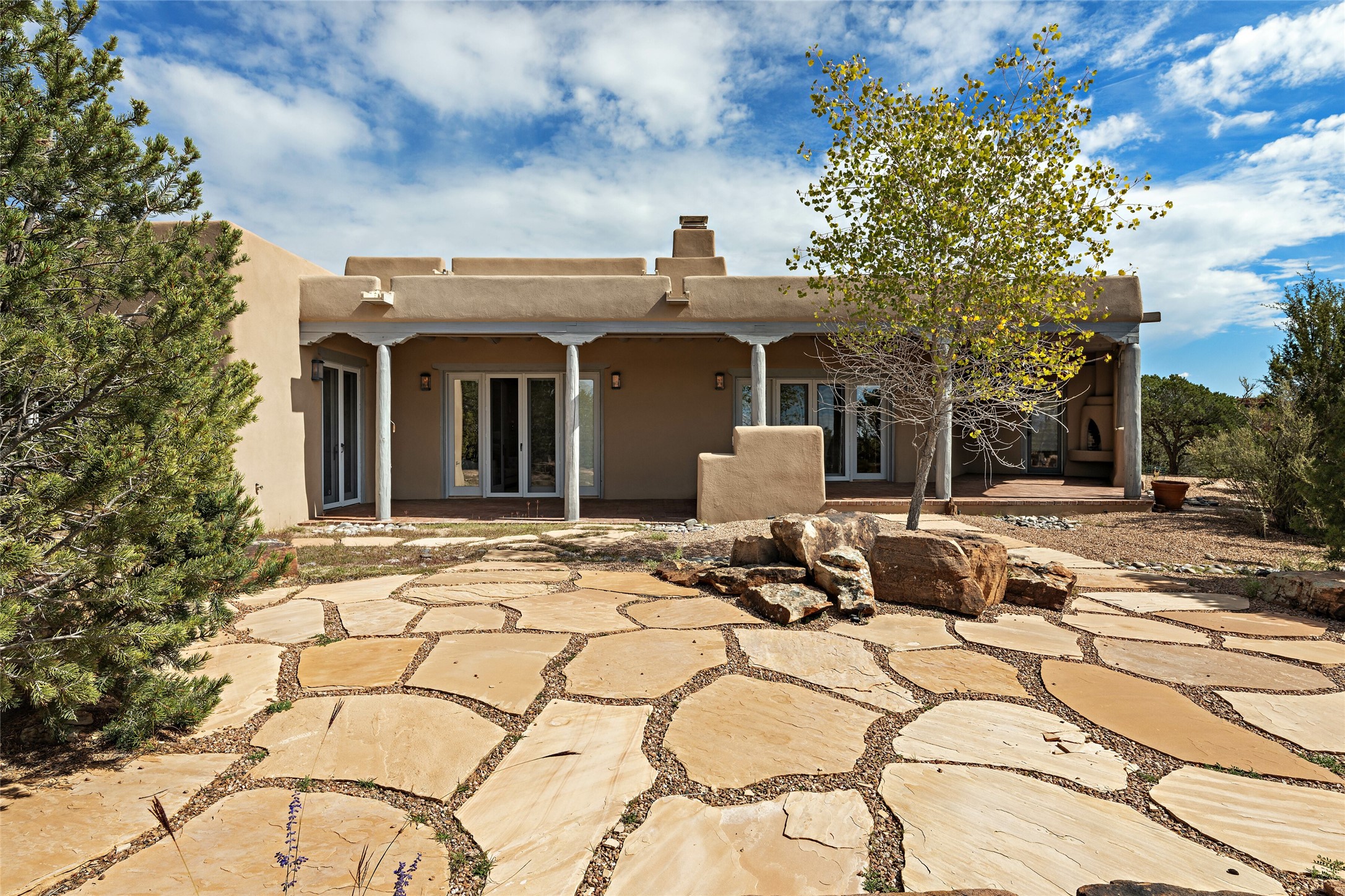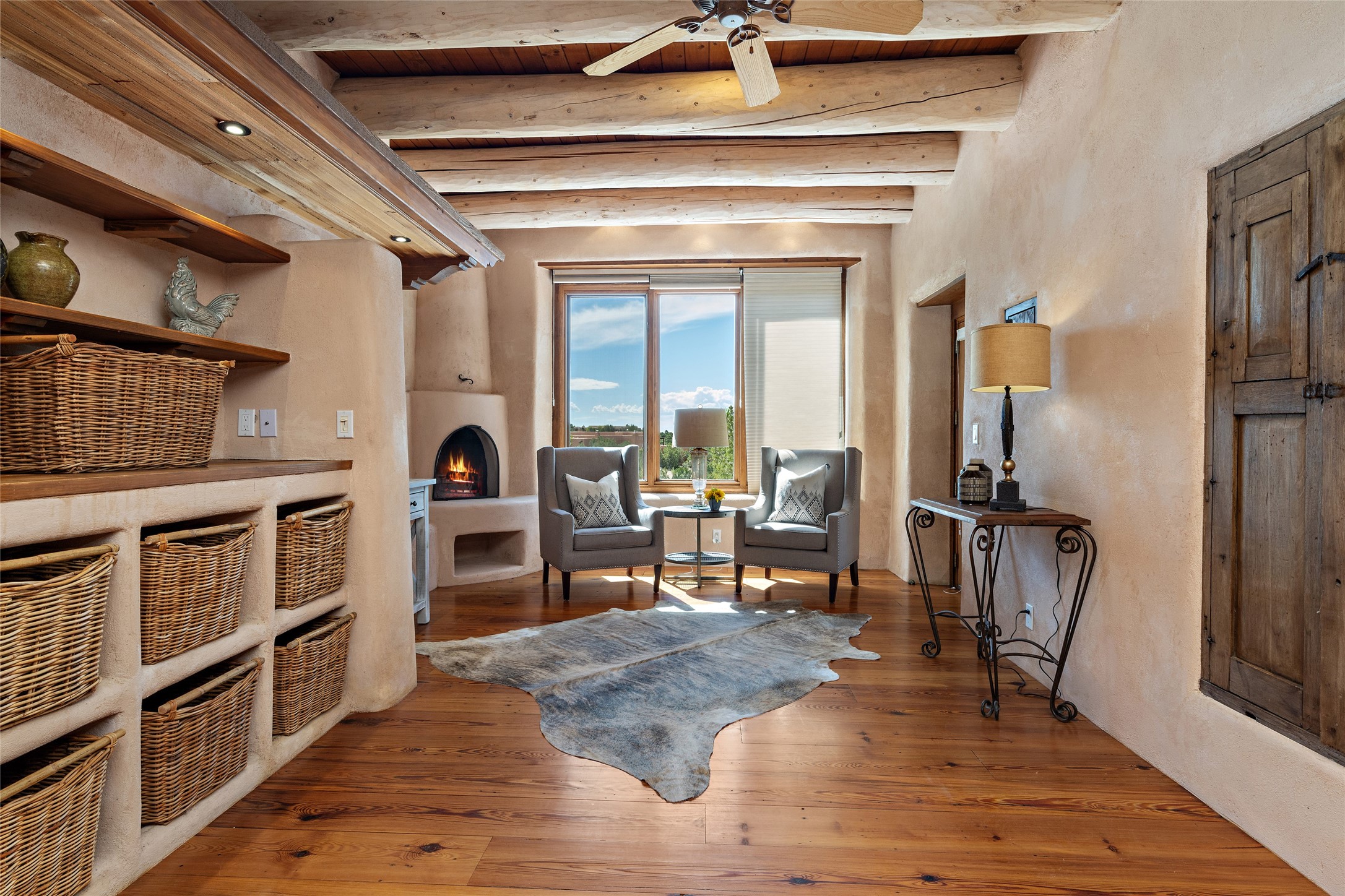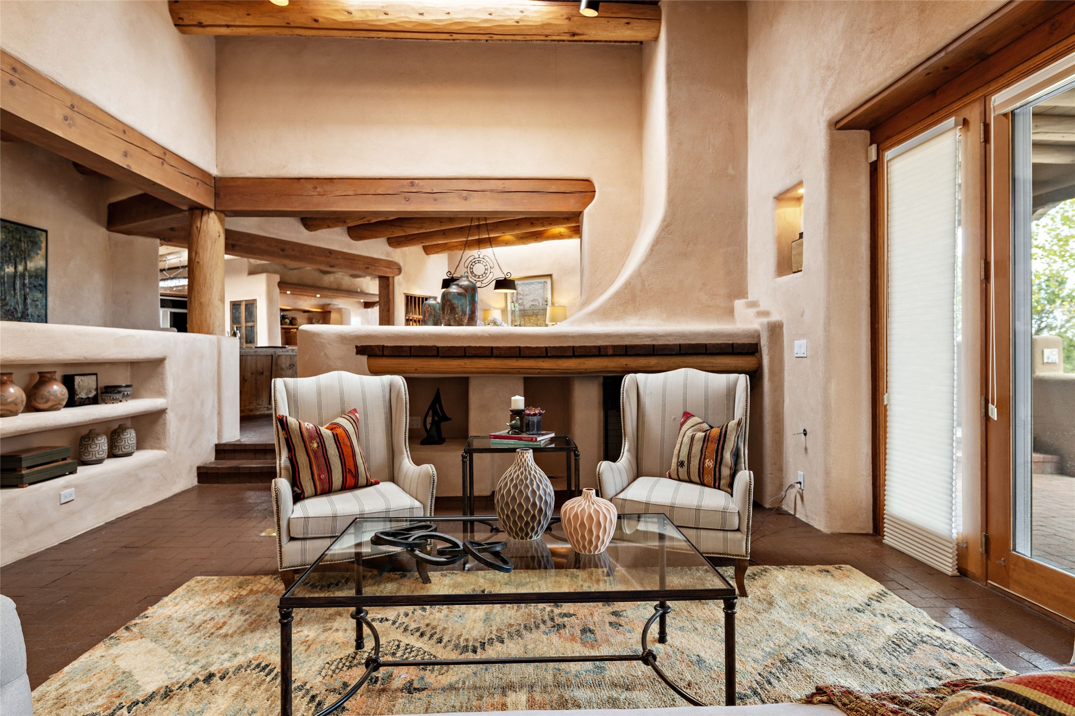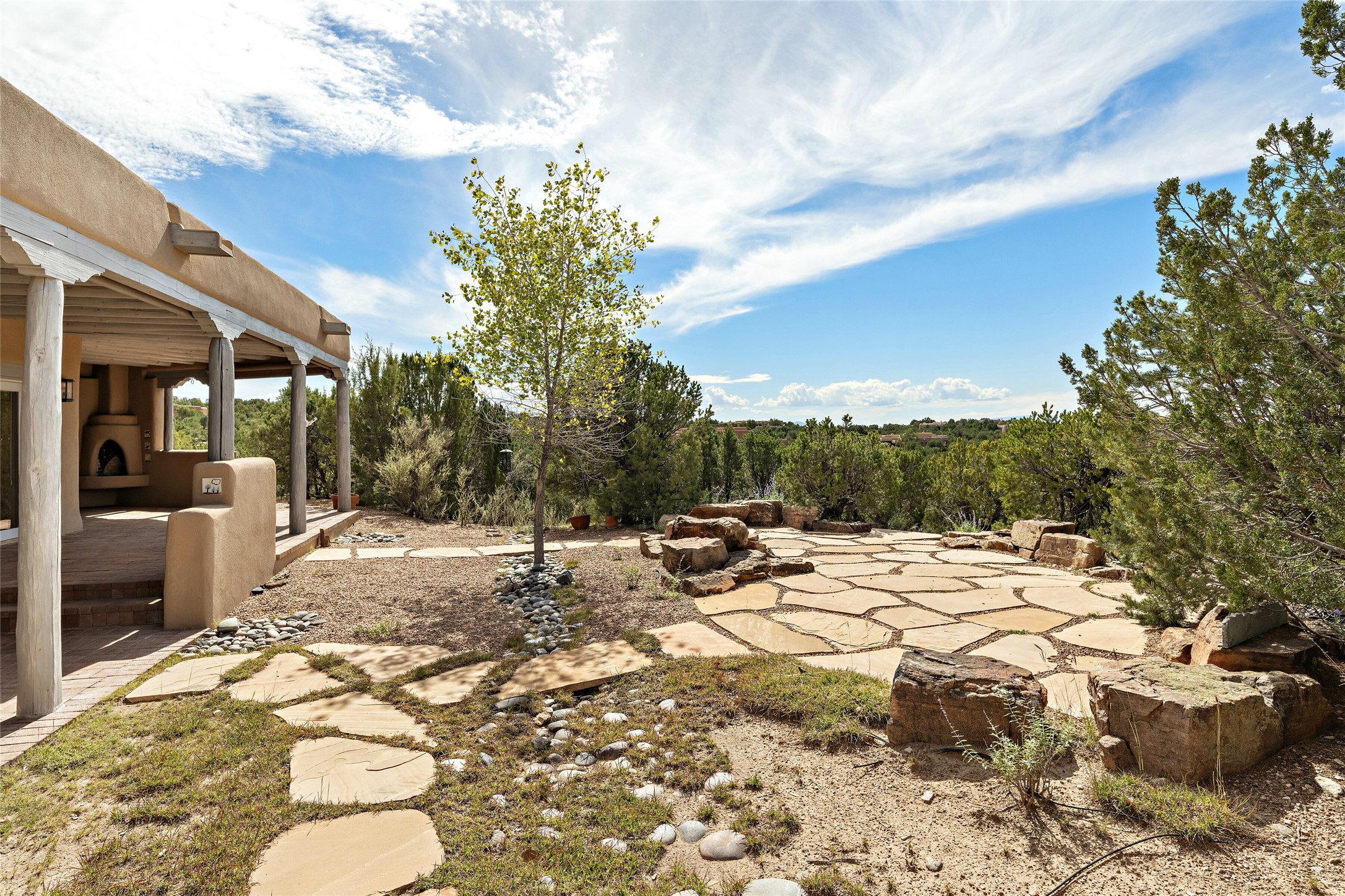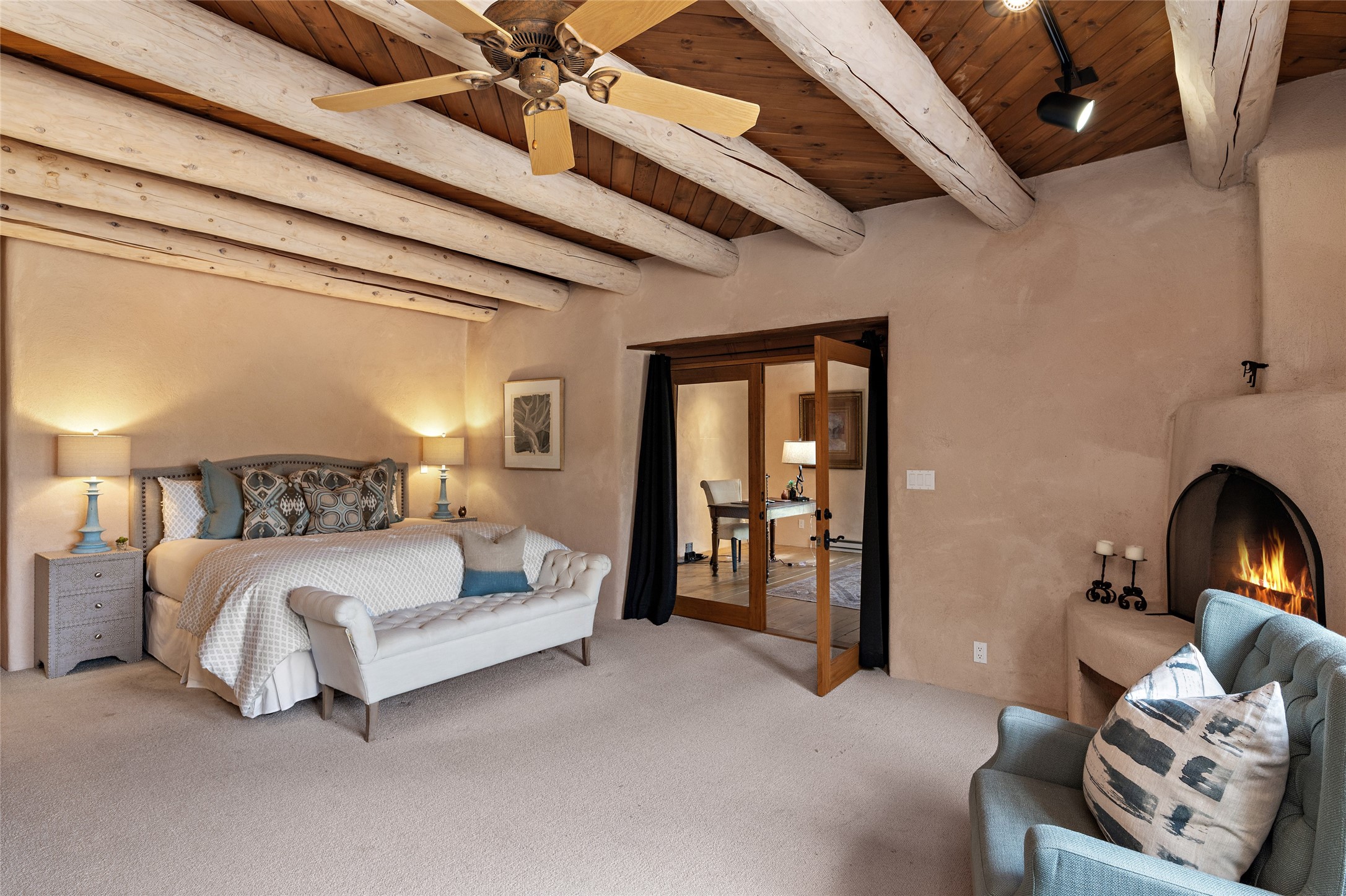 Welcome to your dream home in the prestigious gated community of Las Campanas, where you can enjoy the beauty and tranquility of Santa Fe with miles of walking trails, mountain views, 24/7 security, and stargazing at night. This single-level custom traditional style home has a hand-crafted sculptural essence - and is presently configured as a 2-bedroom 2 office home yet can also serve as a 3-bedroom home with an office/den off the primary suite. Lots of flexibility here! Wonderful living spaces with vigas and beams, troweled walls, and nichos for your treasures; a real nod to Santa Fe history with a welcoming yet relaxed Hacienda feel. Five wood-burning fireplaces throughout the home (and portal) create a cozy and inviting atmosphere. A 2+ acre lot affords privacy and is surrounded by native landscaping. The open gourmet kitchen boasts an AGA stove, wonderful authentic wood cabinetry design and a separate dining area plus convenient open pantry and laundry room. A cozy family area off the kitchen with a kiva fireplace, space for TV and access to the rear garden is the best part! Bedrooms are separated from the living area for privacy and comfort. The owner's suite has a fireplace, a walk-in closet, and a luxurious bathroom with a soaking tub and a separate shower. The home also has a large, covered portal and two-car garage. This home is a rare opportunity to own a piece of Santa Fe history and charm, in our coveted Las Campanas community at a comparably affordable price.