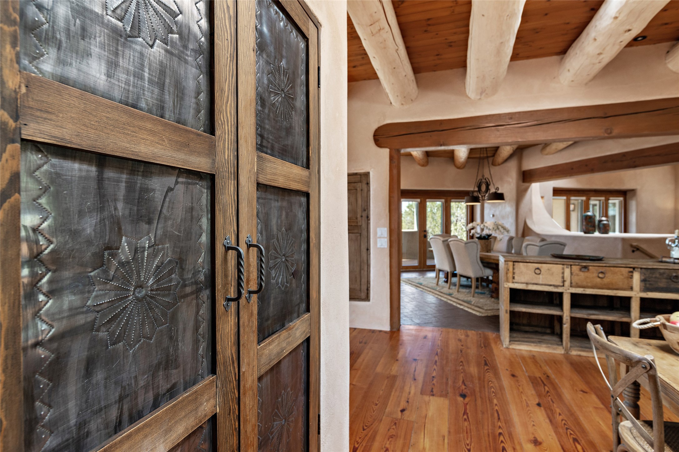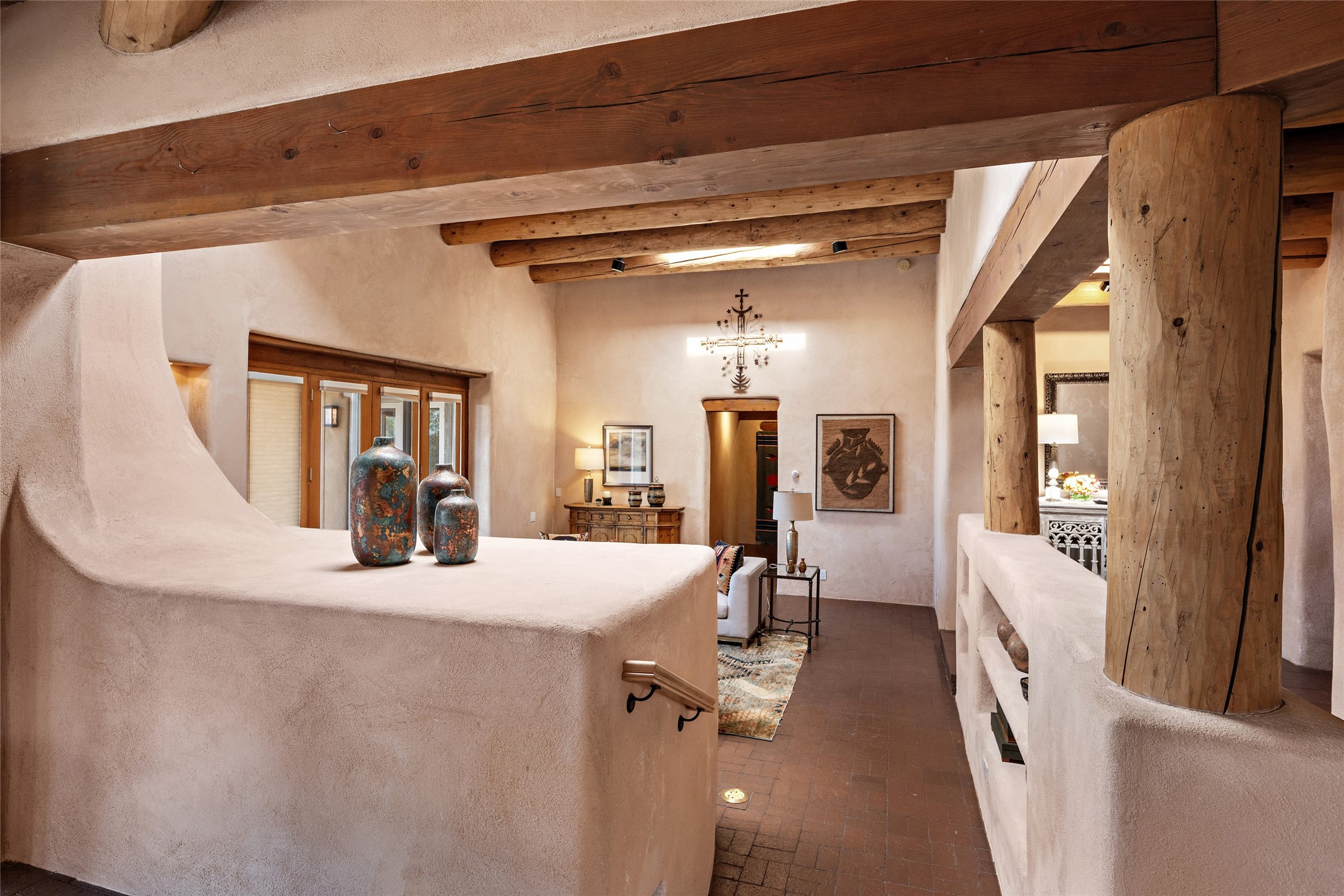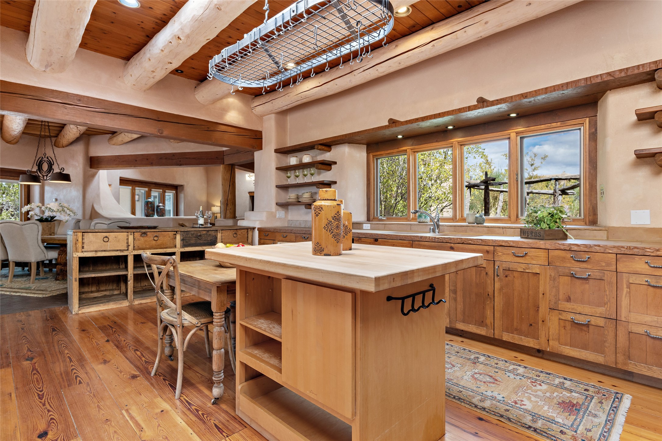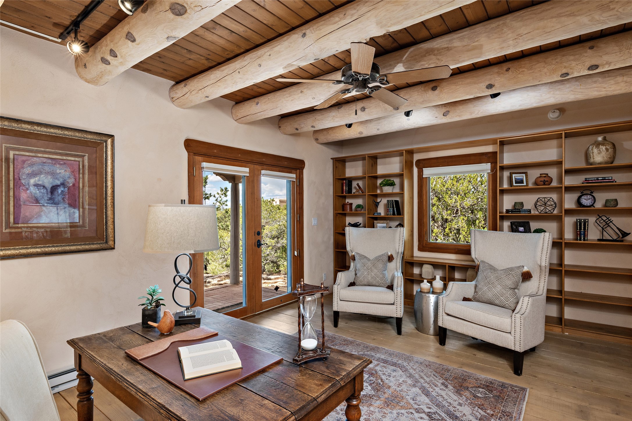 Welcome to your dream home in the prestigious gated community of Las Campanas, where you can enjoy the beauty and tranquility of Santa Fe with miles of walking trails, mountain views, 24/7 security, and stargazing at night. This single-level custom traditional style home has a hand-crafted sculptural essence - and is presently configured as a 2-bedroom 2 office home yet can also serve as a 3-bedroom home with an office/den off the primary suite. Lots of flexibility here! Wonderful living spaces with vigas and beams, troweled walls, and nichos for your treasures; a real nod to Santa Fe history with a welcoming yet relaxed Hacienda feel. Five wood-burning fireplaces throughout the home (and portal) create a cozy and inviting atmosphere. A 2+ acre lot affords privacy and is surrounded by native landscaping. The open gourmet kitchen boasts an AGA stove, wonderful authentic wood cabinetry design and a separate dining area plus convenient open pantry and laundry room. A cozy family area off the kitchen with a kiva fireplace, space for TV and access to the rear garden is the best part! Bedrooms are separated from the living area for privacy and comfort. The owner's suite has a fireplace, a walk-in closet, and a luxurious bathroom with a soaking tub and a separate shower. The home also has a large, covered portal and two-car garage. This home is a rare opportunity to own a piece of Santa Fe history and charm, in our coveted Las Campanas community at a comparably affordable price.