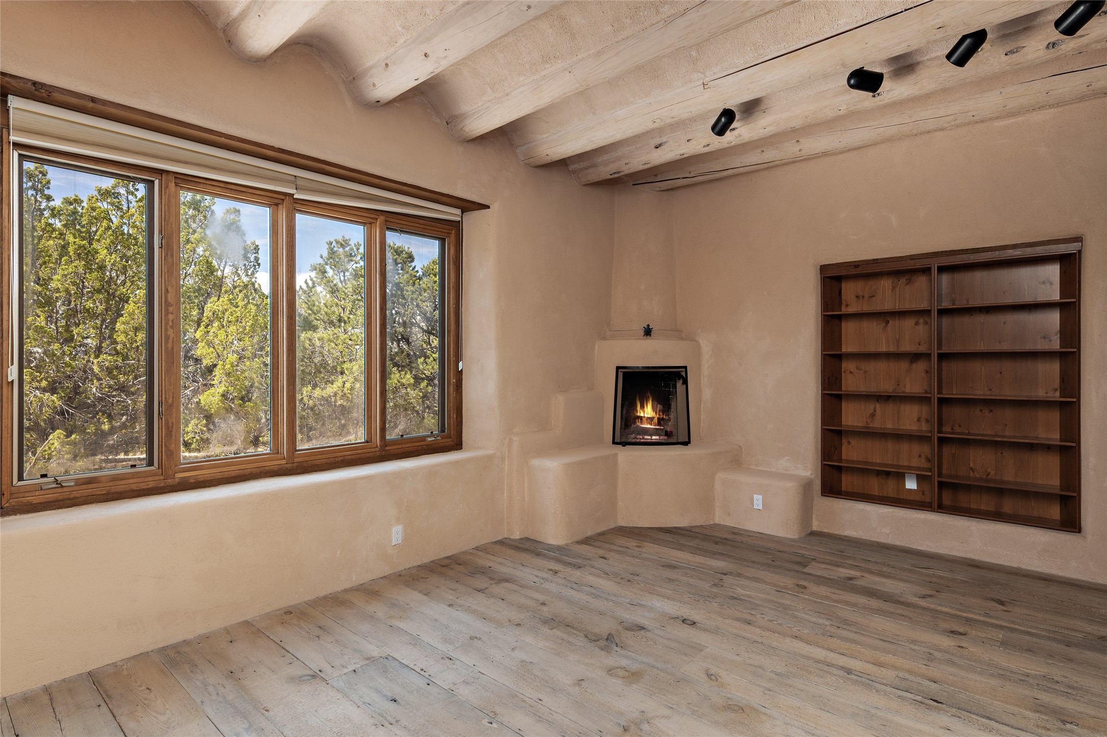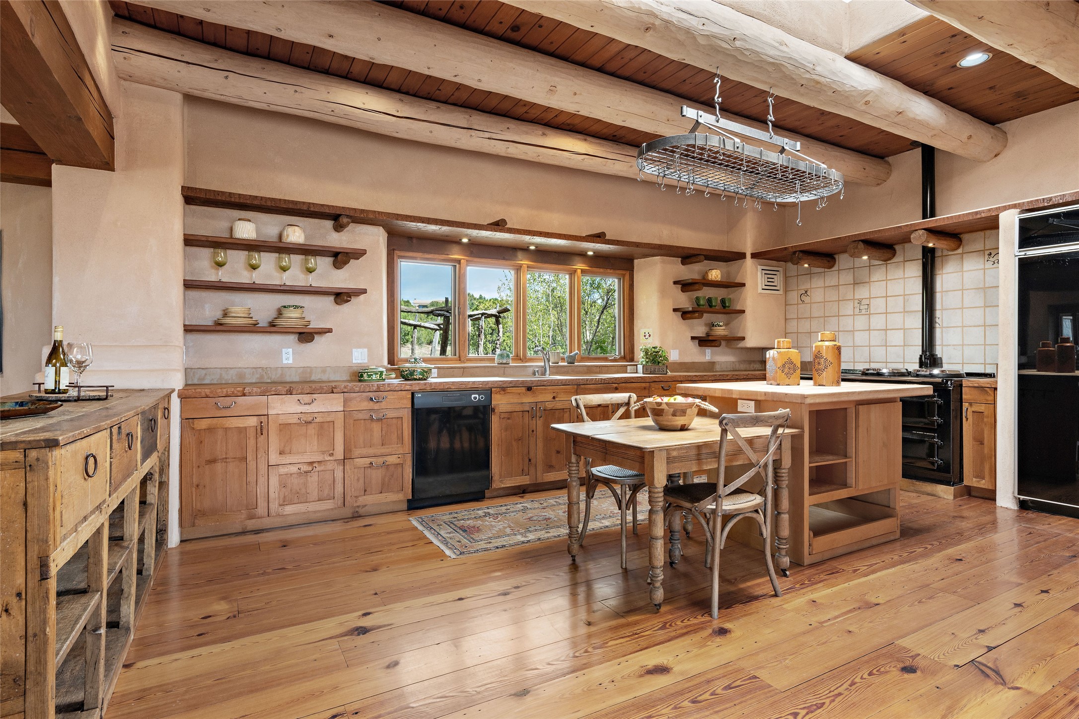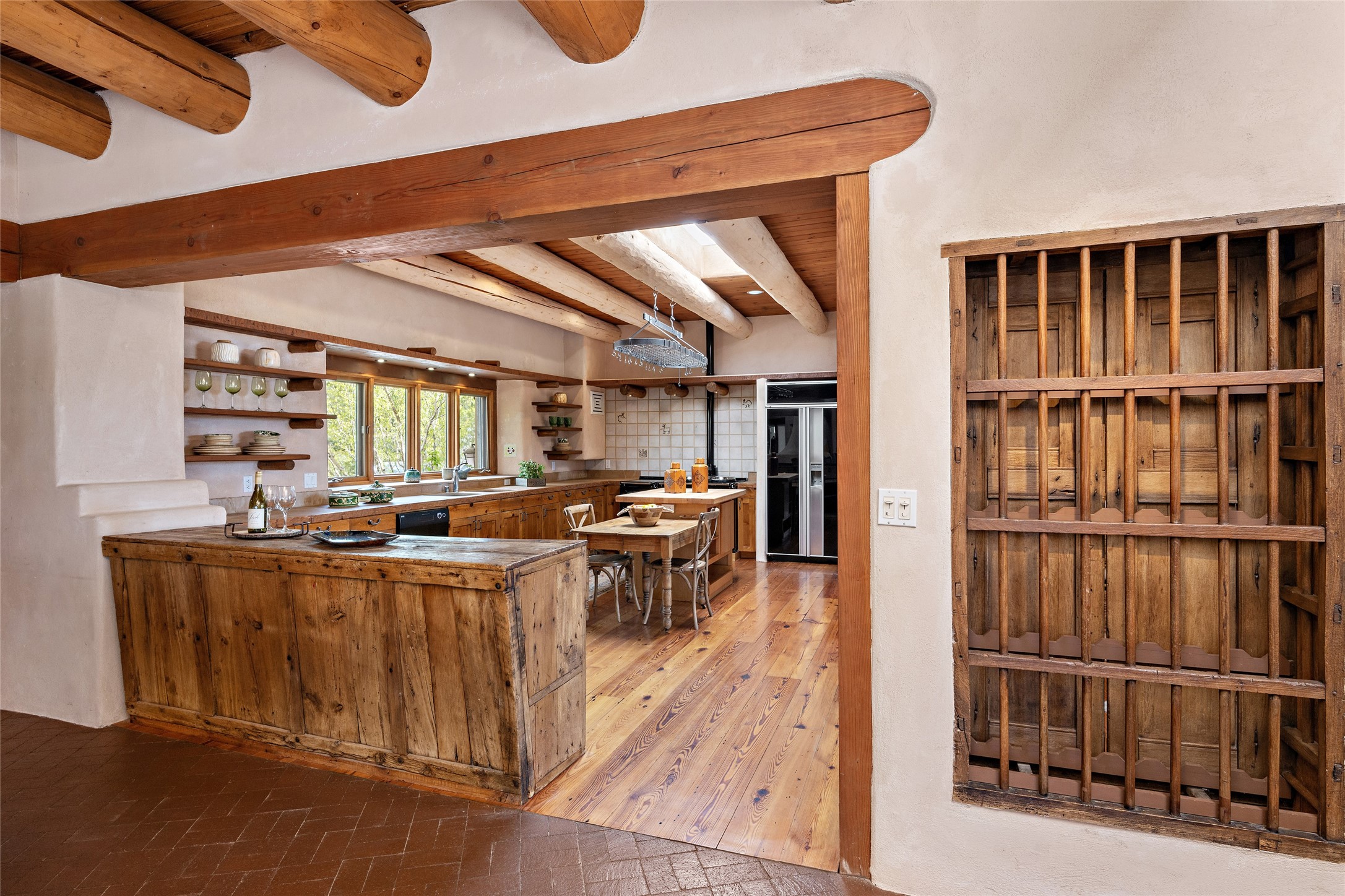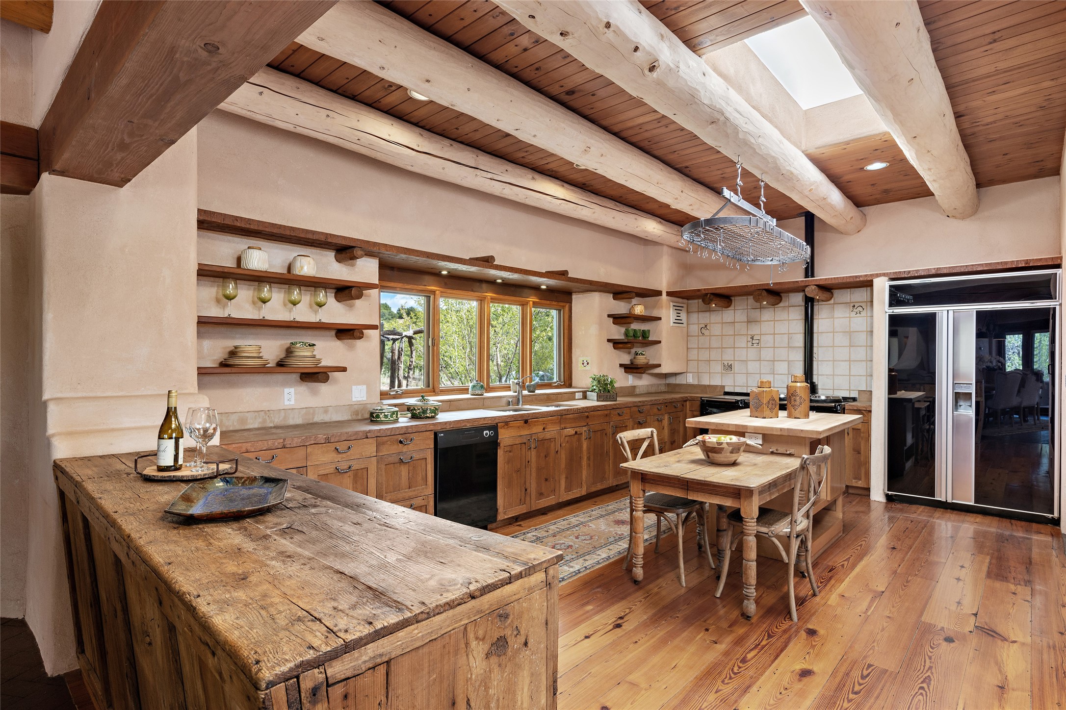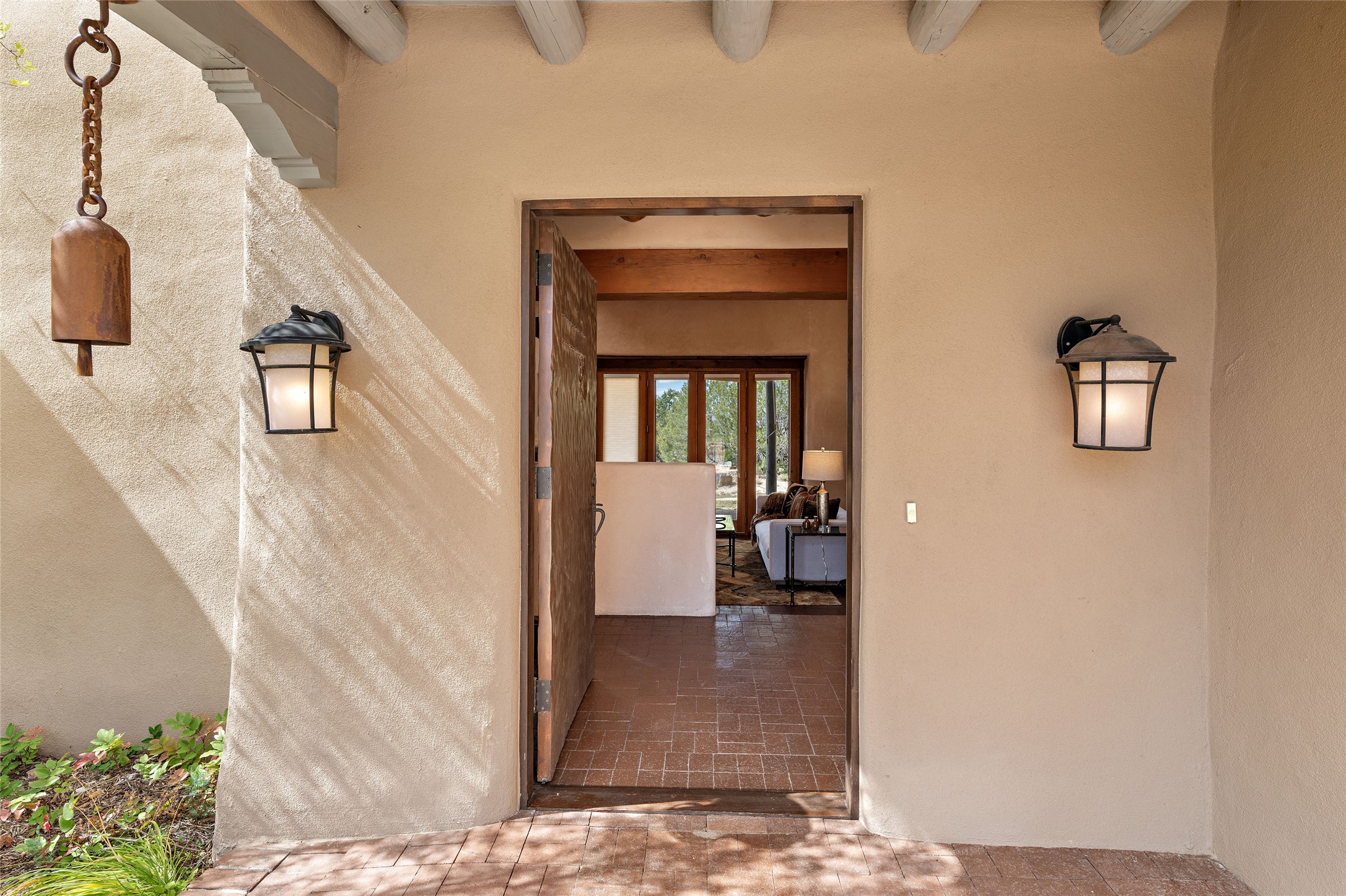 Welcome to your dream home in the prestigious gated community of Las Campanas, where you can enjoy the beauty and tranquility of Santa Fe with miles of walking trails, mountain views, 24/7 security, and stargazing at night. This single-level custom traditional style home has a hand-crafted sculptural essence - and is presently configured as a 2-bedroom 2 office home yet can also serve as a 3-bedroom home with an office/den off the primary suite. Lots of flexibility here! Wonderful living spaces with vigas and beams, troweled walls, and nichos for your treasures; a real nod to Santa Fe history with a welcoming yet relaxed Hacienda feel. Five wood-burning fireplaces throughout the home (and portal) create a cozy and inviting atmosphere. A 2+ acre lot affords privacy and is surrounded by native landscaping. The open gourmet kitchen boasts an AGA stove, wonderful authentic wood cabinetry design and a separate dining area plus convenient open pantry and laundry room. A cozy family area off the kitchen with a kiva fireplace, space for TV and access to the rear garden is the best part! Bedrooms are separated from the living area for privacy and comfort. The owner's suite has a fireplace, a walk-in closet, and a luxurious bathroom with a soaking tub and a separate shower. The home also has a large, covered portal and two-car garage. This home is a rare opportunity to own a piece of Santa Fe history and charm, in our coveted Las Campanas community at a comparably affordable price.