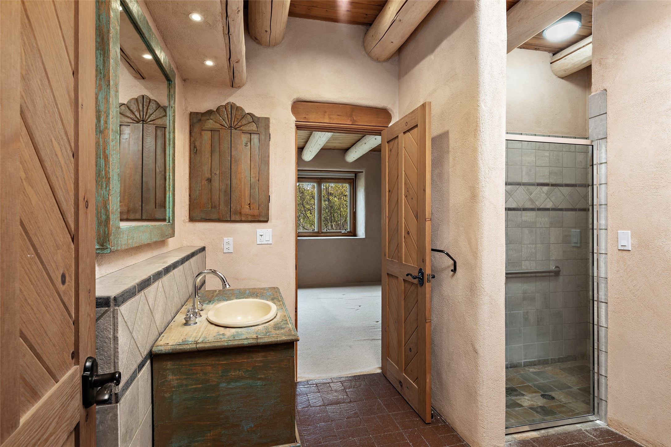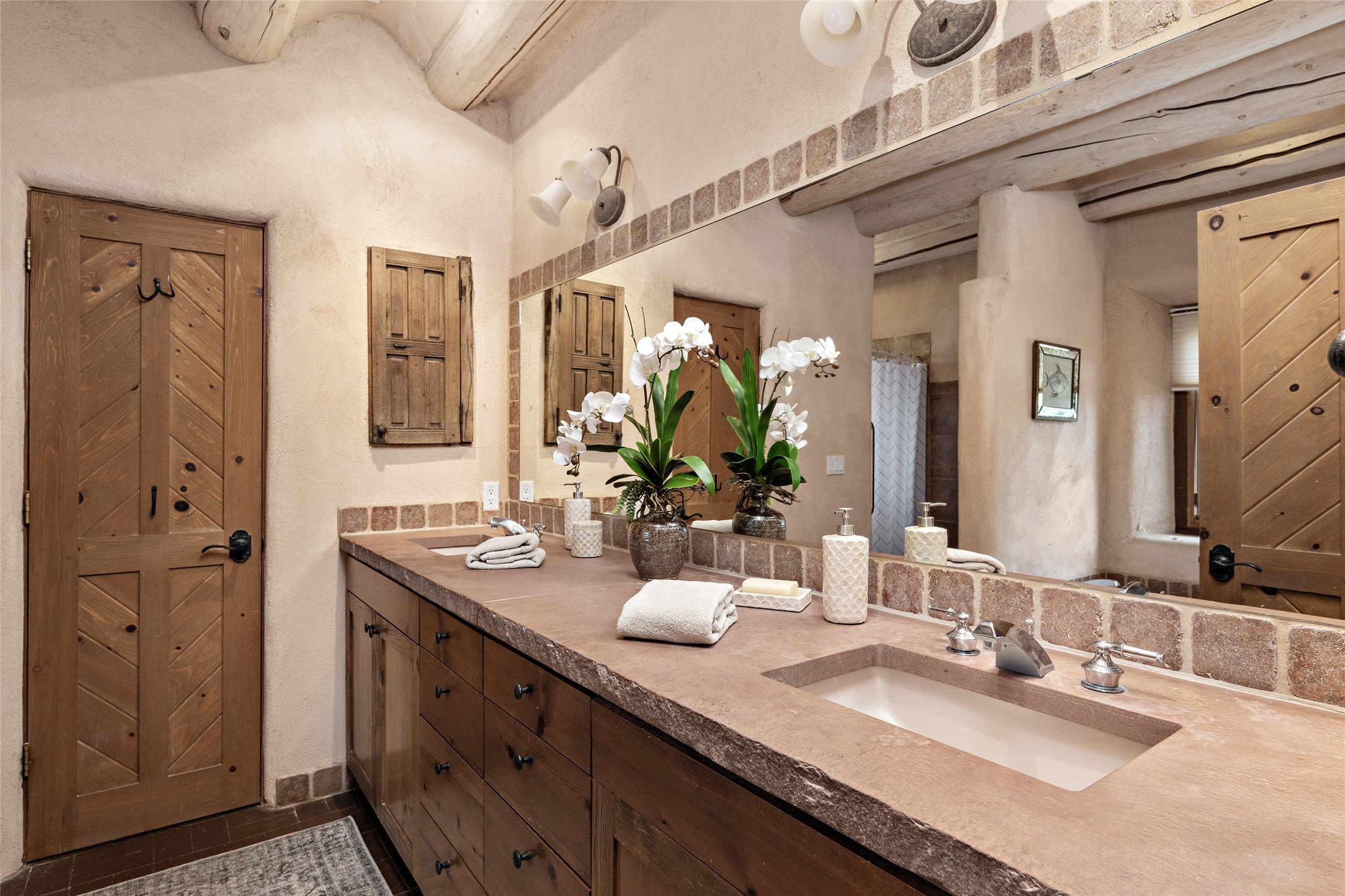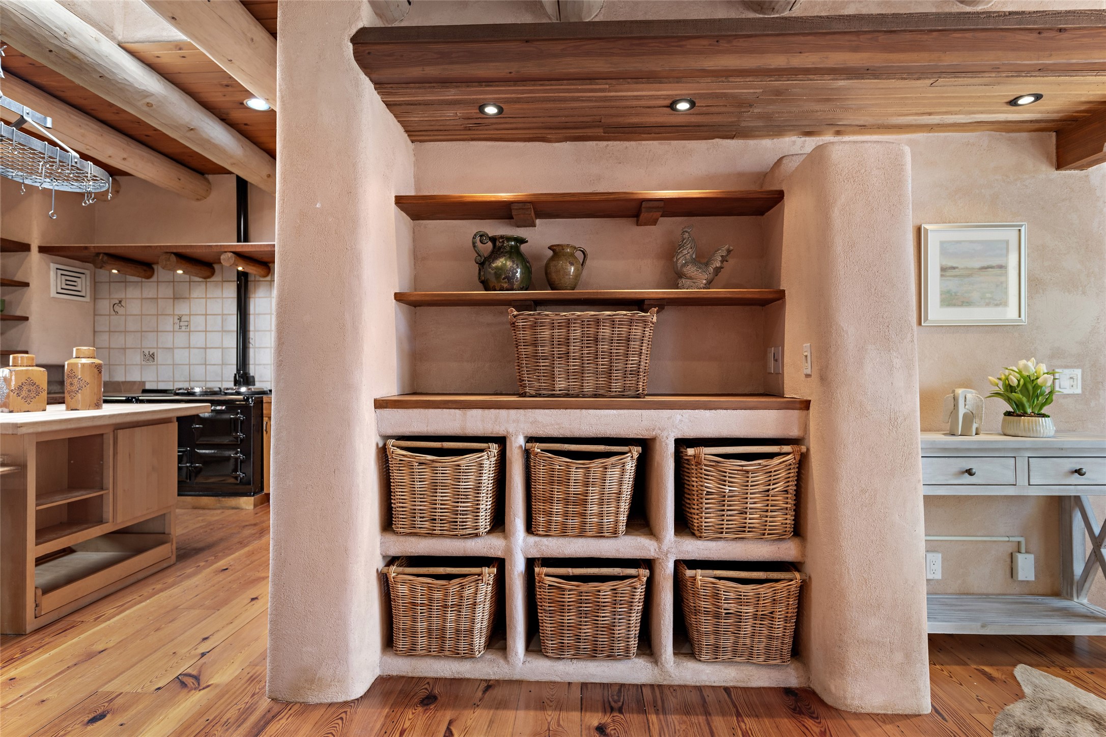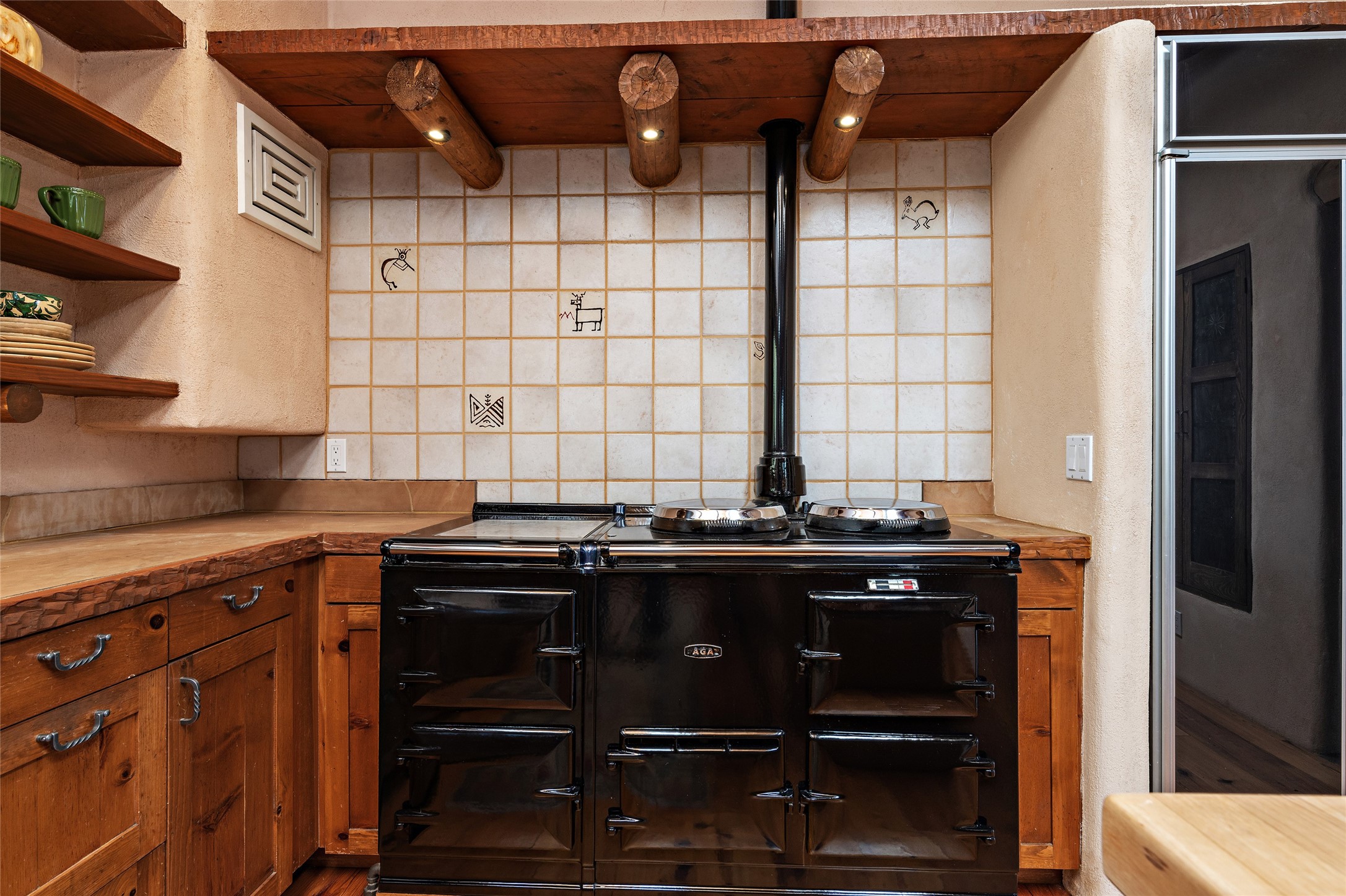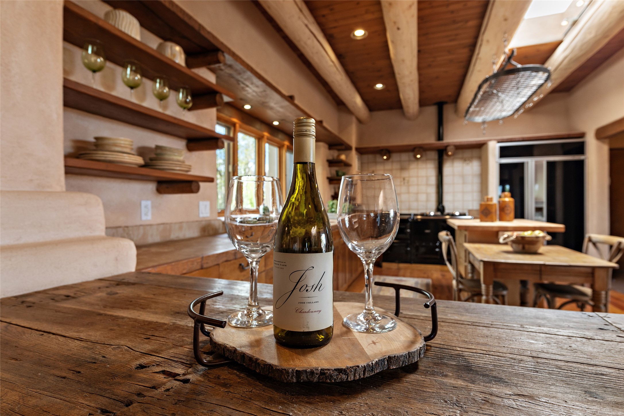 Welcome to your dream home in the prestigious gated community of Las Campanas, where you can enjoy the beauty and tranquility of Santa Fe with miles of walking trails, mountain views, 24/7 security, and stargazing at night. This single-level custom traditional style home has a hand-crafted sculptural essence - and is presently configured as a 2-bedroom 2 office home yet can also serve as a 3-bedroom home with an office/den off the primary suite. Lots of flexibility here! Wonderful living spaces with vigas and beams, troweled walls, and nichos for your treasures; a real nod to Santa Fe history with a welcoming yet relaxed Hacienda feel. Five wood-burning fireplaces throughout the home (and portal) create a cozy and inviting atmosphere. A 2+ acre lot affords privacy and is surrounded by native landscaping. The open gourmet kitchen boasts an AGA stove, wonderful authentic wood cabinetry design and a separate dining area plus convenient open pantry and laundry room. A cozy family area off the kitchen with a kiva fireplace, space for TV and access to the rear garden is the best part! Bedrooms are separated from the living area for privacy and comfort. The owner's suite has a fireplace, a walk-in closet, and a luxurious bathroom with a soaking tub and a separate shower. The home also has a large, covered portal and two-car garage. This home is a rare opportunity to own a piece of Santa Fe history and charm, in our coveted Las Campanas community at a comparably affordable price.