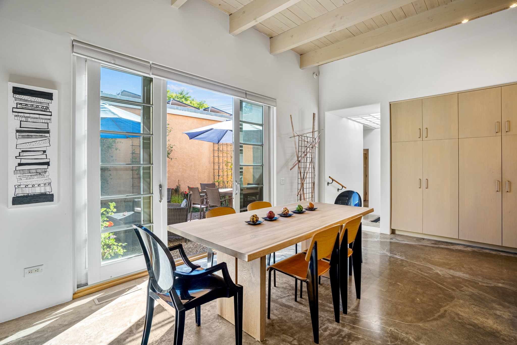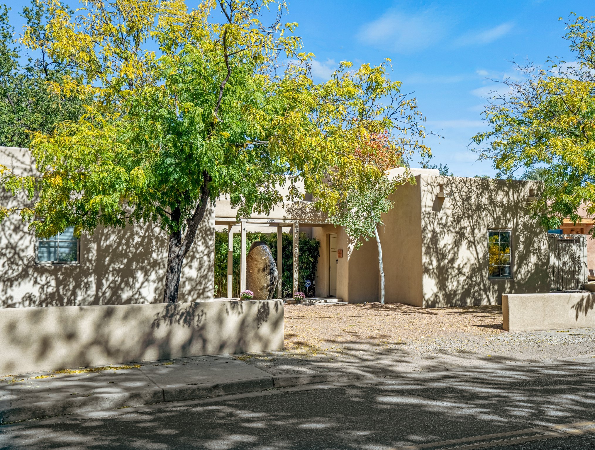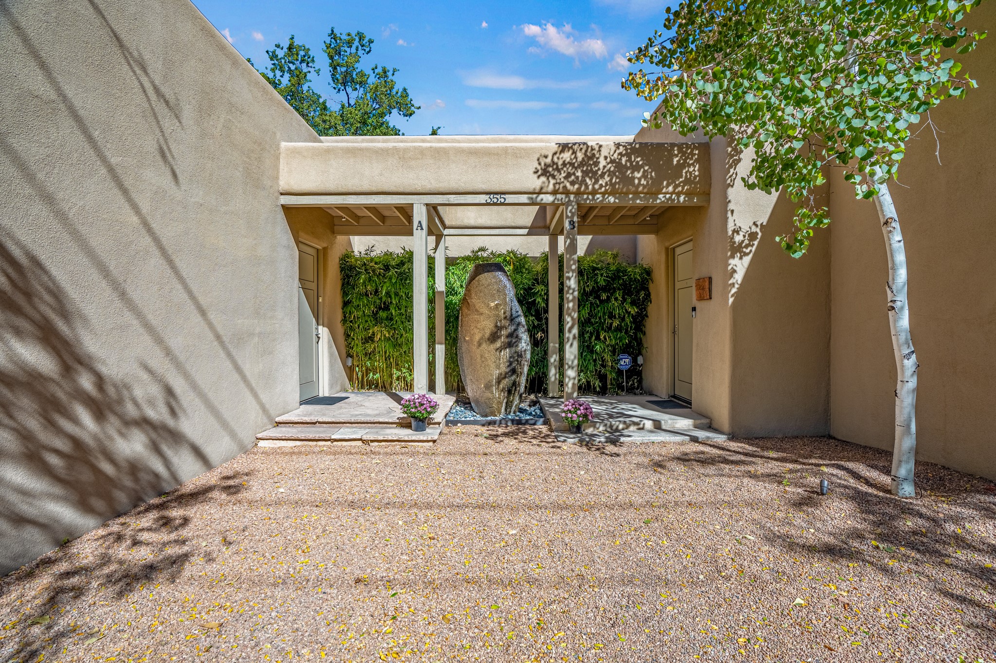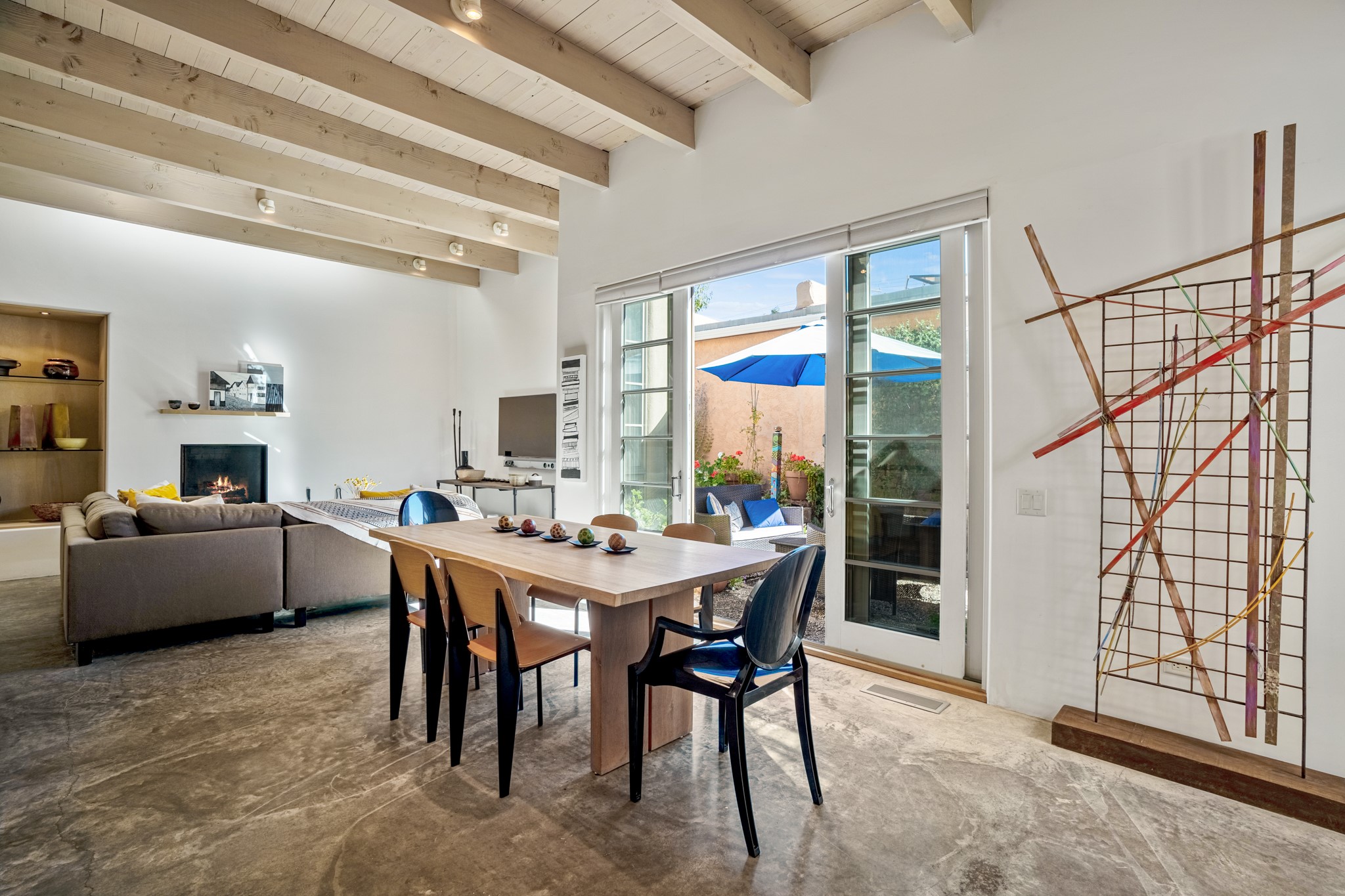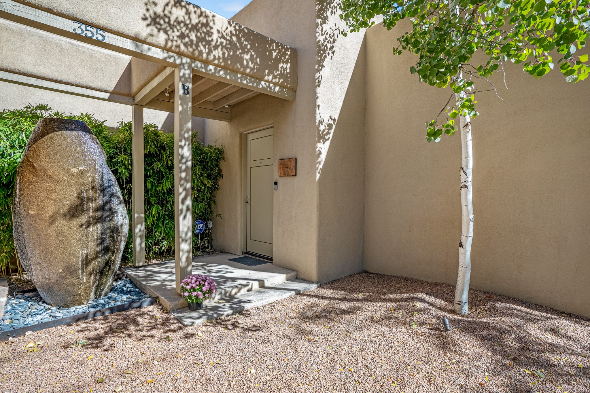 A contemporary gem in Historic Eastside! Located directly across from the Santa Fe river and just two blocks from The Plaza and Canyon Rd, this stunning 1482 sq. ft. condominium is the rare modern treasure. This elegant 2 bedroom/2 bathroom property is an open concept design with 12 ft beamed ceilings and beautiful stained concrete floors. The kitchen has a sleek design with a wall of custom cabinetry and a large island that is perfect for dinner parties and social gatherings. The extensive East-facing side courtyard has been beautifully landscaped with 2 sitting areas and offers a private oasis. The primary suite has wonderful separation from the main living area, high ceilings, a beautiful built-in shelving area and a large walk-in closet. The primary's bathroom has a double vanity with stone countertops and a walk-in shower. The guest bedroom is currently used as a working artist's studio and easily accommodates a queen-sized bed. 355 E. Alameda Unit B is that rare opportunity to own a superior contemporary property in Santa Fe's Historic Eastside.