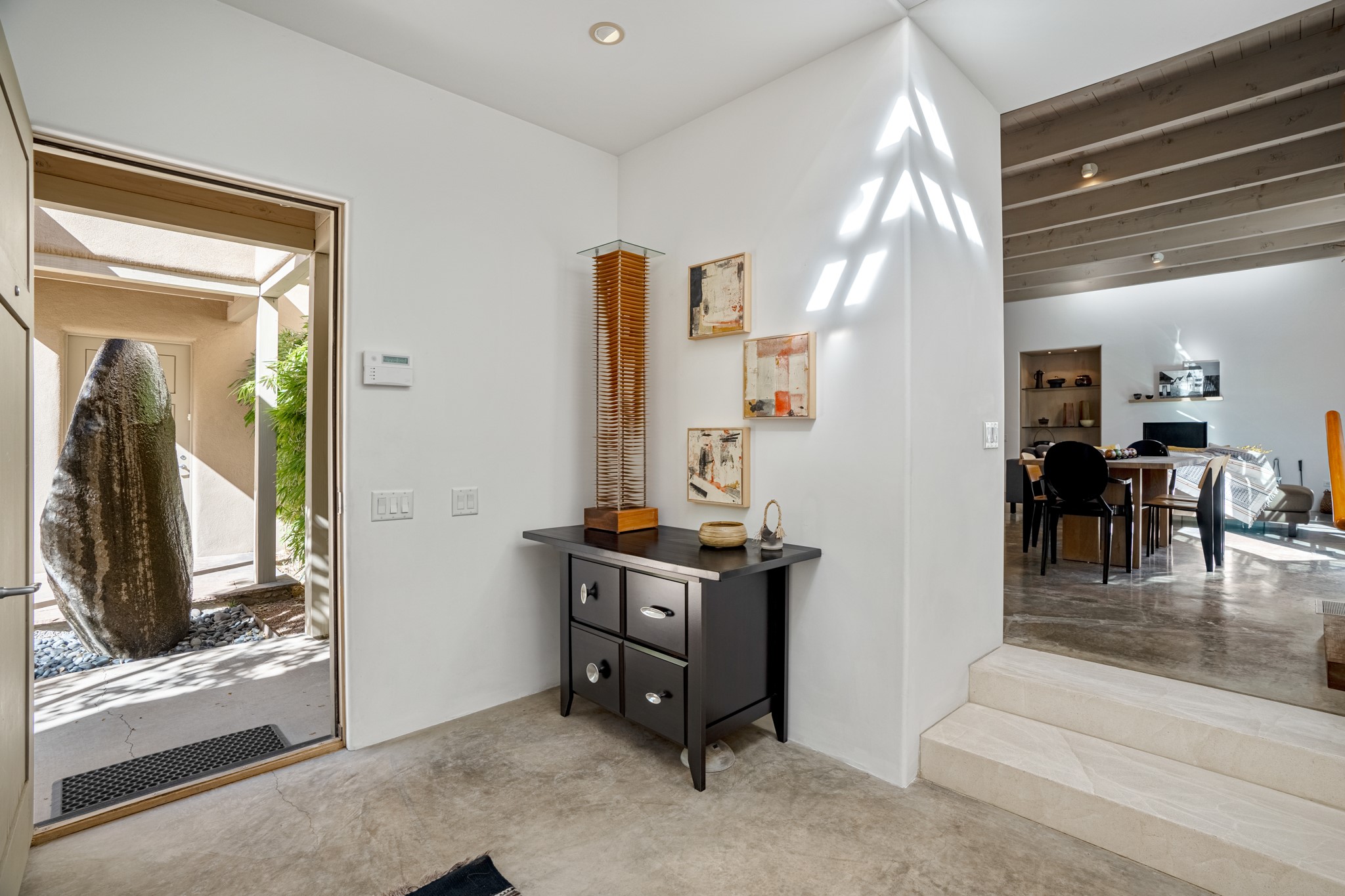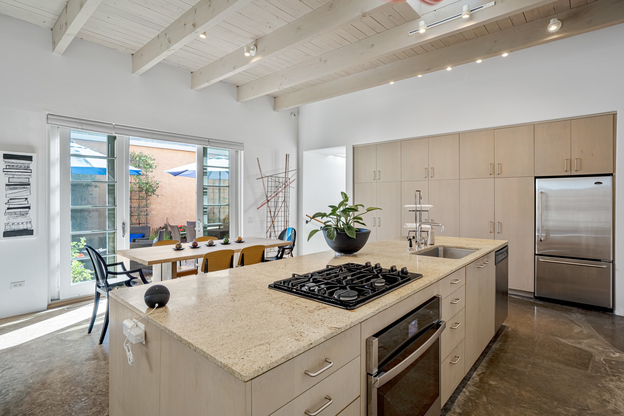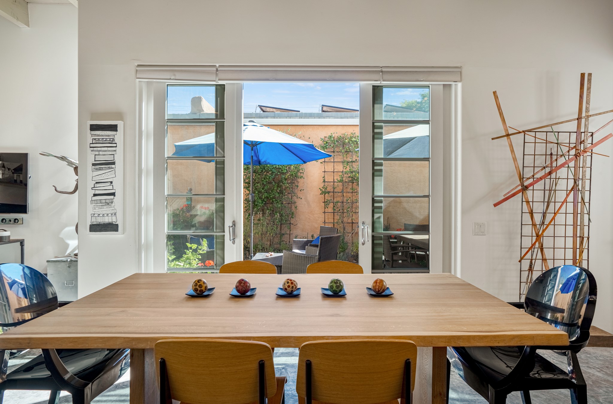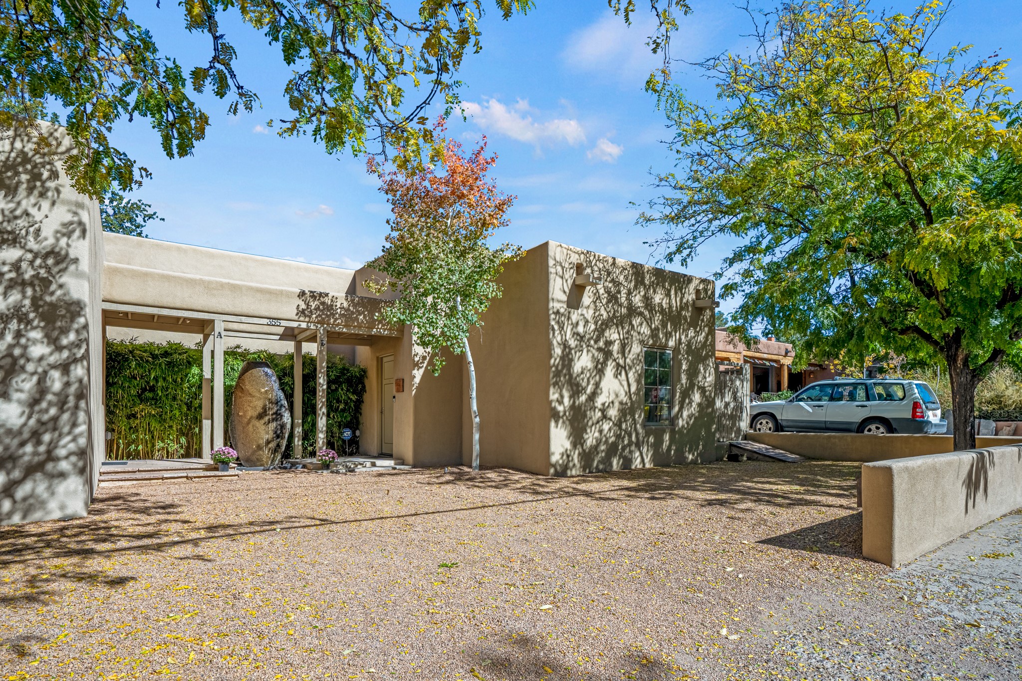 A contemporary gem in Historic Eastside! Located directly across from the Santa Fe river and just two blocks from The Plaza and Canyon Rd, this stunning 1482 sq. ft. condominium is the rare modern treasure. This elegant 2 bedroom/2 bathroom property is an open concept design with 12 ft beamed ceilings and beautiful stained concrete floors. The kitchen has a sleek design with a wall of custom cabinetry and a large island that is perfect for dinner parties and social gatherings. The extensive East-facing side courtyard has been beautifully landscaped with 2 sitting areas and offers a private oasis. The primary suite has wonderful separation from the main living area, high ceilings, a beautiful built-in shelving area and a large walk-in closet. The primary's bathroom has a double vanity with stone countertops and a walk-in shower. The guest bedroom is currently used as a working artist's studio and easily accommodates a queen-sized bed. 355 E. Alameda Unit B is that rare opportunity to own a superior contemporary property in Santa Fe's Historic Eastside.