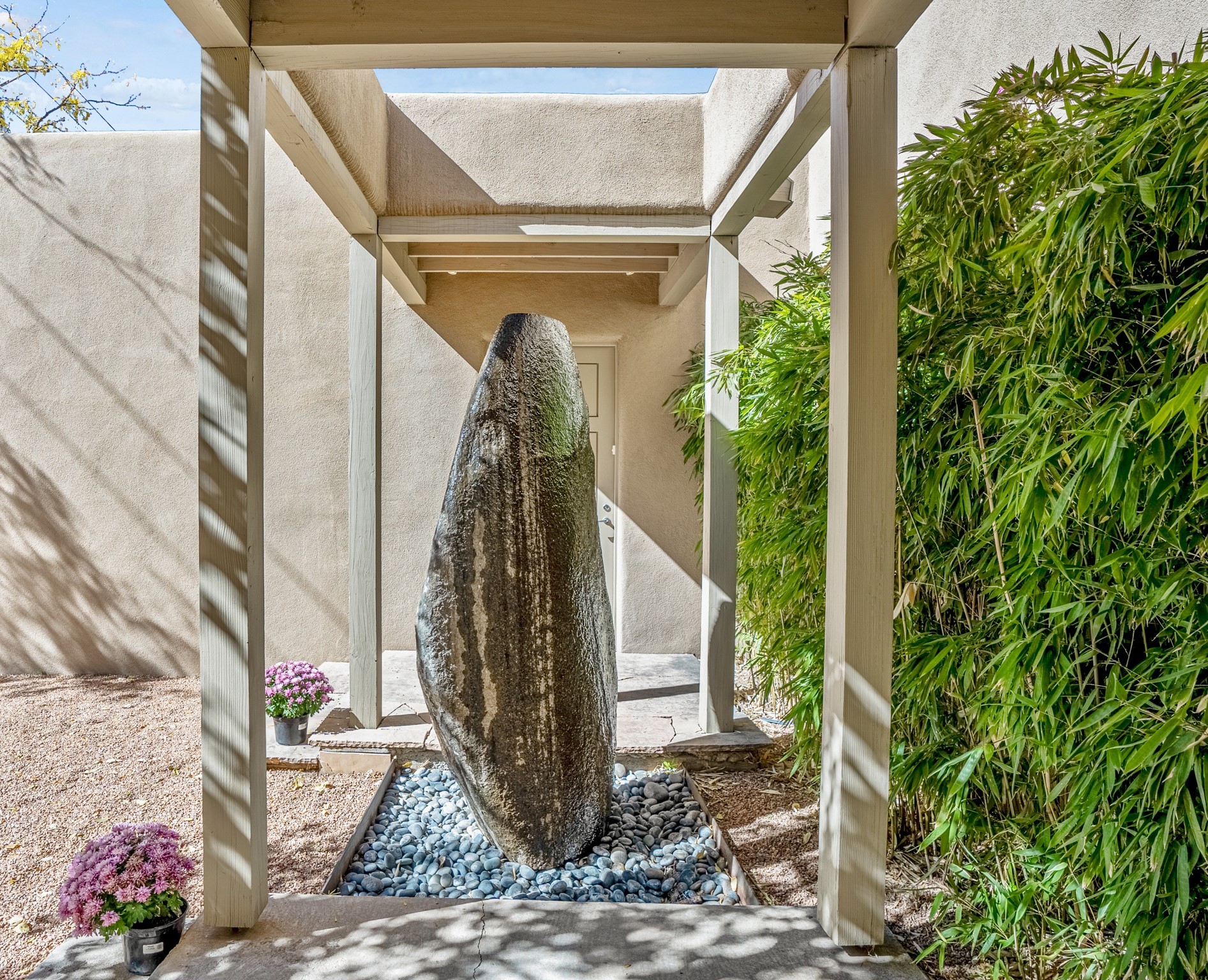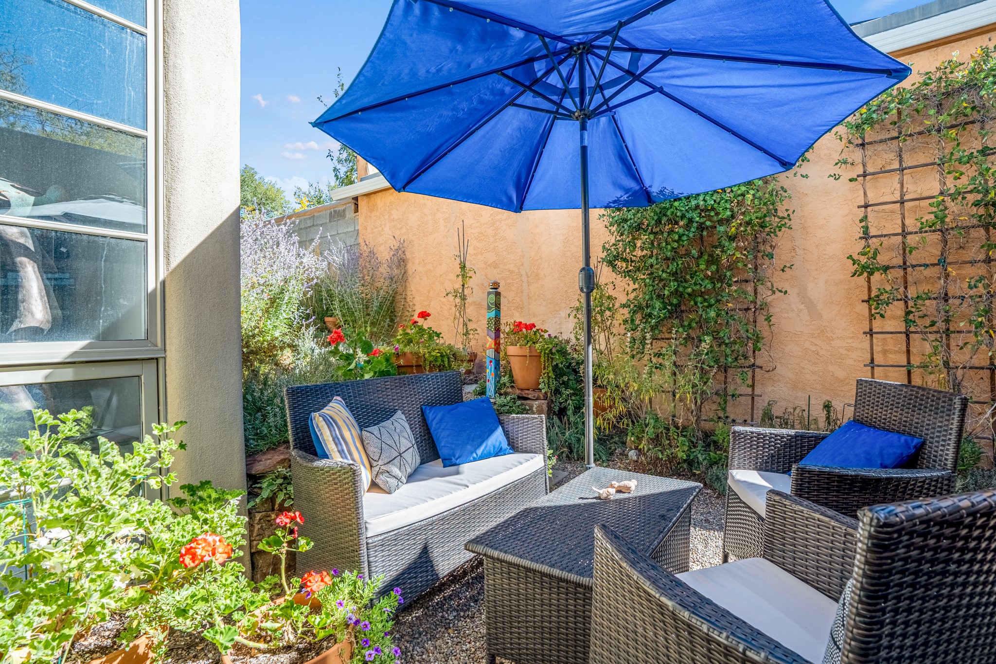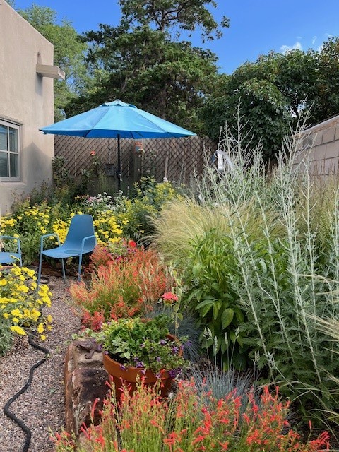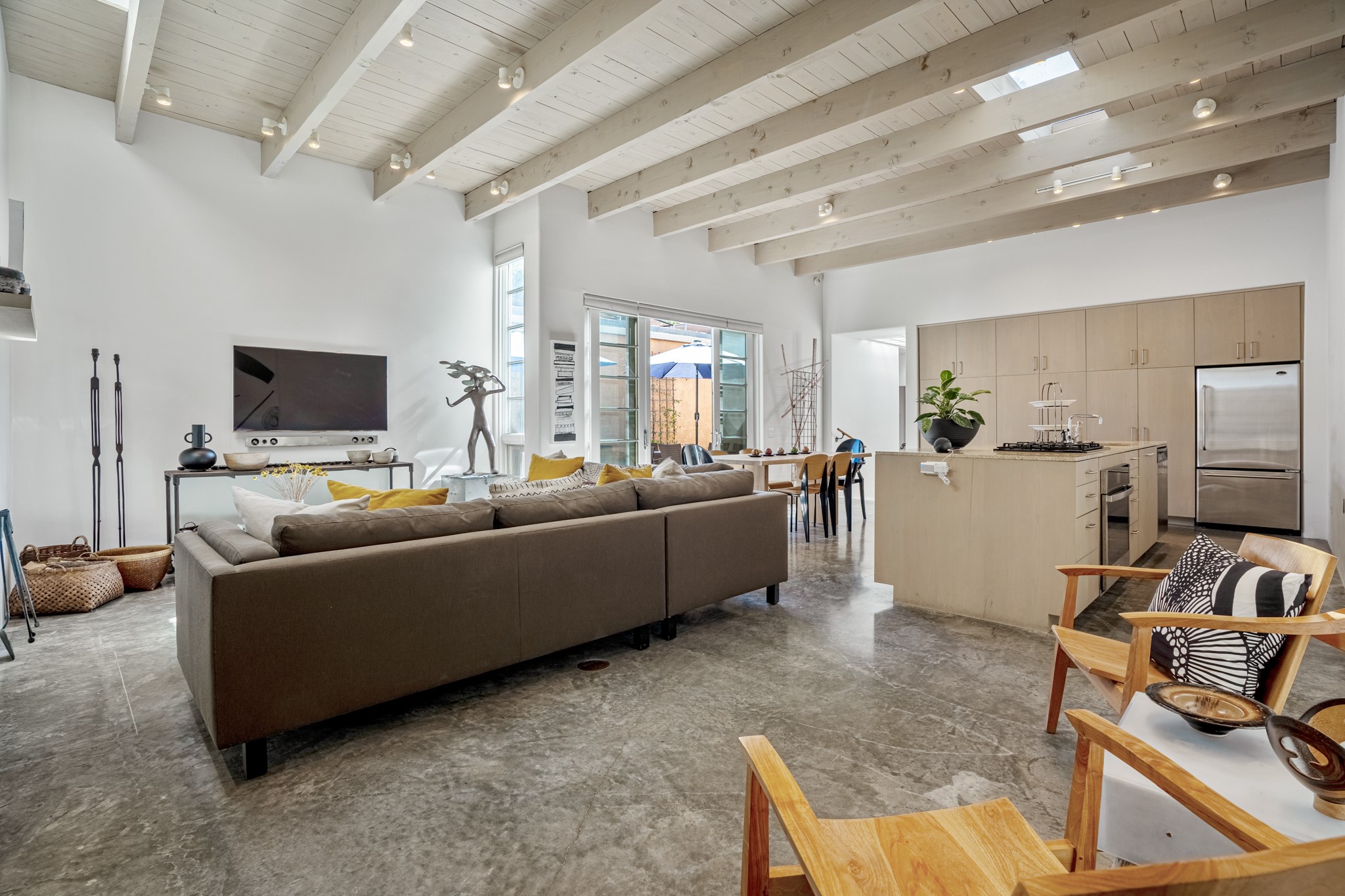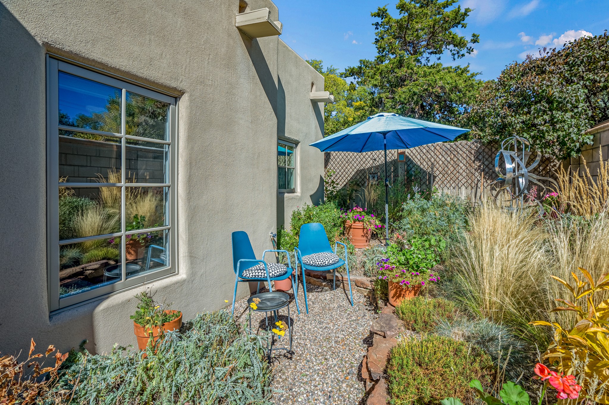 A contemporary gem in Historic Eastside! Located directly across from the Santa Fe river and just two blocks from The Plaza and Canyon Rd, this stunning 1482 sq. ft. condominium is the rare modern treasure. This elegant 2 bedroom/2 bathroom property is an open concept design with 12 ft beamed ceilings and beautiful stained concrete floors. The kitchen has a sleek design with a wall of custom cabinetry and a large island that is perfect for dinner parties and social gatherings. The extensive East-facing side courtyard has been beautifully landscaped with 2 sitting areas and offers a private oasis. The primary suite has wonderful separation from the main living area, high ceilings, a beautiful built-in shelving area and a large walk-in closet. The primary's bathroom has a double vanity with stone countertops and a walk-in shower. The guest bedroom is currently used as a working artist's studio and easily accommodates a queen-sized bed. 355 E. Alameda Unit B is that rare opportunity to own a superior contemporary property in Santa Fe's Historic Eastside.