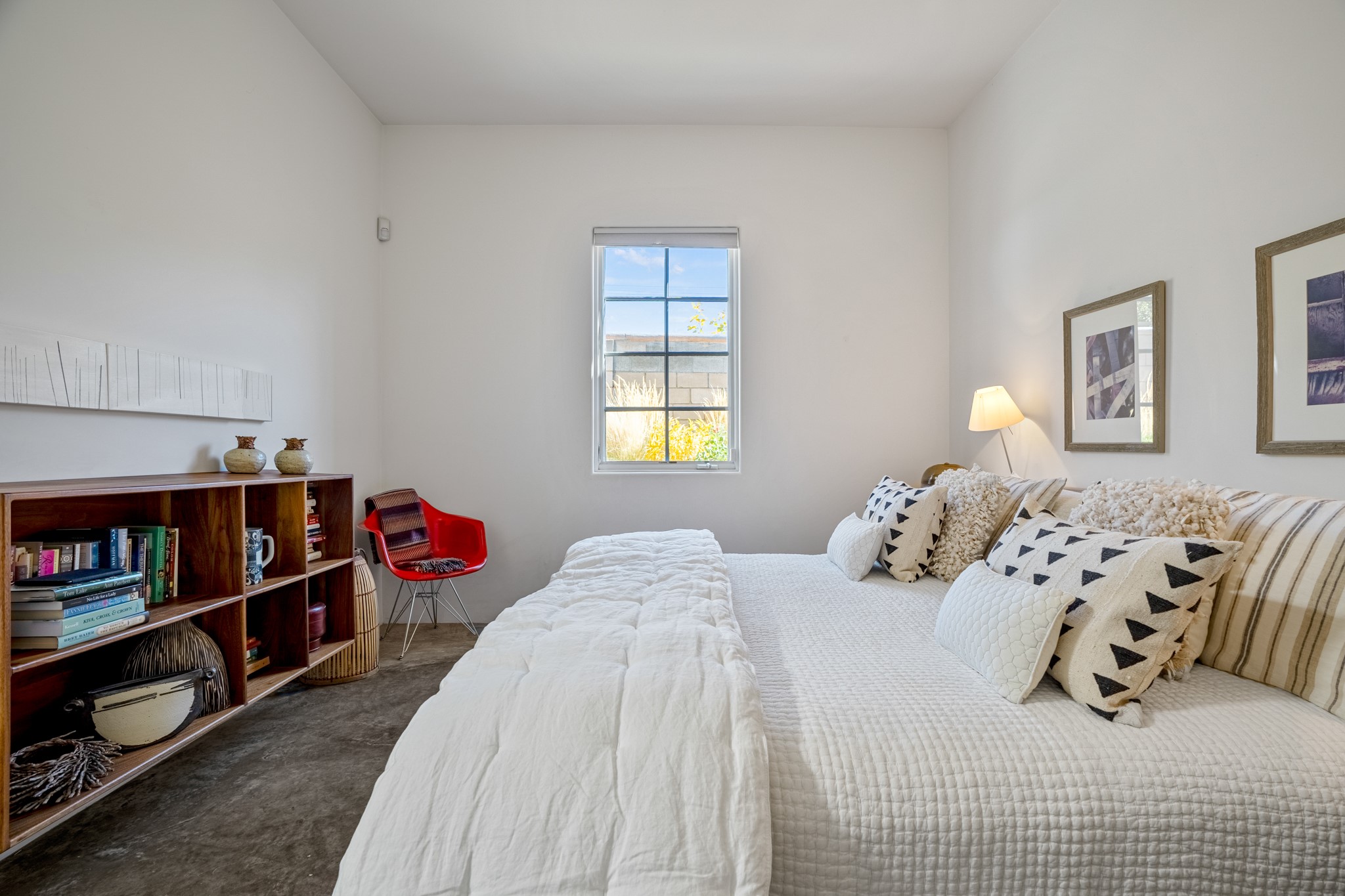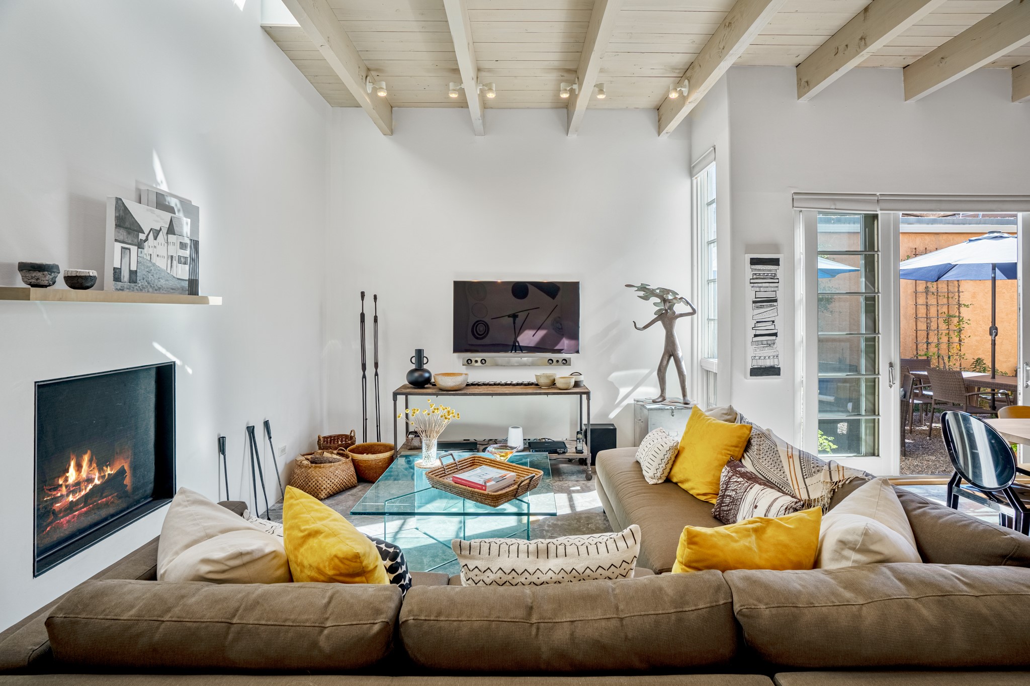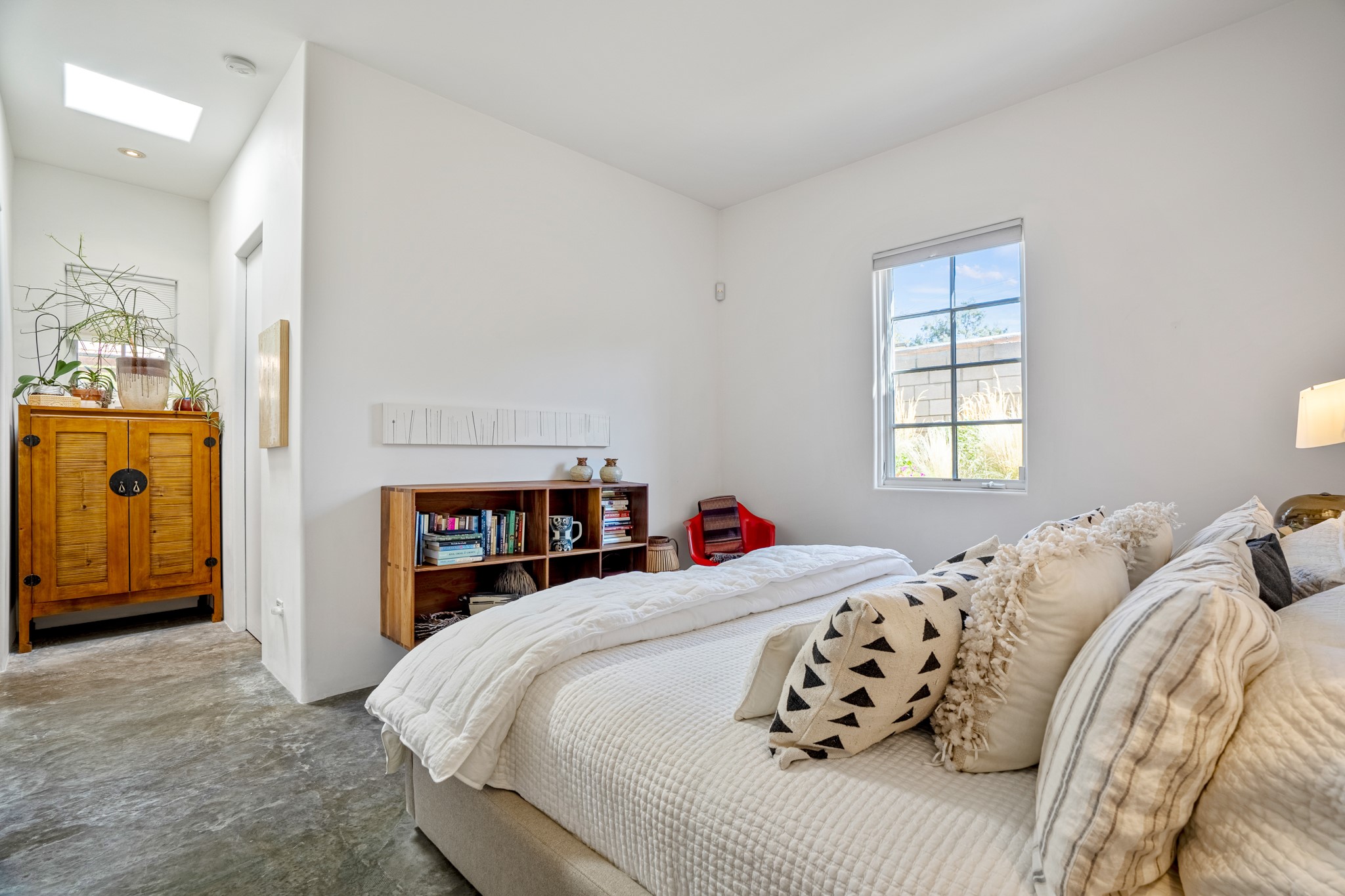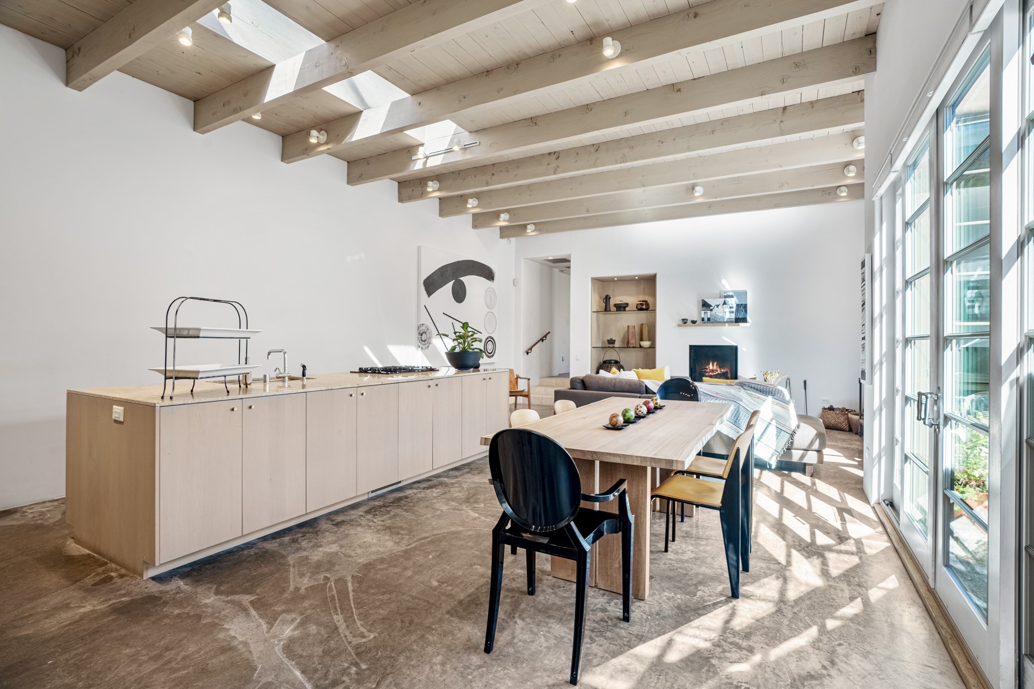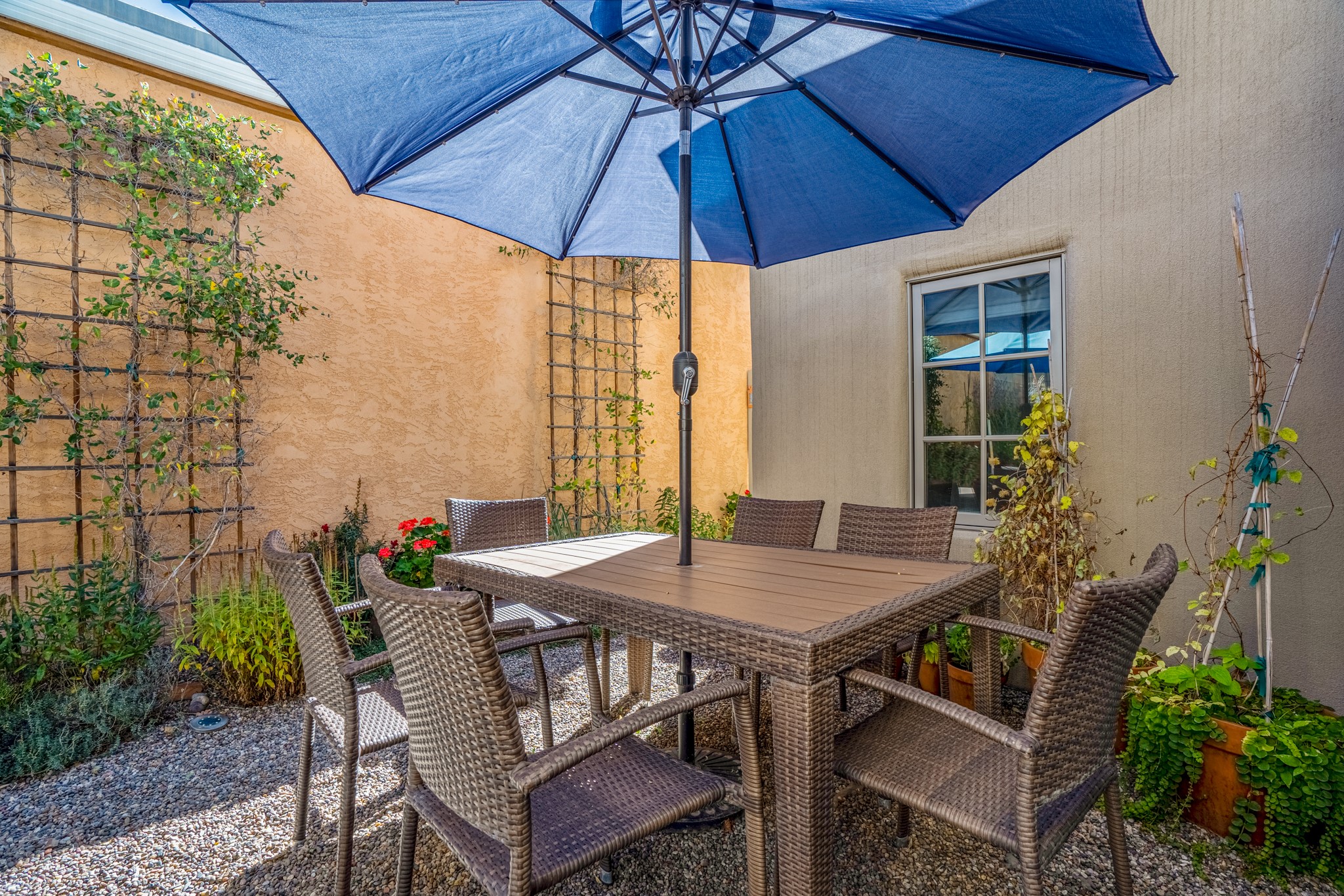 A contemporary gem in Historic Eastside! Located directly across from the Santa Fe river and just two blocks from The Plaza and Canyon Rd, this stunning 1482 sq. ft. condominium is the rare modern treasure. This elegant 2 bedroom/2 bathroom property is an open concept design with 12 ft beamed ceilings and beautiful stained concrete floors. The kitchen has a sleek design with a wall of custom cabinetry and a large island that is perfect for dinner parties and social gatherings. The extensive East-facing side courtyard has been beautifully landscaped with 2 sitting areas and offers a private oasis. The primary suite has wonderful separation from the main living area, high ceilings, a beautiful built-in shelving area and a large walk-in closet. The primary's bathroom has a double vanity with stone countertops and a walk-in shower. The guest bedroom is currently used as a working artist's studio and easily accommodates a queen-sized bed. 355 E. Alameda Unit B is that rare opportunity to own a superior contemporary property in Santa Fe's Historic Eastside.