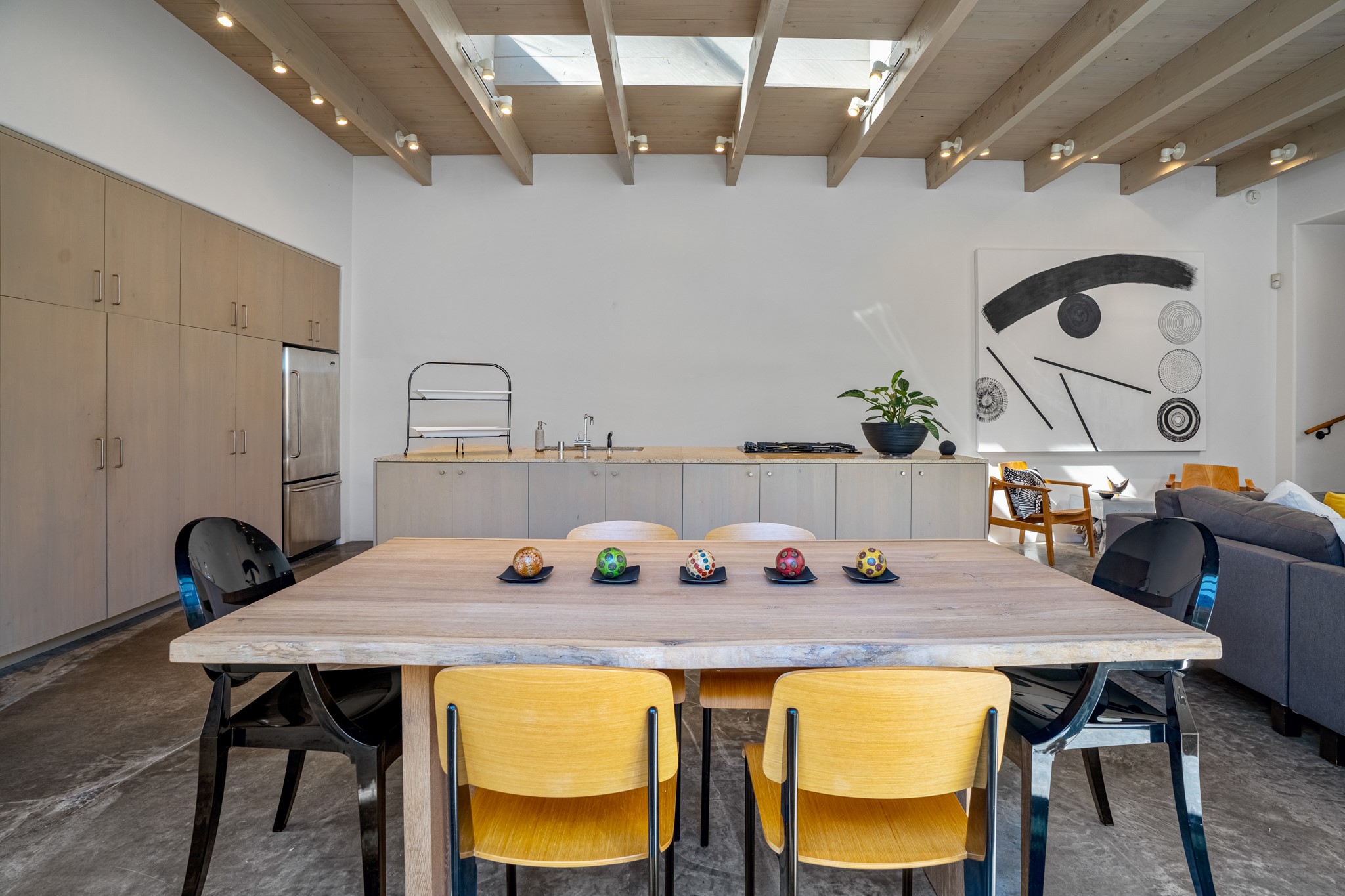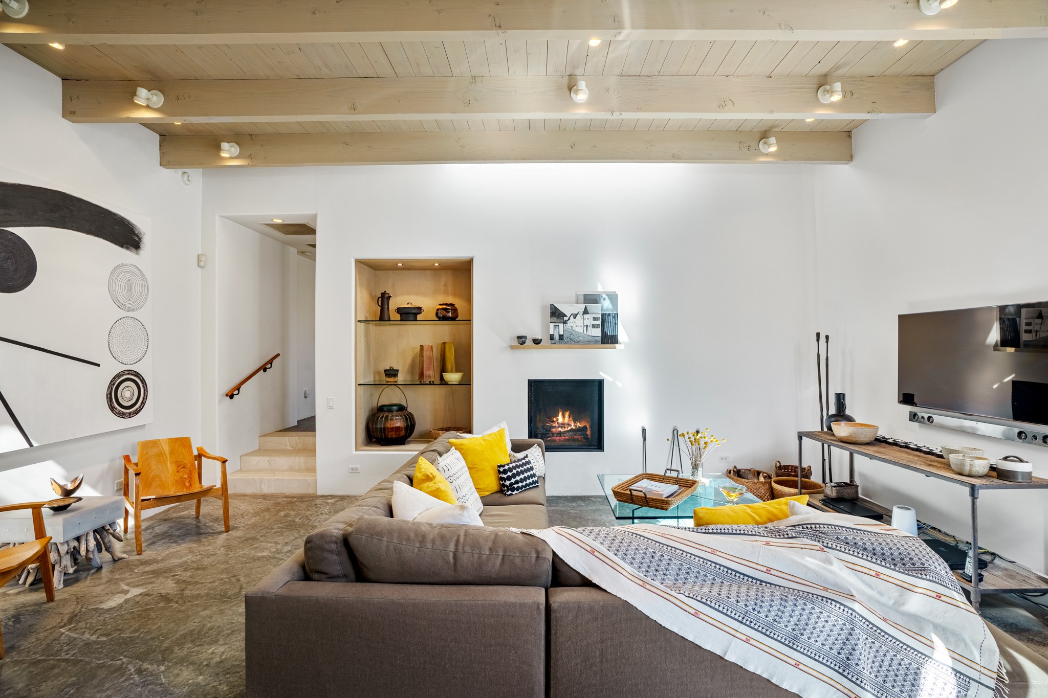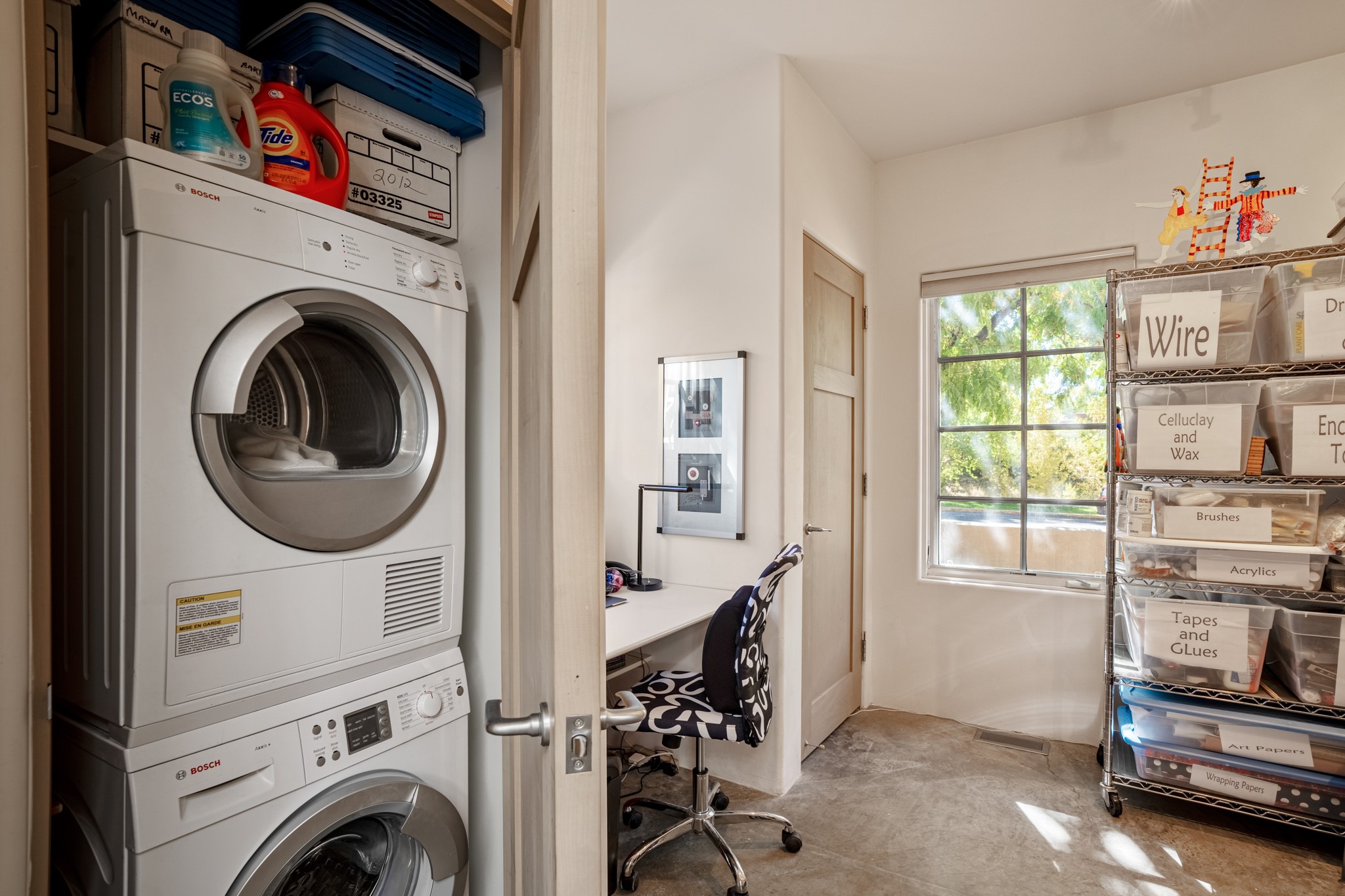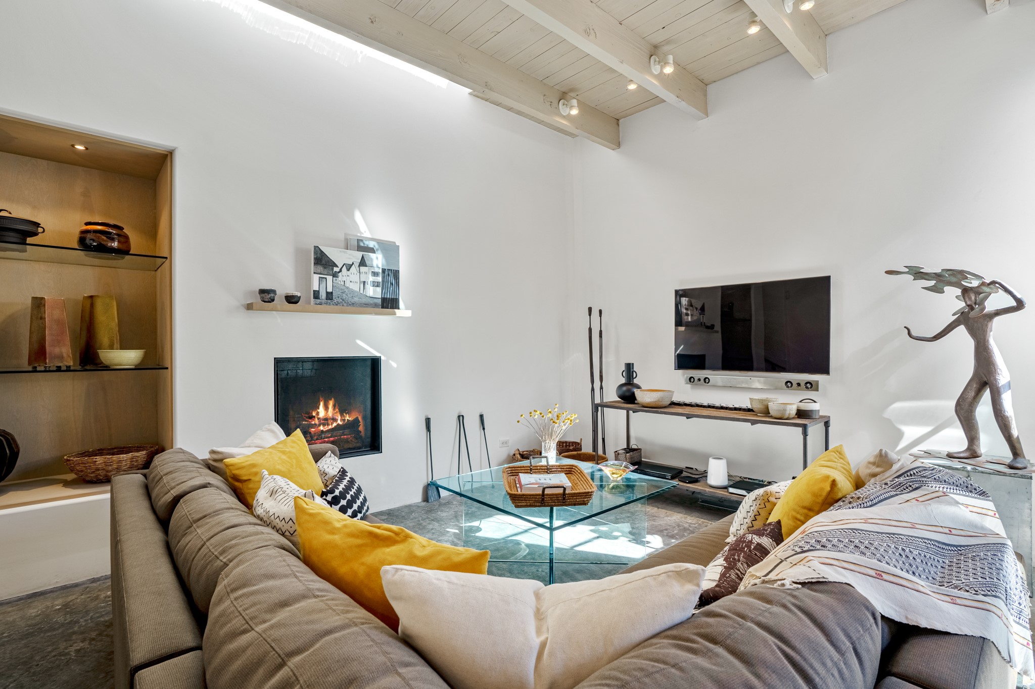 A contemporary gem in Historic Eastside! Located directly across from the Santa Fe river and just two blocks from The Plaza and Canyon Rd, this stunning 1482 sq. ft. condominium is the rare modern treasure. This elegant 2 bedroom/2 bathroom property is an open concept design with 12 ft beamed ceilings and beautiful stained concrete floors. The kitchen has a sleek design with a wall of custom cabinetry and a large island that is perfect for dinner parties and social gatherings. The extensive East-facing side courtyard has been beautifully landscaped with 2 sitting areas and offers a private oasis. The primary suite has wonderful separation from the main living area, high ceilings, a beautiful built-in shelving area and a large walk-in closet. The primary's bathroom has a double vanity with stone countertops and a walk-in shower. The guest bedroom is currently used as a working artist's studio and easily accommodates a queen-sized bed. 355 E. Alameda Unit B is that rare opportunity to own a superior contemporary property in Santa Fe's Historic Eastside.