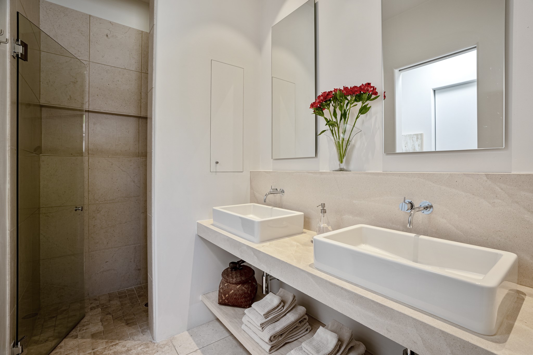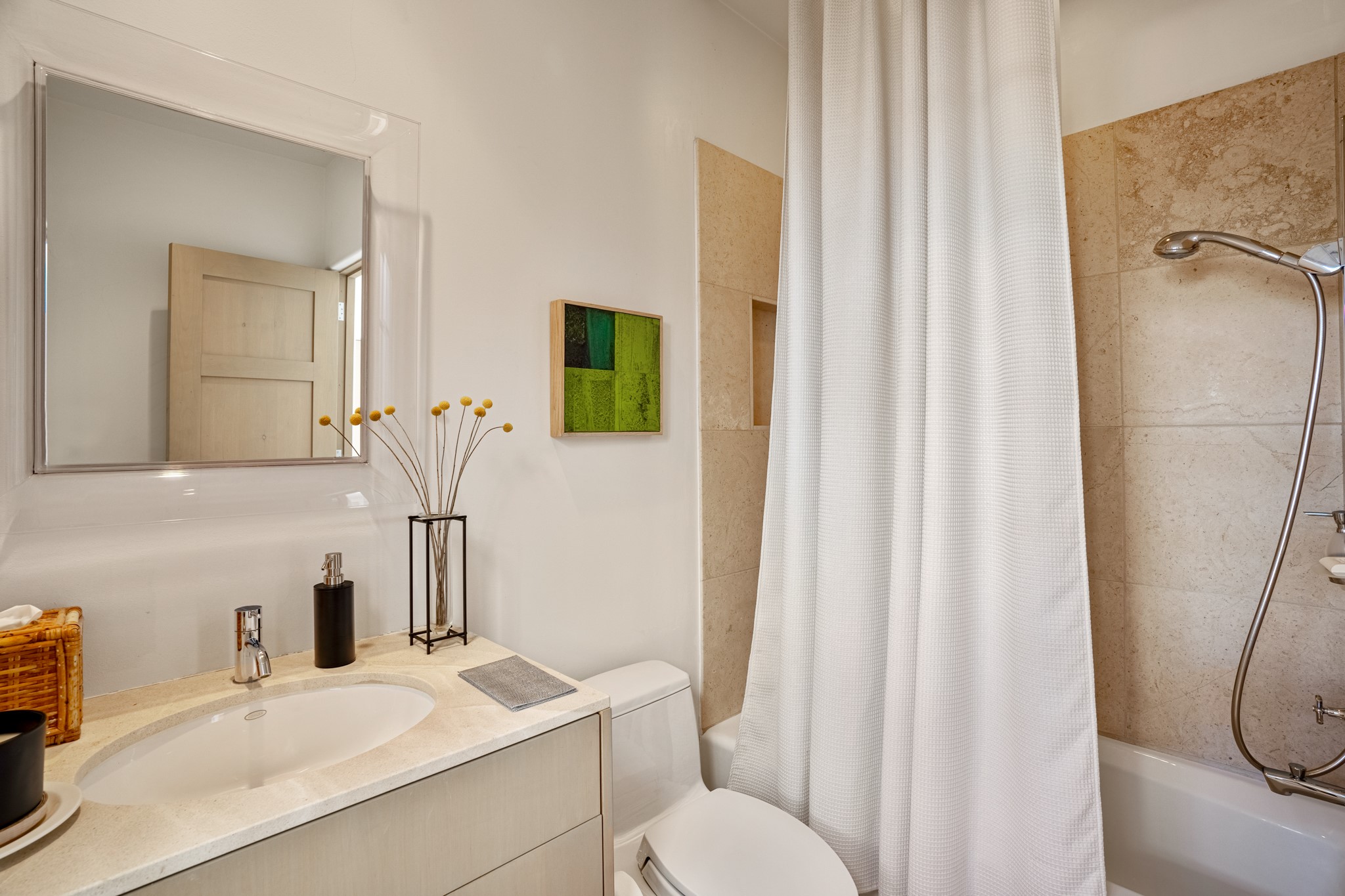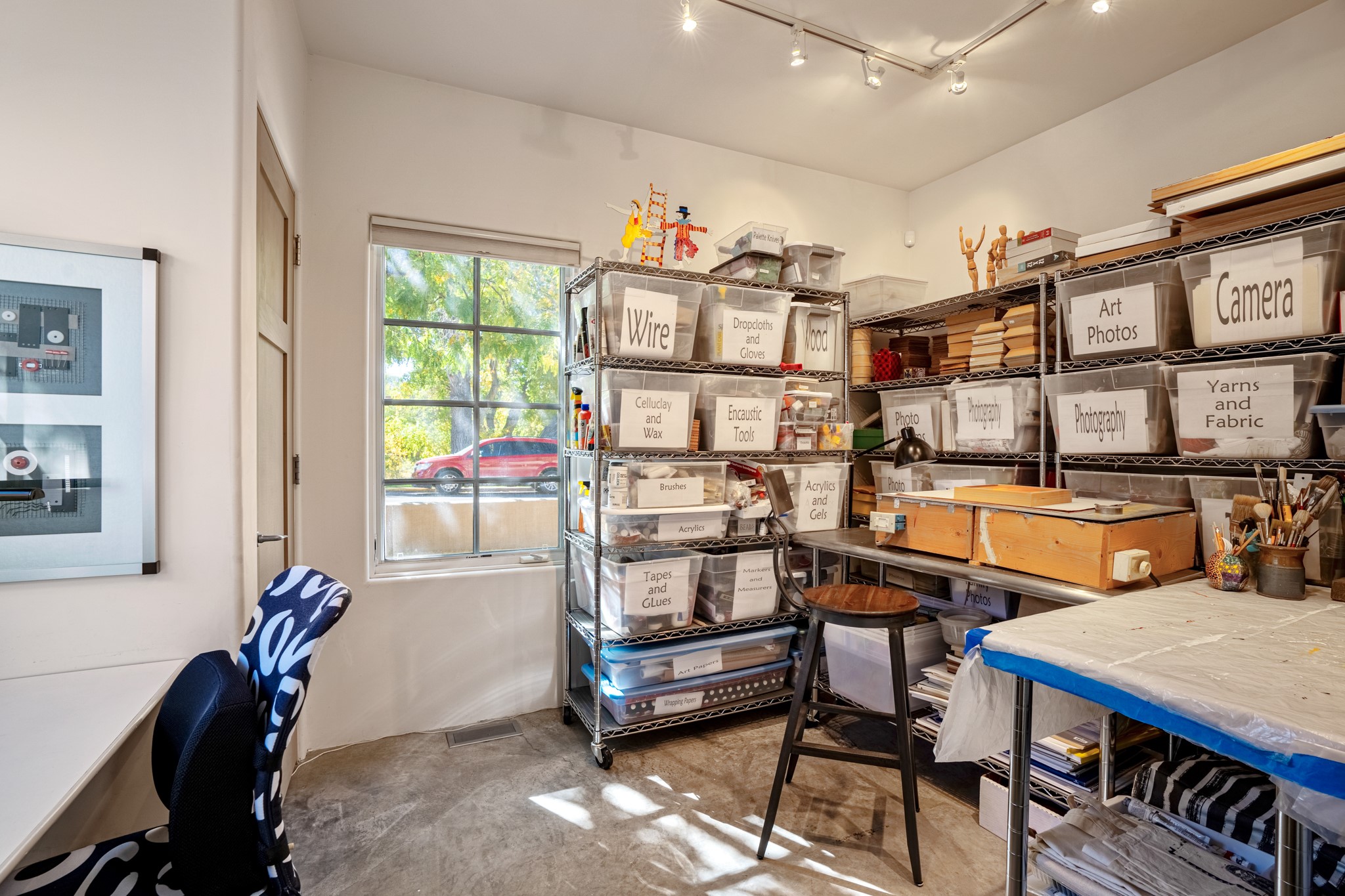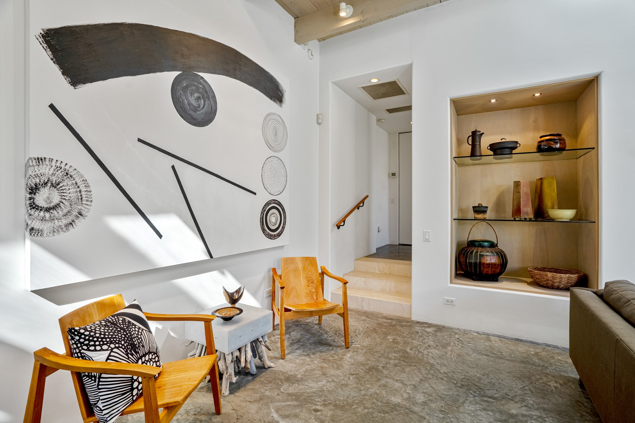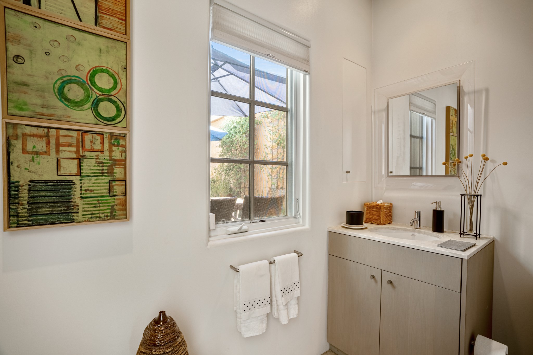 A contemporary gem in Historic Eastside! Located directly across from the Santa Fe river and just two blocks from The Plaza and Canyon Rd, this stunning 1482 sq. ft. condominium is the rare modern treasure. This elegant 2 bedroom/2 bathroom property is an open concept design with 12 ft beamed ceilings and beautiful stained concrete floors. The kitchen has a sleek design with a wall of custom cabinetry and a large island that is perfect for dinner parties and social gatherings. The extensive East-facing side courtyard has been beautifully landscaped with 2 sitting areas and offers a private oasis. The primary suite has wonderful separation from the main living area, high ceilings, a beautiful built-in shelving area and a large walk-in closet. The primary's bathroom has a double vanity with stone countertops and a walk-in shower. The guest bedroom is currently used as a working artist's studio and easily accommodates a queen-sized bed. 355 E. Alameda Unit B is that rare opportunity to own a superior contemporary property in Santa Fe's Historic Eastside.
