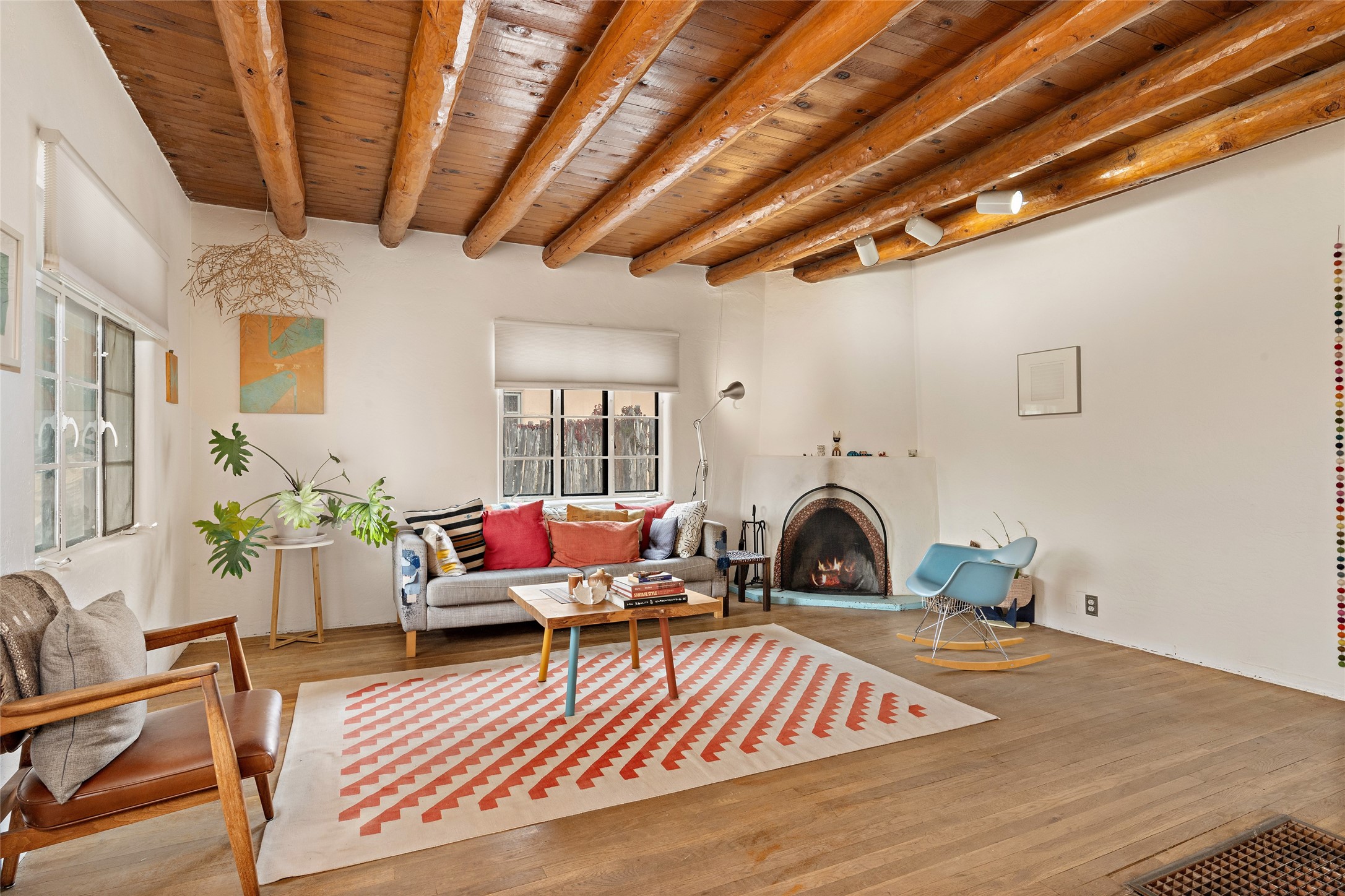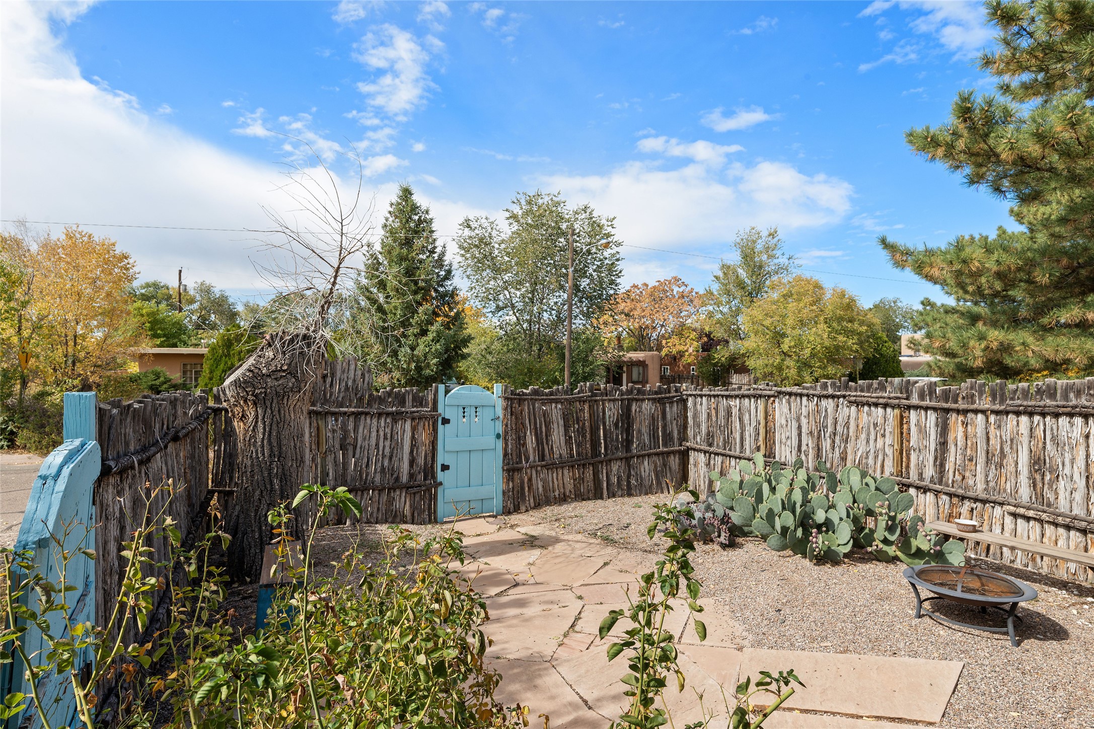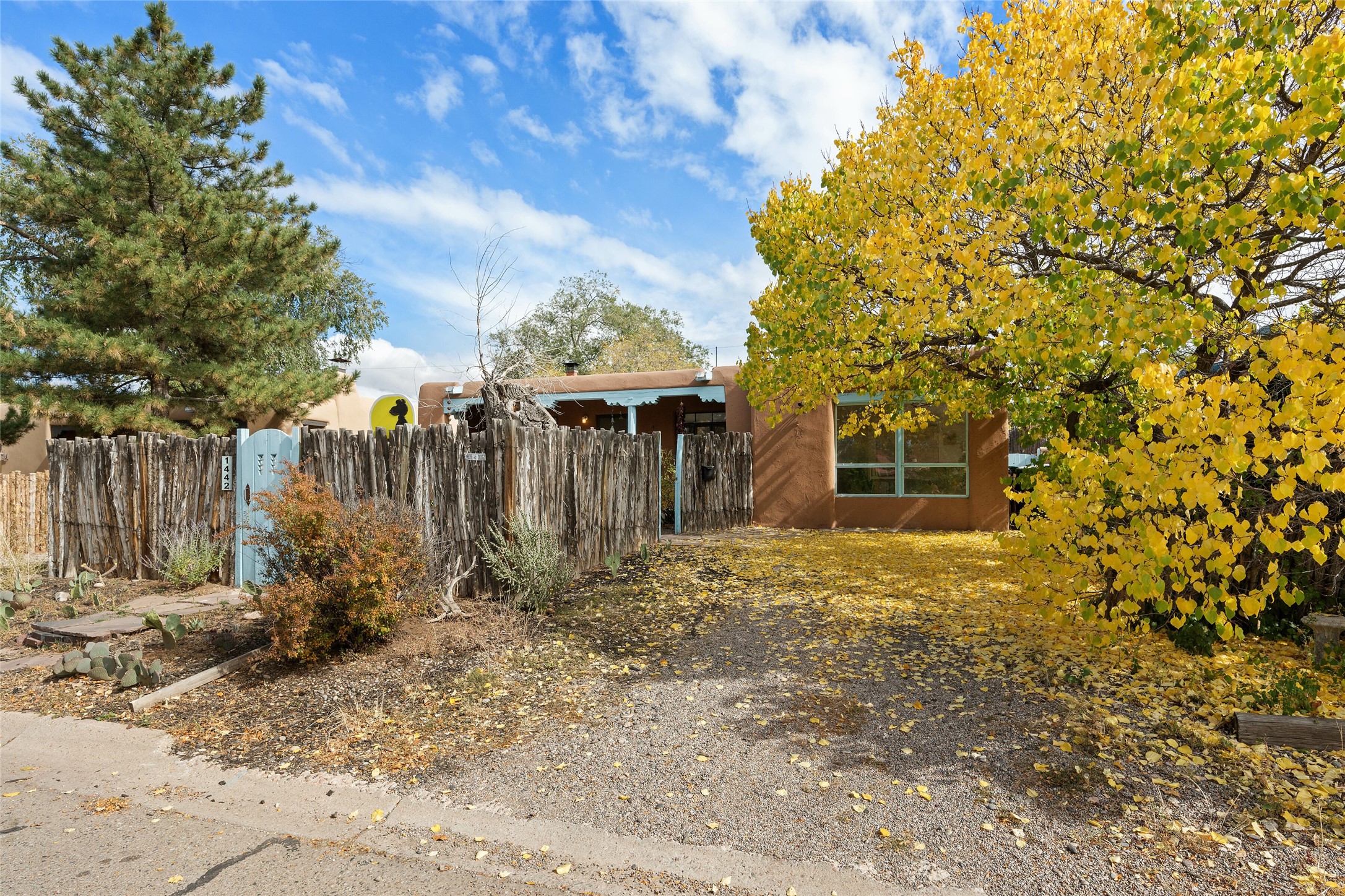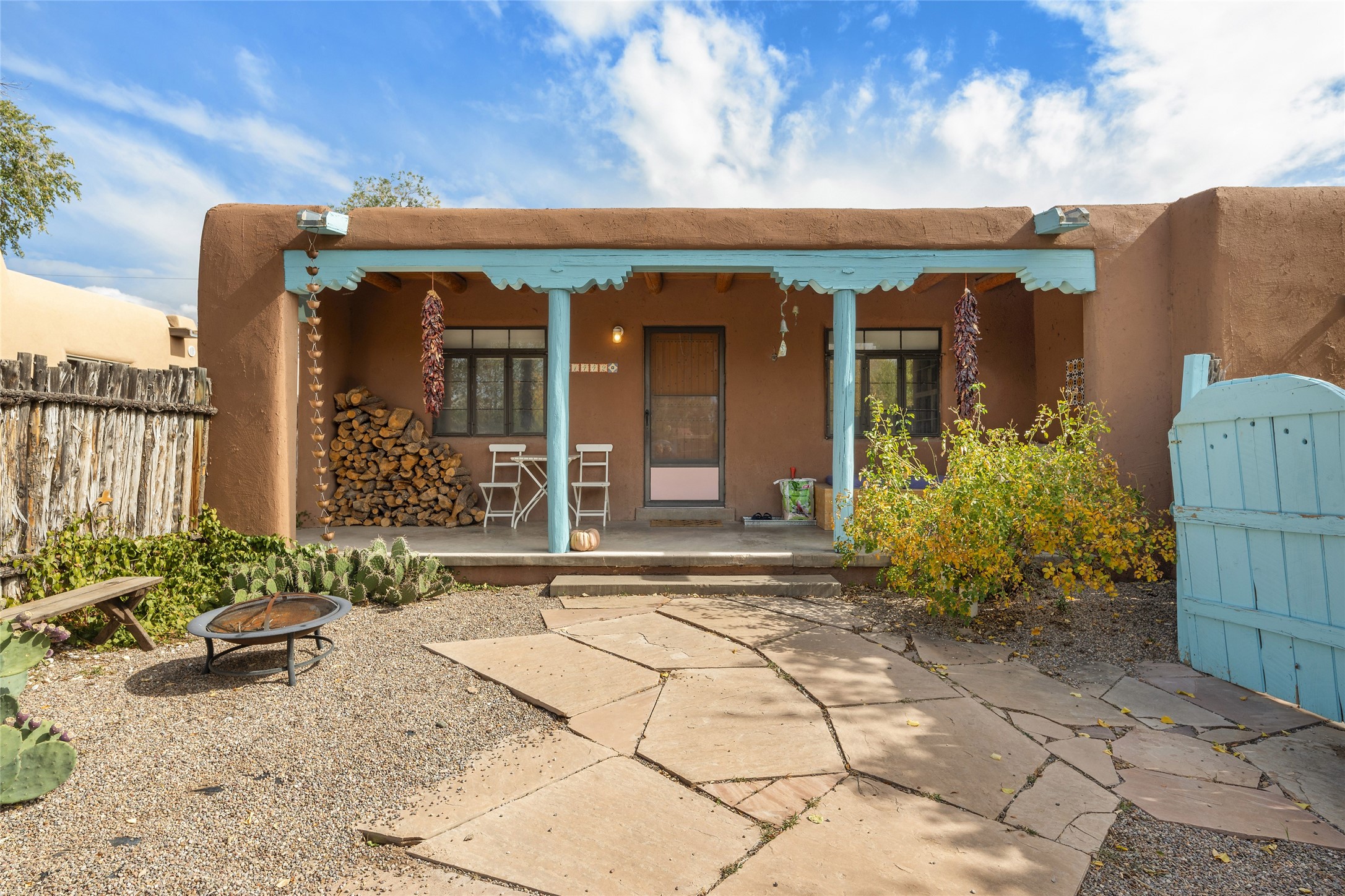 Charming Santa Fe Stamm home with a warm and inviting atmosphere. This lovely property boasts a harmonious blend of wood and saltillo tile floors, creating a cozy and Southwestern aesthetic. Gather around the kiva fireplace on chilly evenings while admiring the character provided by the beam ceilings and skylight, allowing natural light to flood the interior. Abundant windows make the space bright and cheerful, creating an ideal environment for artistic endeavors. This 3-bedroom, 2-bathroom home includes a versatile studio, perfect for pursuing hobbies or work-from-home opportunities. The primary bedroom offers a full bath and a convenient walk-in closet. An additional guest bedroom also features a walk-in closet, ensuring ample storage.Outside, the property showcases resided storage, large apricot trees, and a covered portal off the art studio with bancos for relaxation and entertainment. The back patio, complete with a built-in bench or banco seat, is an excellent spot for al fresco dining or unwinding. The traditional Santa Fe-style coyote fence adds character to the front yard, while the front porch features a welcoming bench.The location is enhanced by the presence of a nearby park, offering green spaces for leisure and recreation while just a couple minutes to downtown. Also, walking distance to restaurants, coffee shops and bakeries.Additional features include AC and forced air heating for year-round comfort. Recent updates include new plumbing with sewer pipes, including steel and PVC components, ensuring peace of mind and long-term durability. This Santa Fe Stamm home is a tradition style providing a serene retreat for its lucky residents.