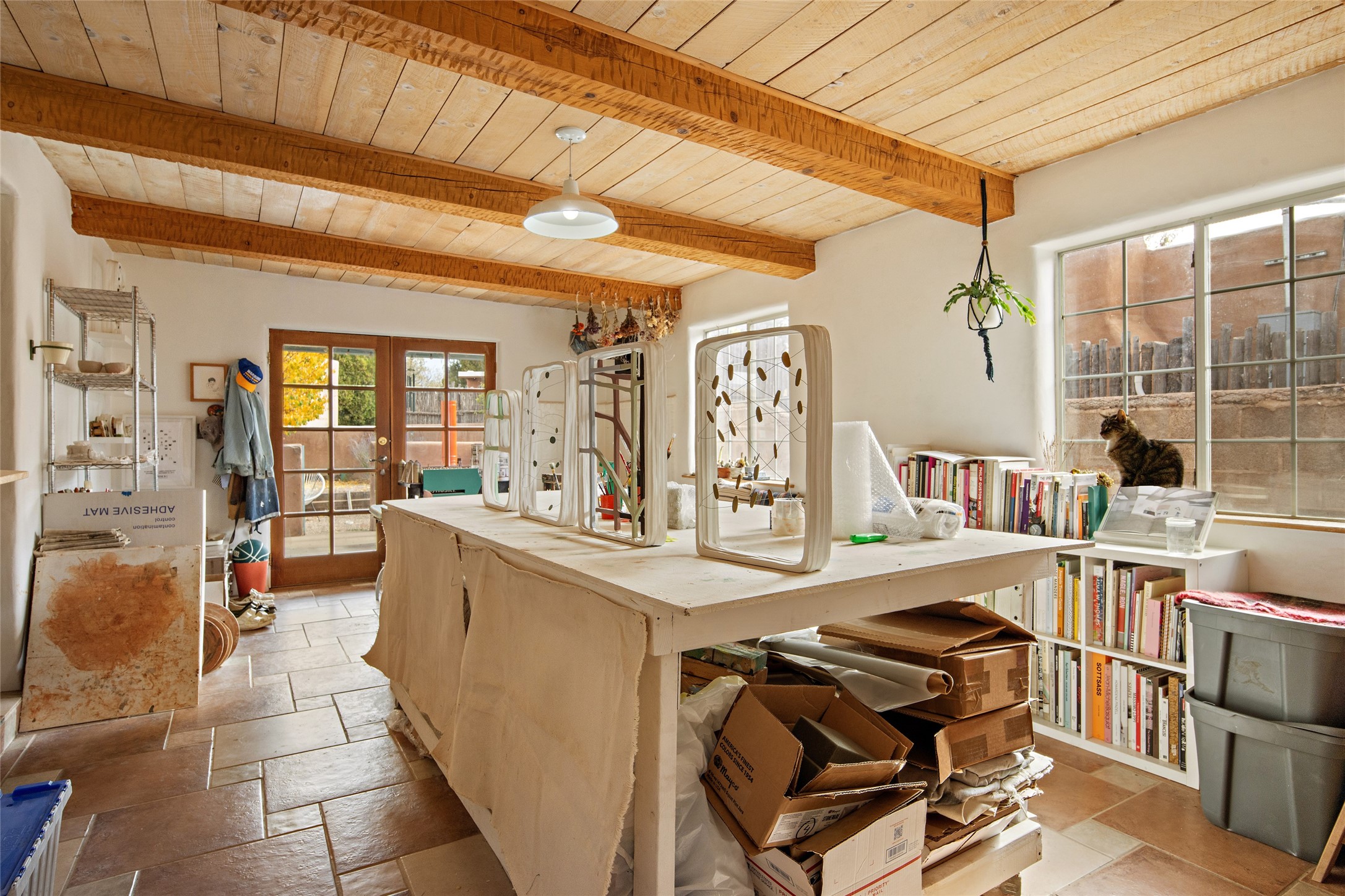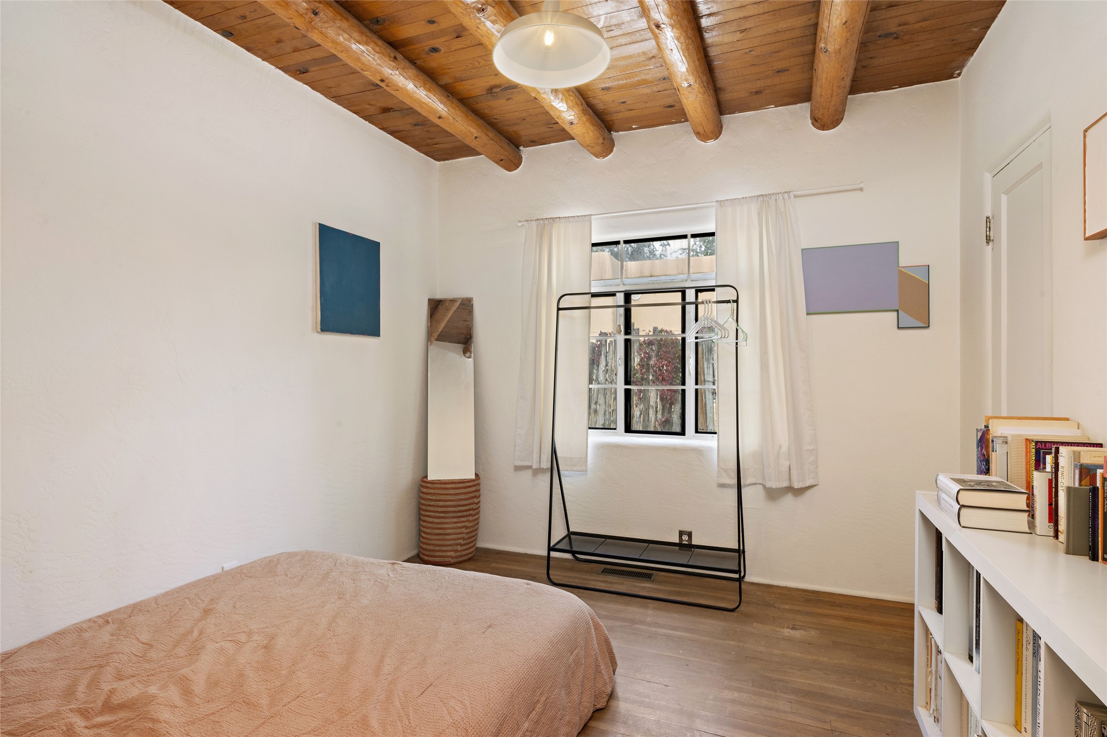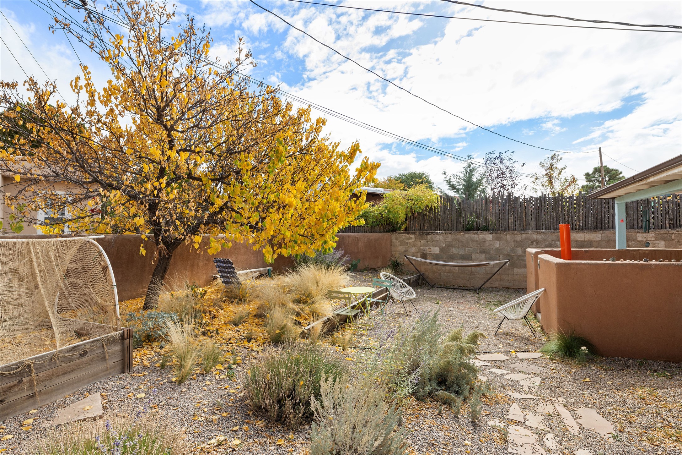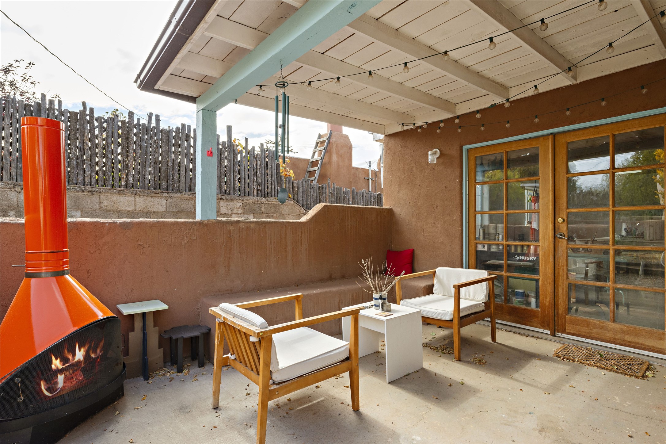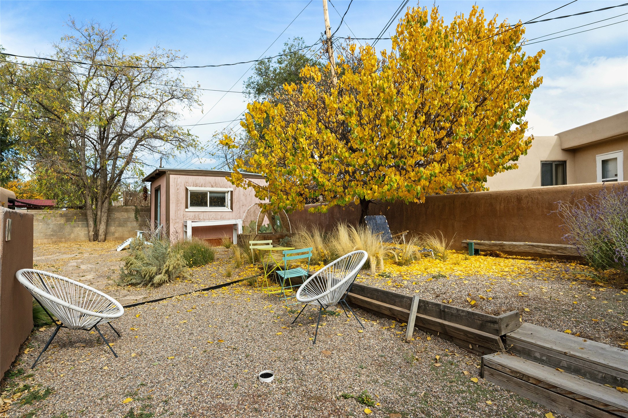 Charming Santa Fe Stamm home with a warm and inviting atmosphere. This lovely property boasts a harmonious blend of wood and saltillo tile floors, creating a cozy and Southwestern aesthetic. Gather around the kiva fireplace on chilly evenings while admiring the character provided by the beam ceilings and skylight, allowing natural light to flood the interior. Abundant windows make the space bright and cheerful, creating an ideal environment for artistic endeavors. This 3-bedroom, 2-bathroom home includes a versatile studio, perfect for pursuing hobbies or work-from-home opportunities. The primary bedroom offers a full bath and a convenient walk-in closet. An additional guest bedroom also features a walk-in closet, ensuring ample storage.Outside, the property showcases resided storage, large apricot trees, and a covered portal off the art studio with bancos for relaxation and entertainment. The back patio, complete with a built-in bench or banco seat, is an excellent spot for al fresco dining or unwinding. The traditional Santa Fe-style coyote fence adds character to the front yard, while the front porch features a welcoming bench.The location is enhanced by the presence of a nearby park, offering green spaces for leisure and recreation while just a couple minutes to downtown. Also, walking distance to restaurants, coffee shops and bakeries.Additional features include AC and forced air heating for year-round comfort. Recent updates include new plumbing with sewer pipes, including steel and PVC components, ensuring peace of mind and long-term durability. This Santa Fe Stamm home is a tradition style providing a serene retreat for its lucky residents.