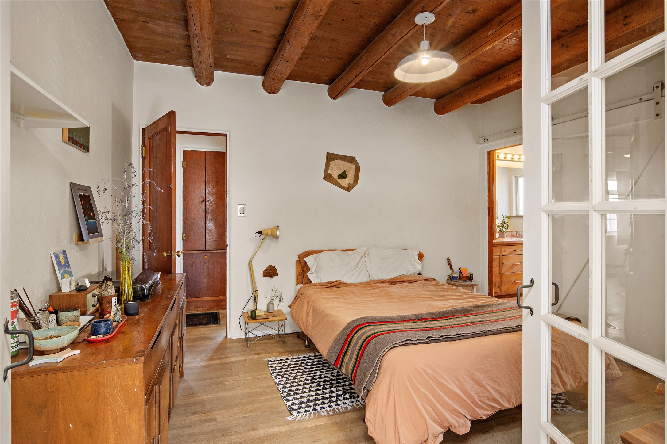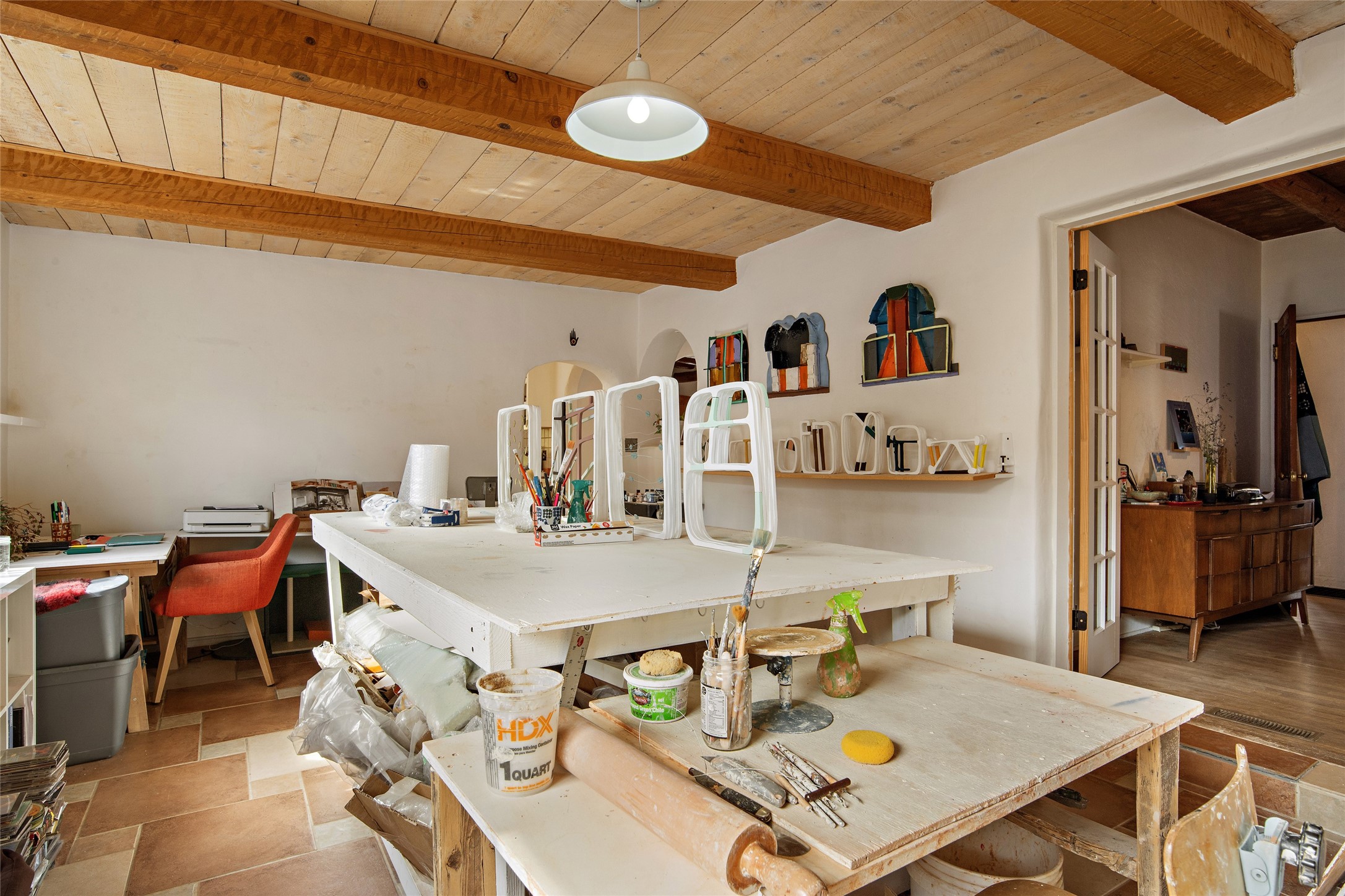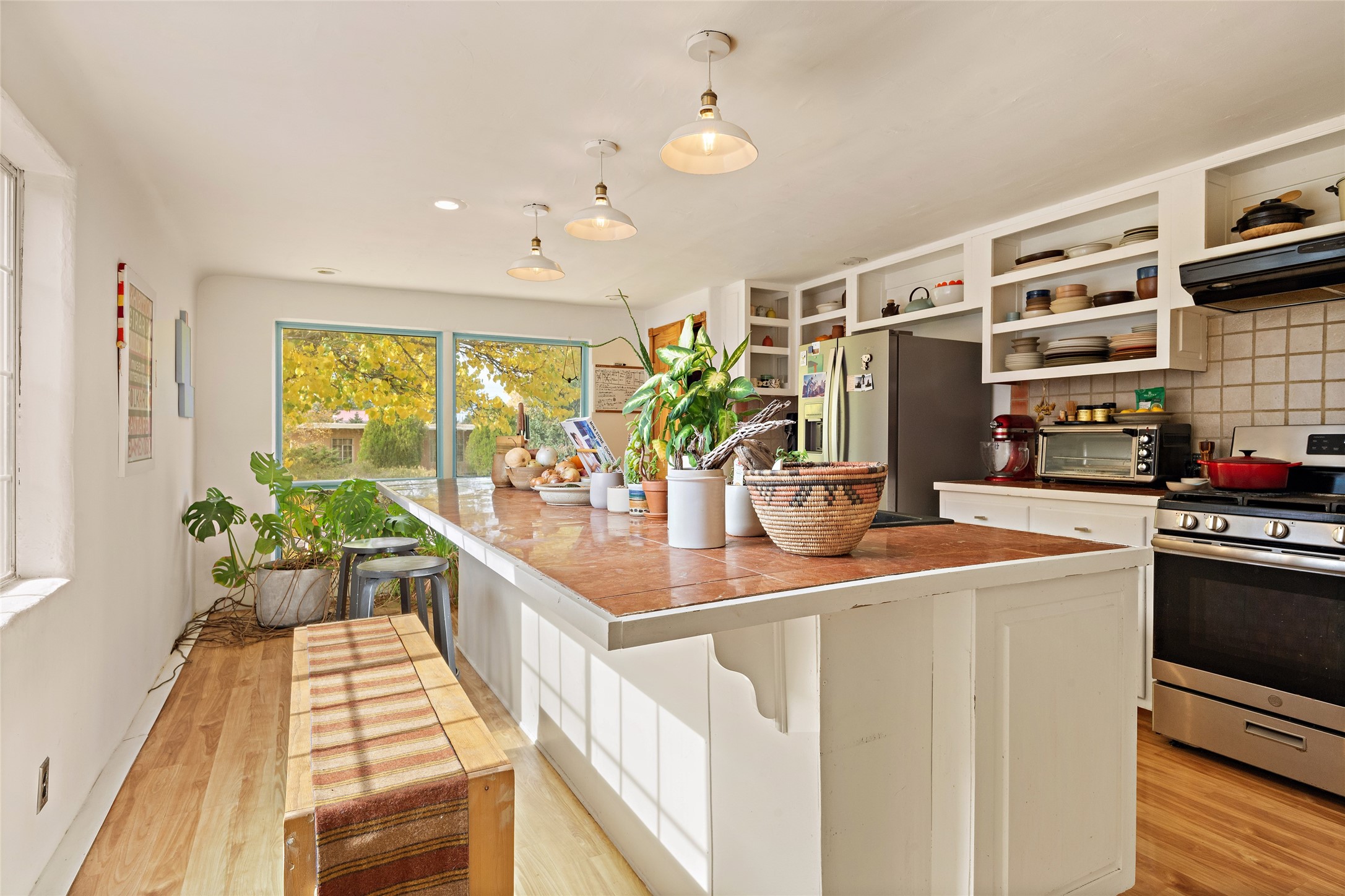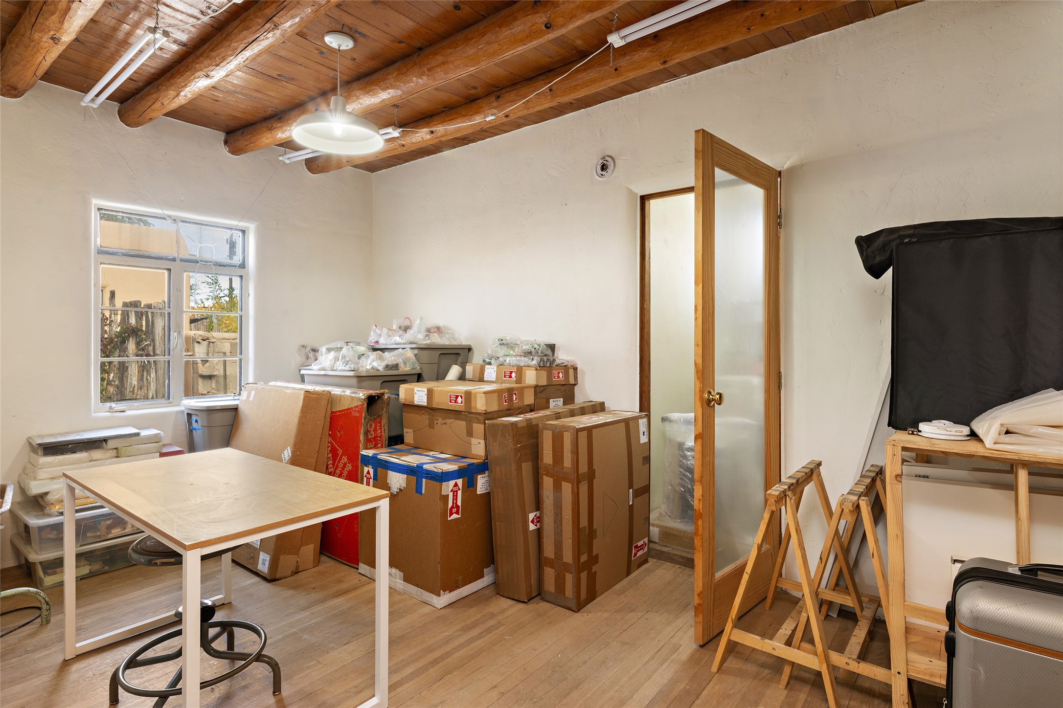 Charming Santa Fe Stamm home with a warm and inviting atmosphere. This lovely property boasts a harmonious blend of wood and saltillo tile floors, creating a cozy and Southwestern aesthetic. Gather around the kiva fireplace on chilly evenings while admiring the character provided by the beam ceilings and skylight, allowing natural light to flood the interior. Abundant windows make the space bright and cheerful, creating an ideal environment for artistic endeavors. This 3-bedroom, 2-bathroom home includes a versatile studio, perfect for pursuing hobbies or work-from-home opportunities. The primary bedroom offers a full bath and a convenient walk-in closet. An additional guest bedroom also features a walk-in closet, ensuring ample storage.Outside, the property showcases resided storage, large apricot trees, and a covered portal off the art studio with bancos for relaxation and entertainment. The back patio, complete with a built-in bench or banco seat, is an excellent spot for al fresco dining or unwinding. The traditional Santa Fe-style coyote fence adds character to the front yard, while the front porch features a welcoming bench.The location is enhanced by the presence of a nearby park, offering green spaces for leisure and recreation while just a couple minutes to downtown. Also, walking distance to restaurants, coffee shops and bakeries.Additional features include AC and forced air heating for year-round comfort. Recent updates include new plumbing with sewer pipes, including steel and PVC components, ensuring peace of mind and long-term durability. This Santa Fe Stamm home is a tradition style providing a serene retreat for its lucky residents.