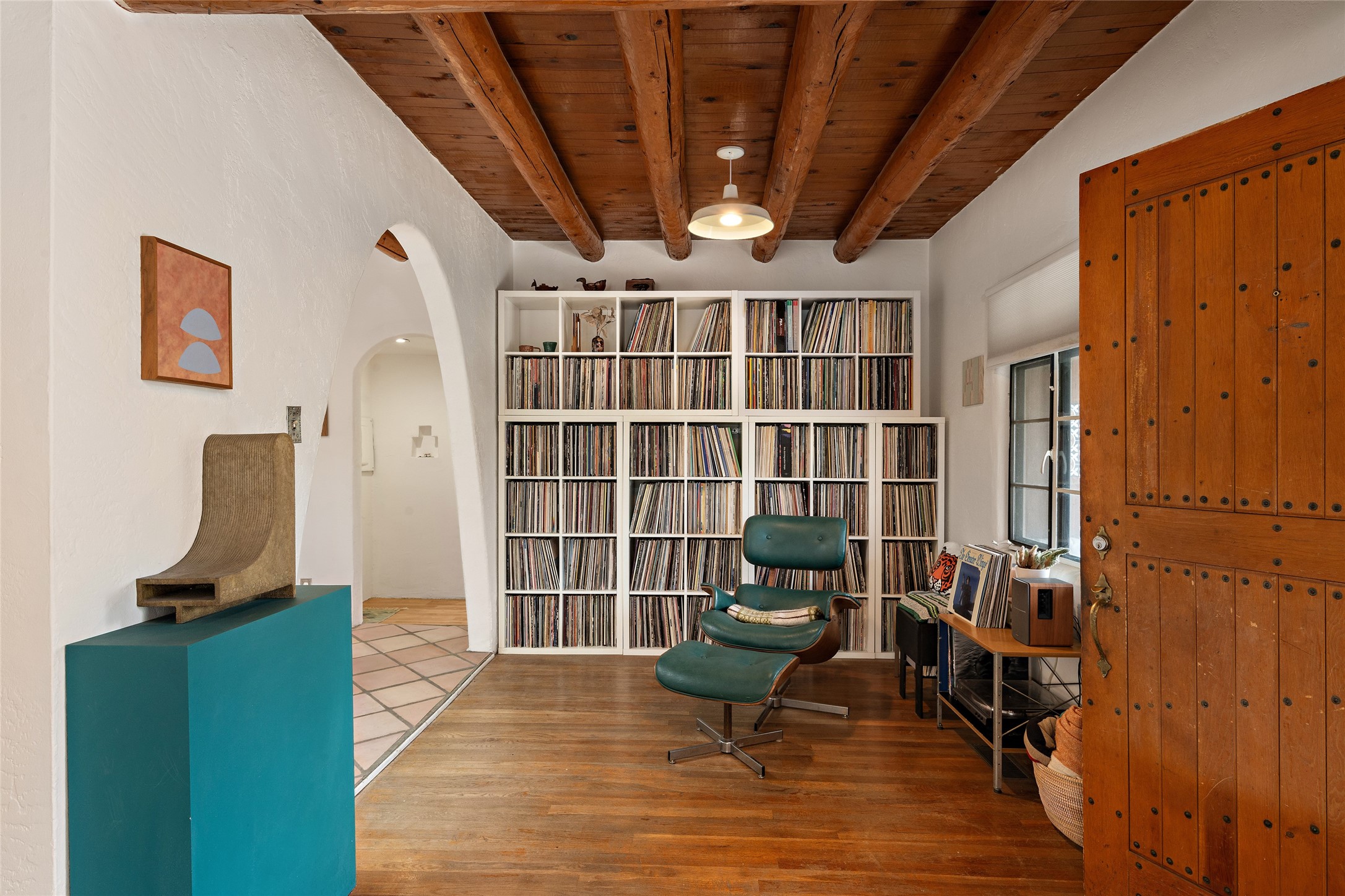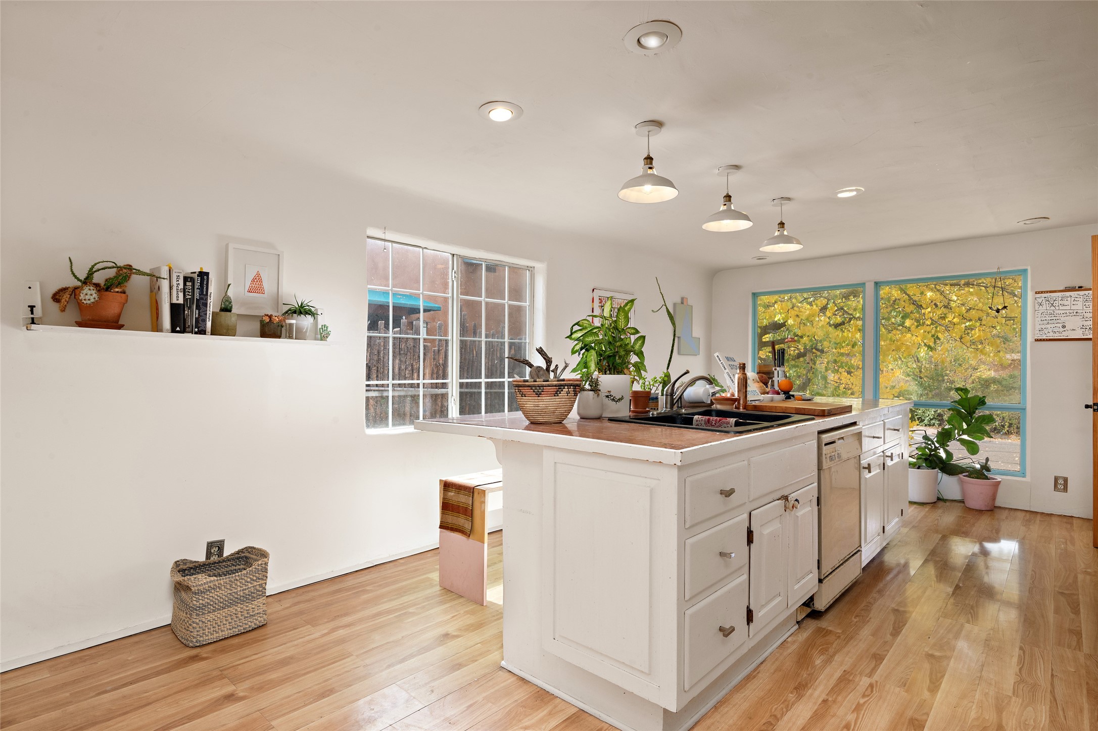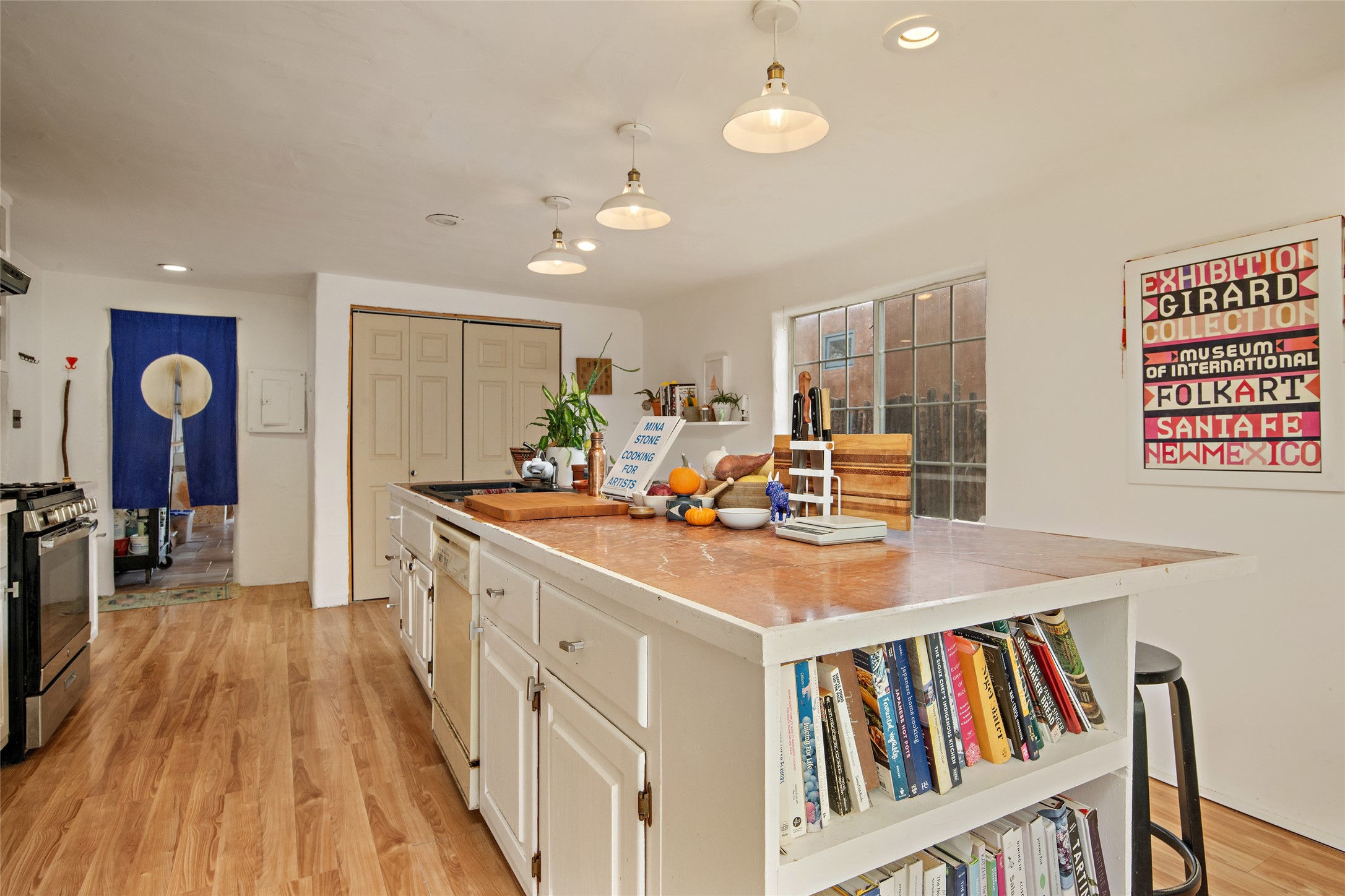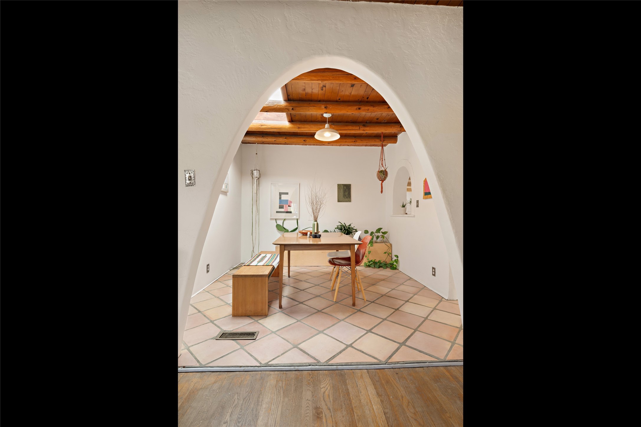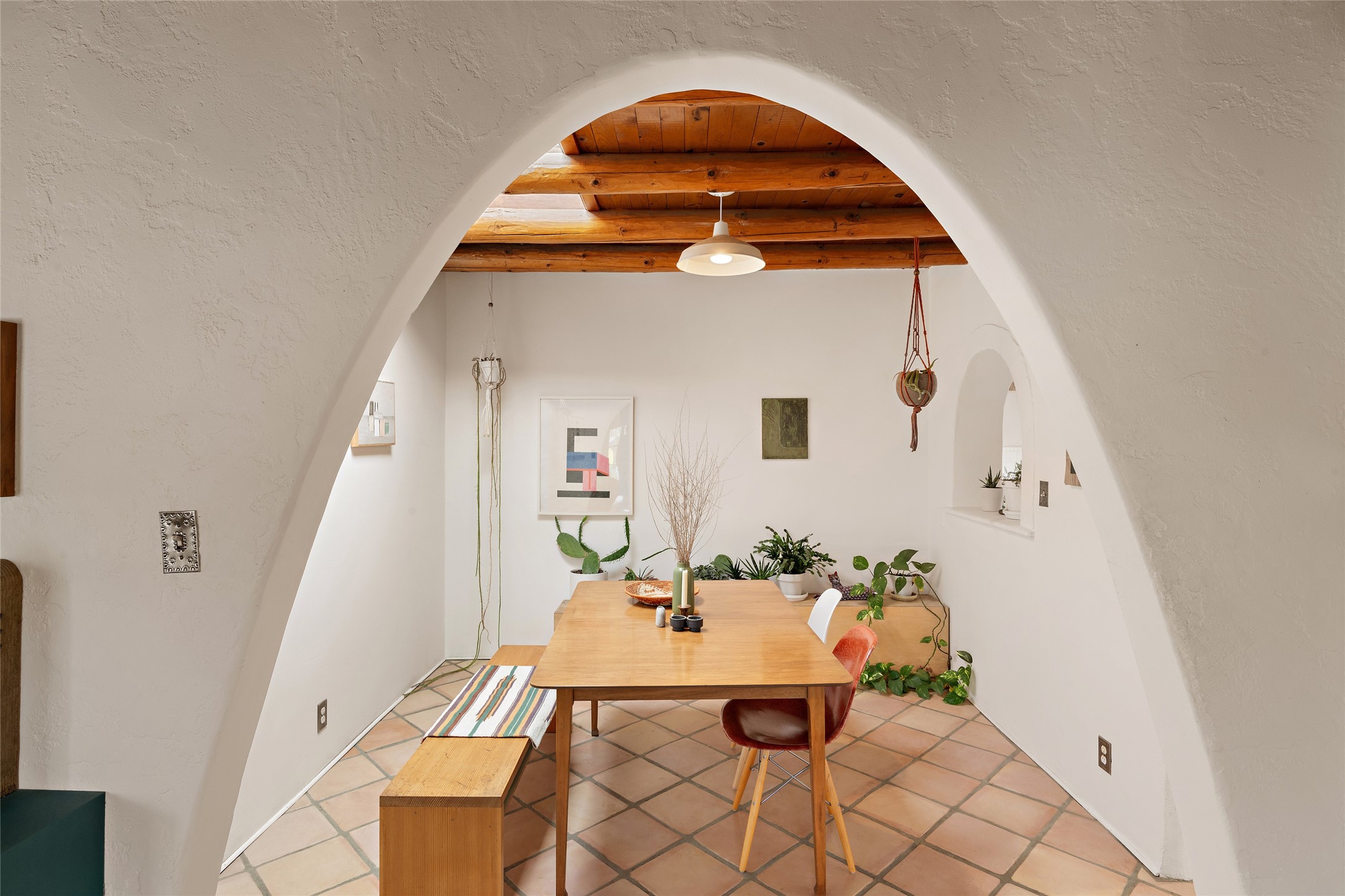 Charming Santa Fe Stamm home with a warm and inviting atmosphere. This lovely property boasts a harmonious blend of wood and saltillo tile floors, creating a cozy and Southwestern aesthetic. Gather around the kiva fireplace on chilly evenings while admiring the character provided by the beam ceilings and skylight, allowing natural light to flood the interior. Abundant windows make the space bright and cheerful, creating an ideal environment for artistic endeavors. This 3-bedroom, 2-bathroom home includes a versatile studio, perfect for pursuing hobbies or work-from-home opportunities. The primary bedroom offers a full bath and a convenient walk-in closet. An additional guest bedroom also features a walk-in closet, ensuring ample storage.Outside, the property showcases resided storage, large apricot trees, and a covered portal off the art studio with bancos for relaxation and entertainment. The back patio, complete with a built-in bench or banco seat, is an excellent spot for al fresco dining or unwinding. The traditional Santa Fe-style coyote fence adds character to the front yard, while the front porch features a welcoming bench.The location is enhanced by the presence of a nearby park, offering green spaces for leisure and recreation while just a couple minutes to downtown. Also, walking distance to restaurants, coffee shops and bakeries.Additional features include AC and forced air heating for year-round comfort. Recent updates include new plumbing with sewer pipes, including steel and PVC components, ensuring peace of mind and long-term durability. This Santa Fe Stamm home is a tradition style providing a serene retreat for its lucky residents.
