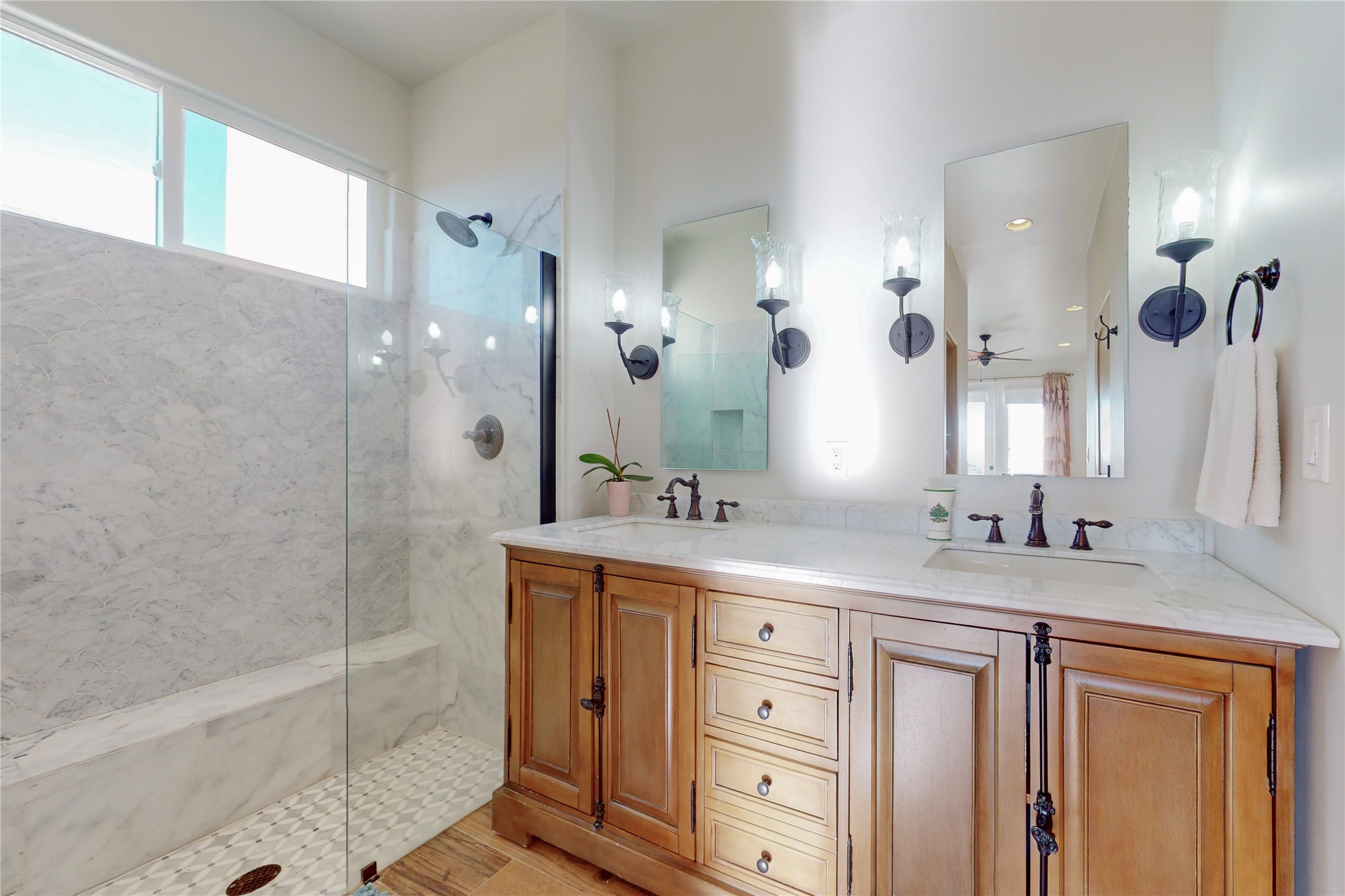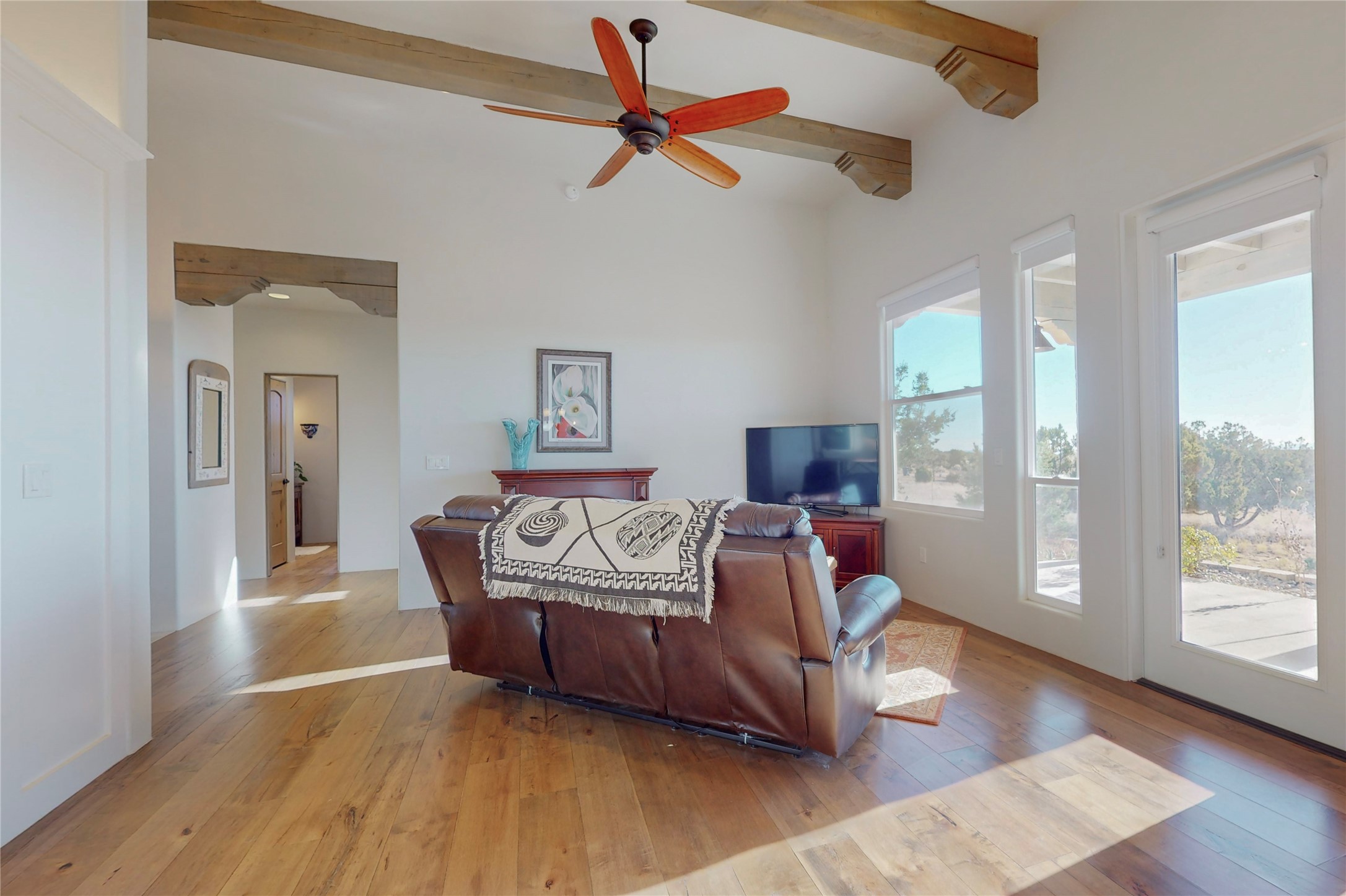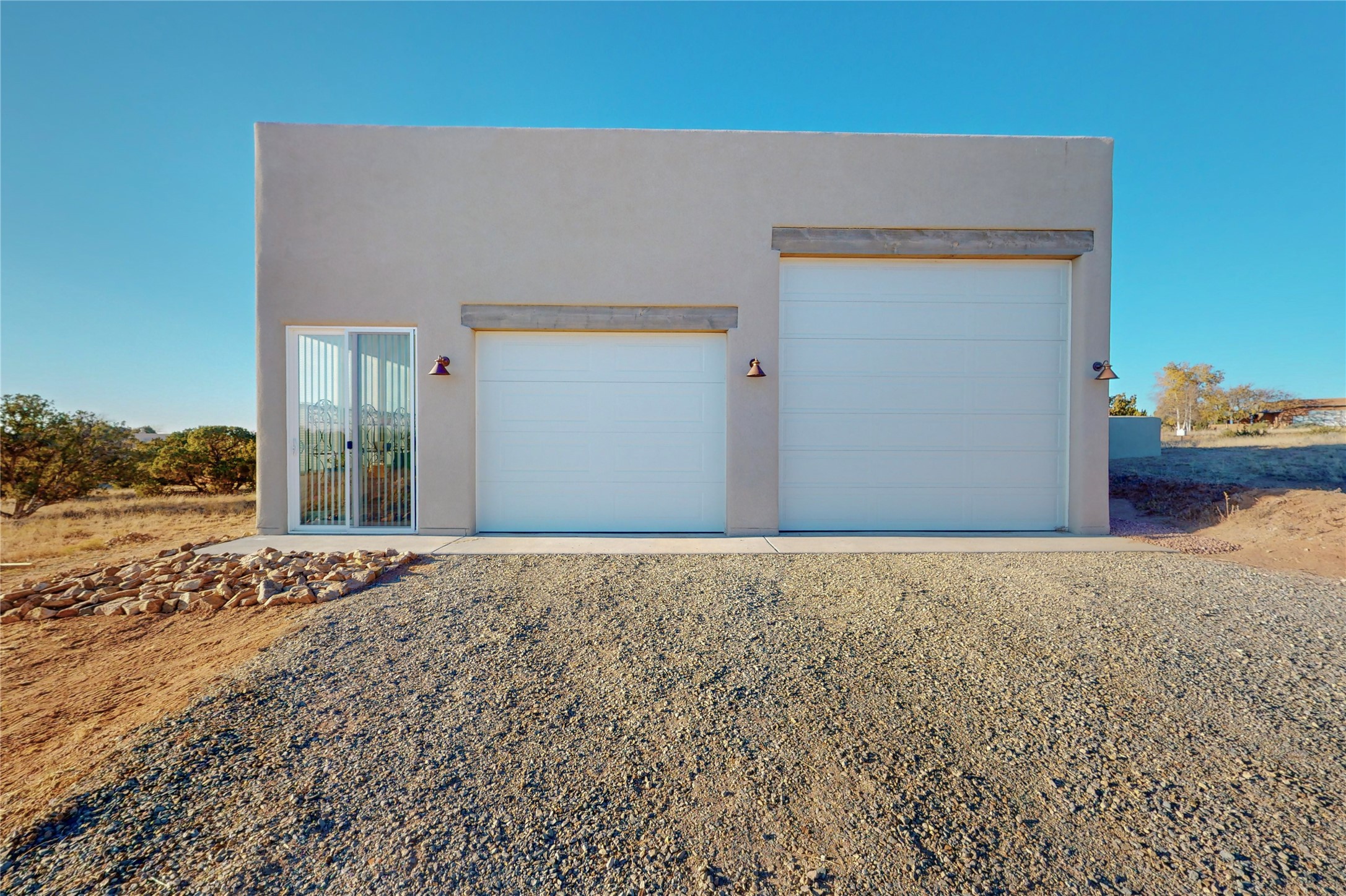 Sparkling bright "as new" 3 year old contemporary home on high corner view lot, a custom creation by Wild Sage Homes for the owners. With high ceilings and gleaming engineered wood floors throughout, this home is a perfect example of Pride of Ownership. An open plan, split bedroom design centered on a spacious great room this home was built for energy efficiency with a HERS rating of 70. Lovely long E-glass windows maximize the views and light, natural gas forced air provides efficient heating and cooling, high insulation factors make low utility bills year round. the attached finished 2 car garage includes a dedicated electrical for a freezer. An on demand gas hot water heater with a recirculating pump for instant hot water plus energy efficient upscale appliances. An 800 sqft heated RV garage with two bays and a workshop area plus a greenhouse creates space for all your hobbies and toys. This home accesses Eldorado amenities, local community activities, shopping and services plus only minutes into Santa Fe. A must see!