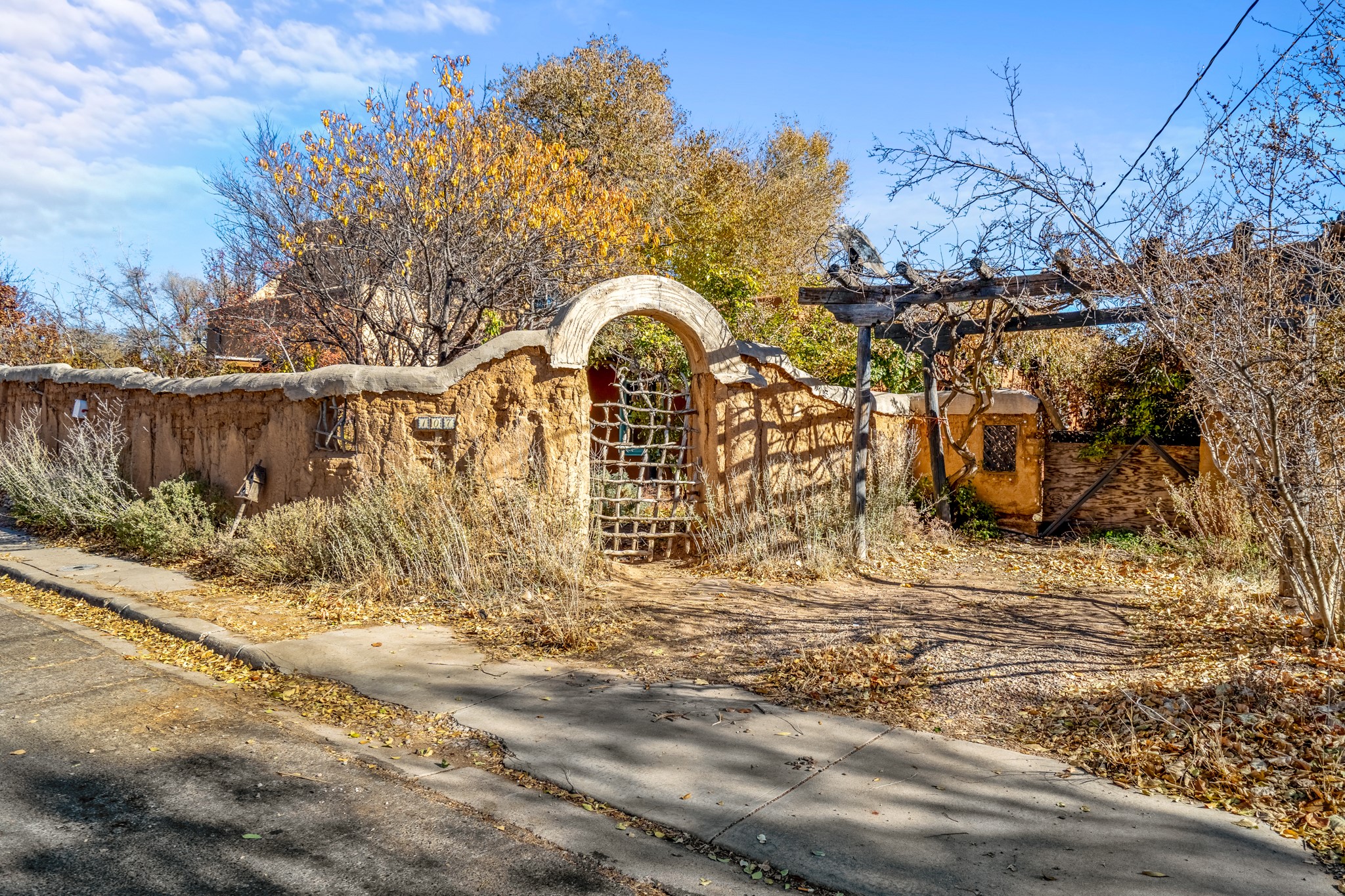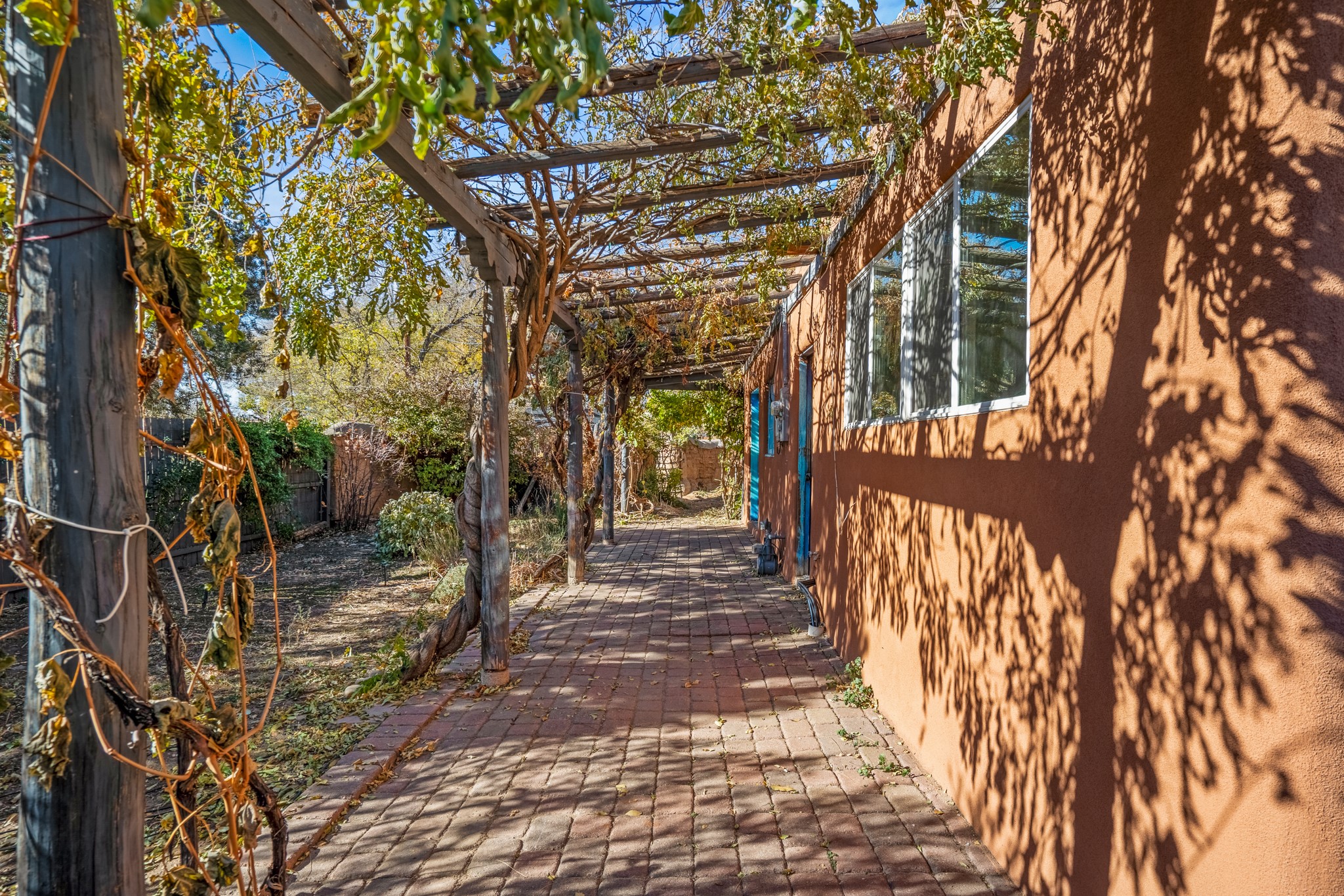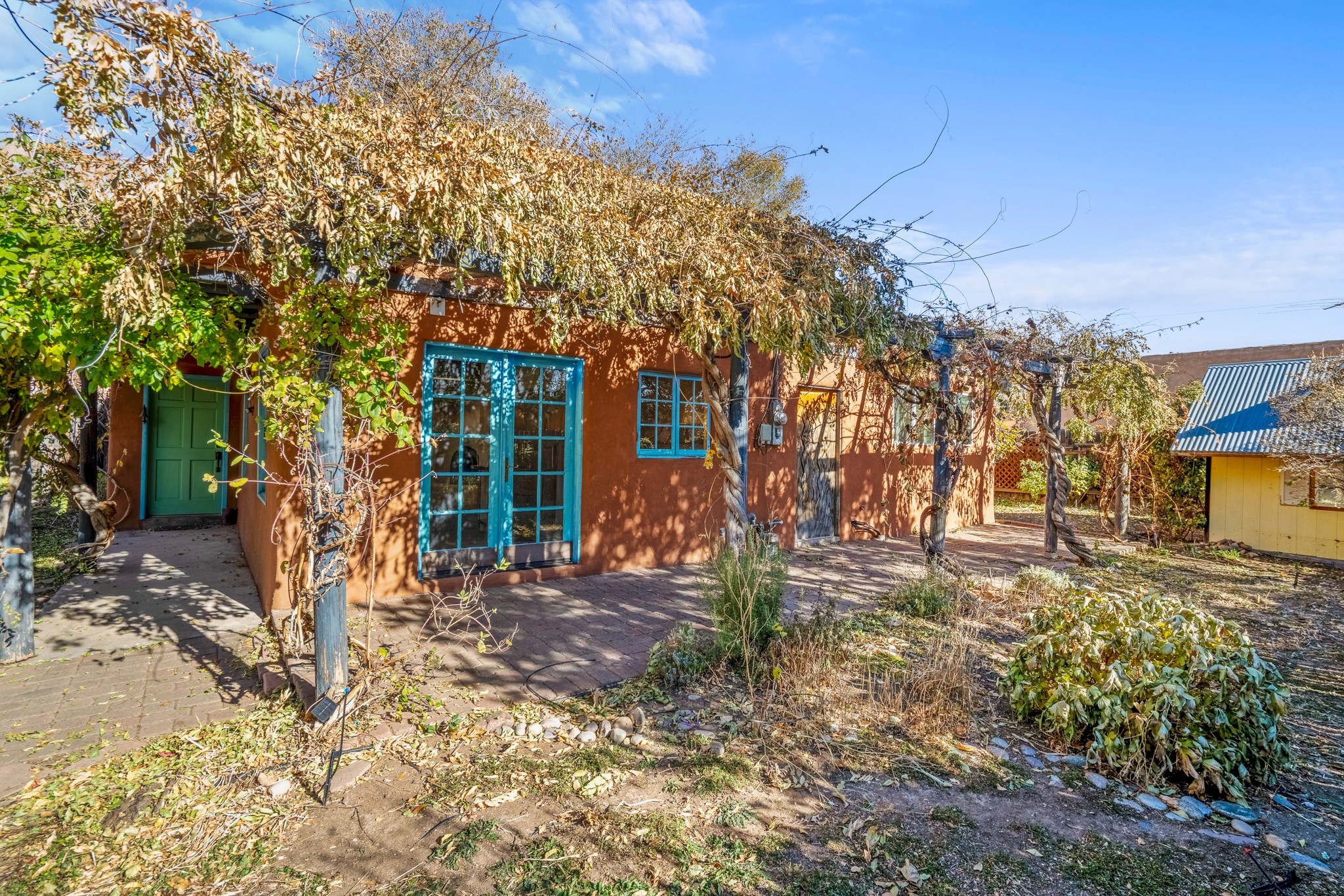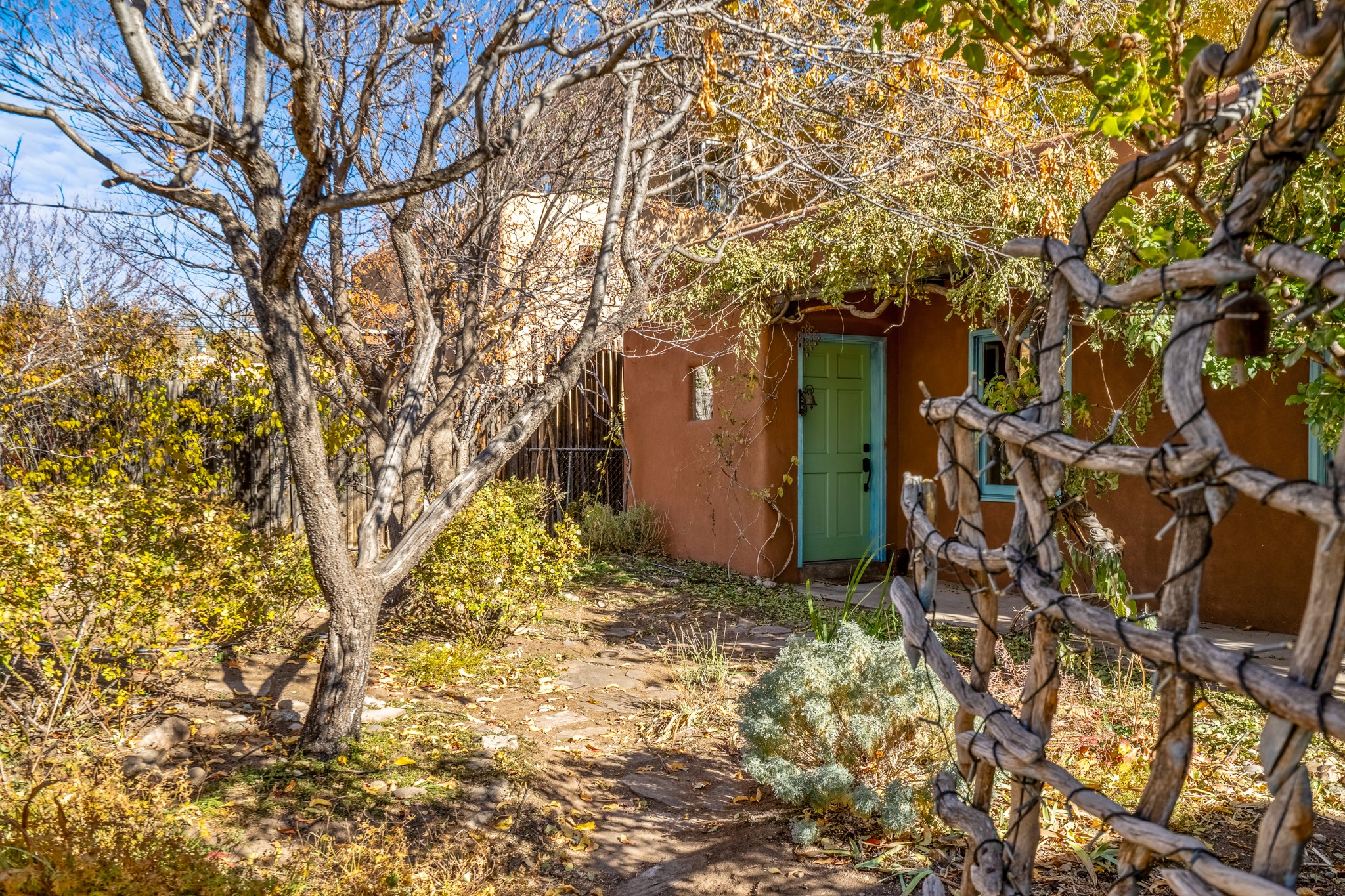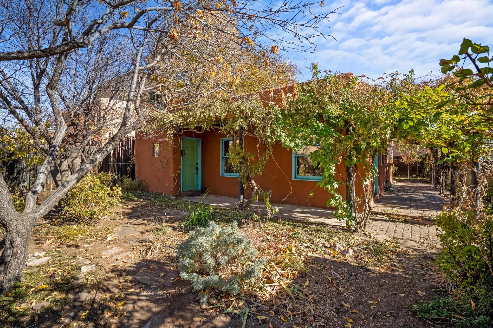Step through the gate of this magical garden and discover a whimsical and comfortable home just minutes from town. This 2 bedroom, 2 bathroom home offers a great layout... with a living, dining and kitchen open floor plan, a kiva fireplace, and two bedrooms, one with a mini-split and a remodeled ensuite bath. The kitchen showcases updated cabinets, countertops, and new appliances. A pergola covered with mature Wisteria wraps around the front and side of the home overlooking the beautiful gardens. The property has an enclosed front courtyard, a drip irrigation system a storage shed and a driveway with a designated parking spot. Conveniently located near the Santa Fe River walking trail, a grocery store and shopping. Schedule your showing to see this great investment property or primary residence.