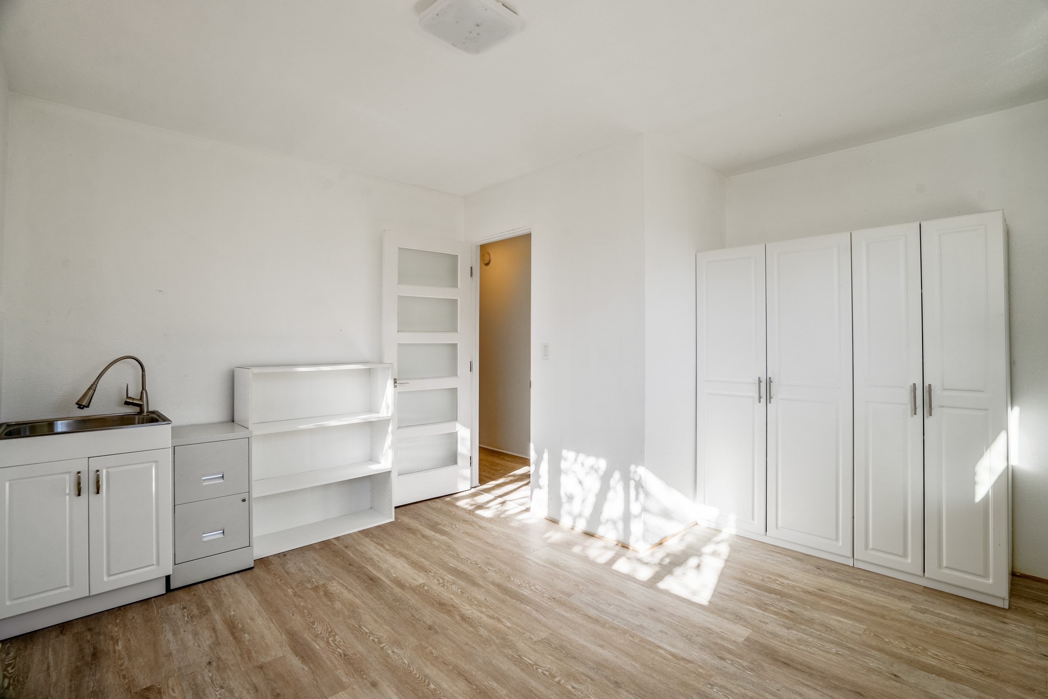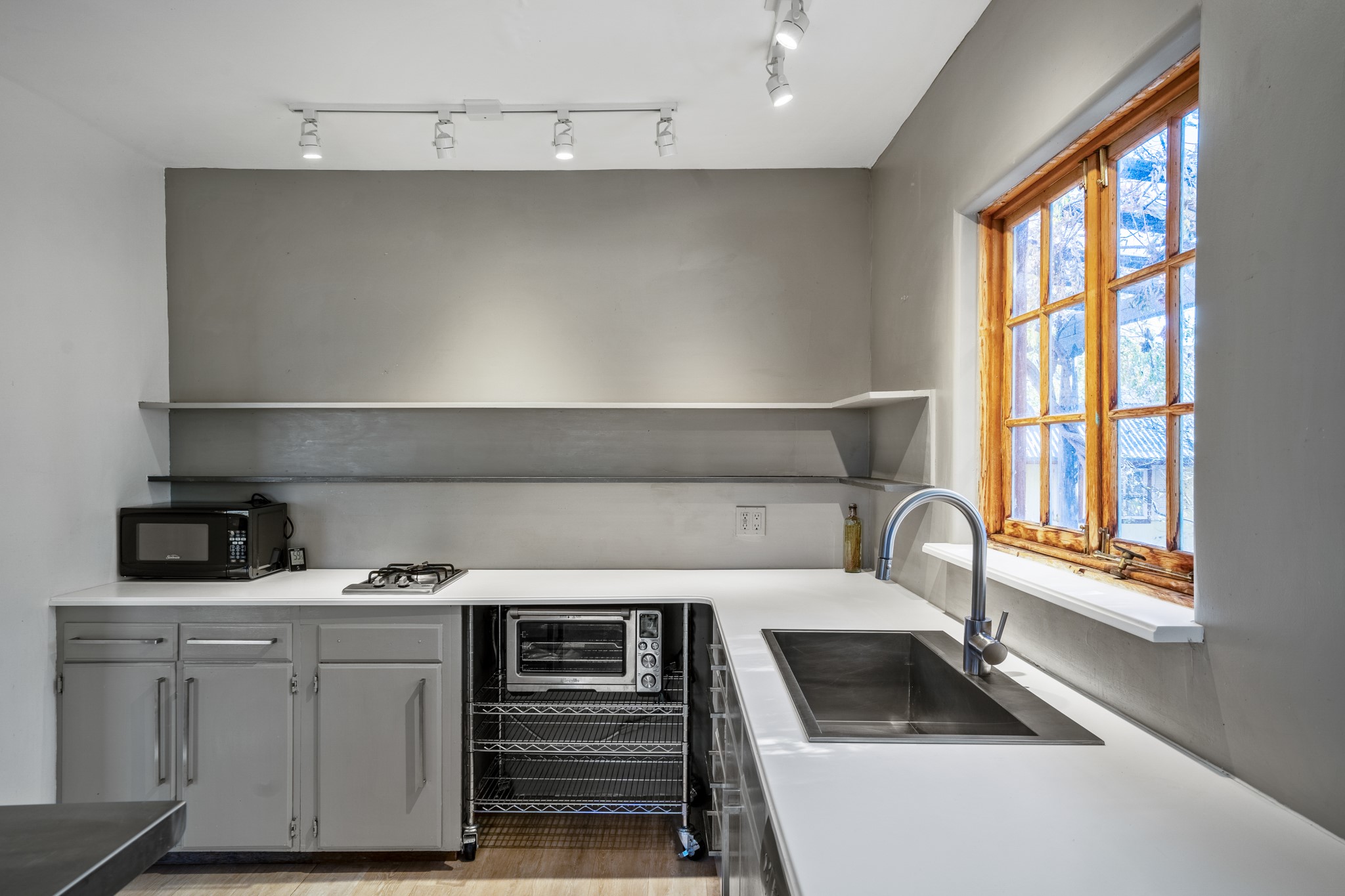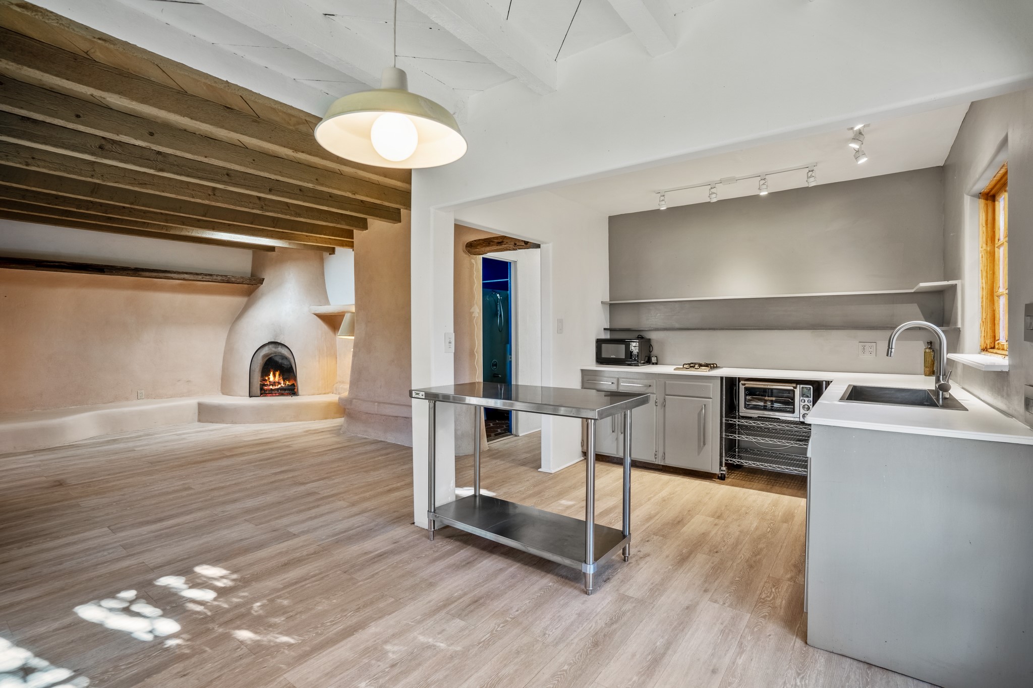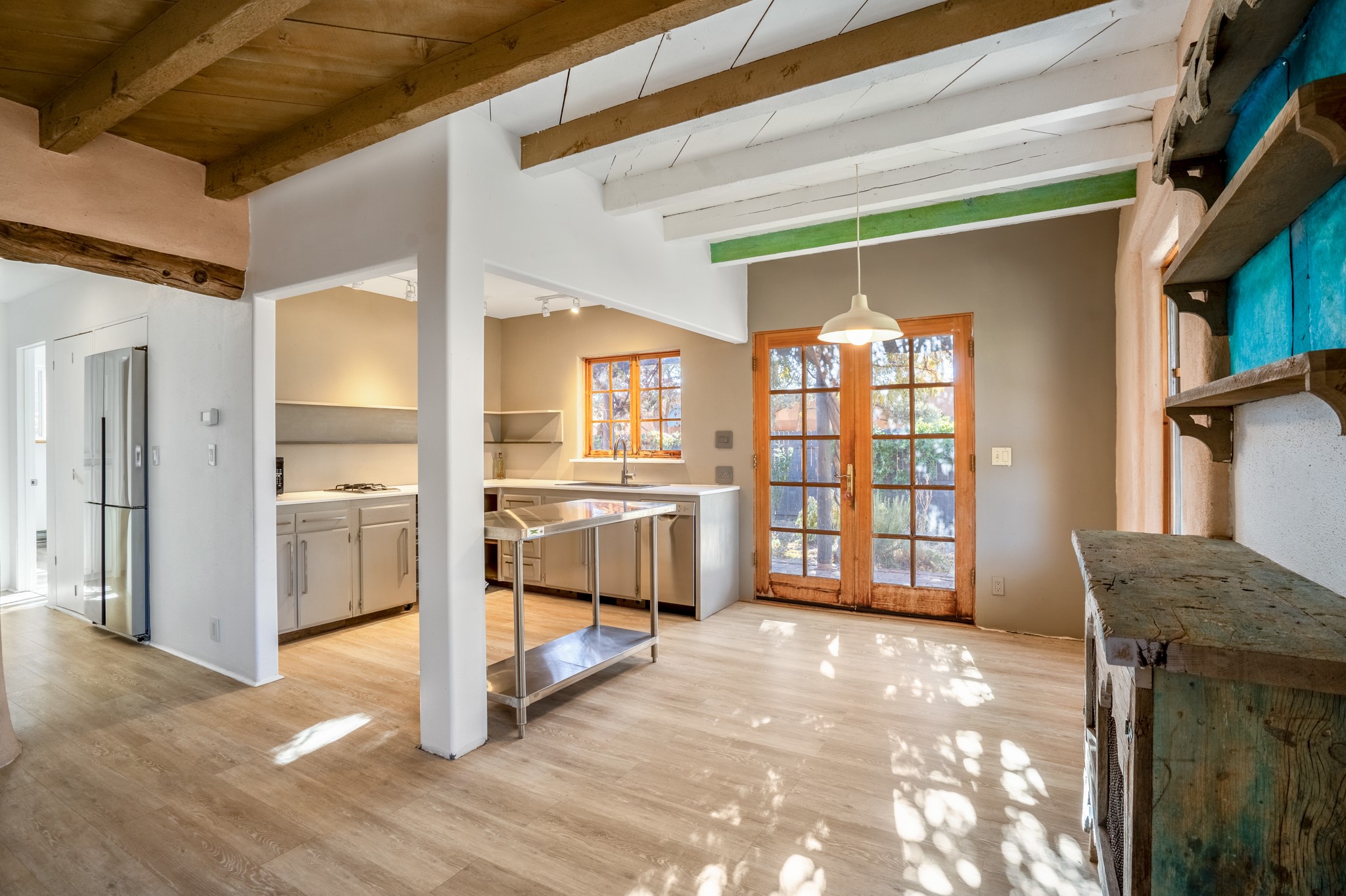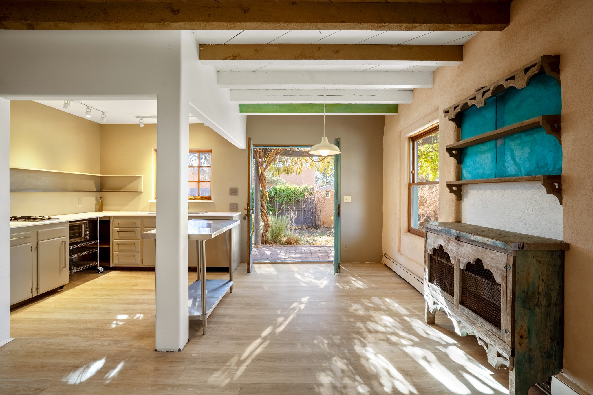Step through the gate of this magical garden and discover a whimsical and comfortable home just minutes from town. This 2 bedroom, 2 bathroom home offers a great layout... with a living, dining and kitchen open floor plan, a kiva fireplace, and two bedrooms, one with a mini-split and a remodeled ensuite bath. The kitchen showcases updated cabinets, countertops, and new appliances. A pergola covered with mature Wisteria wraps around the front and side of the home overlooking the beautiful gardens. The property has an enclosed front courtyard, a drip irrigation system a storage shed and a driveway with a designated parking spot. Conveniently located near the Santa Fe River walking trail, a grocery store and shopping. Schedule your showing to see this great investment property or primary residence.