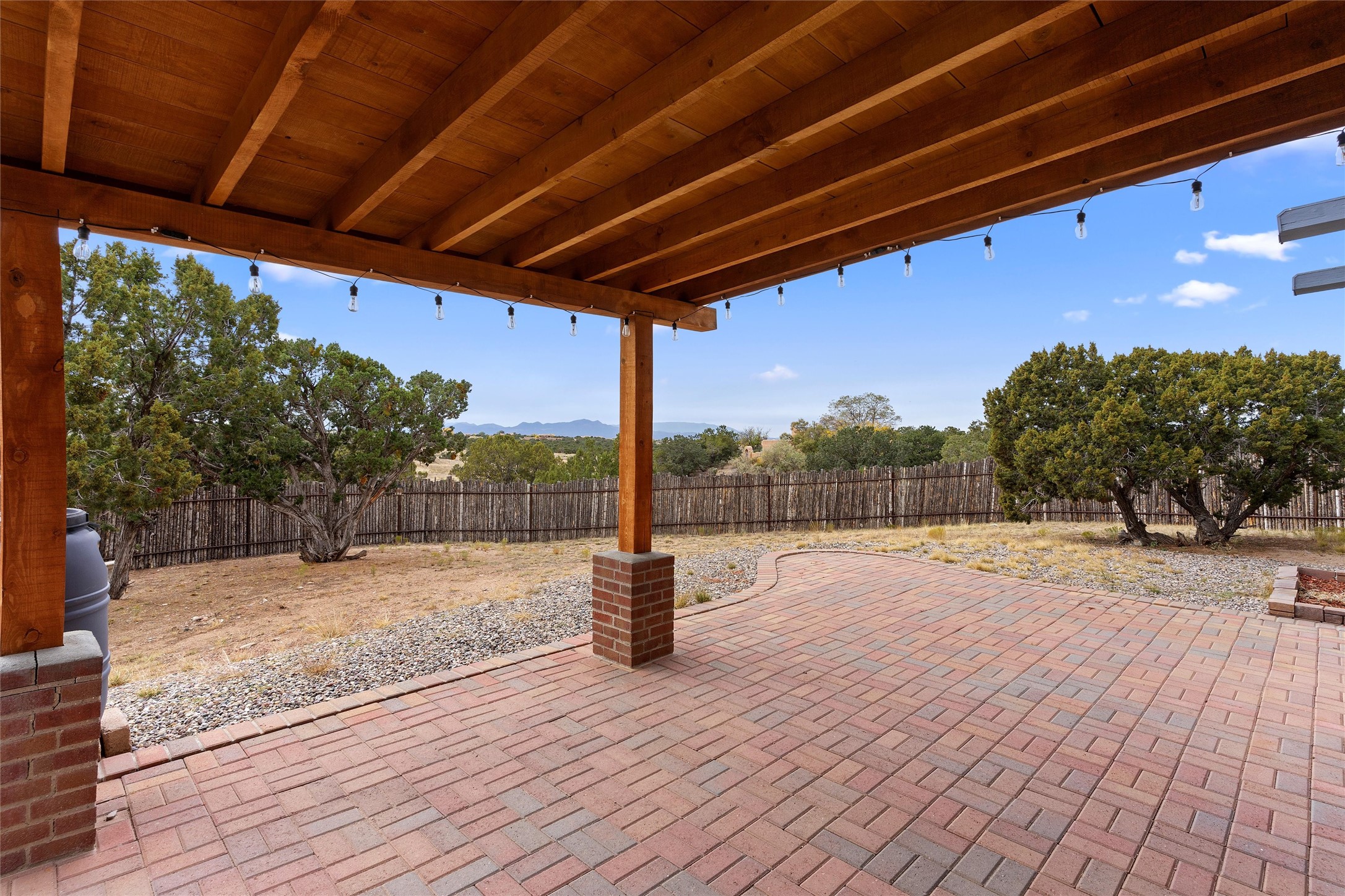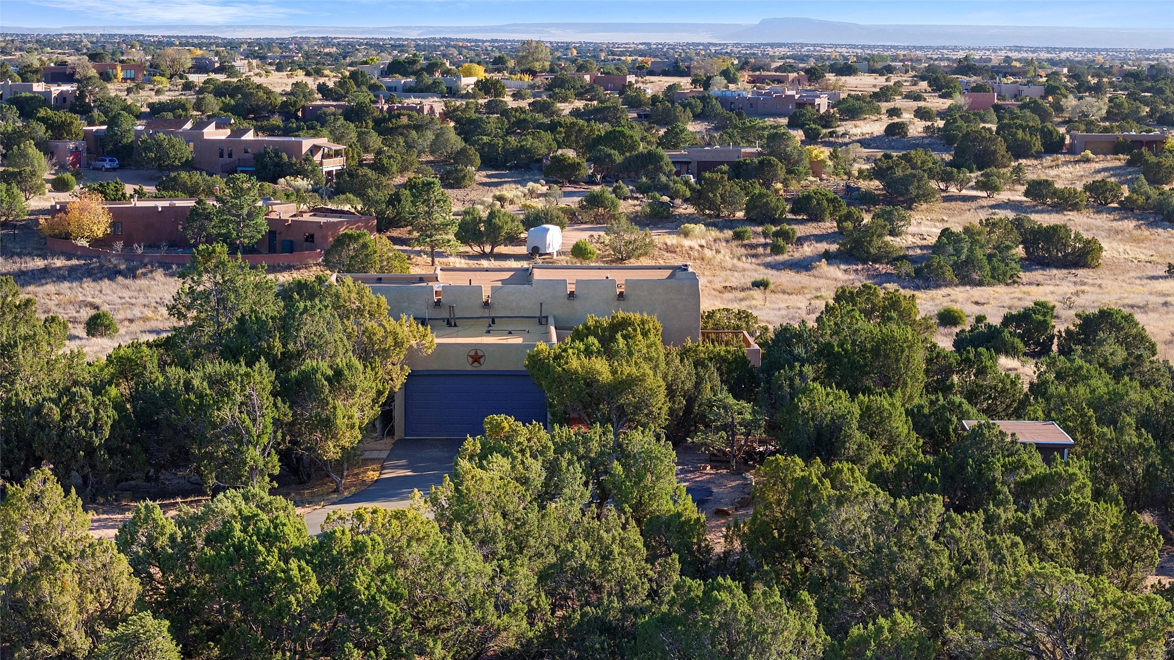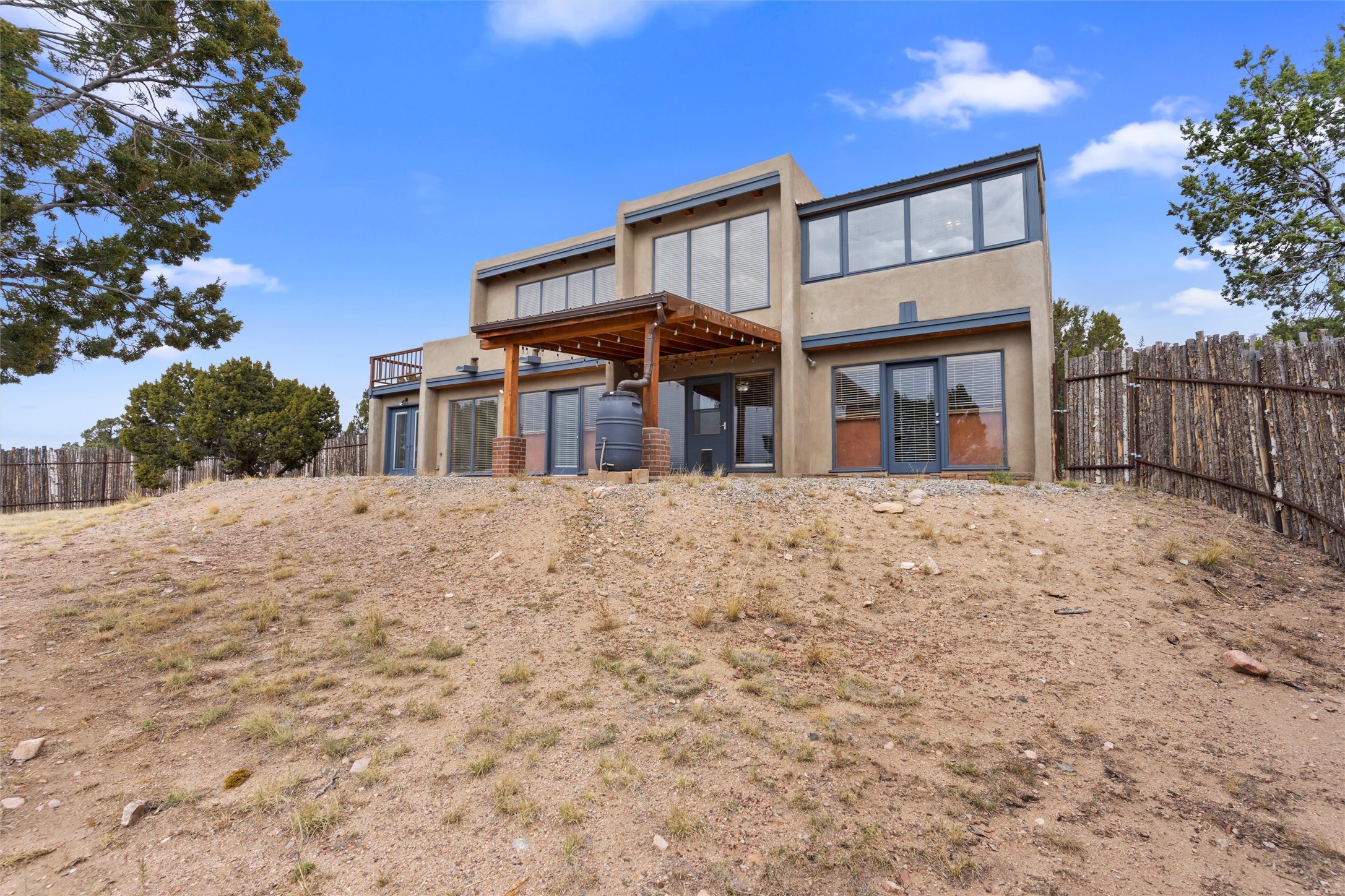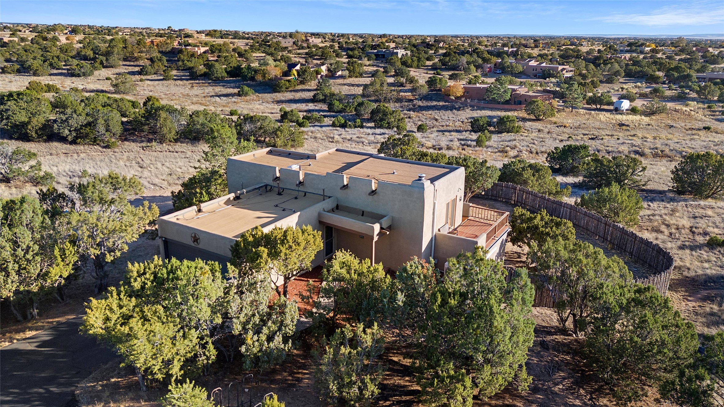 Nestled at 3 Manzano Ct, this secluded gem is a hidden paradise on a tranquil cul-de-sac, accessible via a long paved driveway. Boasting three bedrooms and 2 1/2 baths, this remarkable passive solar residence is awash with natural light, featuring a spacious open living area adorned with rustic wood ceilings and exposed beams, a separate dining enclave, and a versatile office/bonus room adjacent to the kitchen. The bedrooms are strategically situated on the lower level, each graciously offering outdoor access. Enjoy breathtaking vistas of the Jemez and Ortiz mountains from the expansive outdoor deck. Embracing a generous 2.24-acre lot, the backyard is a sanctuary with a new portal, patio, and charming latilla fencing. Beyond your doorstep, adventure beckons with immediate access to hiking trails and the Rail Trail, while all the conveniences of Eldorado, including the Eldorado Community School, are just a stone's throw away. . Come and experience this unique haven for yourself!