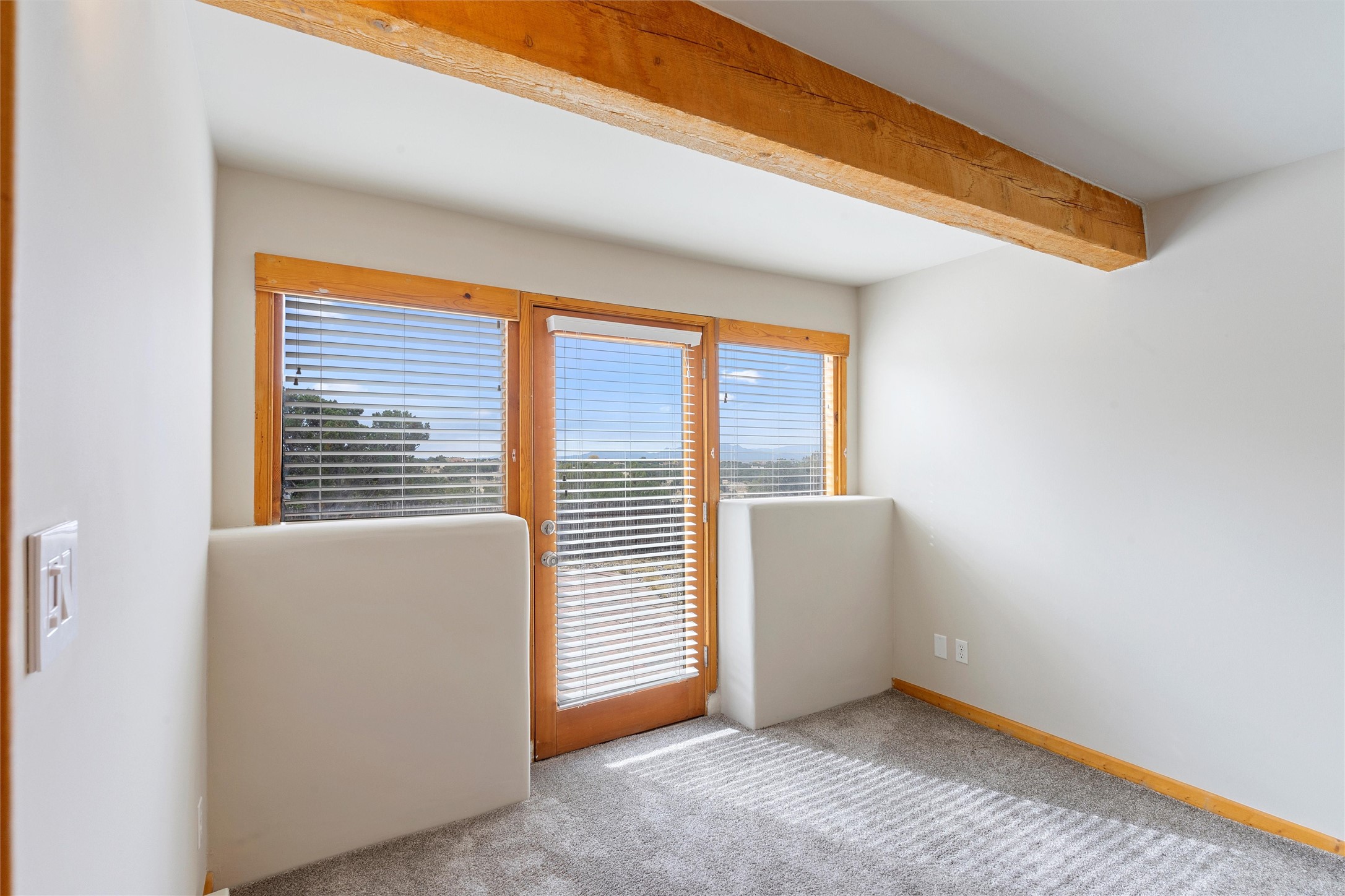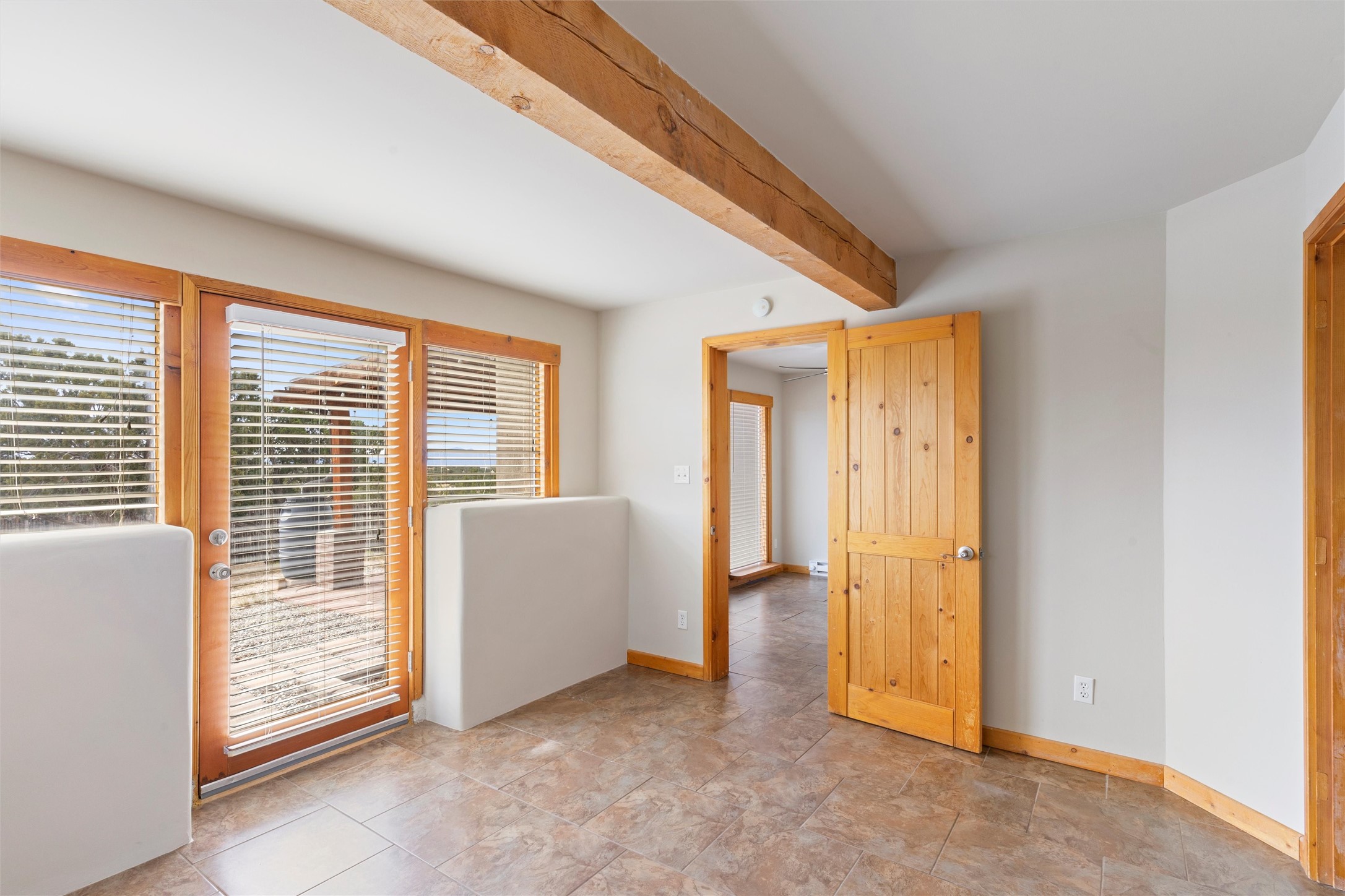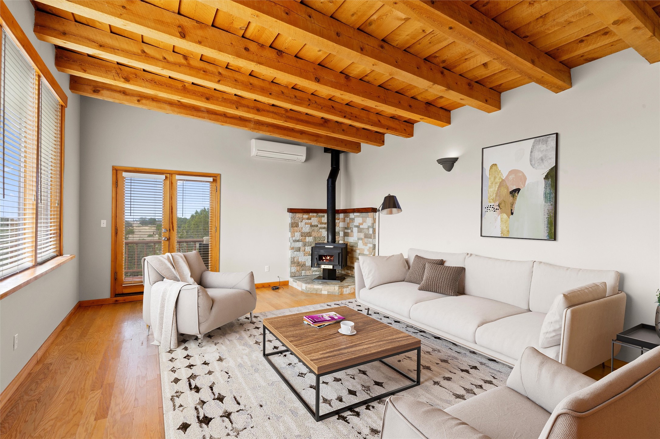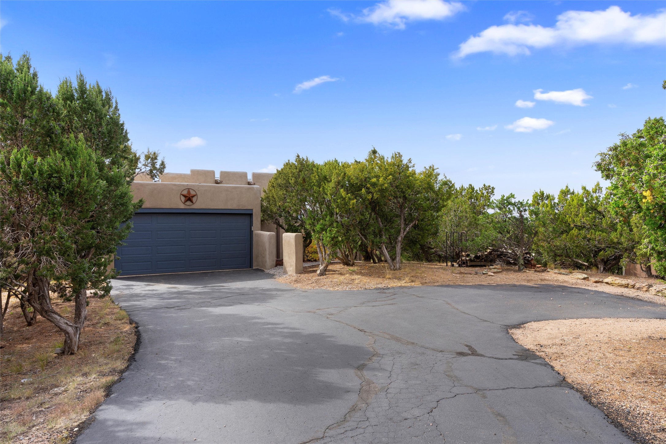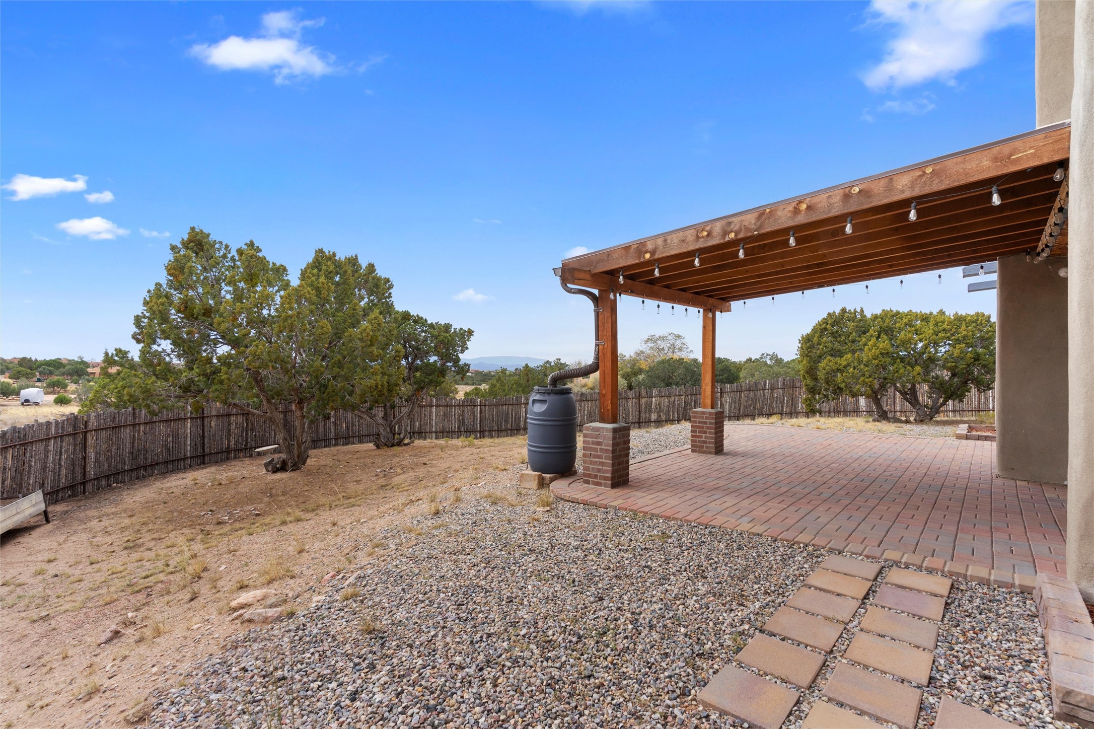 Nestled at 3 Manzano Ct, this secluded gem is a hidden paradise on a tranquil cul-de-sac, accessible via a long paved driveway. Boasting three bedrooms and 2 1/2 baths, this remarkable passive solar residence is awash with natural light, featuring a spacious open living area adorned with rustic wood ceilings and exposed beams, a separate dining enclave, and a versatile office/bonus room adjacent to the kitchen. The bedrooms are strategically situated on the lower level, each graciously offering outdoor access. Enjoy breathtaking vistas of the Jemez and Ortiz mountains from the expansive outdoor deck. Embracing a generous 2.24-acre lot, the backyard is a sanctuary with a new portal, patio, and charming latilla fencing. Beyond your doorstep, adventure beckons with immediate access to hiking trails and the Rail Trail, while all the conveniences of Eldorado, including the Eldorado Community School, are just a stone's throw away. . Come and experience this unique haven for yourself!
