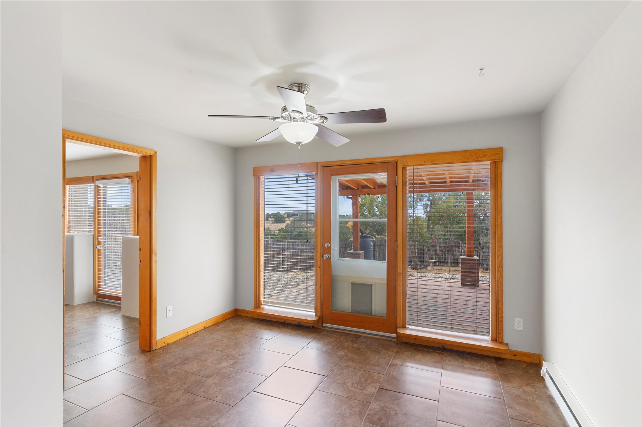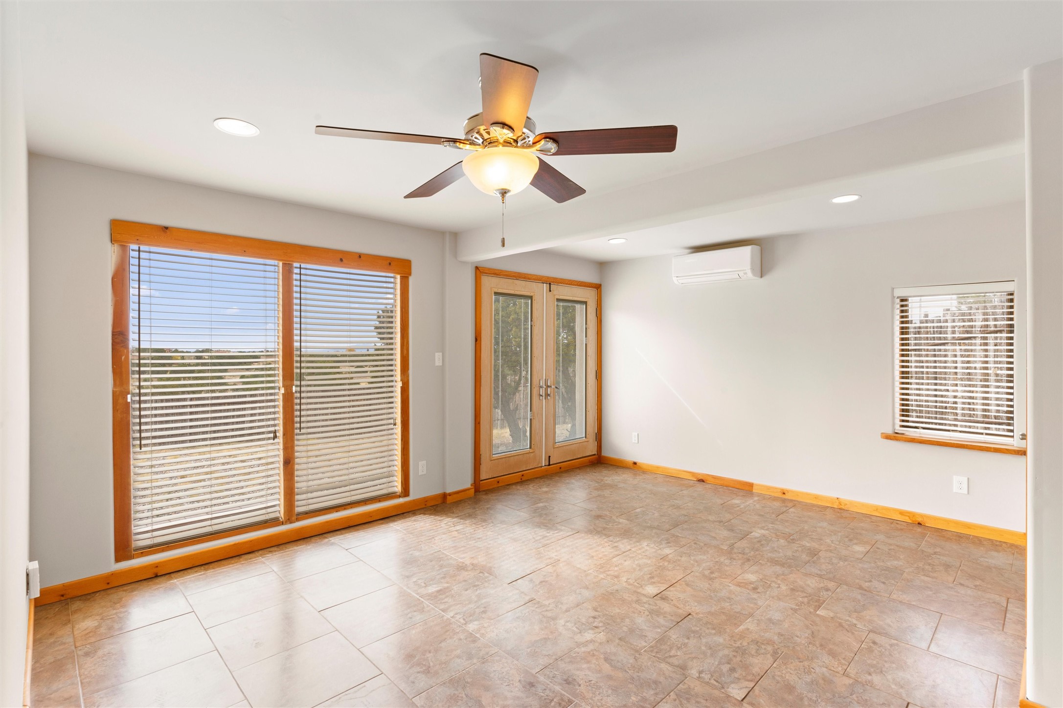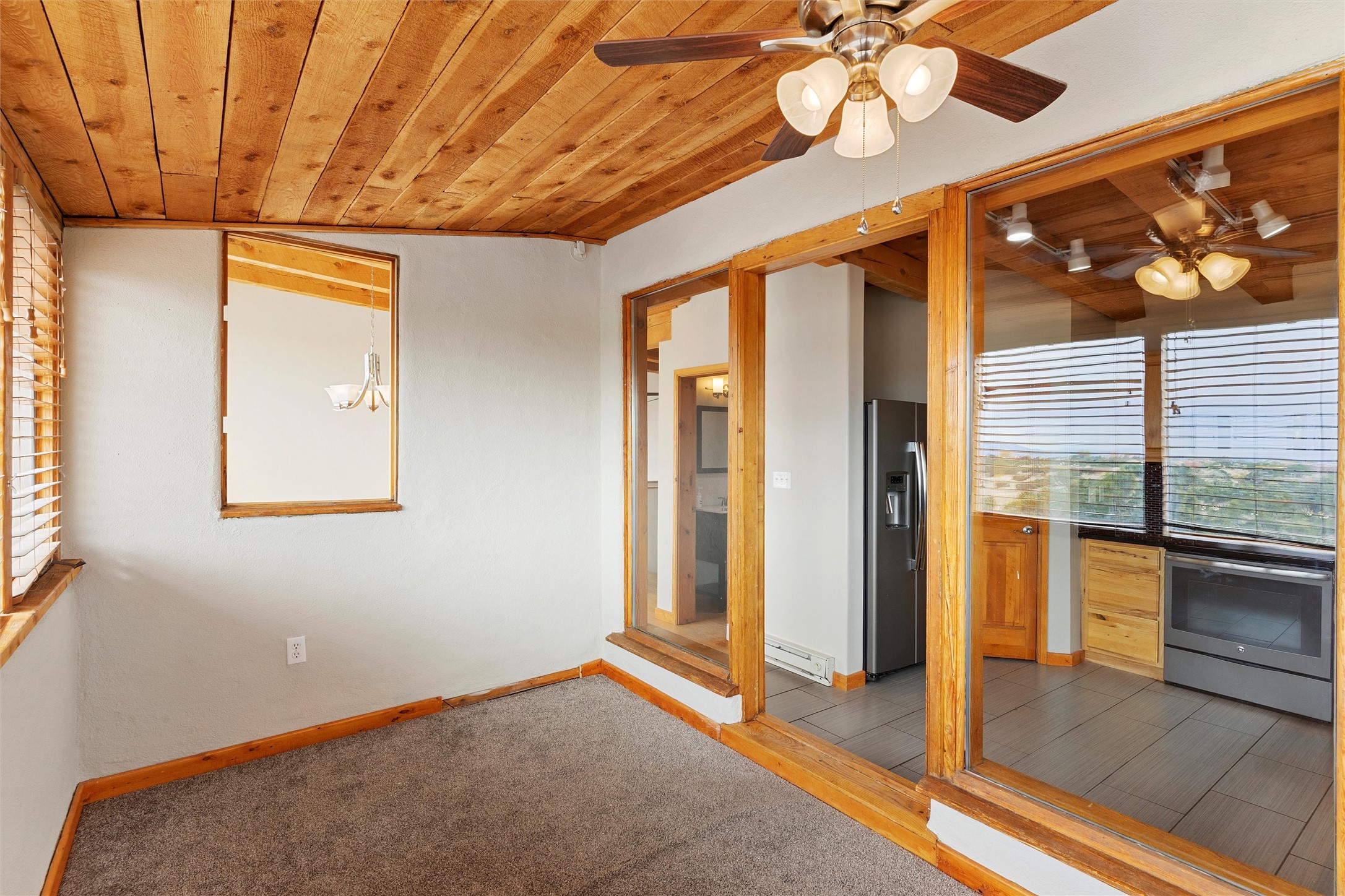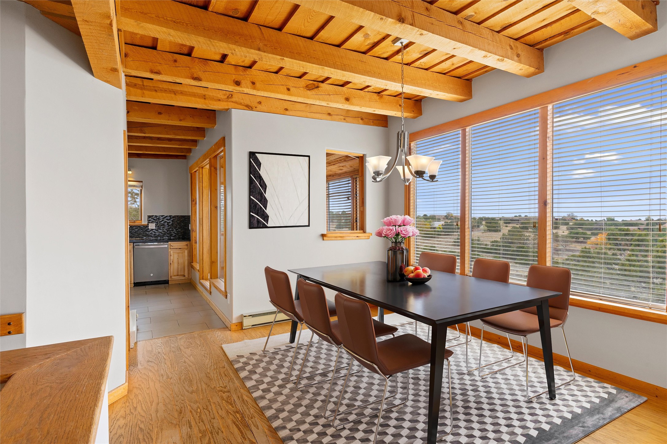 Nestled at 3 Manzano Ct, this secluded gem is a hidden paradise on a tranquil cul-de-sac, accessible via a long paved driveway. Boasting three bedrooms and 2 1/2 baths, this remarkable passive solar residence is awash with natural light, featuring a spacious open living area adorned with rustic wood ceilings and exposed beams, a separate dining enclave, and a versatile office/bonus room adjacent to the kitchen. The bedrooms are strategically situated on the lower level, each graciously offering outdoor access. Enjoy breathtaking vistas of the Jemez and Ortiz mountains from the expansive outdoor deck. Embracing a generous 2.24-acre lot, the backyard is a sanctuary with a new portal, patio, and charming latilla fencing. Beyond your doorstep, adventure beckons with immediate access to hiking trails and the Rail Trail, while all the conveniences of Eldorado, including the Eldorado Community School, are just a stone's throw away. . Come and experience this unique haven for yourself!