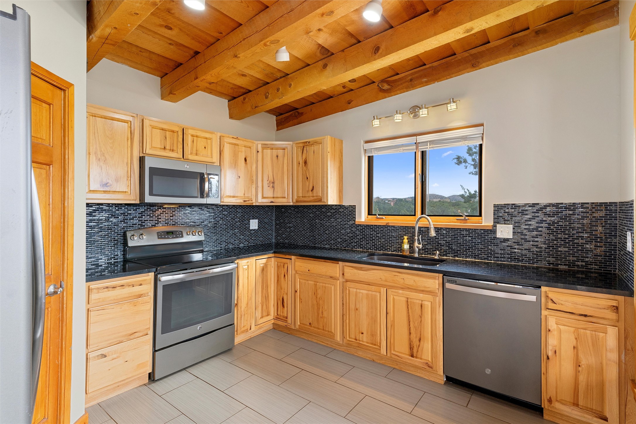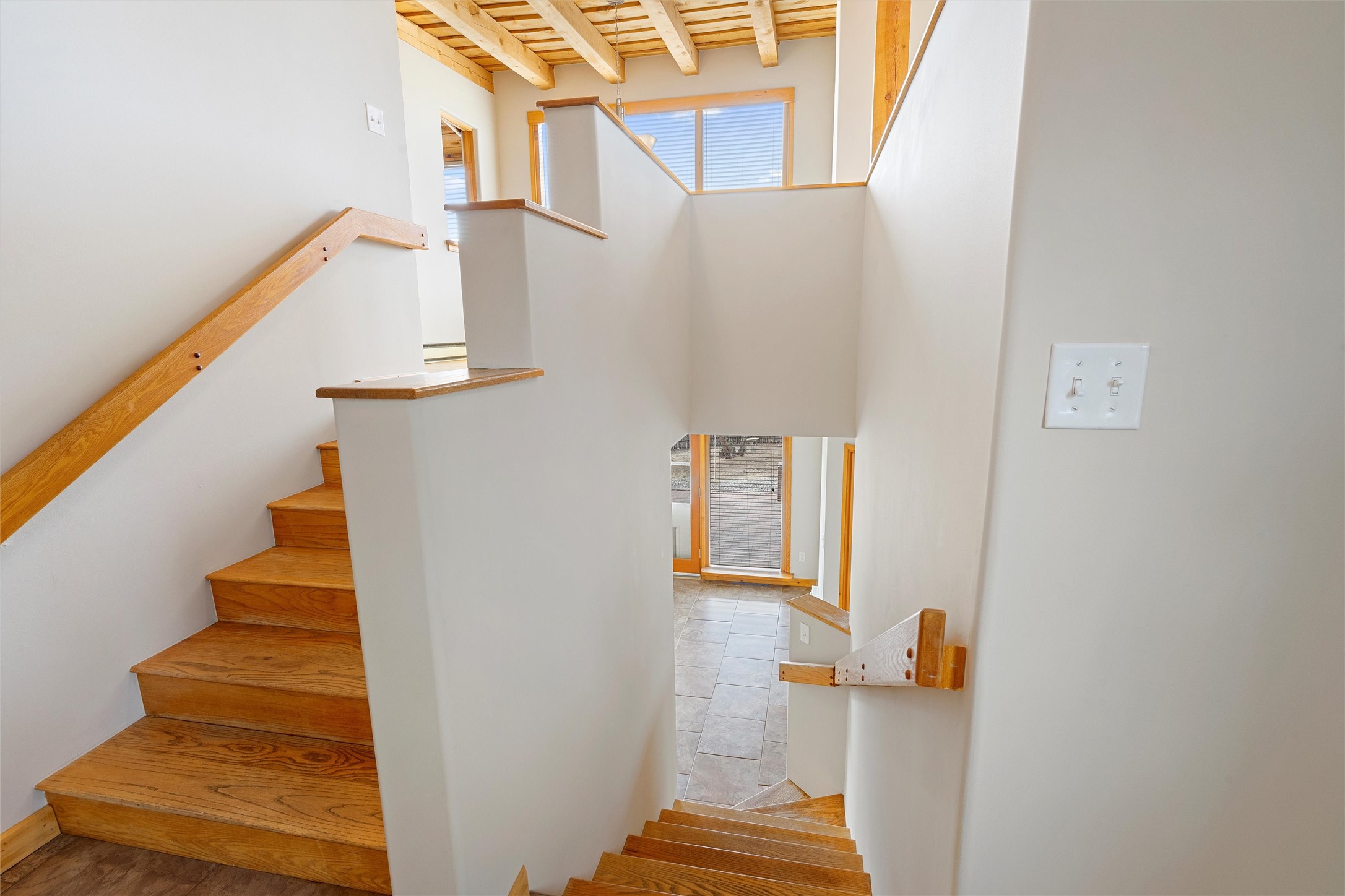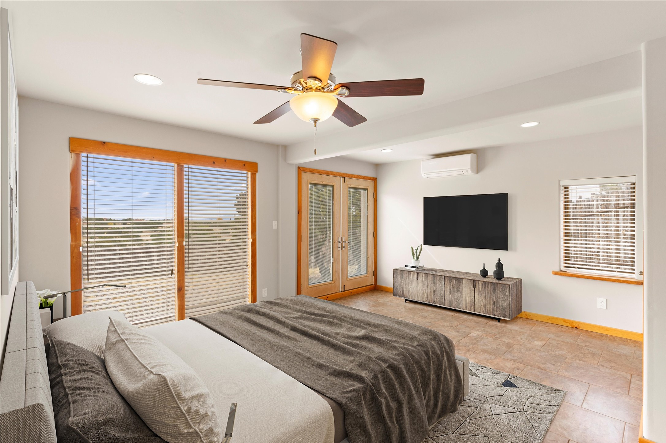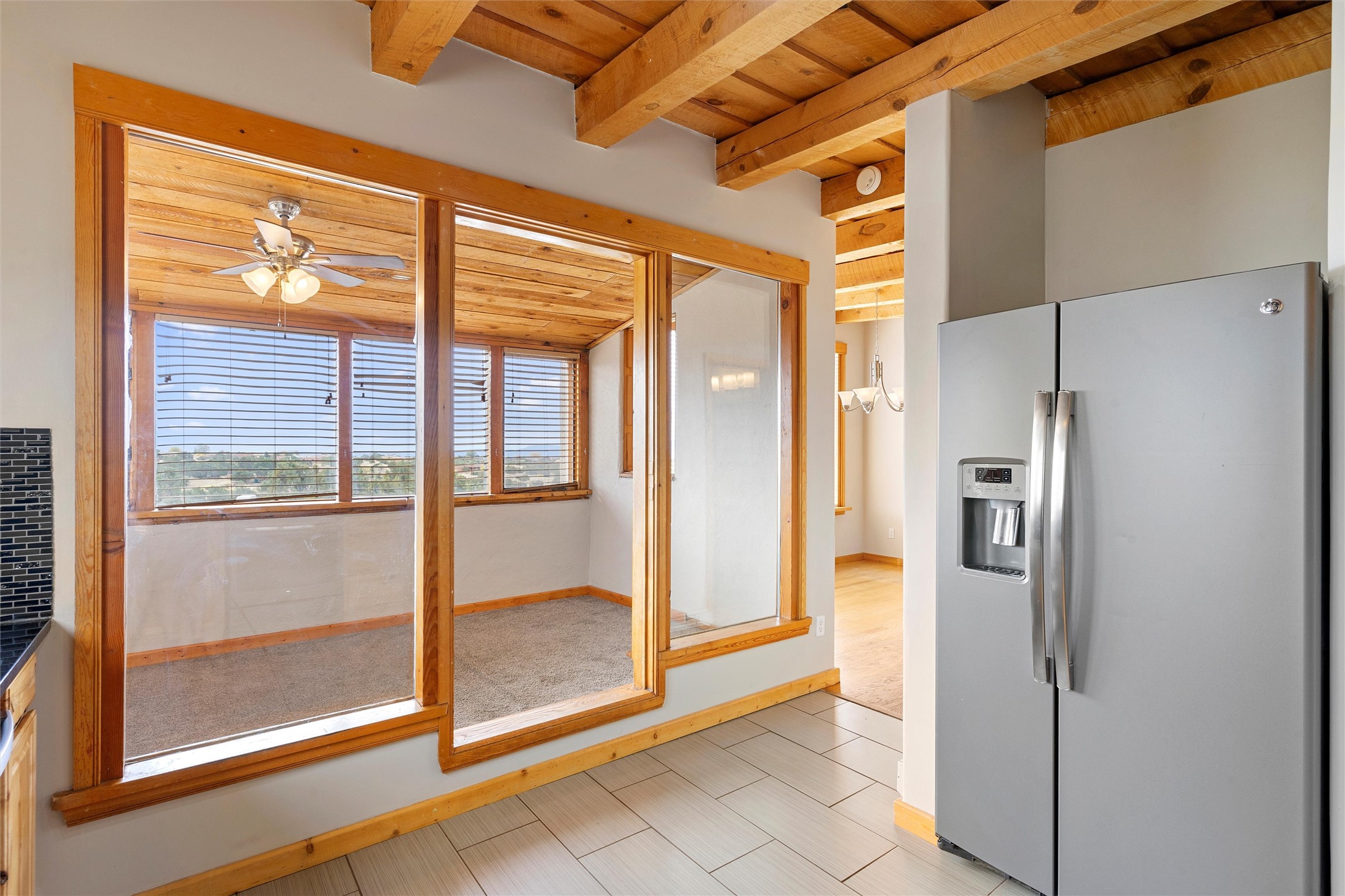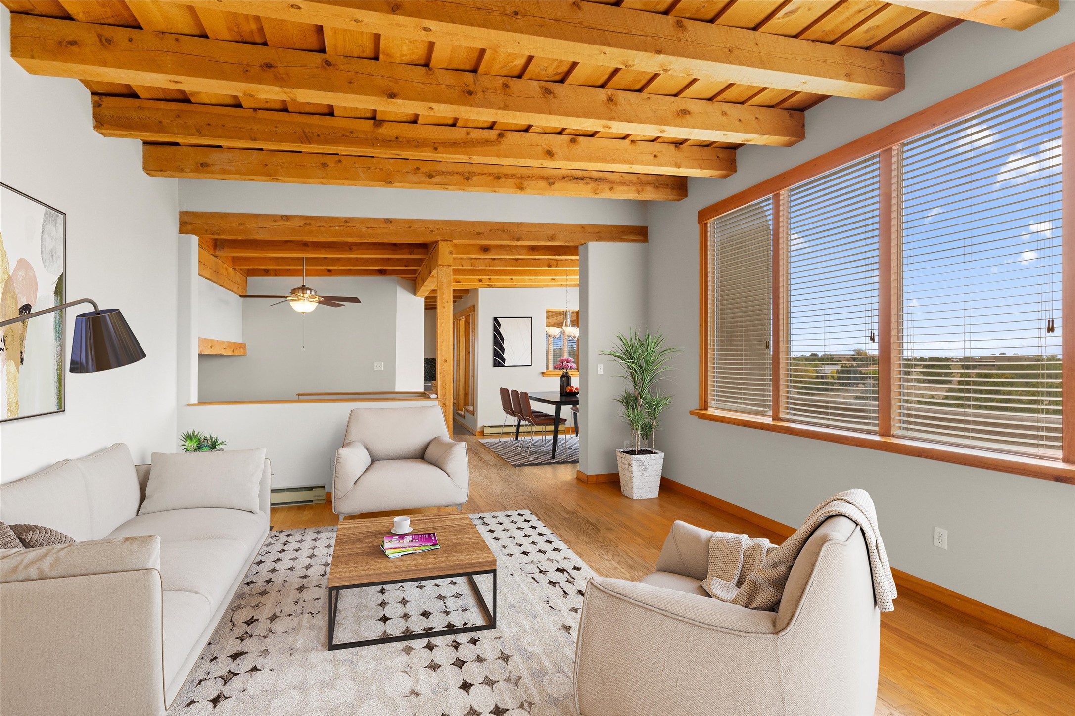 Nestled at 3 Manzano Ct, this secluded gem is a hidden paradise on a tranquil cul-de-sac, accessible via a long paved driveway. Boasting three bedrooms and 2 1/2 baths, this remarkable passive solar residence is awash with natural light, featuring a spacious open living area adorned with rustic wood ceilings and exposed beams, a separate dining enclave, and a versatile office/bonus room adjacent to the kitchen. The bedrooms are strategically situated on the lower level, each graciously offering outdoor access. Enjoy breathtaking vistas of the Jemez and Ortiz mountains from the expansive outdoor deck. Embracing a generous 2.24-acre lot, the backyard is a sanctuary with a new portal, patio, and charming latilla fencing. Beyond your doorstep, adventure beckons with immediate access to hiking trails and the Rail Trail, while all the conveniences of Eldorado, including the Eldorado Community School, are just a stone's throw away. . Come and experience this unique haven for yourself!