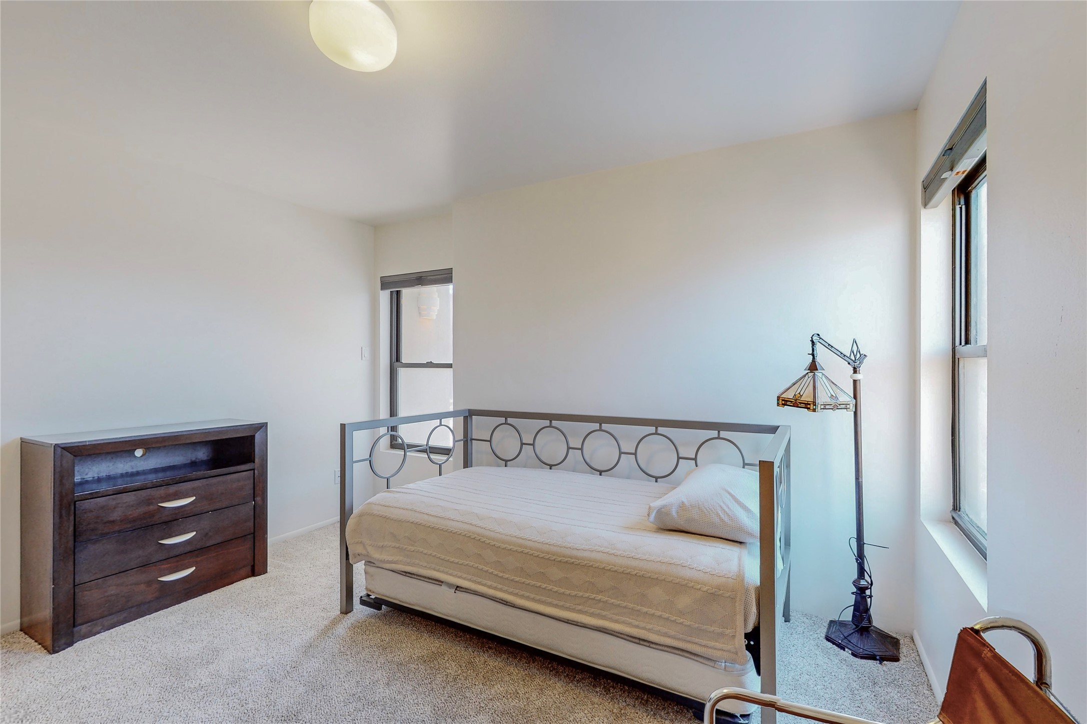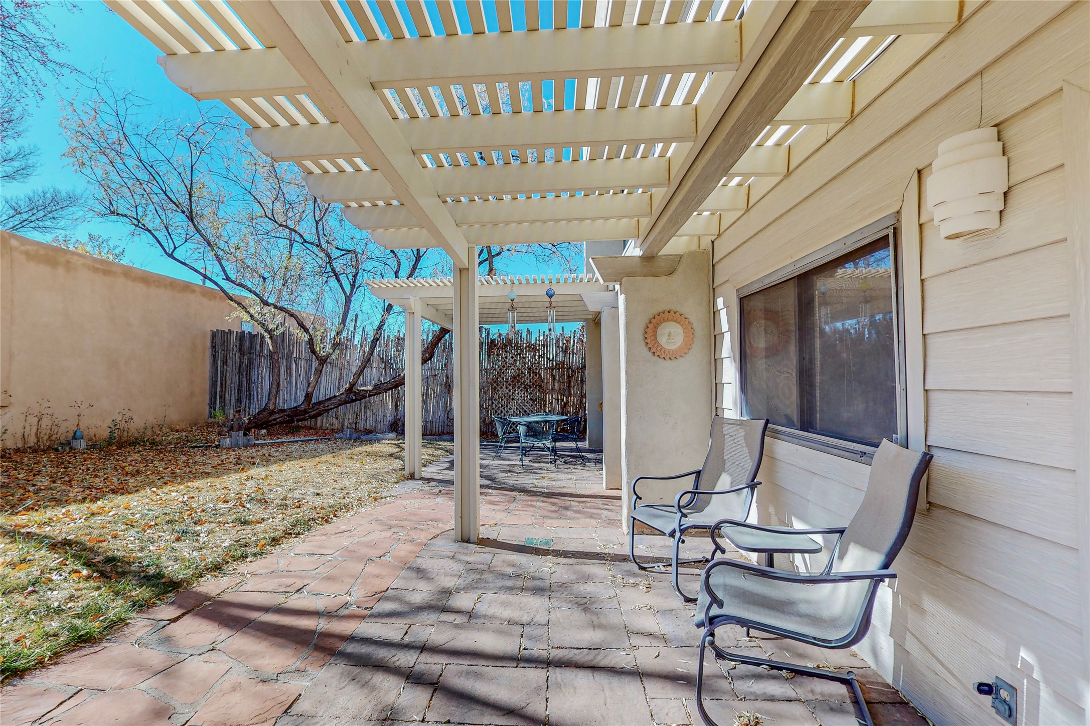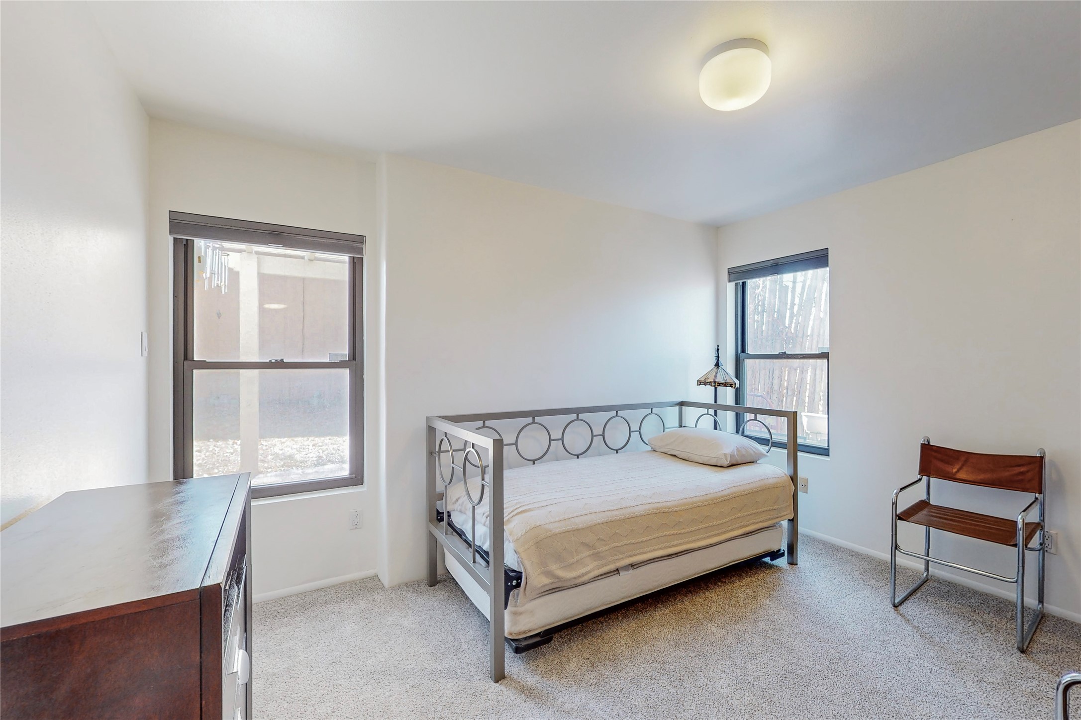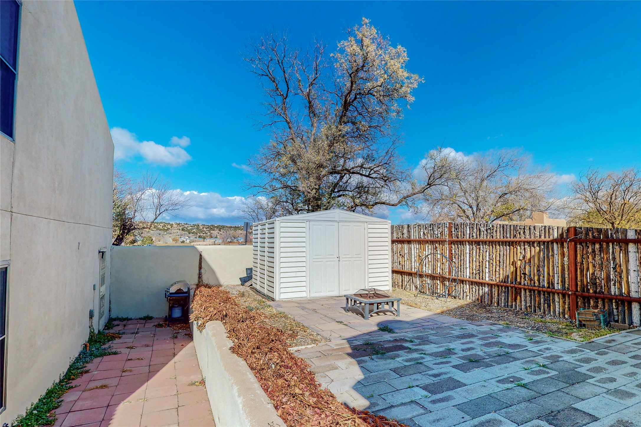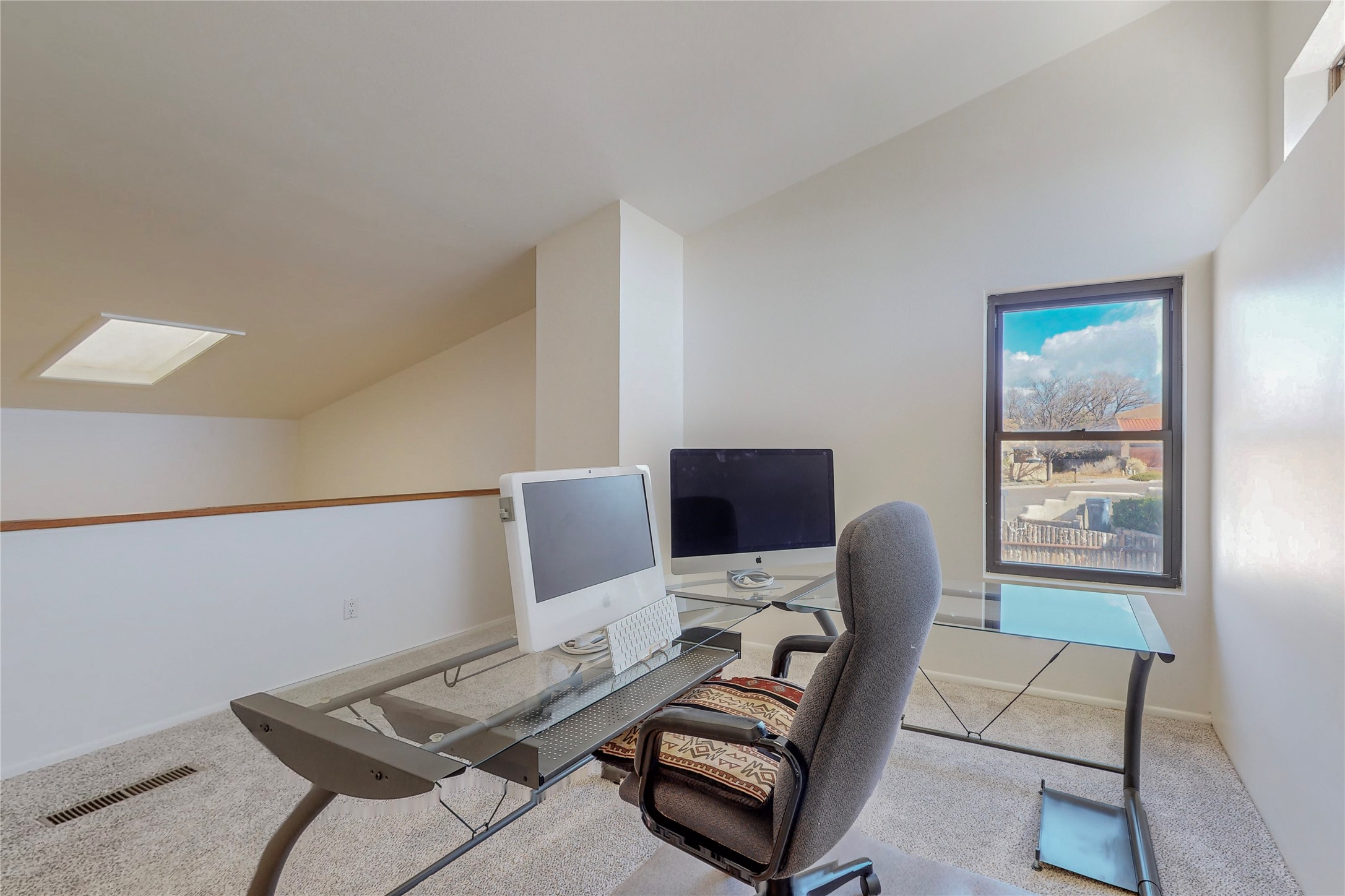 Located in Pueblo Alegre this one owner home is move in ready. It has been freshly painted and new carpet has been installed. There is one bedroom and bath on the lower level. The principal bedroom and bath is on the upper level next to a light filled loft that could be an office, den or even a nursery. There are large closets that provide ample storage. The wood burning kiva fireplace in the living room will bring warmth and comfort to cold winter nights. The private yard with mature trees and lawn is perfect for those summer gatherings. Last but not least, there is a CASITA!Think income producing, mother in law quarters, office, or man cave!! This delightful neighborhood with 2 private parks is across from Frenchy's Field and close to everything mid-town.