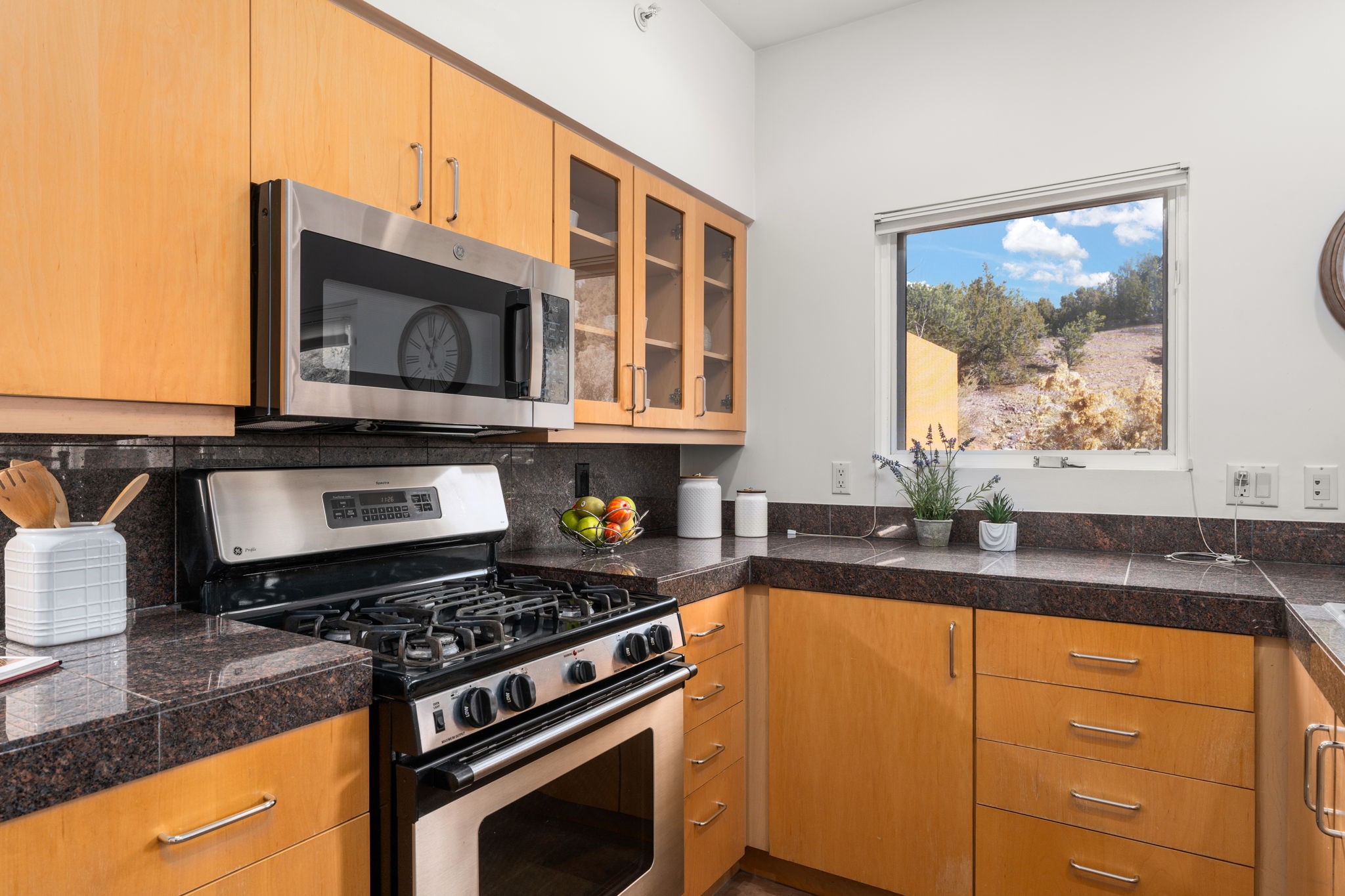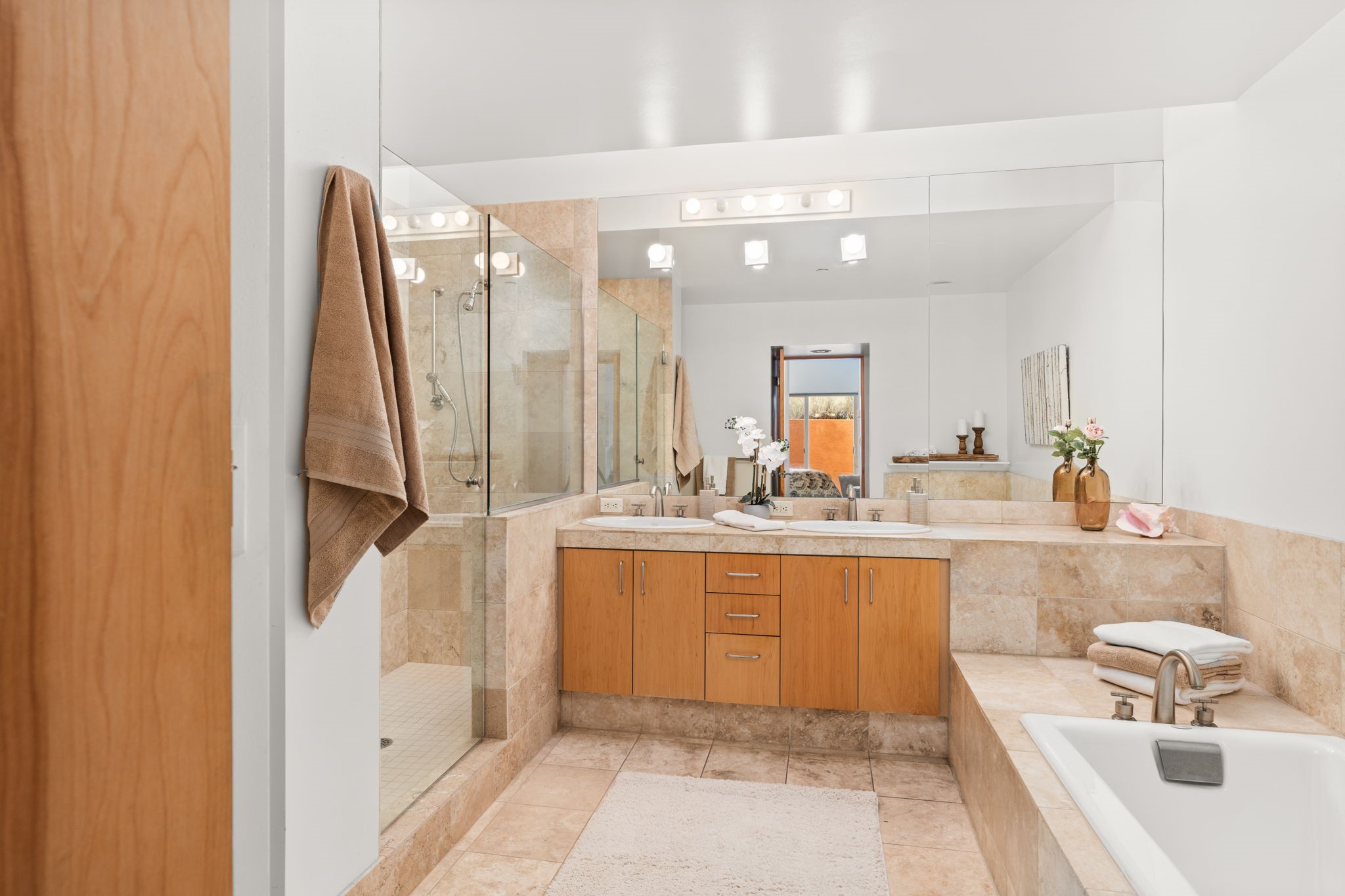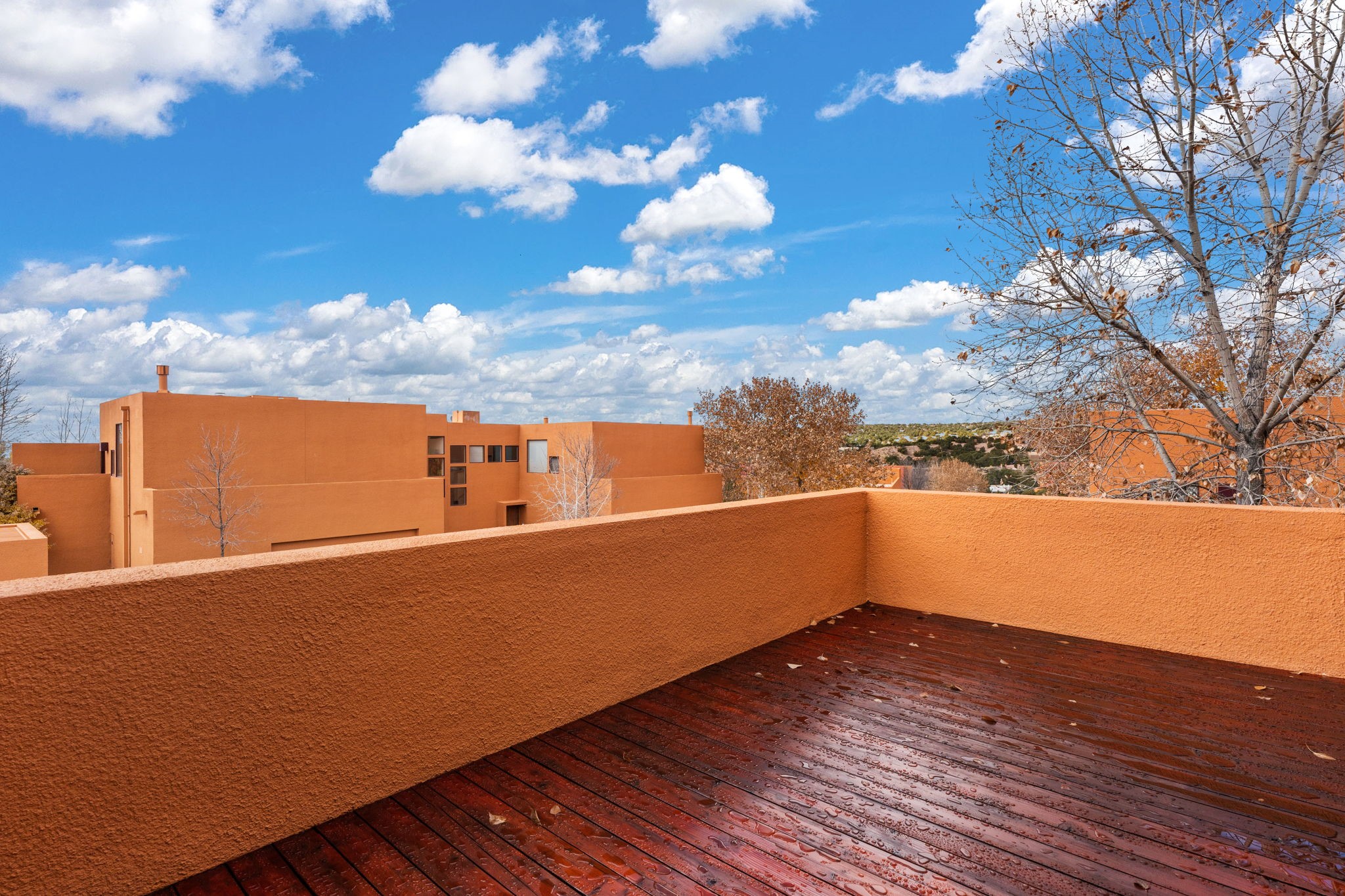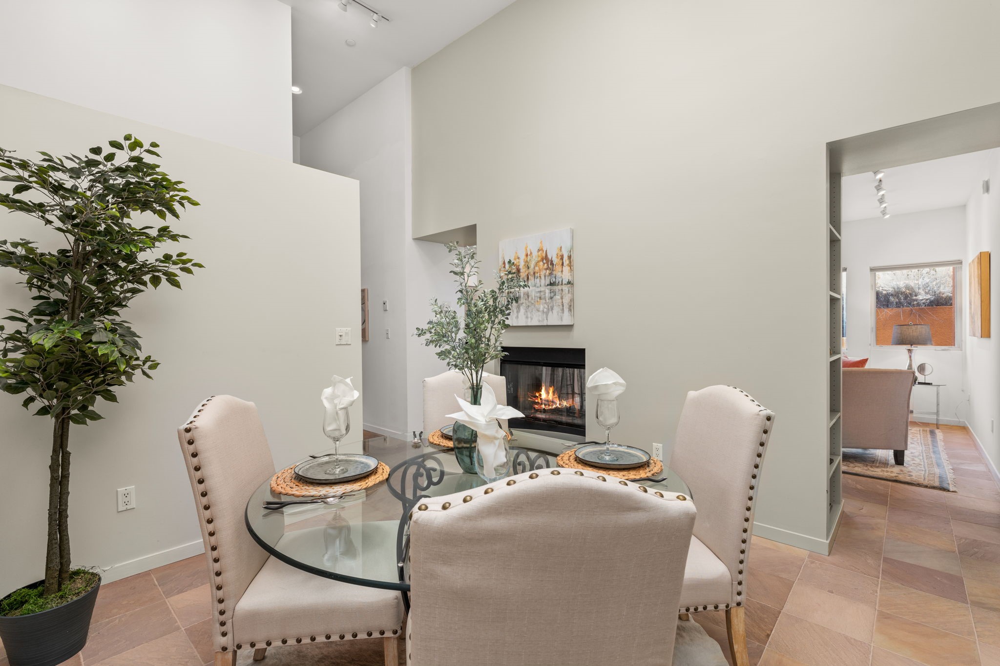 This 2 bedroom, 3 bath, impeccably maintained condo is located just a few short minutes north of downtown Santa Fe in the beautiful Zocalo community. Built on 46 acres of rolling hills offering sophisticated, contemporary design elements by world renowned architect Ricardo Legorreta. The highly desirable Canon floor plan allows complete separation and privacy, as well as ground level living with the primary ensuite bedroom, living room, dining room, kitchen and direct entry garage just up a few steps from the entrance foyer. A double-sided fireplace provides warmth and ambiance for the dramatic dining room featuring soaring ceilings and skylights, as well as the open concept living room, breakfast bar and kitchen. A lovely, fenced patio is accessed from the main living area, as well as from the main level, primary bedroom. Fabulous amenities and finishes are found throughout, such as travertine tile in the bathrooms, granite countertops, stainless steel appliances, sandstone floors, custom built entertainment center, radiant heat floors and refrigerated a/c. The upper-level primary suite has an alpine redwood deck to enjoy the beautiful, New Mexico sunsets! Sited on an elevated, private parcel adjoining open space, yet near the fabulous clubhouse, this condo is in one of the best locations in the community. Additional Zocalo amenities include two fitness centers, swimming pool, jacuzzi, spa, conference room, catering kitchen, large scenic patio and scenic walking trails. Whether you are looking for a peaceful retreat or a convenient spot for commuting, this condo has it all!