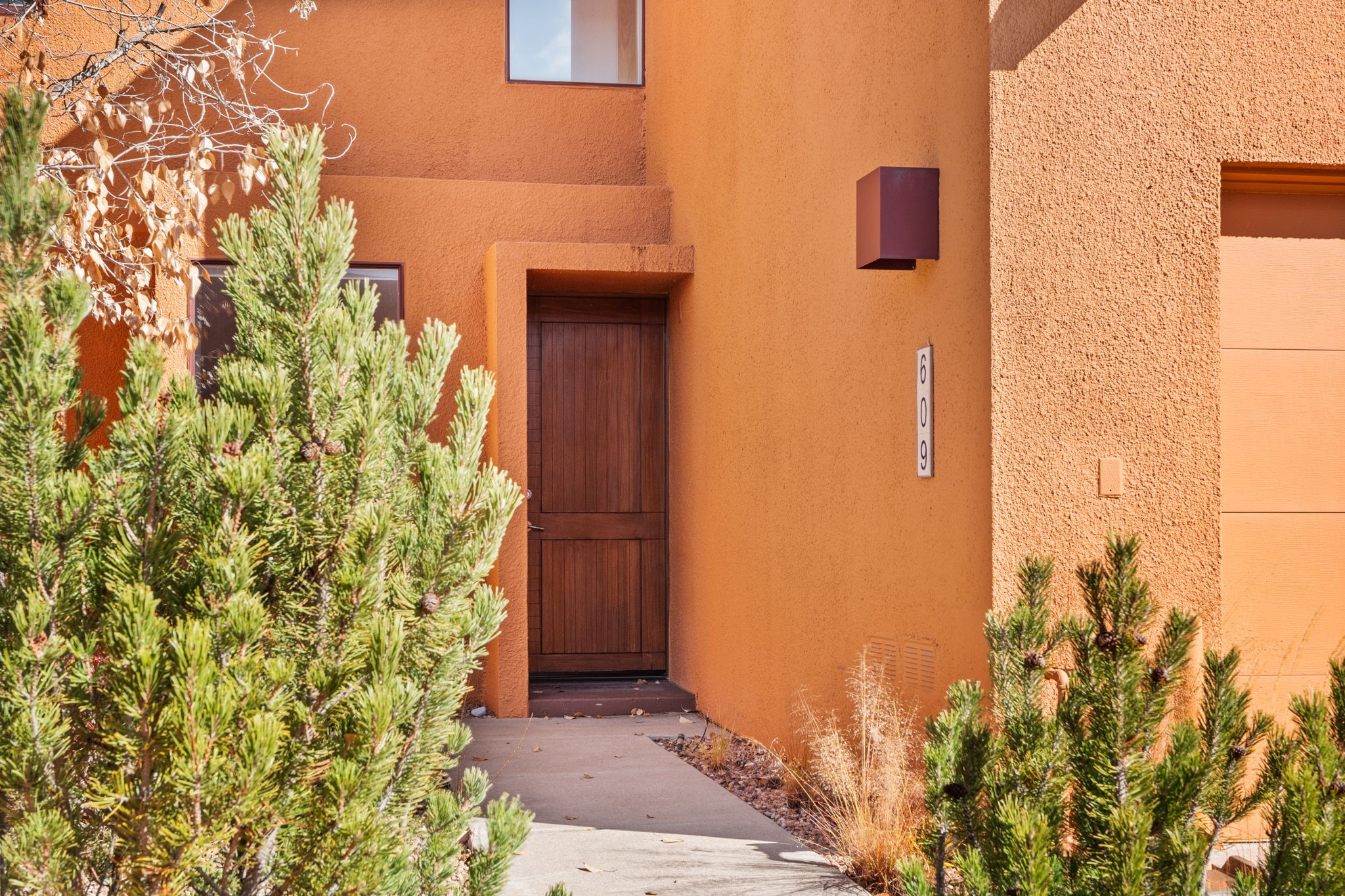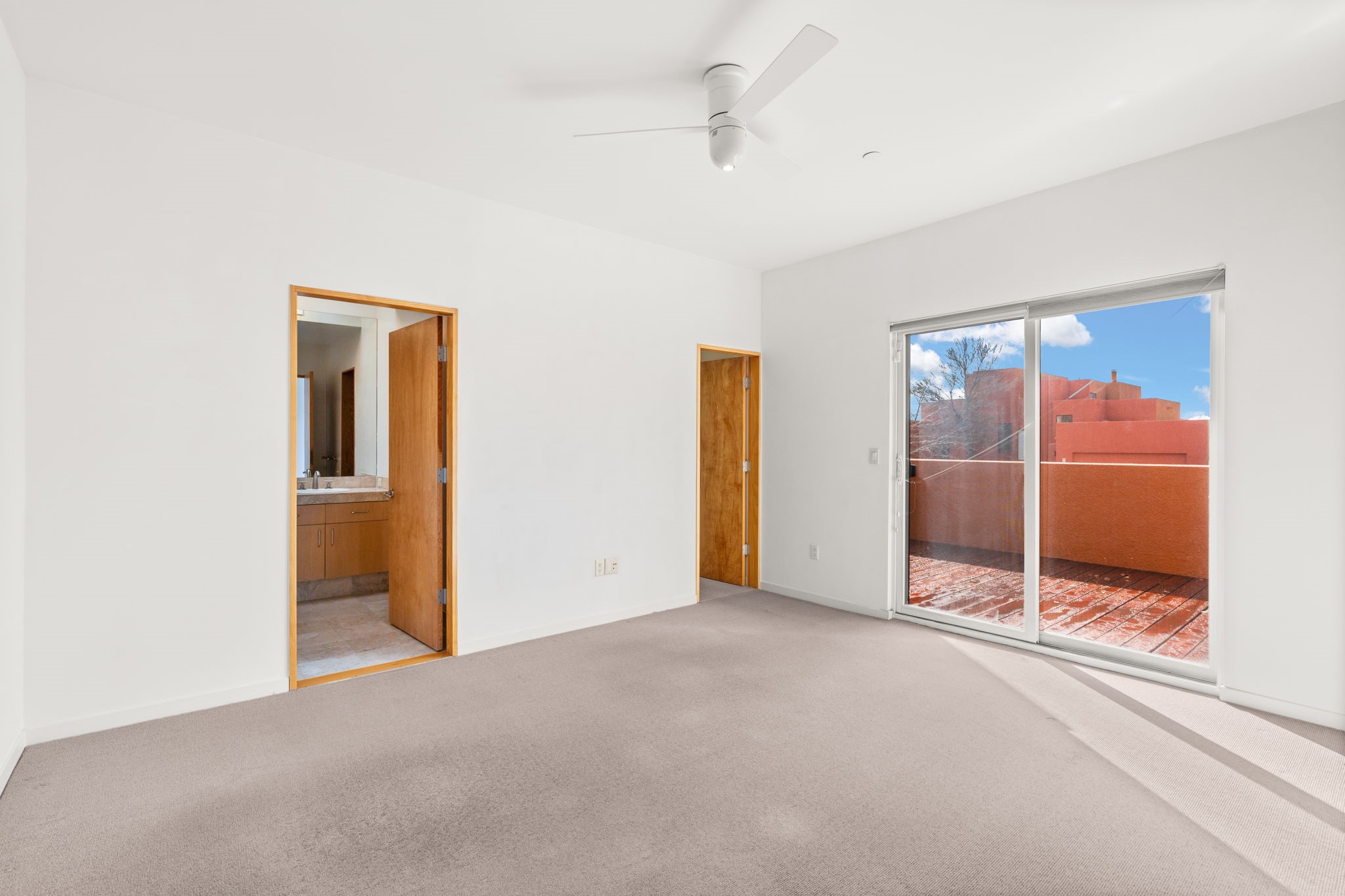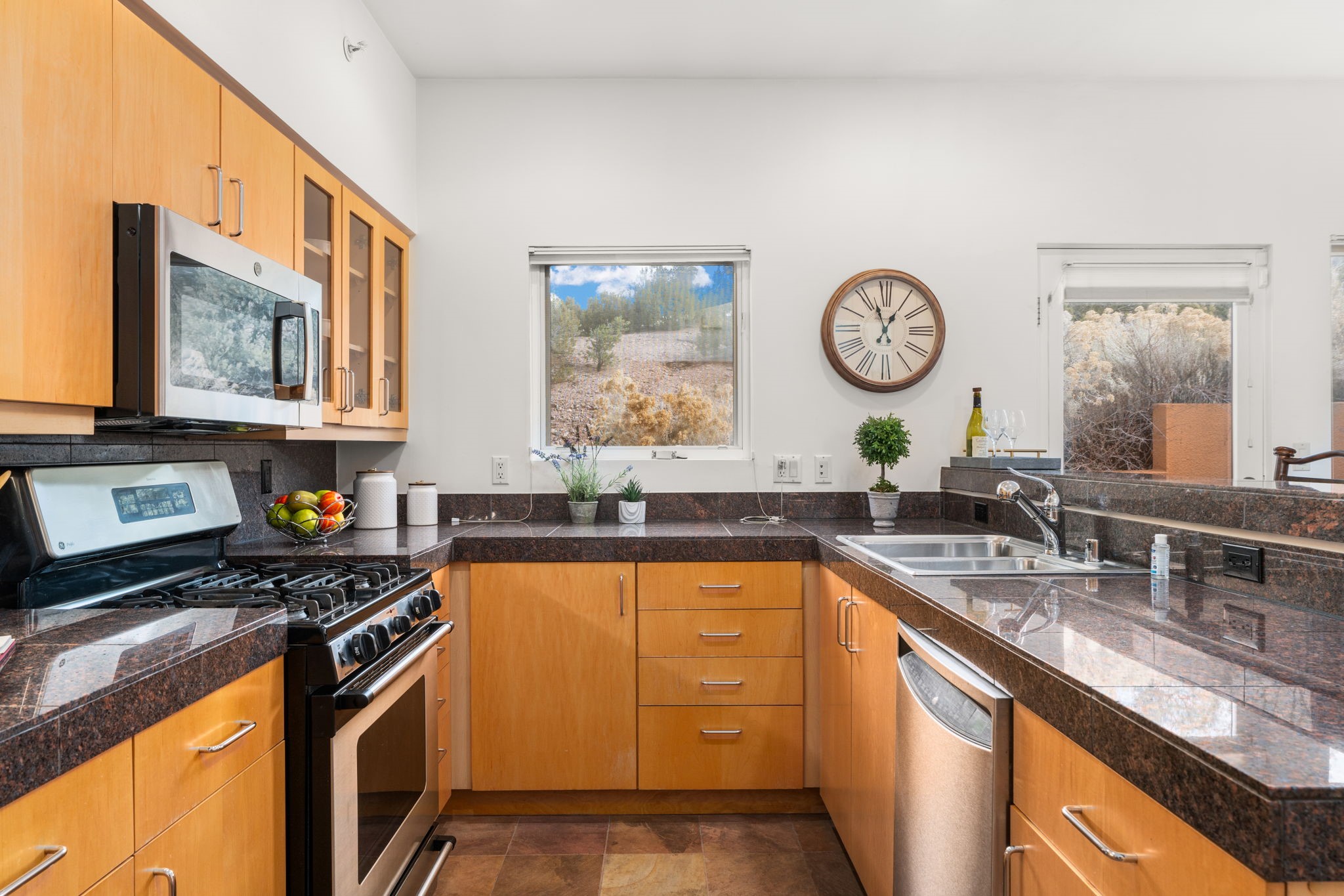 This 2 bedroom, 3 bath, impeccably maintained condo is located just a few short minutes north of downtown Santa Fe in the beautiful Zocalo community. Built on 46 acres of rolling hills offering sophisticated, contemporary design elements by world renowned architect Ricardo Legorreta. The highly desirable Canon floor plan allows complete separation and privacy, as well as ground level living with the primary ensuite bedroom, living room, dining room, kitchen and direct entry garage just up a few steps from the entrance foyer. A double-sided fireplace provides warmth and ambiance for the dramatic dining room featuring soaring ceilings and skylights, as well as the open concept living room, breakfast bar and kitchen. A lovely, fenced patio is accessed from the main living area, as well as from the main level, primary bedroom. Fabulous amenities and finishes are found throughout, such as travertine tile in the bathrooms, granite countertops, stainless steel appliances, sandstone floors, custom built entertainment center, radiant heat floors and refrigerated a/c. The upper-level primary suite has an alpine redwood deck to enjoy the beautiful, New Mexico sunsets! Sited on an elevated, private parcel adjoining open space, yet near the fabulous clubhouse, this condo is in one of the best locations in the community. Additional Zocalo amenities include two fitness centers, swimming pool, jacuzzi, spa, conference room, catering kitchen, large scenic patio and scenic walking trails. Whether you are looking for a peaceful retreat or a convenient spot for commuting, this condo has it all!