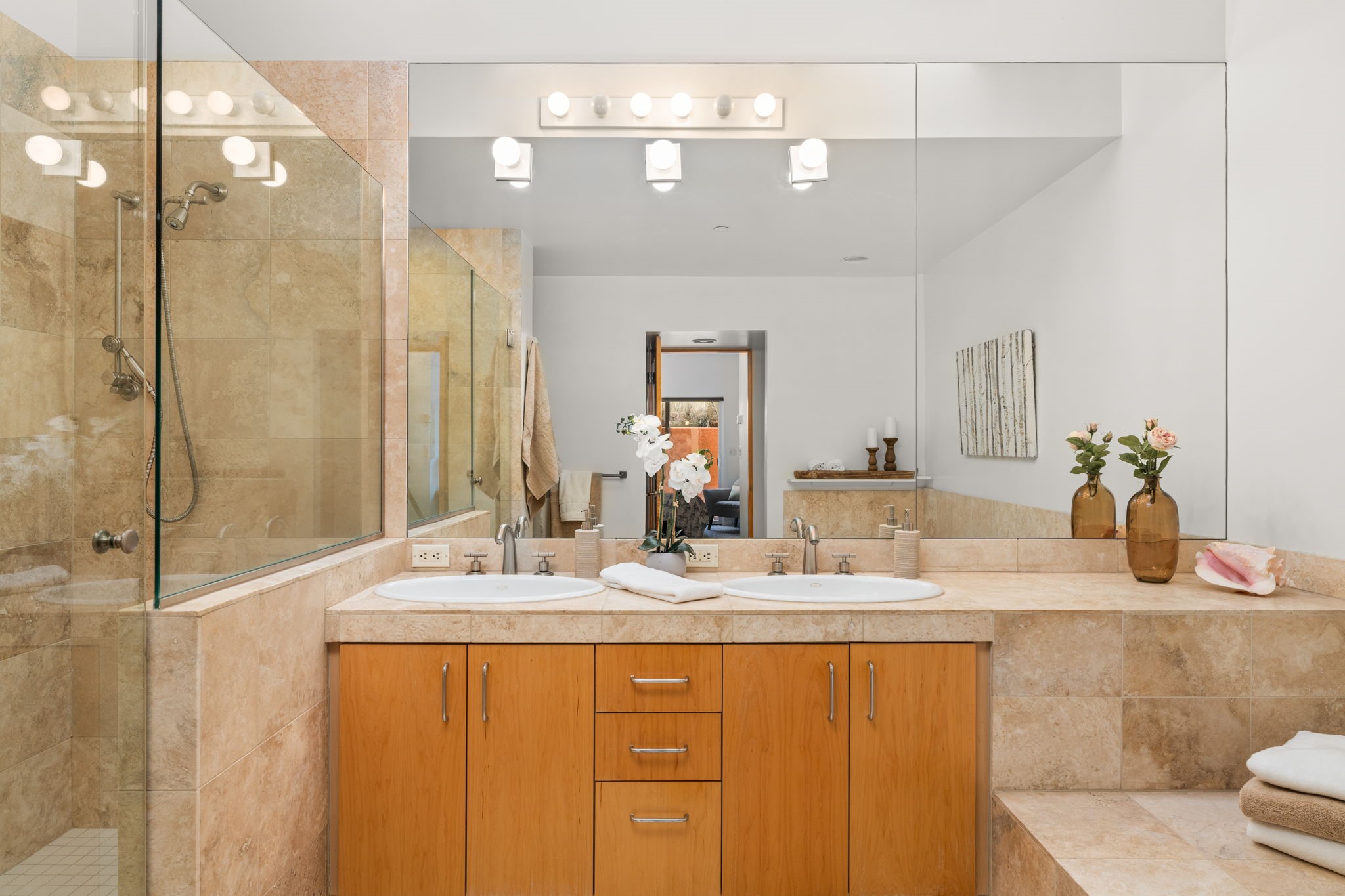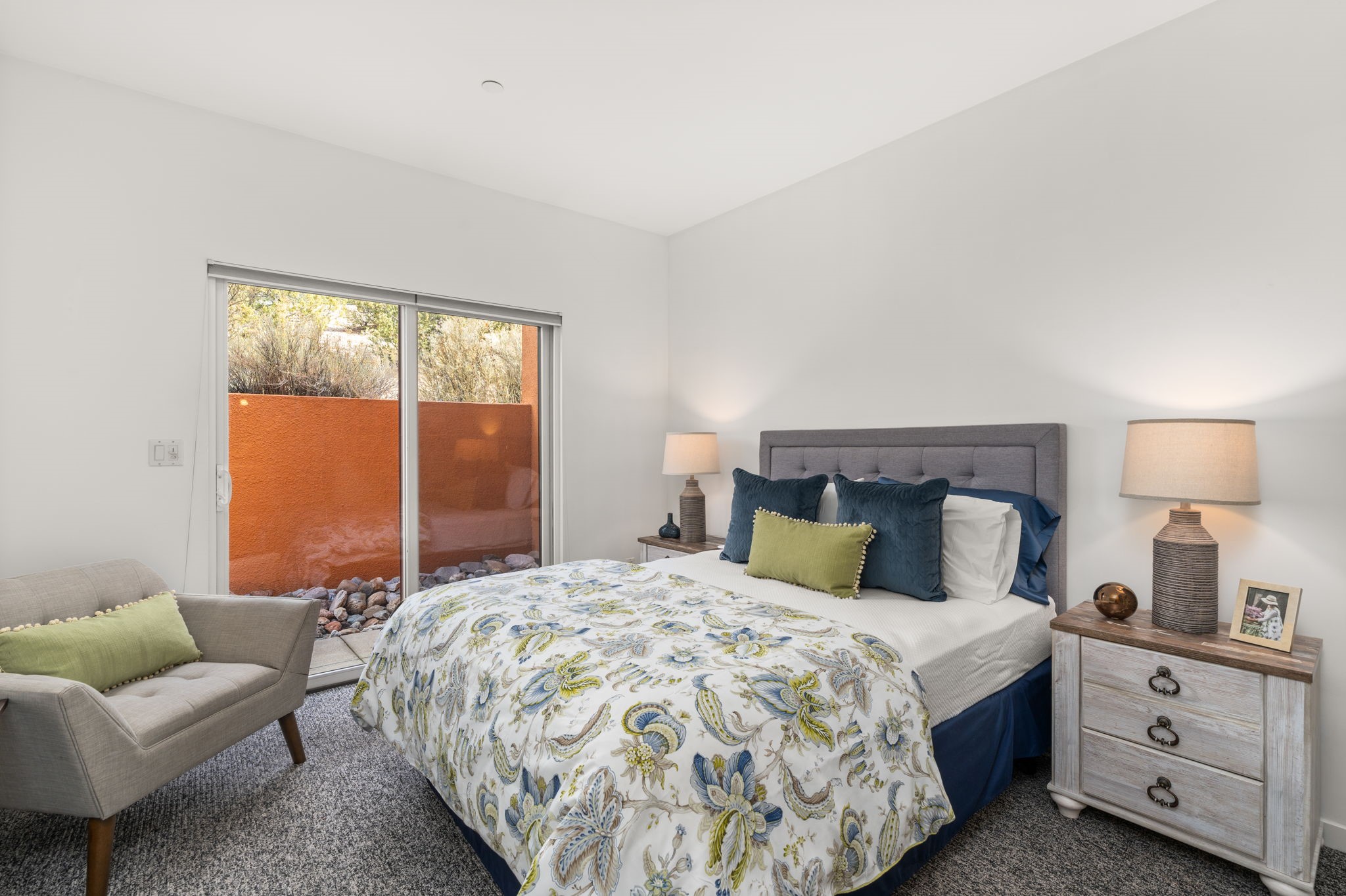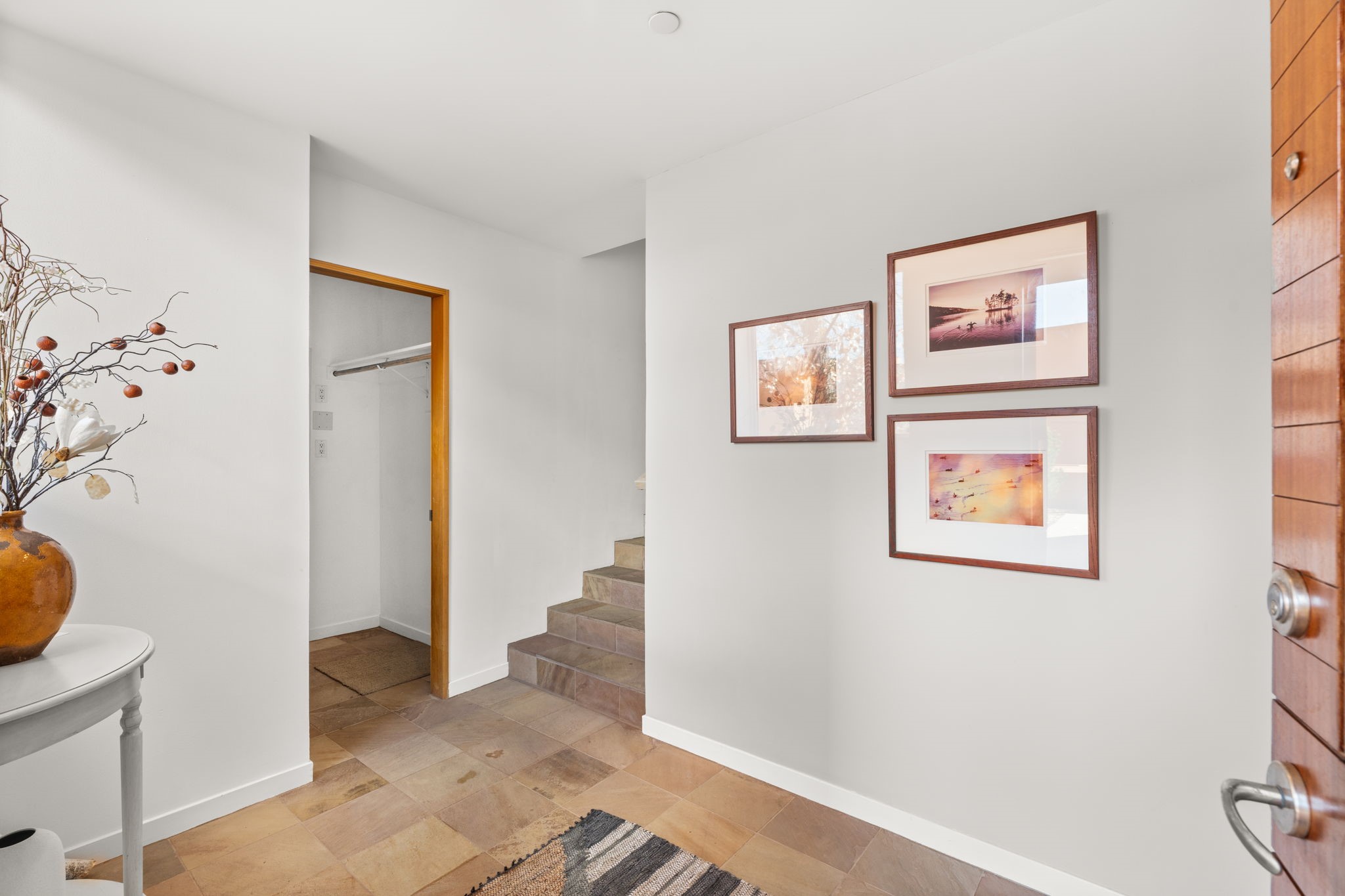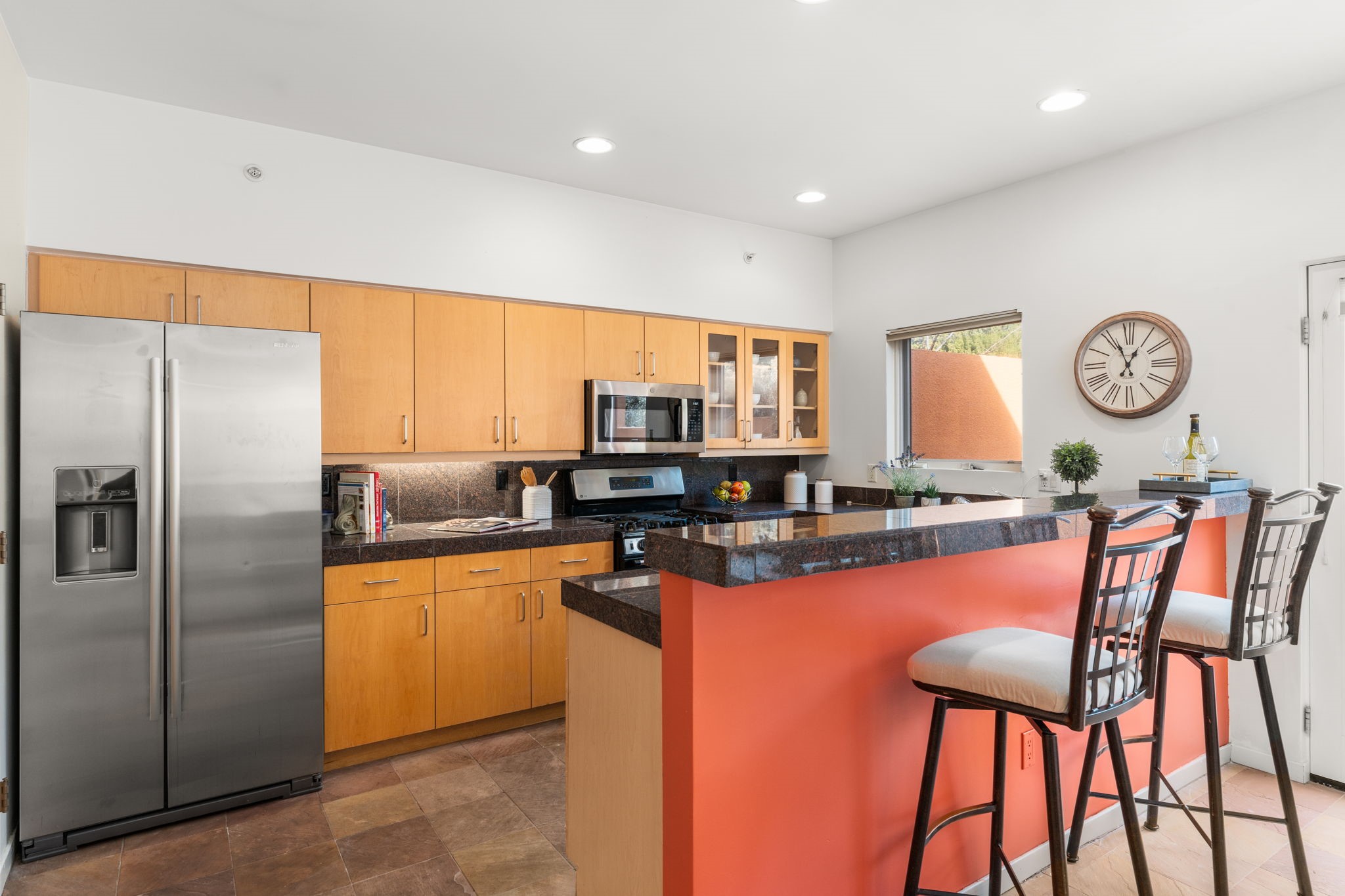 This 2 bedroom, 3 bath, impeccably maintained condo is located just a few short minutes north of downtown Santa Fe in the beautiful Zocalo community. Built on 46 acres of rolling hills offering sophisticated, contemporary design elements by world renowned architect Ricardo Legorreta. The highly desirable Canon floor plan allows complete separation and privacy, as well as ground level living with the primary ensuite bedroom, living room, dining room, kitchen and direct entry garage just up a few steps from the entrance foyer. A double-sided fireplace provides warmth and ambiance for the dramatic dining room featuring soaring ceilings and skylights, as well as the open concept living room, breakfast bar and kitchen. A lovely, fenced patio is accessed from the main living area, as well as from the main level, primary bedroom. Fabulous amenities and finishes are found throughout, such as travertine tile in the bathrooms, granite countertops, stainless steel appliances, sandstone floors, custom built entertainment center, radiant heat floors and refrigerated a/c. The upper-level primary suite has an alpine redwood deck to enjoy the beautiful, New Mexico sunsets! Sited on an elevated, private parcel adjoining open space, yet near the fabulous clubhouse, this condo is in one of the best locations in the community. Additional Zocalo amenities include two fitness centers, swimming pool, jacuzzi, spa, conference room, catering kitchen, large scenic patio and scenic walking trails. Whether you are looking for a peaceful retreat or a convenient spot for commuting, this condo has it all!