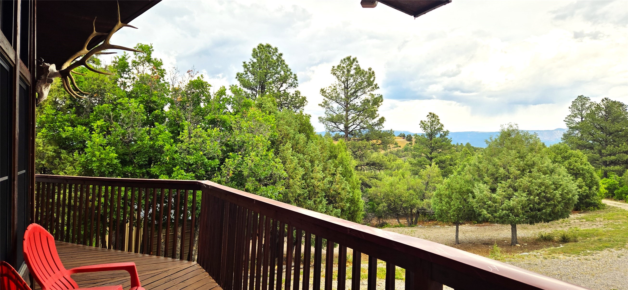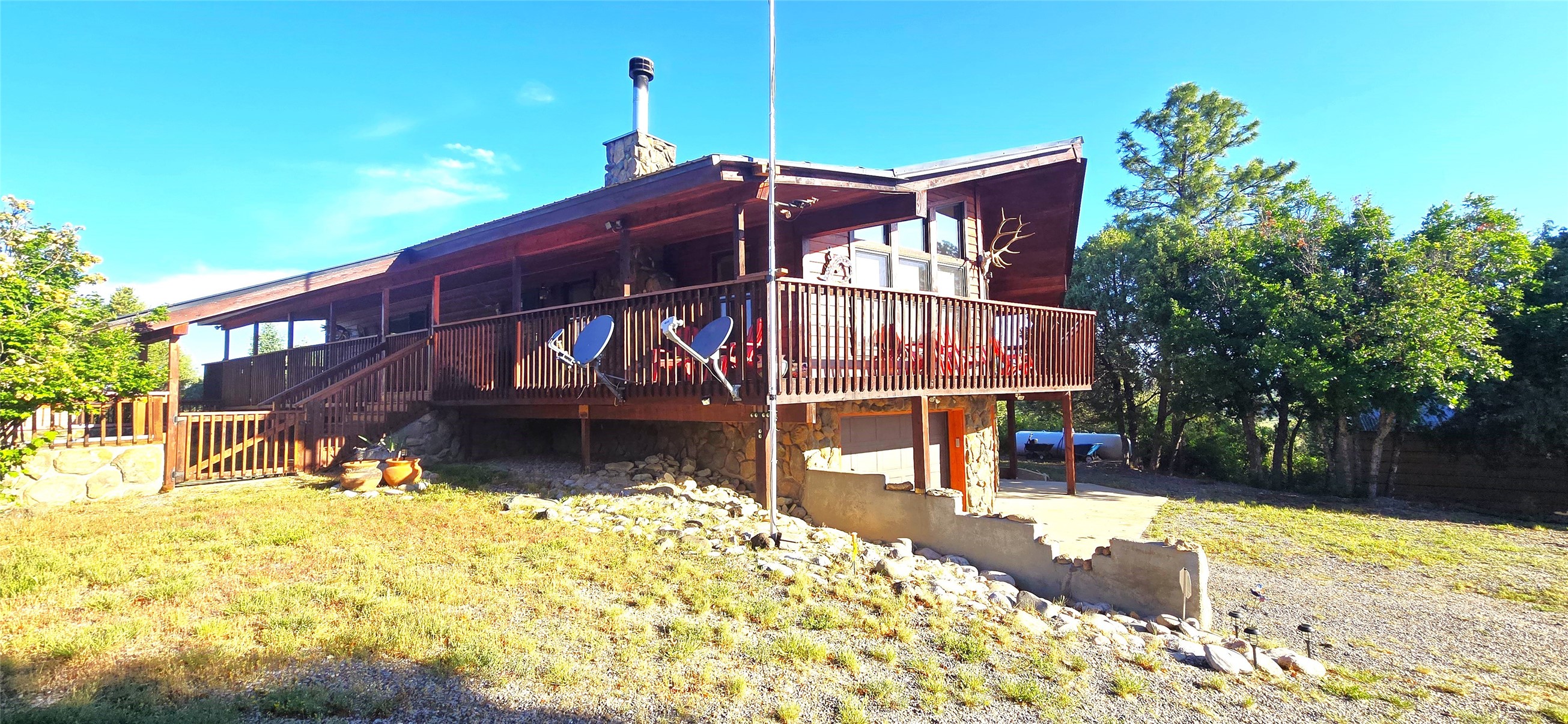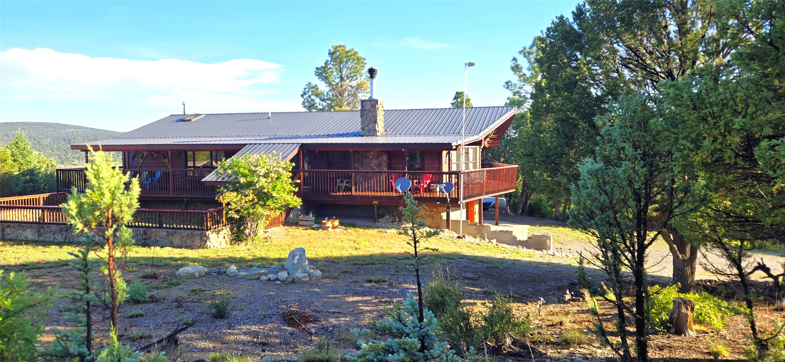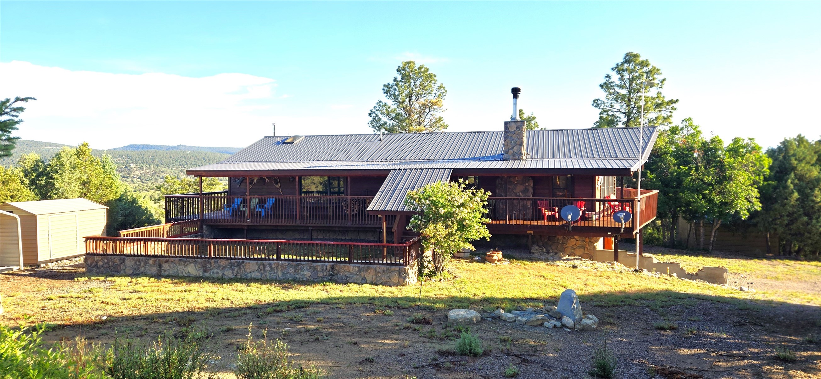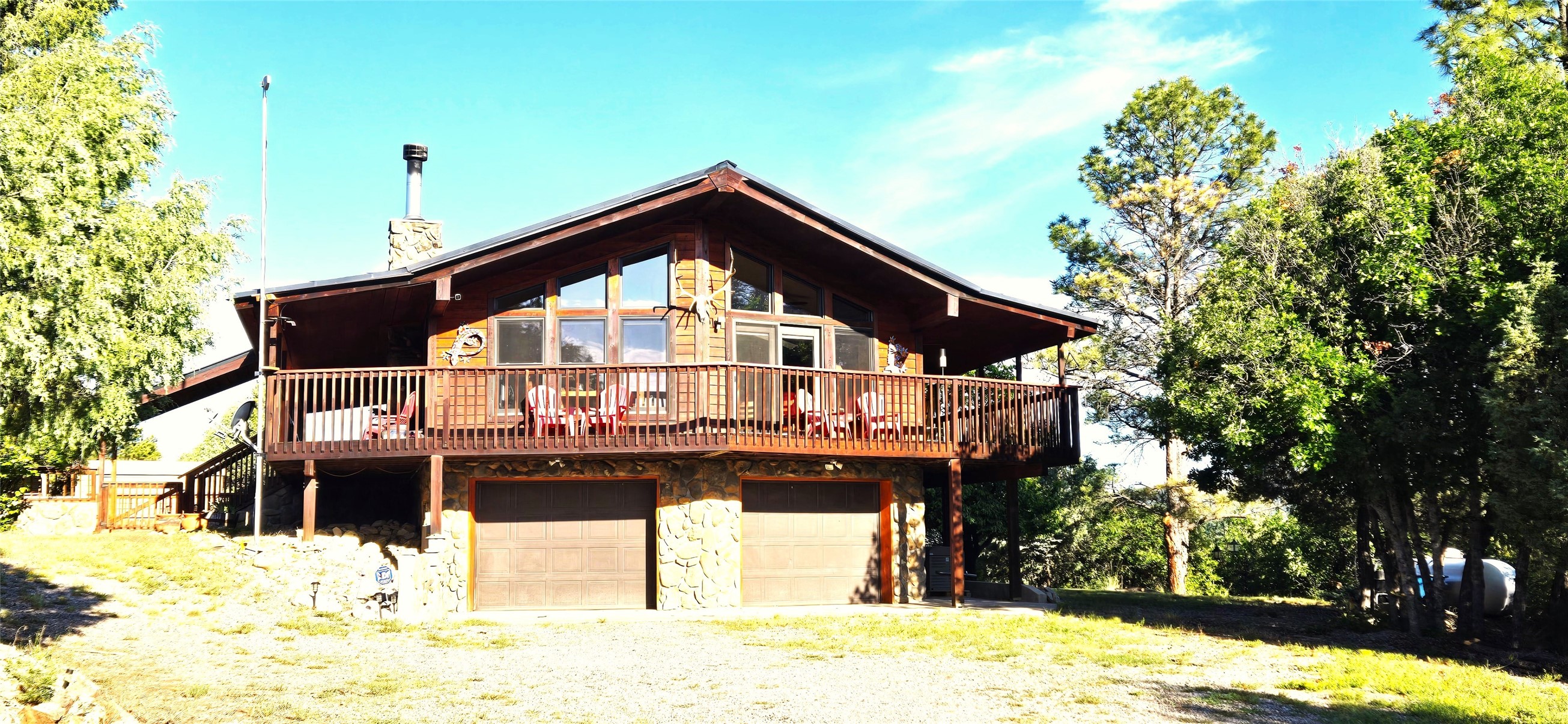 Beautiful well kept mountain home located in the community of Rutheron NM, just minutes from Heron Lake State Park. Vista De Heron S/D Tract 3, cont. 12.81 acres +/- with 787 ft of direct road frontage on Highway 95. Also a Private drive from Vista De Heron, Camino Thomas Drive.The Cabin is a split two level with a total enclosed area of 3,374 sq. ft. Top level living space is 1,687 sqft. with 3 Bedrooms; two full baths; walk in Master Closet; Laundry Room; open Kitchen /Dining with cook preparation island; Living Room with fire place; complete wrap around covered balcony porch. Lower level 1 Bedroom; Walk-in Clothes Closet; one full bath; Den with stove fire place; LinenCloset; Hall; Utility with HVAC, Hot Water Heater, Water Softener, Storage, ADT Security Hub,back-up generator transfer switch; two car extra-large garage 756 sqftprovides extra space for storage and work shop. Lower level has a full side walk-out, with the opposite side recessed into hill. Full gated courtyard at main entry. The Lower level has been designed to be modified into a separate living area with it's own entrance. The home is heated with a propane forced air unit along with refrigerated air for those warm days. 1000 gallon propane tank, culligan water softner with an RO filtration unit. The upper fire place is a Heatilator and the lower floor has a cast iron wood stove.Out buildings to include a 10x20 metal utility building for yard tools. A 20x20 open garage covered for toys or vehicles and a 25x30 open garage covered for more vehicle or toy storage.Very clean and well taken care of home.