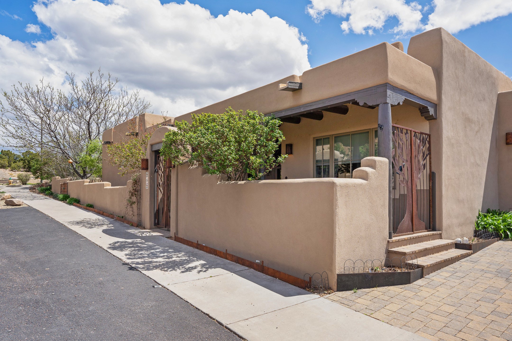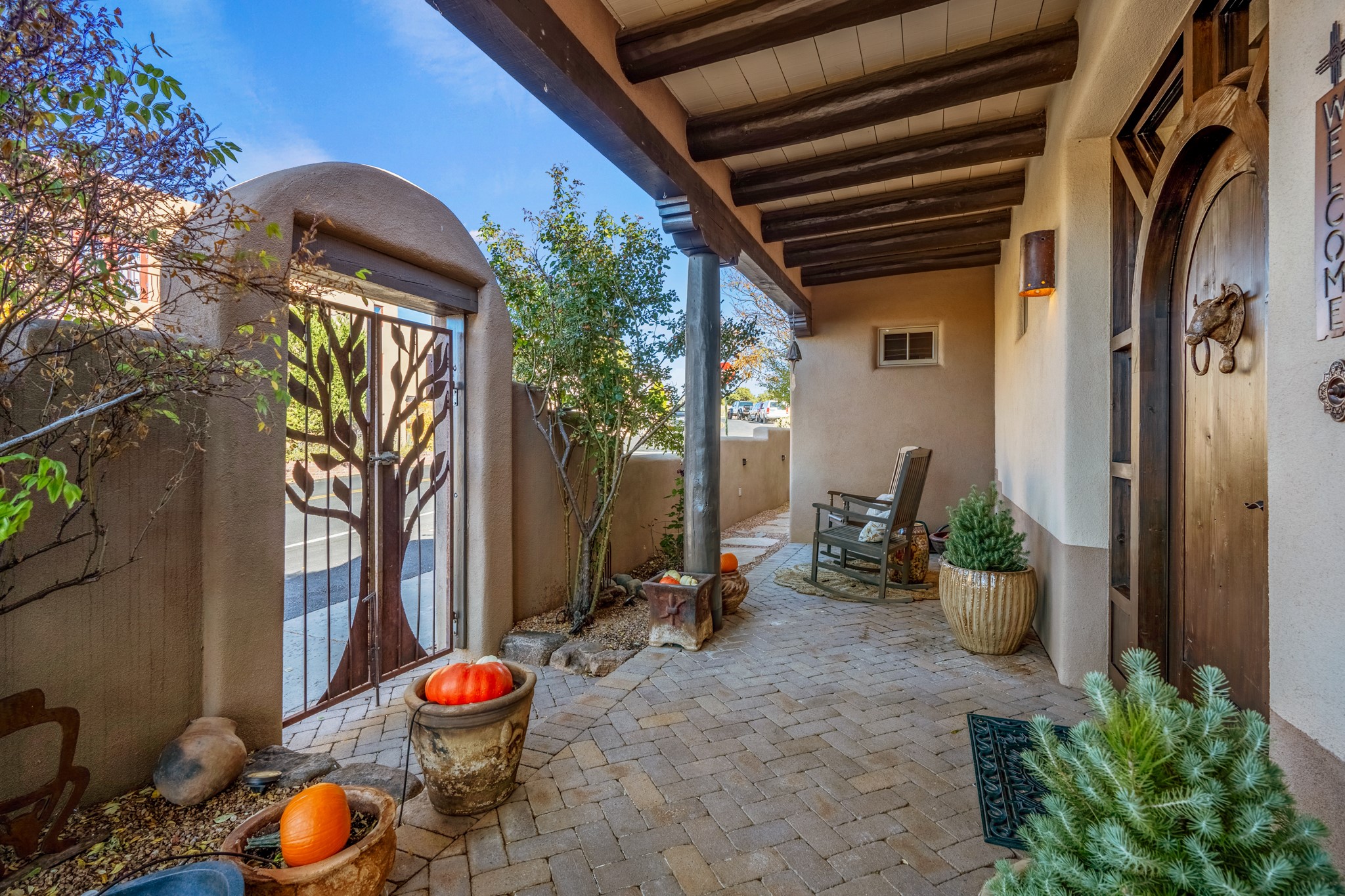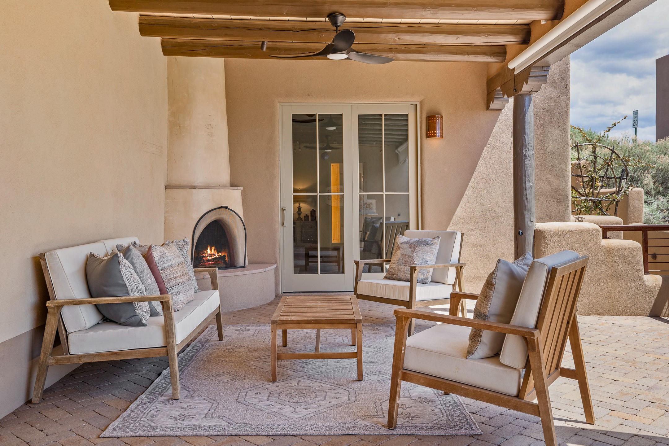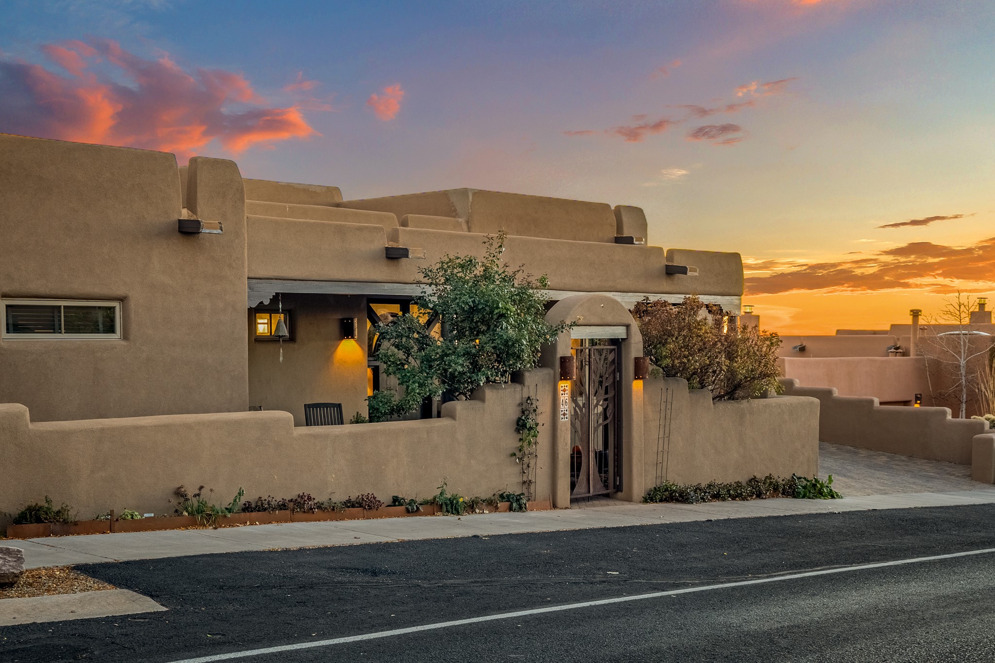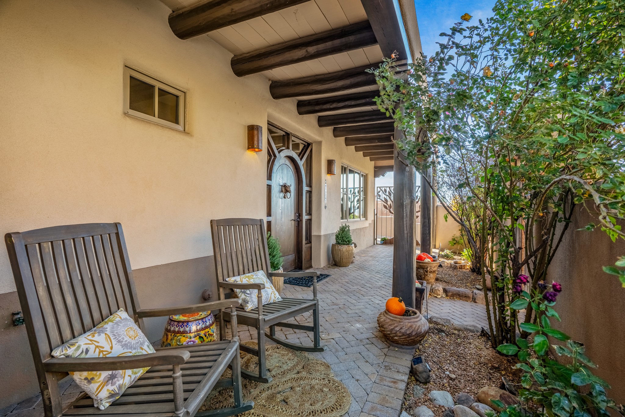 Sometimes, a home just fits. From the moment you step inside 46 E Via Plaza Nueva, it's clear: this isn't a house you have to fix or tolerate or remake, it's a house you can finally live in. Recently reinvented from the ground up, this 3,947-square-foot residence combines classic Pueblo Revival architecture with modern elegance and uncompromising upgrades. Every inch reflects thoughtful design and enduring quality from the brand-new roof and mechanicals to the luxurious Miele kitchen, spa-like baths, and three distinct outdoor patios, each with its own view of the surrounding mountains. The heart of the home is its open living space, anchored by beamed ceilings and twin fireplaces, flooded with light and warmth. The chef's kitchen was designed to be used and loved, with high-end appliances, generous prep space, and a walk-in pantry. The primary suite is a retreat unto itself, with a soaking tub, radiant floors, and light that shifts beautifully throughout the day. Each of the three bedrooms has its own private en suite bath and custom walk-in closet. Whether you're entertaining weekend guests or settling in with family, there's space, privacy, and comfort for everyone. And outside? Three portals sunlit, starlit, and mountain-kissed, invite you to sip, savor, and breathe. Highlights Include: Complete renovation (2019-2022): mechanical systems, roof, finishes, appliances, gorgeous landscaping.3 bedrooms, 3.5 bathrooms, all en suite. Chef's kitchen with Miele appliances and walk-in pantry. Three outdoor patios with expansive mountain views. Radiant floor heat, new HVAC, and energy-efficient systems. Finished 2-car garage. Located in the peaceful Aldea neighborhood with low HOA and quick access to trails. Minutes from downtown Santa Fe, but a world away in peace and quiet.The seller's VA loan is assumable for qualified buyers the rate is 2.625%. You do not have to be a vet to assume it.