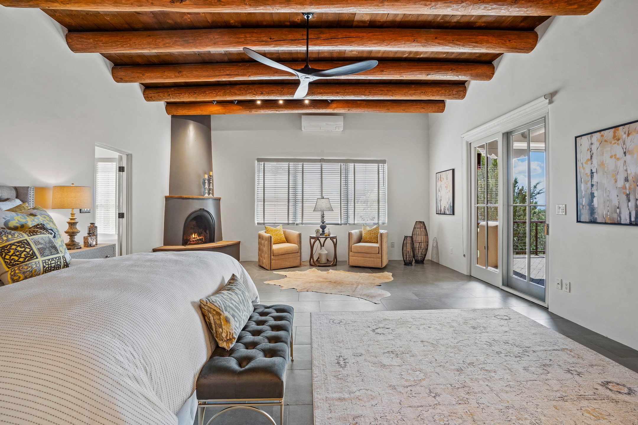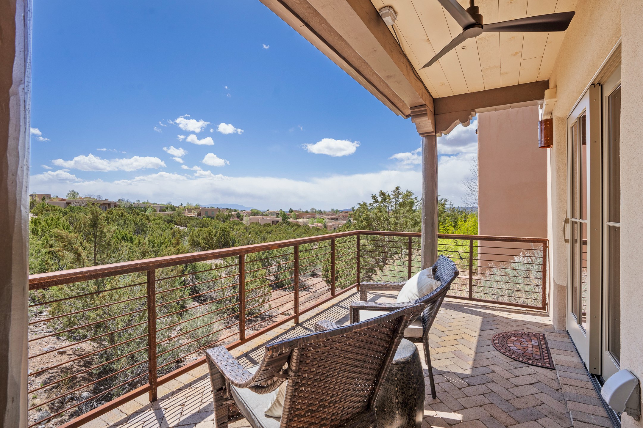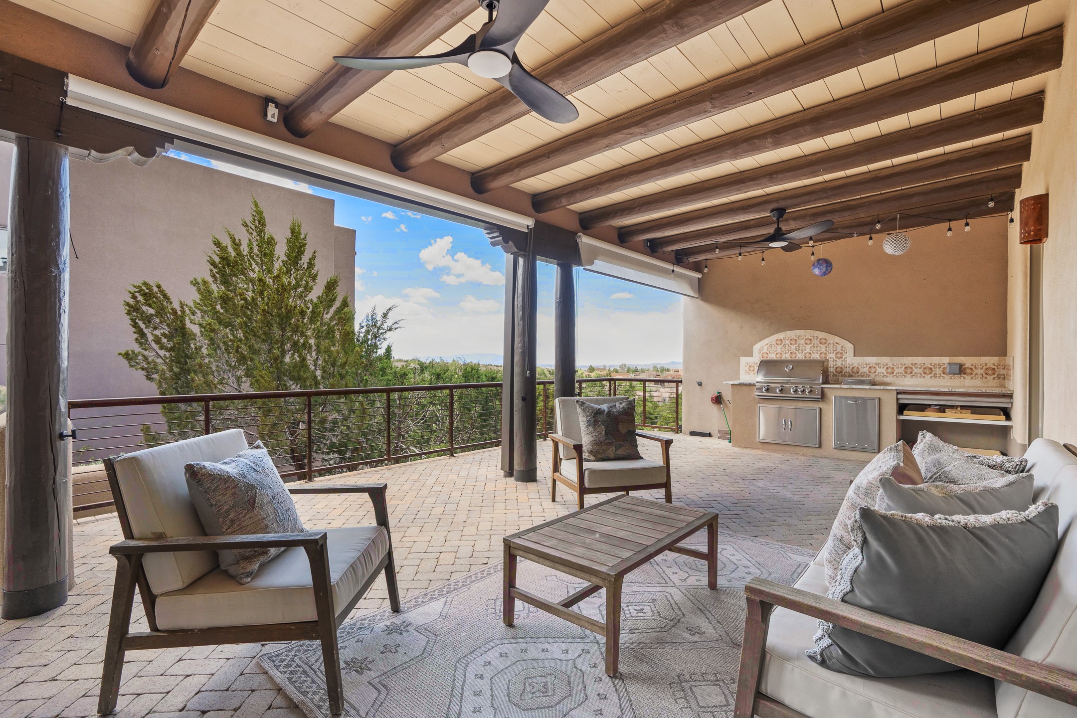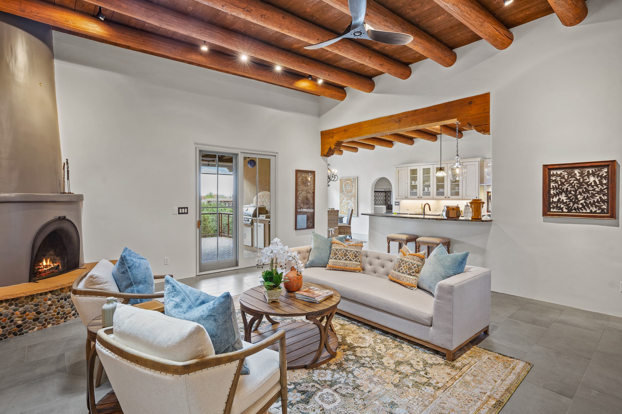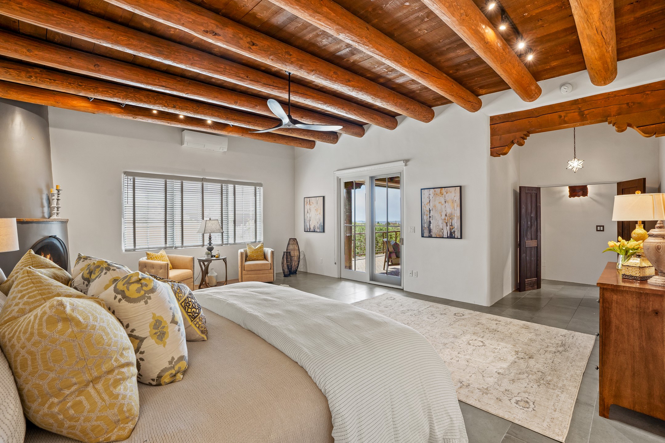 Sometimes, a home just fits. From the moment you step inside 46 E Via Plaza Nueva, it's clear: this isn't a house you have to fix or tolerate or remake, it's a house you can finally live in. Recently reinvented from the ground up, this 3,947-square-foot residence combines classic Pueblo Revival architecture with modern elegance and uncompromising upgrades. Every inch reflects thoughtful design and enduring quality from the brand-new roof and mechanicals to the luxurious Miele kitchen, spa-like baths, and three distinct outdoor patios, each with its own view of the surrounding mountains. The heart of the home is its open living space, anchored by beamed ceilings and twin fireplaces, flooded with light and warmth. The chef's kitchen was designed to be used and loved, with high-end appliances, generous prep space, and a walk-in pantry. The primary suite is a retreat unto itself, with a soaking tub, radiant floors, and light that shifts beautifully throughout the day. Each of the three bedrooms has its own private en suite bath and custom walk-in closet. Whether you're entertaining weekend guests or settling in with family, there's space, privacy, and comfort for everyone. And outside? Three portals sunlit, starlit, and mountain-kissed, invite you to sip, savor, and breathe. Highlights Include: Complete renovation (2019-2022): mechanical systems, roof, finishes, appliances, gorgeous landscaping.3 bedrooms, 3.5 bathrooms, all en suite. Chef's kitchen with Miele appliances and walk-in pantry. Three outdoor patios with expansive mountain views. Radiant floor heat, new HVAC, and energy-efficient systems. Finished 2-car garage. Located in the peaceful Aldea neighborhood with low HOA and quick access to trails. Minutes from downtown Santa Fe, but a world away in peace and quiet.The seller's VA loan is assumable for qualified buyers the rate is 2.625%. You do not have to be a vet to assume it.