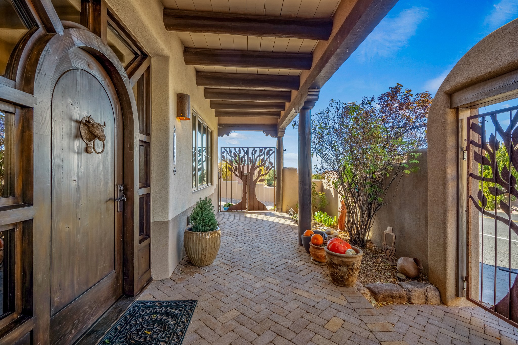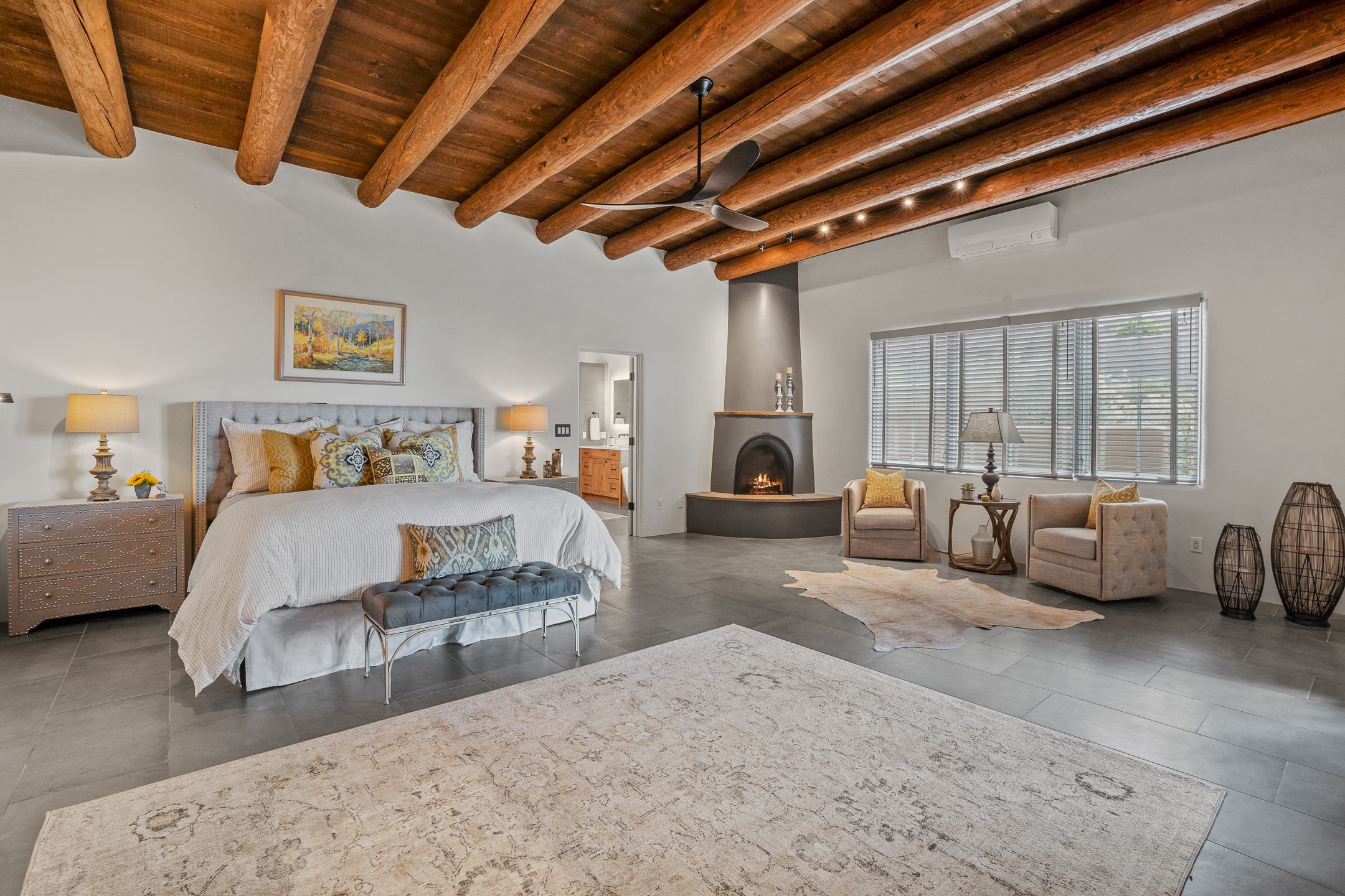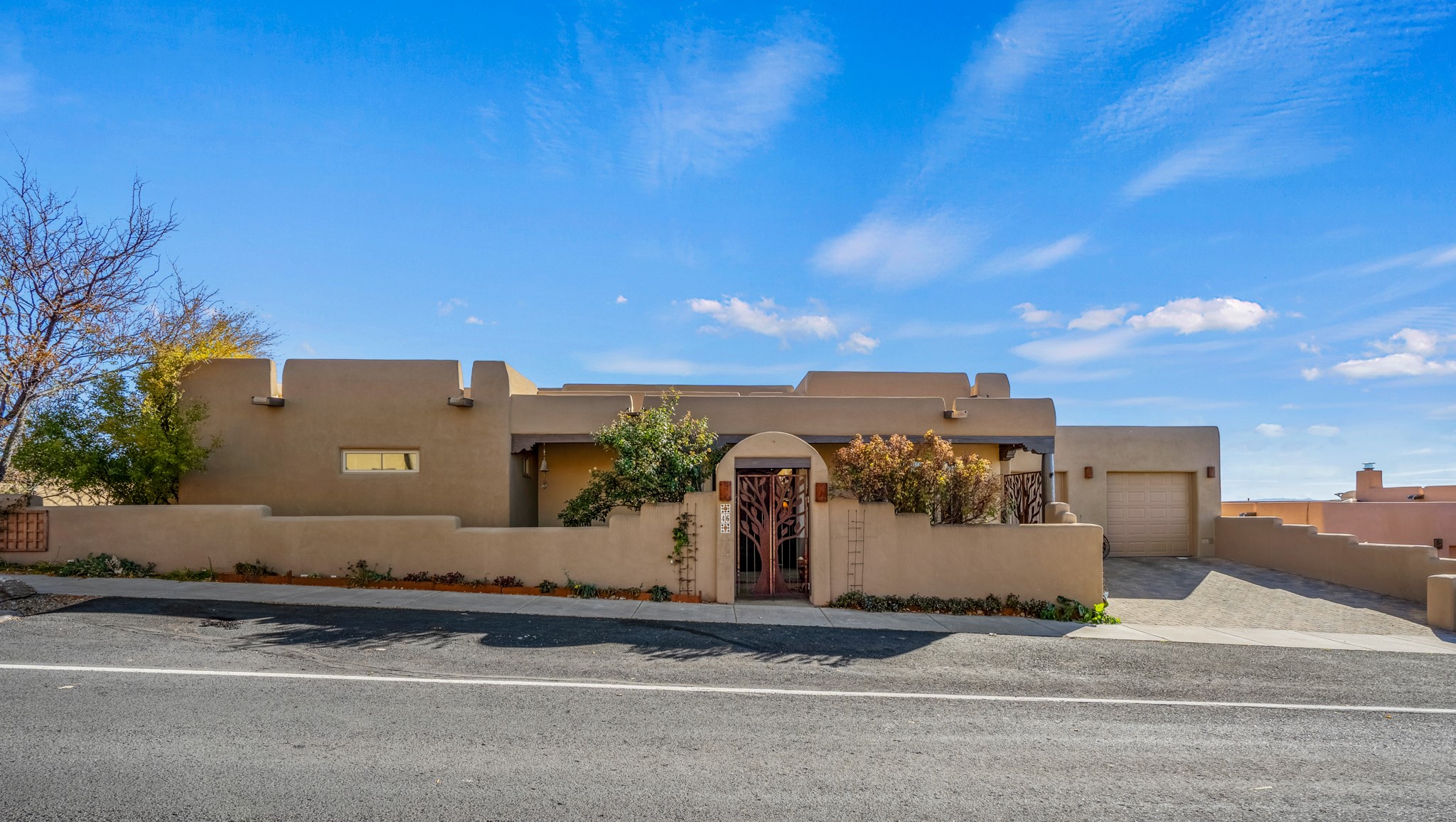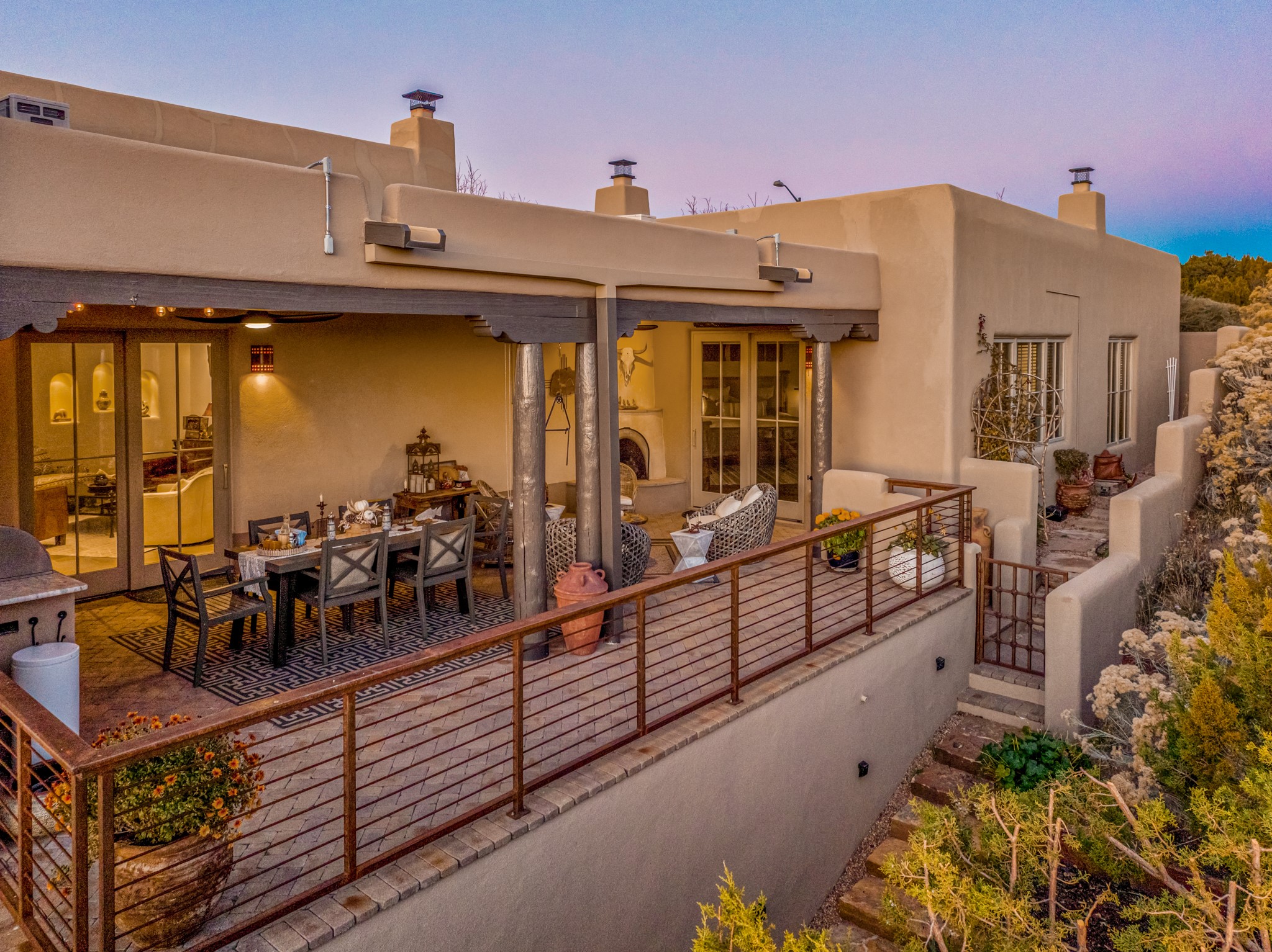 Sometimes, a home just fits. From the moment you step inside 46 E Via Plaza Nueva, it's clear: this isn't a house you have to fix or tolerate or remake, it's a house you can finally live in. Recently reinvented from the ground up, this 3,947-square-foot residence combines classic Pueblo Revival architecture with modern elegance and uncompromising upgrades. Every inch reflects thoughtful design and enduring quality from the brand-new roof and mechanicals to the luxurious Miele kitchen, spa-like baths, and three distinct outdoor patios, each with its own view of the surrounding mountains. The heart of the home is its open living space, anchored by beamed ceilings and twin fireplaces, flooded with light and warmth. The chef's kitchen was designed to be used and loved, with high-end appliances, generous prep space, and a walk-in pantry. The primary suite is a retreat unto itself, with a soaking tub, radiant floors, and light that shifts beautifully throughout the day. Each of the three bedrooms has its own private en suite bath and custom walk-in closet. Whether you're entertaining weekend guests or settling in with family, there's space, privacy, and comfort for everyone. And outside? Three portals sunlit, starlit, and mountain-kissed, invite you to sip, savor, and breathe. Highlights Include: Complete renovation (2019-2022): mechanical systems, roof, finishes, appliances, gorgeous landscaping.3 bedrooms, 3.5 bathrooms, all en suite. Chef's kitchen with Miele appliances and walk-in pantry. Three outdoor patios with expansive mountain views. Radiant floor heat, new HVAC, and energy-efficient systems. Finished 2-car garage. Located in the peaceful Aldea neighborhood with low HOA and quick access to trails. Minutes from downtown Santa Fe, but a world away in peace and quiet.The seller's VA loan is assumable for qualified buyers the rate is 2.625%. You do not have to be a vet to assume it.