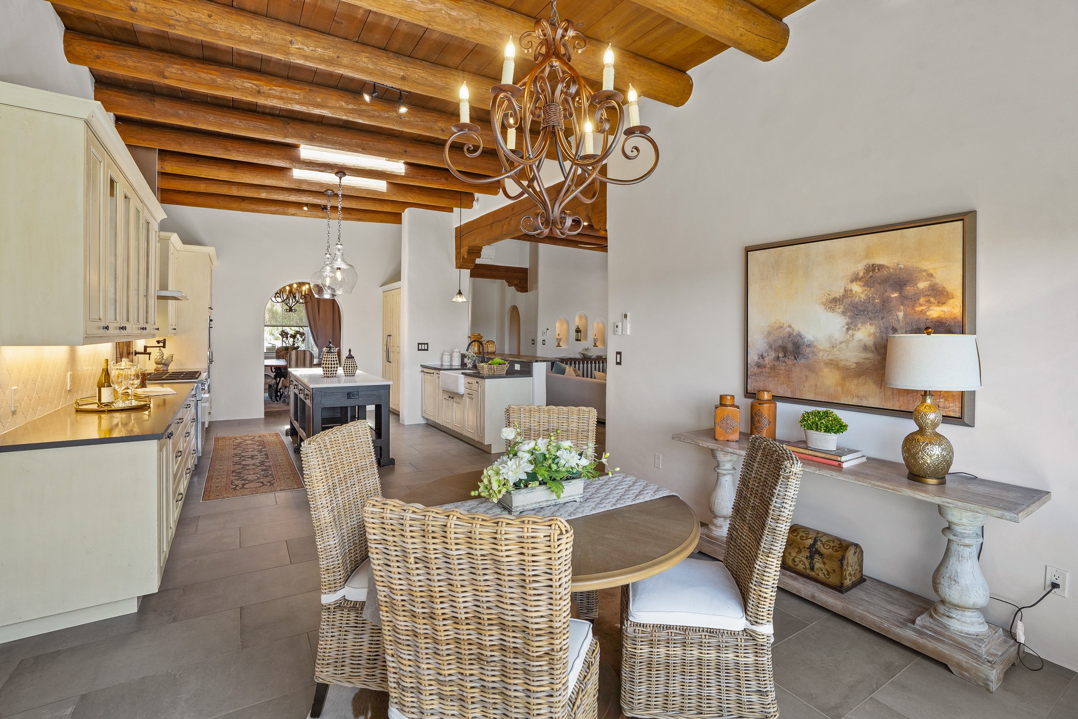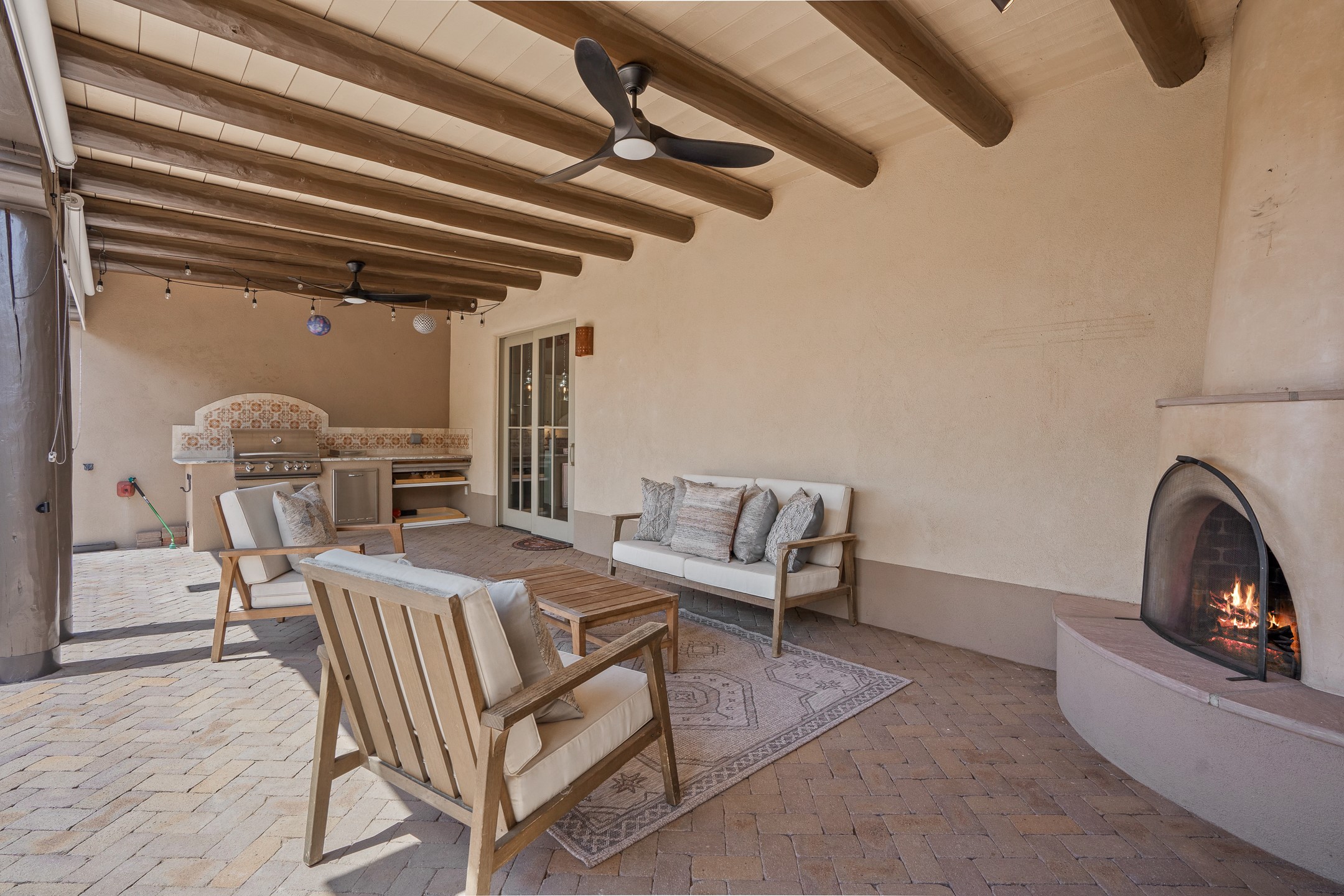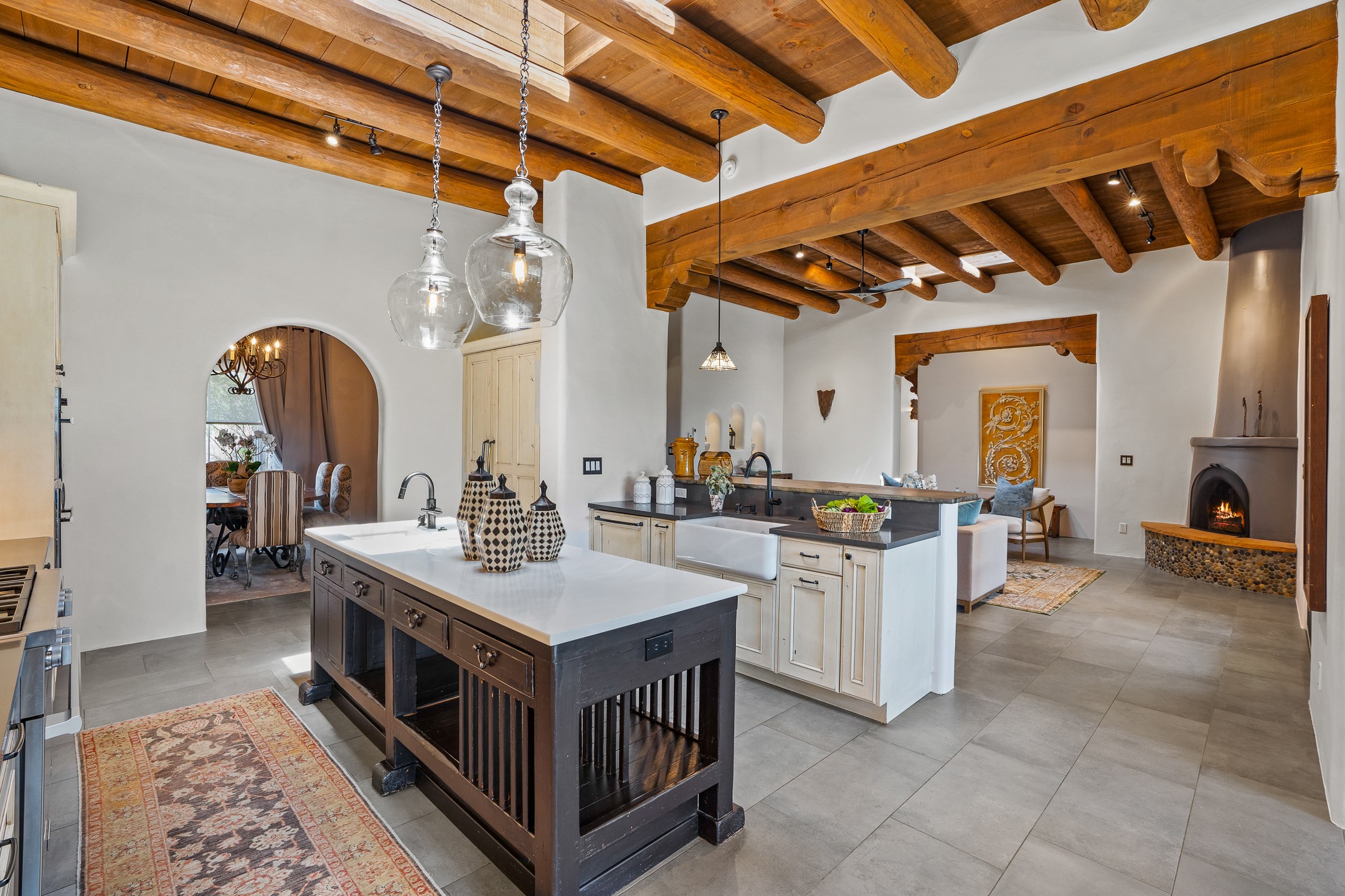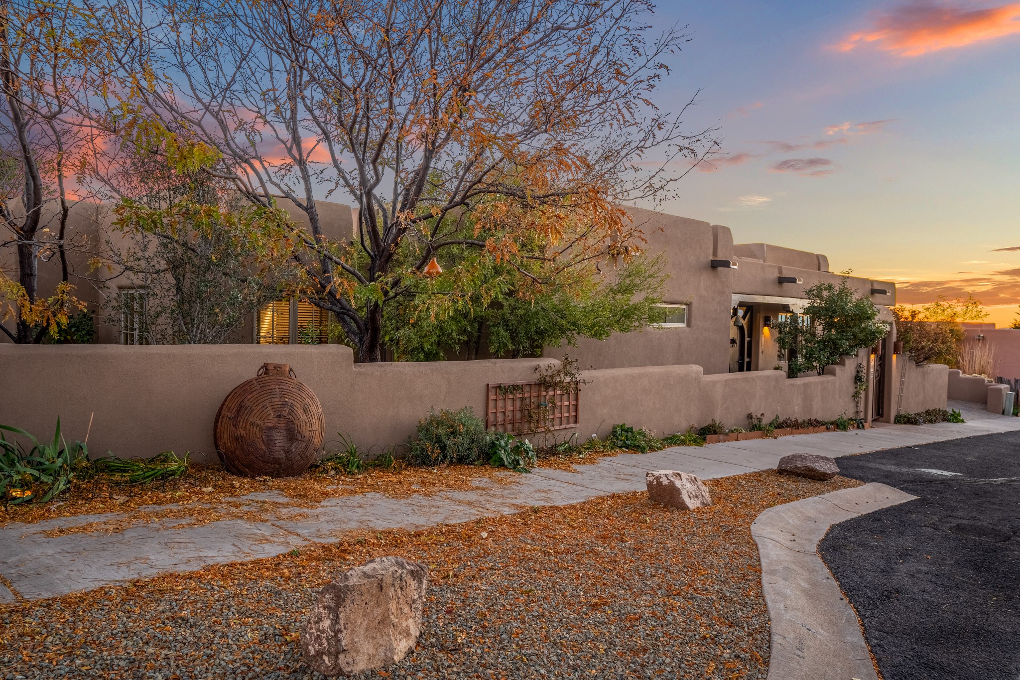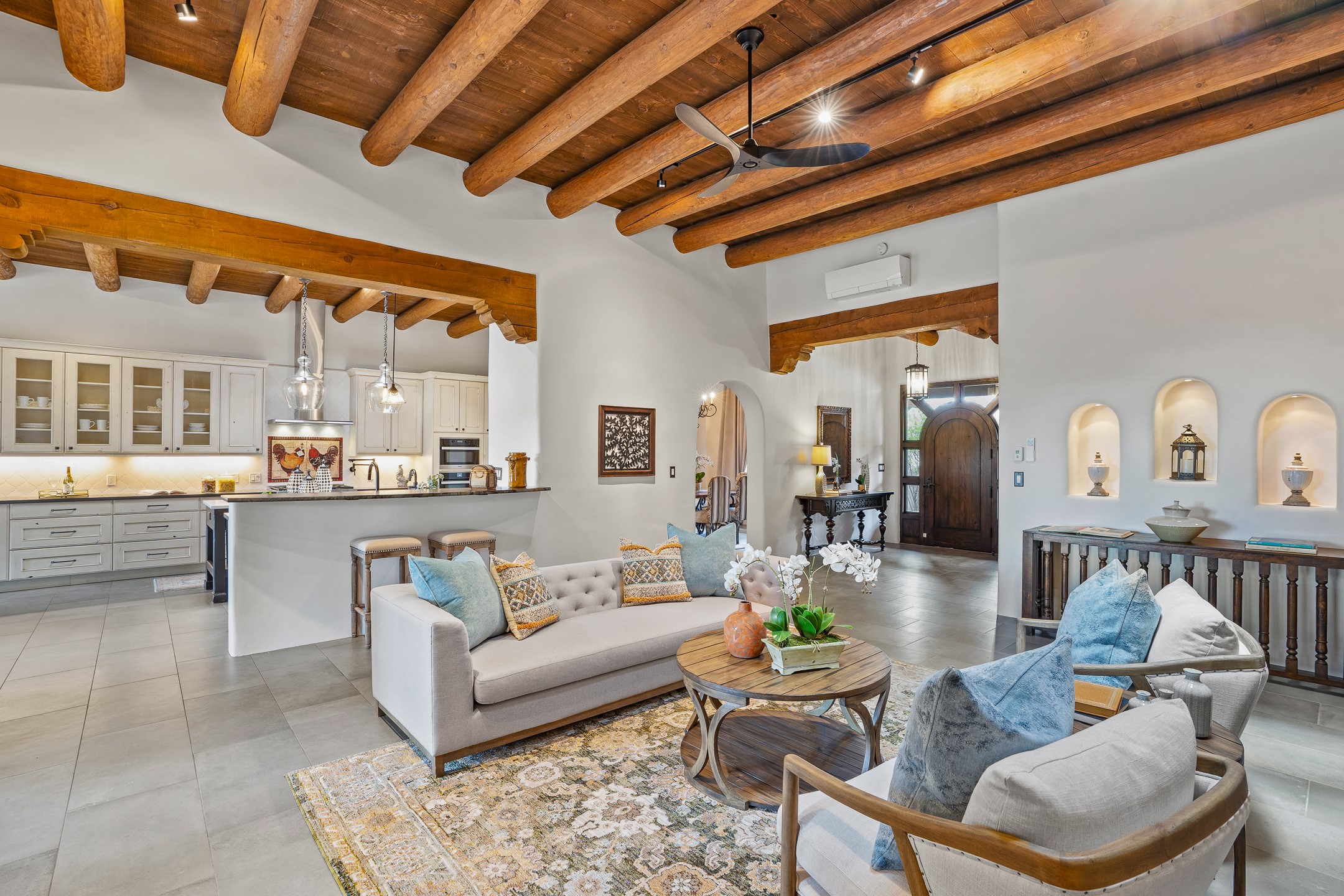 Sometimes, a home just fits. From the moment you step inside 46 E Via Plaza Nueva, it's clear: this isn't a house you have to fix or tolerate or remake, it's a house you can finally live in. Recently reinvented from the ground up, this 3,947-square-foot residence combines classic Pueblo Revival architecture with modern elegance and uncompromising upgrades. Every inch reflects thoughtful design and enduring quality from the brand-new roof and mechanicals to the luxurious Miele kitchen, spa-like baths, and three distinct outdoor patios, each with its own view of the surrounding mountains. The heart of the home is its open living space, anchored by beamed ceilings and twin fireplaces, flooded with light and warmth. The chef's kitchen was designed to be used and loved, with high-end appliances, generous prep space, and a walk-in pantry. The primary suite is a retreat unto itself, with a soaking tub, radiant floors, and light that shifts beautifully throughout the day. Each of the three bedrooms has its own private en suite bath and custom walk-in closet. Whether you're entertaining weekend guests or settling in with family, there's space, privacy, and comfort for everyone. And outside? Three portals sunlit, starlit, and mountain-kissed, invite you to sip, savor, and breathe. Highlights Include: Complete renovation (2019-2022): mechanical systems, roof, finishes, appliances, gorgeous landscaping.3 bedrooms, 3.5 bathrooms, all en suite. Chef's kitchen with Miele appliances and walk-in pantry. Three outdoor patios with expansive mountain views. Radiant floor heat, new HVAC, and energy-efficient systems. Finished 2-car garage. Located in the peaceful Aldea neighborhood with low HOA and quick access to trails. Minutes from downtown Santa Fe, but a world away in peace and quiet.The seller's VA loan is assumable for qualified buyers the rate is 2.625%. You do not have to be a vet to assume it.