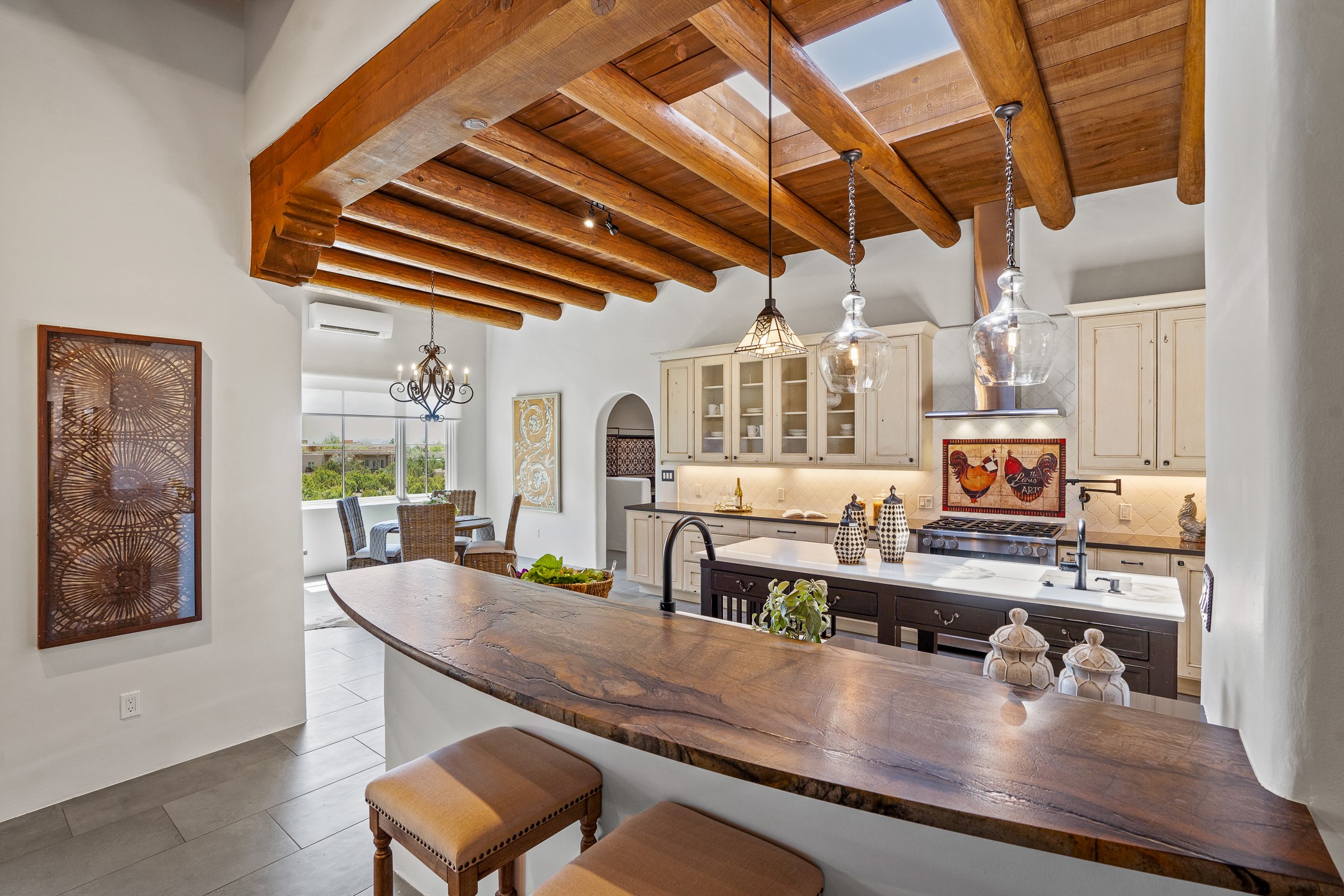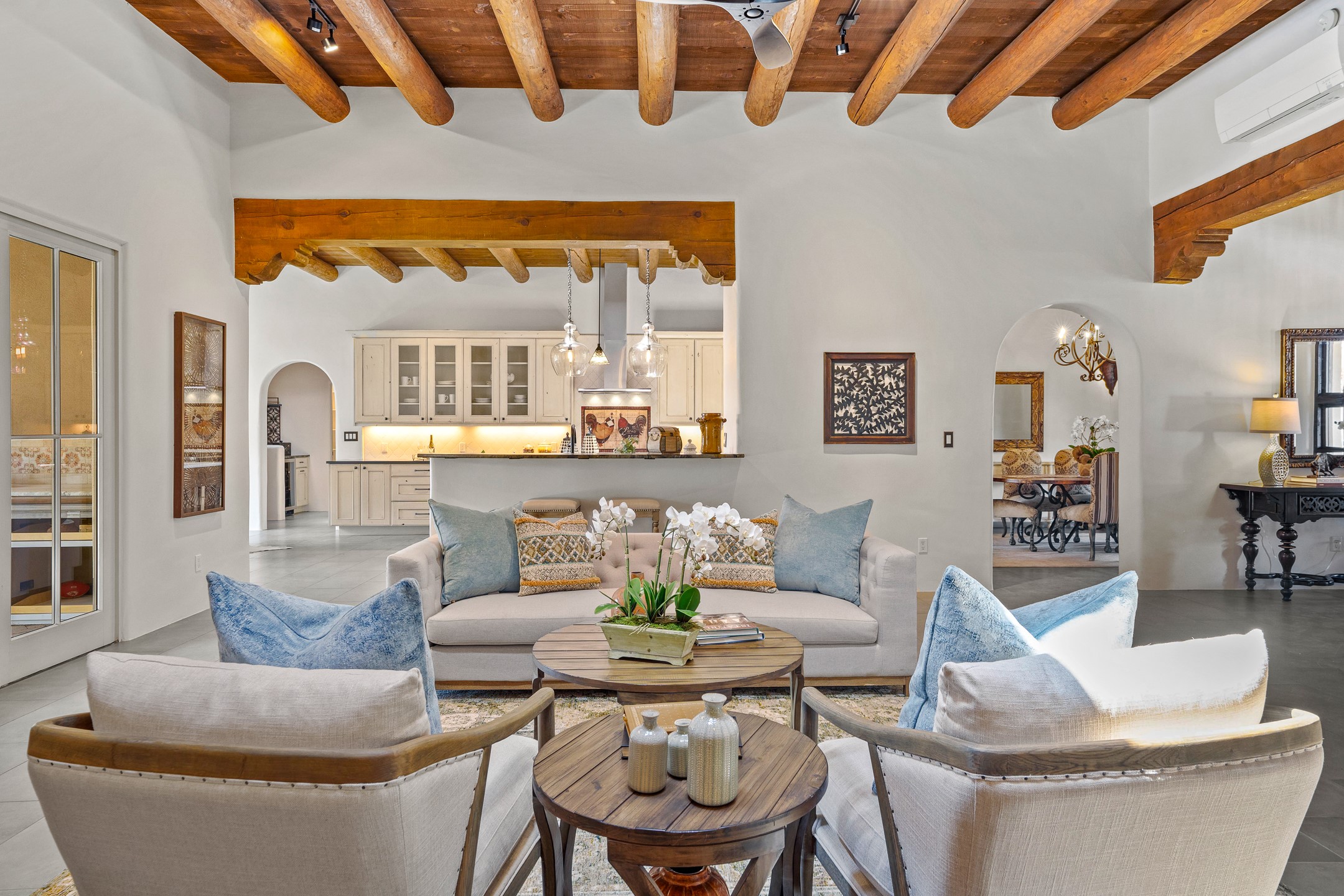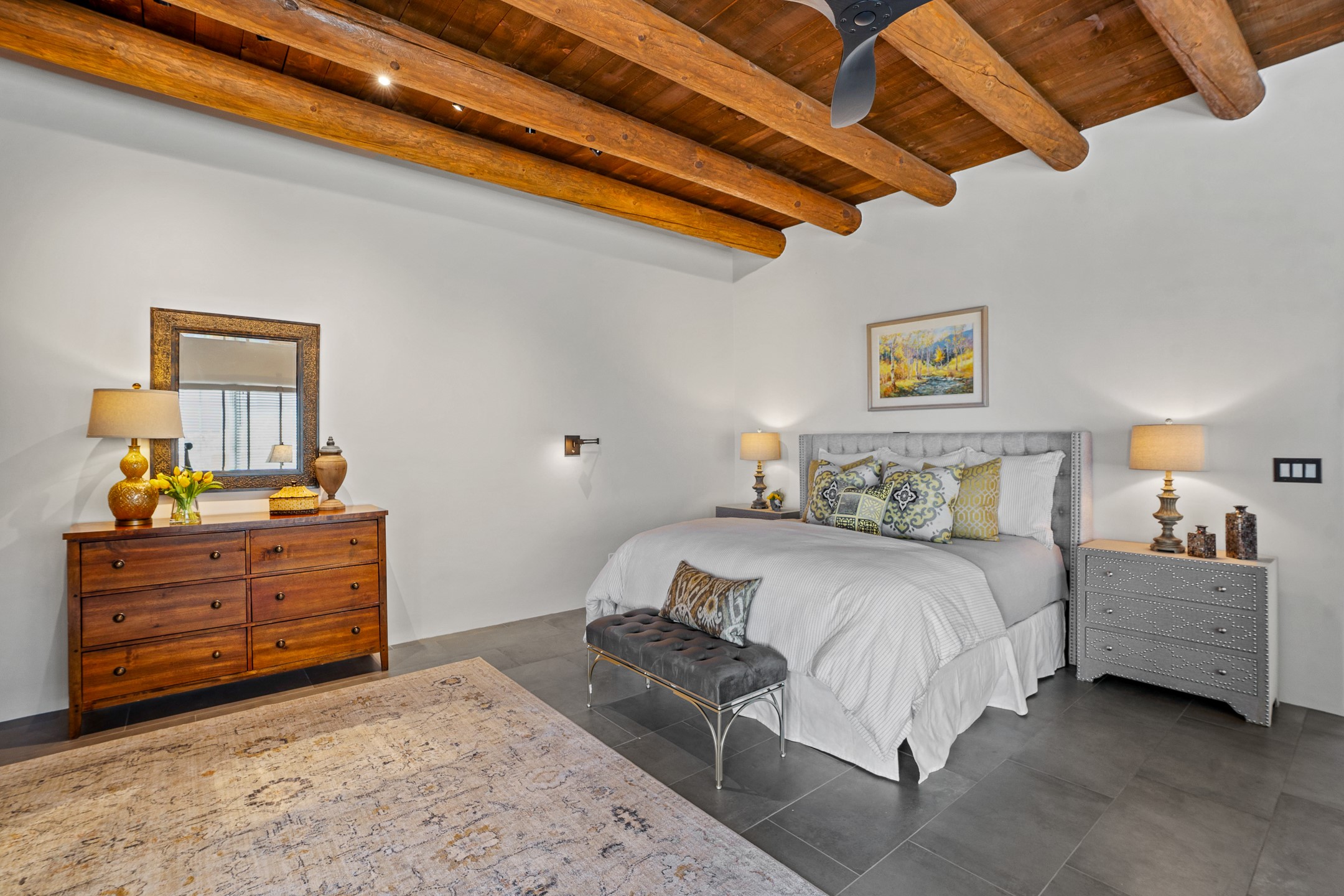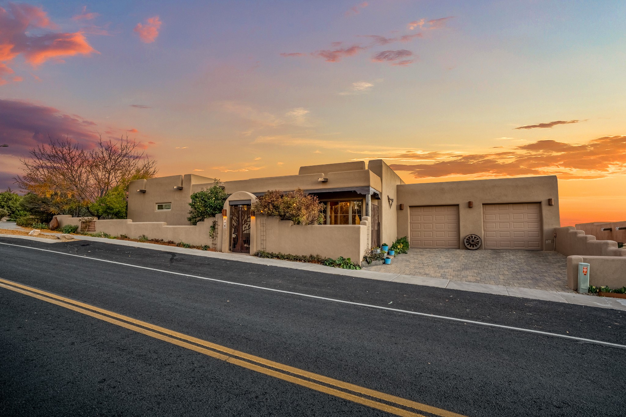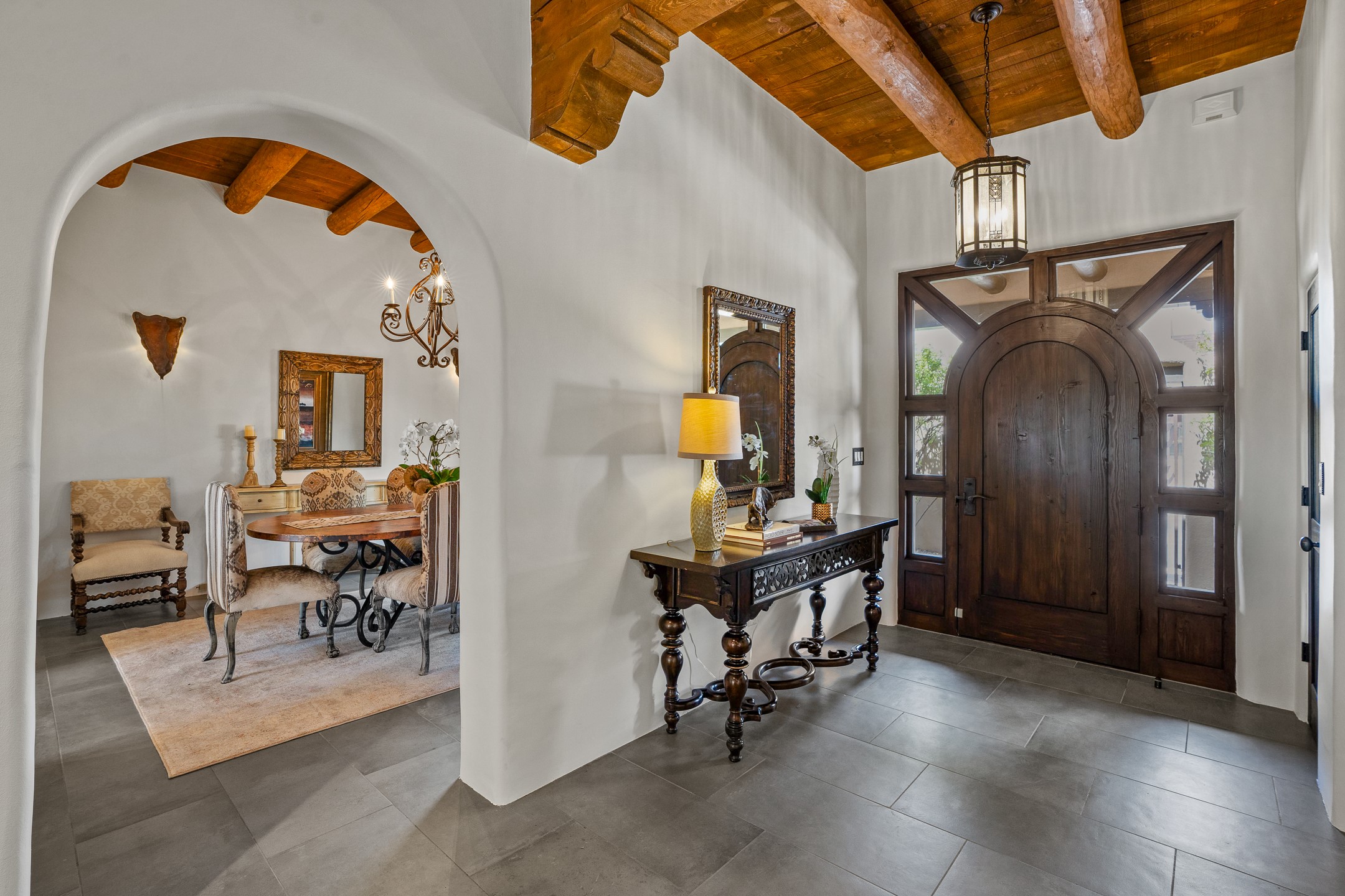 Sometimes, a home just fits. From the moment you step inside 46 E Via Plaza Nueva, it's clear: this isn't a house you have to fix or tolerate or remake, it's a house you can finally live in. Recently reinvented from the ground up, this 3,947-square-foot residence combines classic Pueblo Revival architecture with modern elegance and uncompromising upgrades. Every inch reflects thoughtful design and enduring quality from the brand-new roof and mechanicals to the luxurious Miele kitchen, spa-like baths, and three distinct outdoor patios, each with its own view of the surrounding mountains. The heart of the home is its open living space, anchored by beamed ceilings and twin fireplaces, flooded with light and warmth. The chef's kitchen was designed to be used and loved, with high-end appliances, generous prep space, and a walk-in pantry. The primary suite is a retreat unto itself, with a soaking tub, radiant floors, and light that shifts beautifully throughout the day. Each of the three bedrooms has its own private en suite bath and custom walk-in closet. Whether you're entertaining weekend guests or settling in with family, there's space, privacy, and comfort for everyone. And outside? Three portals sunlit, starlit, and mountain-kissed, invite you to sip, savor, and breathe. Highlights Include: Complete renovation (2019-2022): mechanical systems, roof, finishes, appliances, gorgeous landscaping.3 bedrooms, 3.5 bathrooms, all en suite. Chef's kitchen with Miele appliances and walk-in pantry. Three outdoor patios with expansive mountain views. Radiant floor heat, new HVAC, and energy-efficient systems. Finished 2-car garage. Located in the peaceful Aldea neighborhood with low HOA and quick access to trails. Minutes from downtown Santa Fe, but a world away in peace and quiet.The seller's VA loan is assumable for qualified buyers the rate is 2.625%. You do not have to be a vet to assume it.