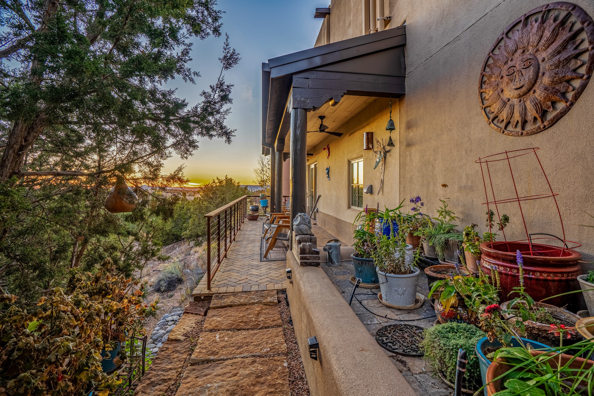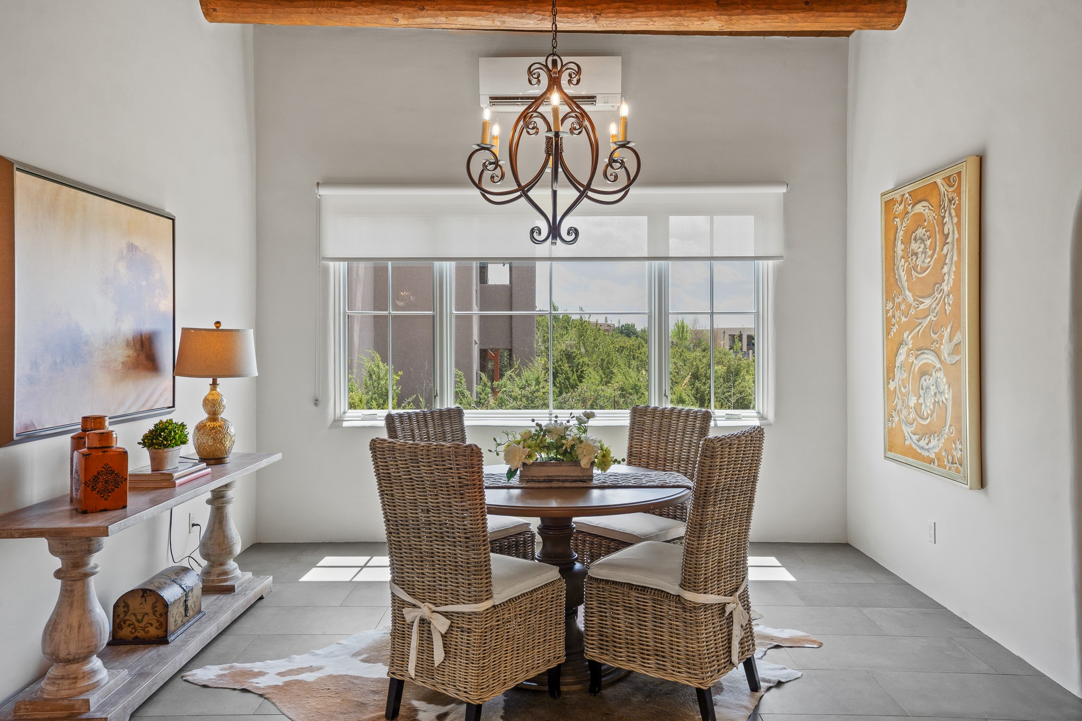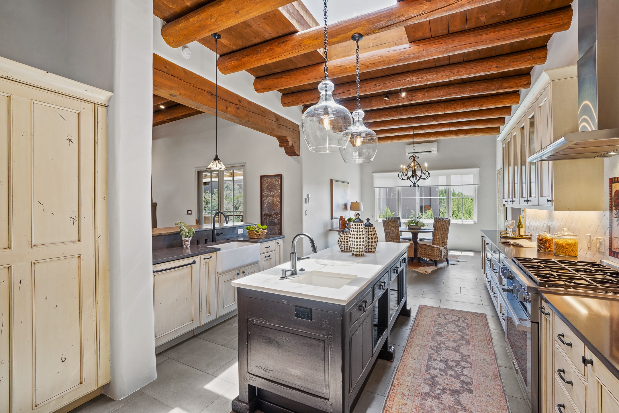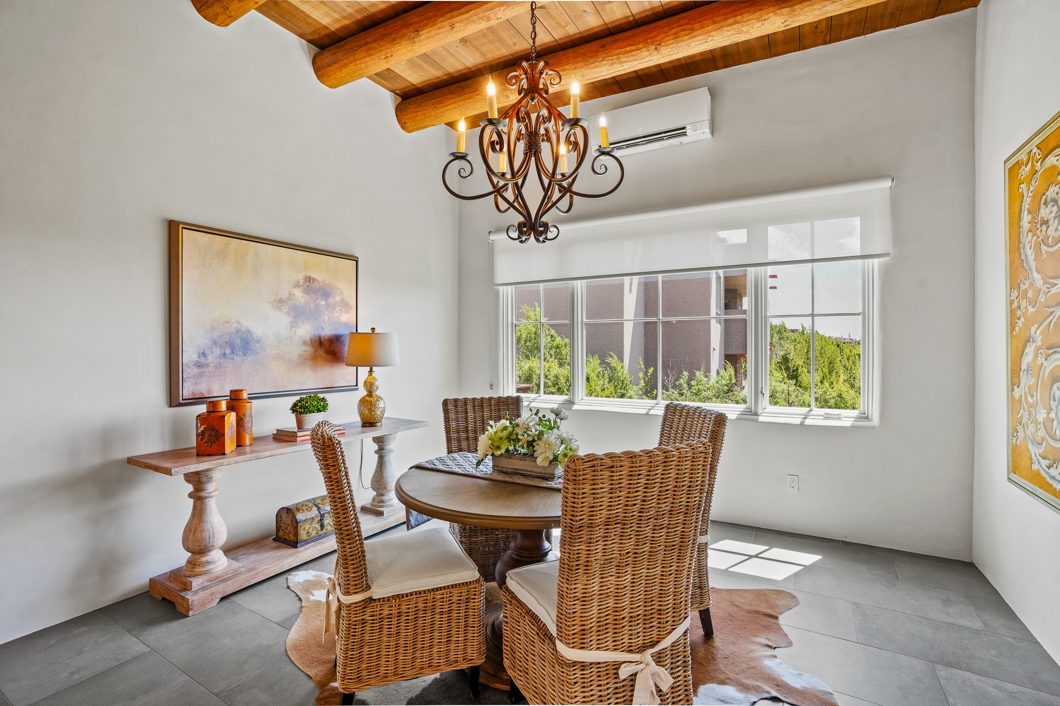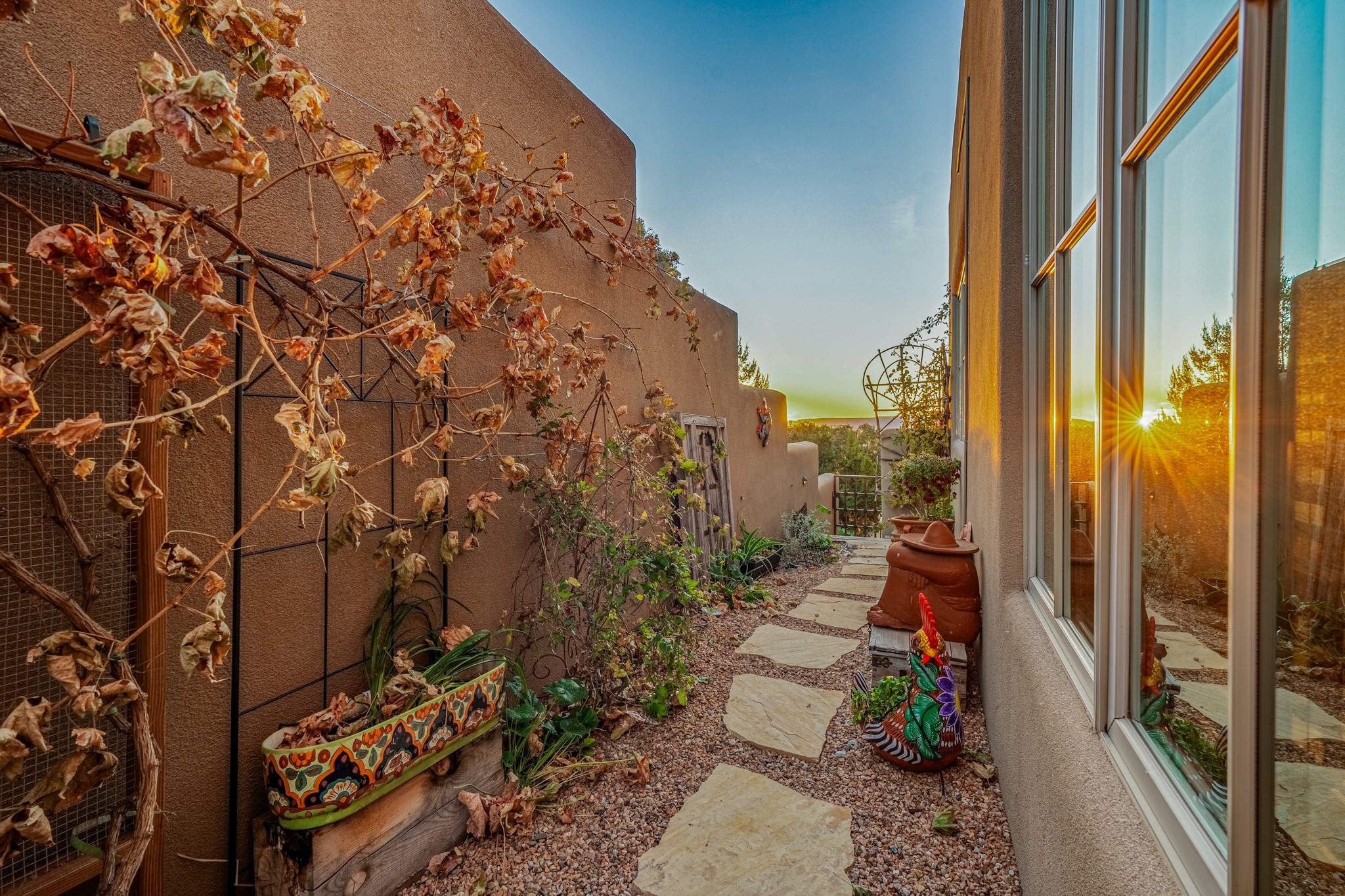 Sometimes, a home just fits. From the moment you step inside 46 E Via Plaza Nueva, it's clear: this isn't a house you have to fix or tolerate or remake, it's a house you can finally live in. Recently reinvented from the ground up, this 3,947-square-foot residence combines classic Pueblo Revival architecture with modern elegance and uncompromising upgrades. Every inch reflects thoughtful design and enduring quality from the brand-new roof and mechanicals to the luxurious Miele kitchen, spa-like baths, and three distinct outdoor patios, each with its own view of the surrounding mountains. The heart of the home is its open living space, anchored by beamed ceilings and twin fireplaces, flooded with light and warmth. The chef's kitchen was designed to be used and loved, with high-end appliances, generous prep space, and a walk-in pantry. The primary suite is a retreat unto itself, with a soaking tub, radiant floors, and light that shifts beautifully throughout the day. Each of the three bedrooms has its own private en suite bath and custom walk-in closet. Whether you're entertaining weekend guests or settling in with family, there's space, privacy, and comfort for everyone. And outside? Three portals sunlit, starlit, and mountain-kissed, invite you to sip, savor, and breathe. Highlights Include: Complete renovation (2019-2022): mechanical systems, roof, finishes, appliances, gorgeous landscaping.3 bedrooms, 3.5 bathrooms, all en suite. Chef's kitchen with Miele appliances and walk-in pantry. Three outdoor patios with expansive mountain views. Radiant floor heat, new HVAC, and energy-efficient systems. Finished 2-car garage. Located in the peaceful Aldea neighborhood with low HOA and quick access to trails. Minutes from downtown Santa Fe, but a world away in peace and quiet.The seller's VA loan is assumable for qualified buyers the rate is 2.625%. You do not have to be a vet to assume it.