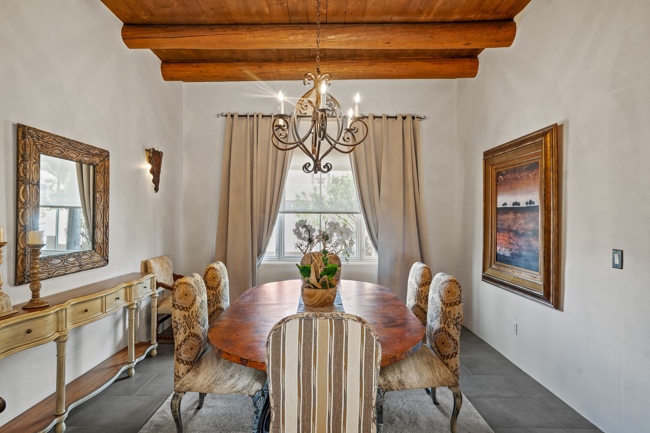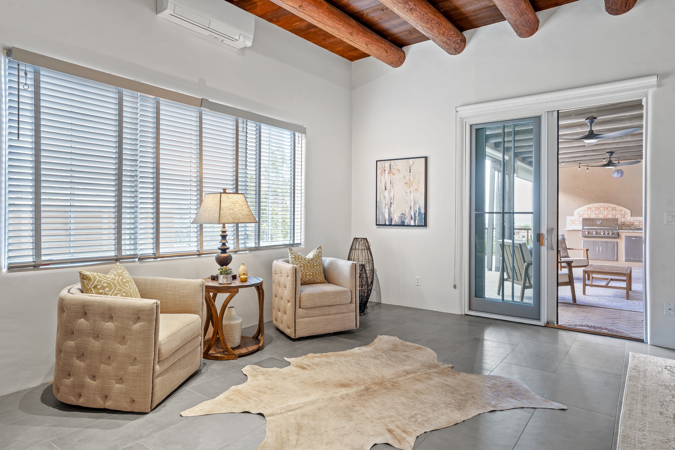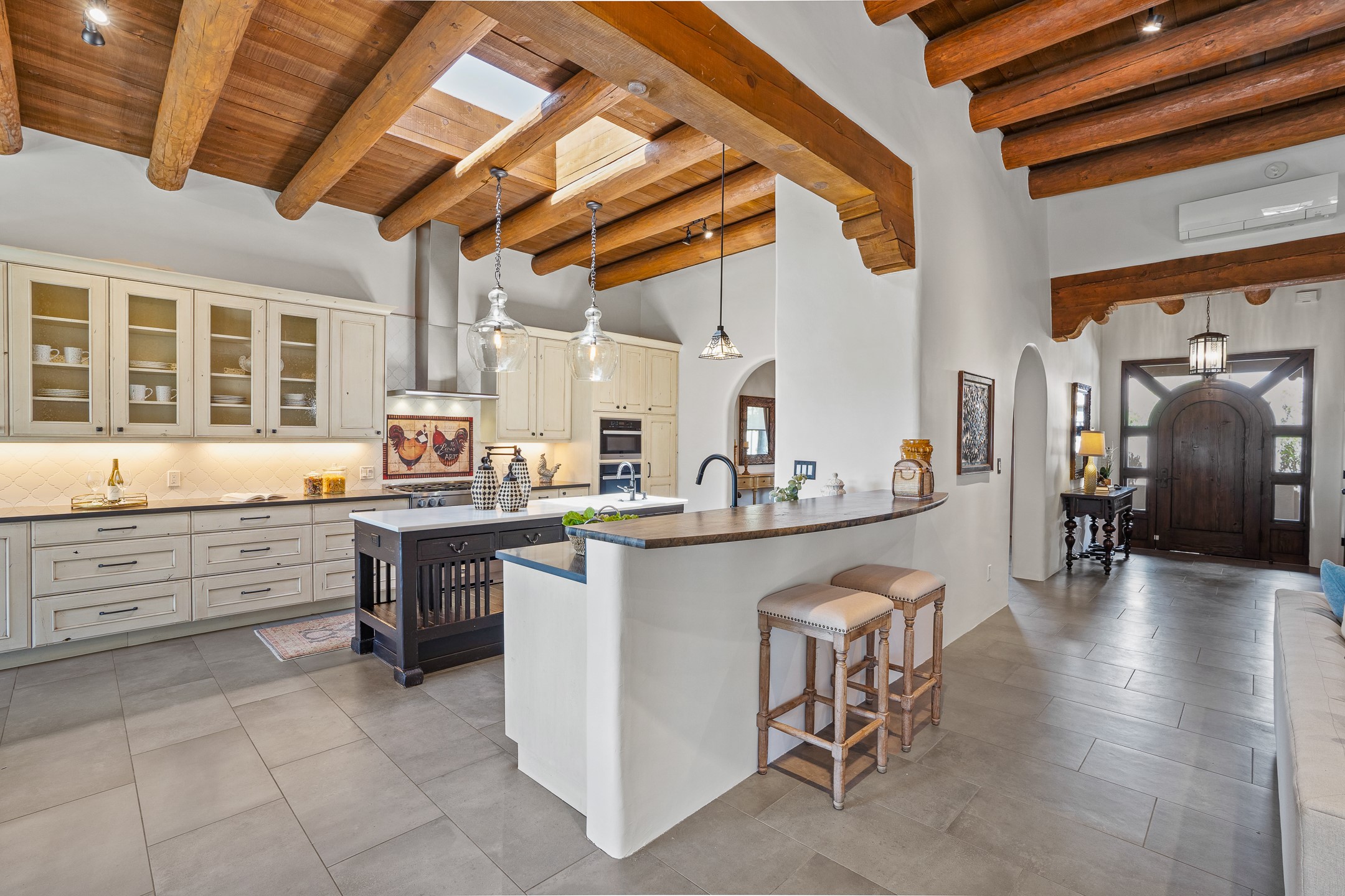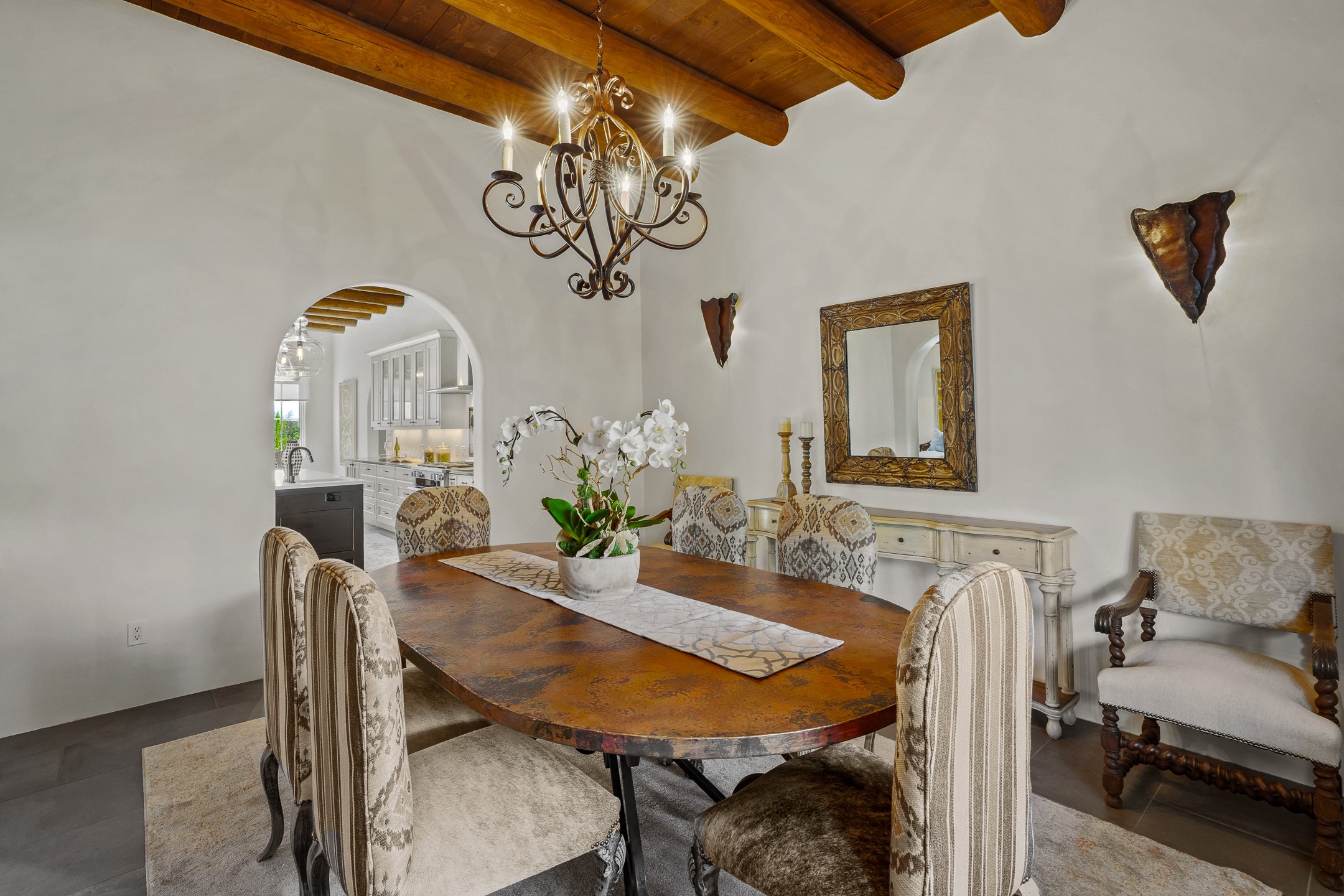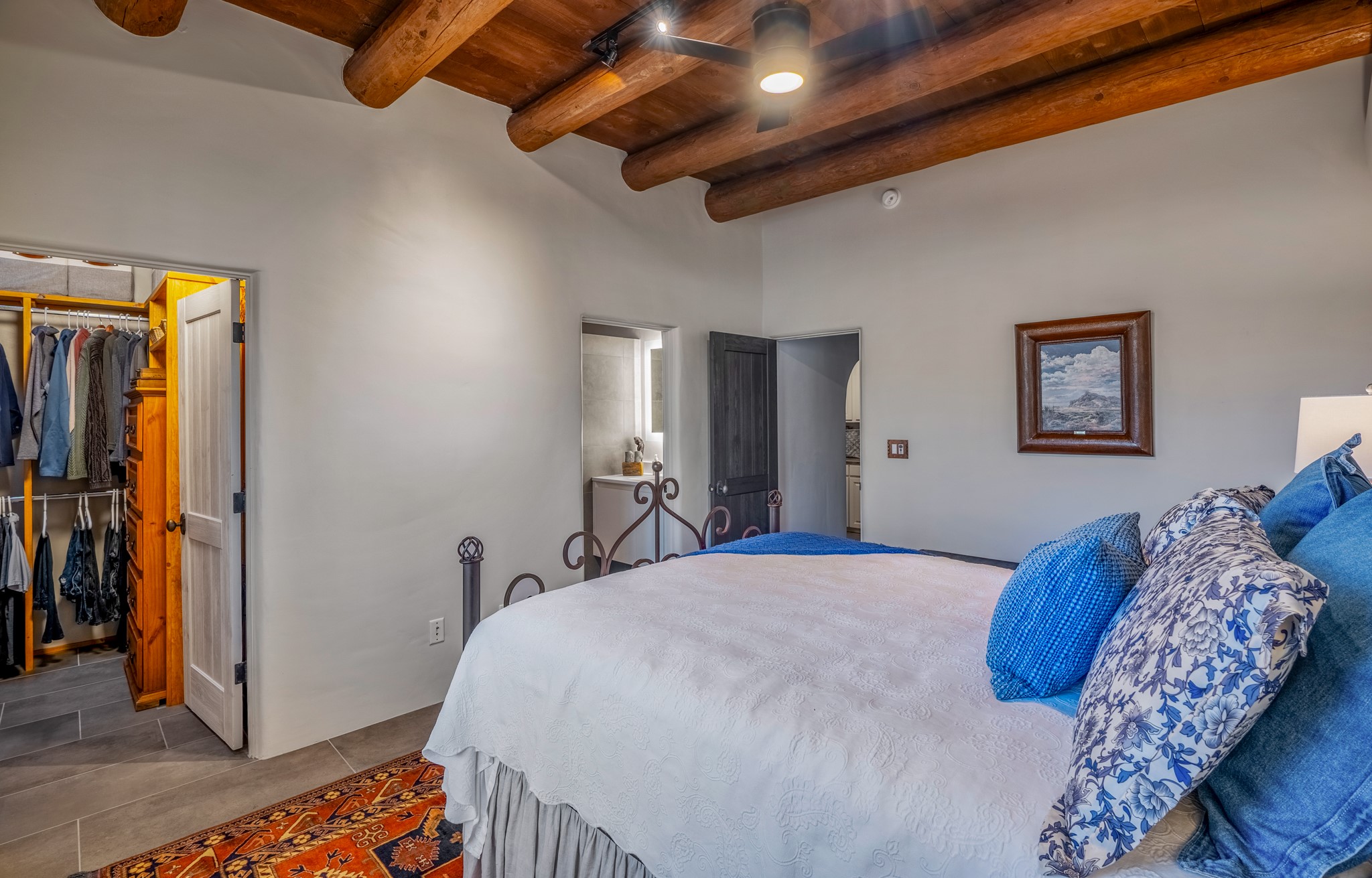 Sometimes, a home just fits. From the moment you step inside 46 E Via Plaza Nueva, it's clear: this isn't a house you have to fix or tolerate or remake, it's a house you can finally live in. Recently reinvented from the ground up, this 3,947-square-foot residence combines classic Pueblo Revival architecture with modern elegance and uncompromising upgrades. Every inch reflects thoughtful design and enduring quality from the brand-new roof and mechanicals to the luxurious Miele kitchen, spa-like baths, and three distinct outdoor patios, each with its own view of the surrounding mountains. The heart of the home is its open living space, anchored by beamed ceilings and twin fireplaces, flooded with light and warmth. The chef's kitchen was designed to be used and loved, with high-end appliances, generous prep space, and a walk-in pantry. The primary suite is a retreat unto itself, with a soaking tub, radiant floors, and light that shifts beautifully throughout the day. Each of the three bedrooms has its own private en suite bath and custom walk-in closet. Whether you're entertaining weekend guests or settling in with family, there's space, privacy, and comfort for everyone. And outside? Three portals sunlit, starlit, and mountain-kissed, invite you to sip, savor, and breathe. Highlights Include: Complete renovation (2019-2022): mechanical systems, roof, finishes, appliances, gorgeous landscaping.3 bedrooms, 3.5 bathrooms, all en suite. Chef's kitchen with Miele appliances and walk-in pantry. Three outdoor patios with expansive mountain views. Radiant floor heat, new HVAC, and energy-efficient systems. Finished 2-car garage. Located in the peaceful Aldea neighborhood with low HOA and quick access to trails. Minutes from downtown Santa Fe, but a world away in peace and quiet.The seller's VA loan is assumable for qualified buyers the rate is 2.625%. You do not have to be a vet to assume it.