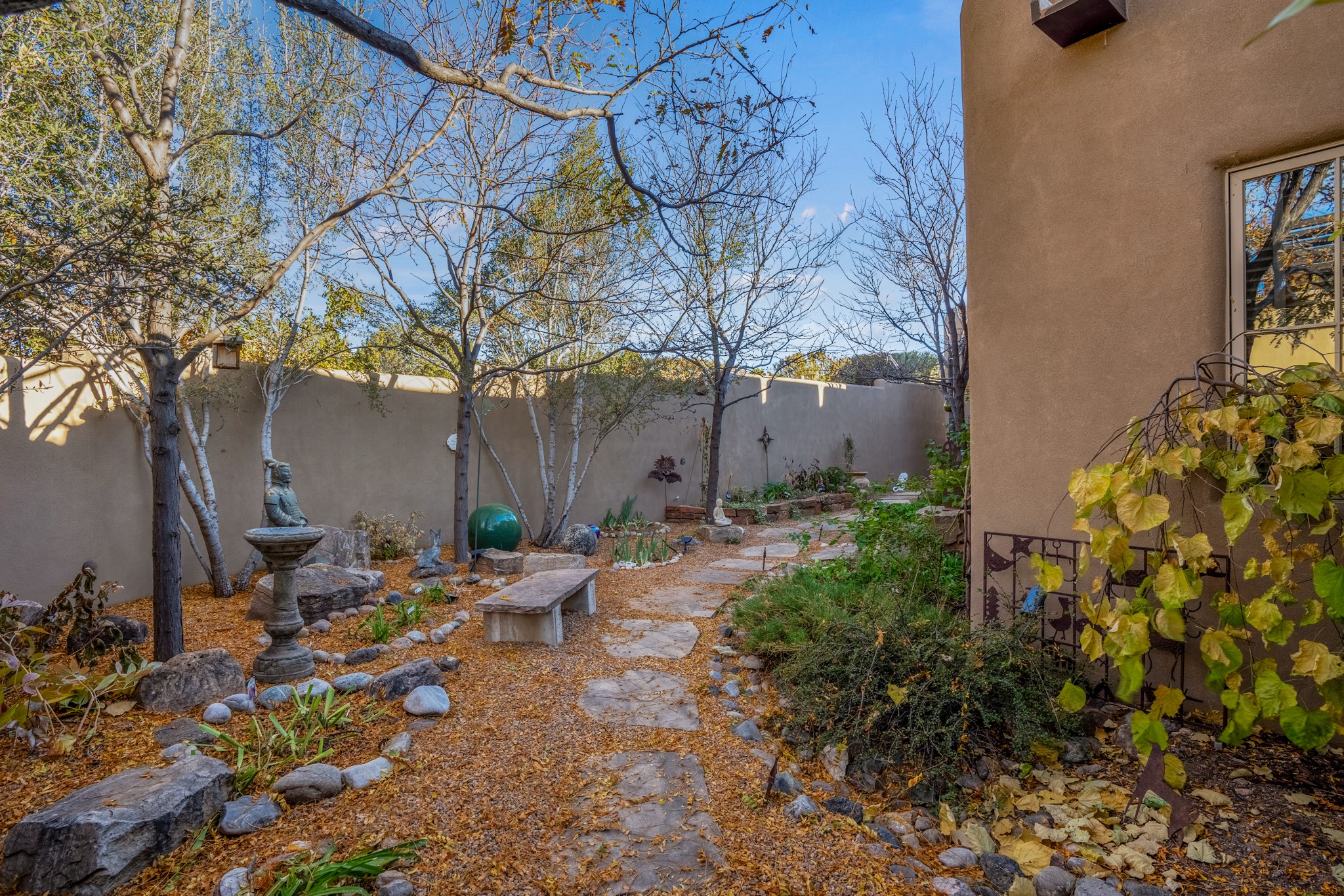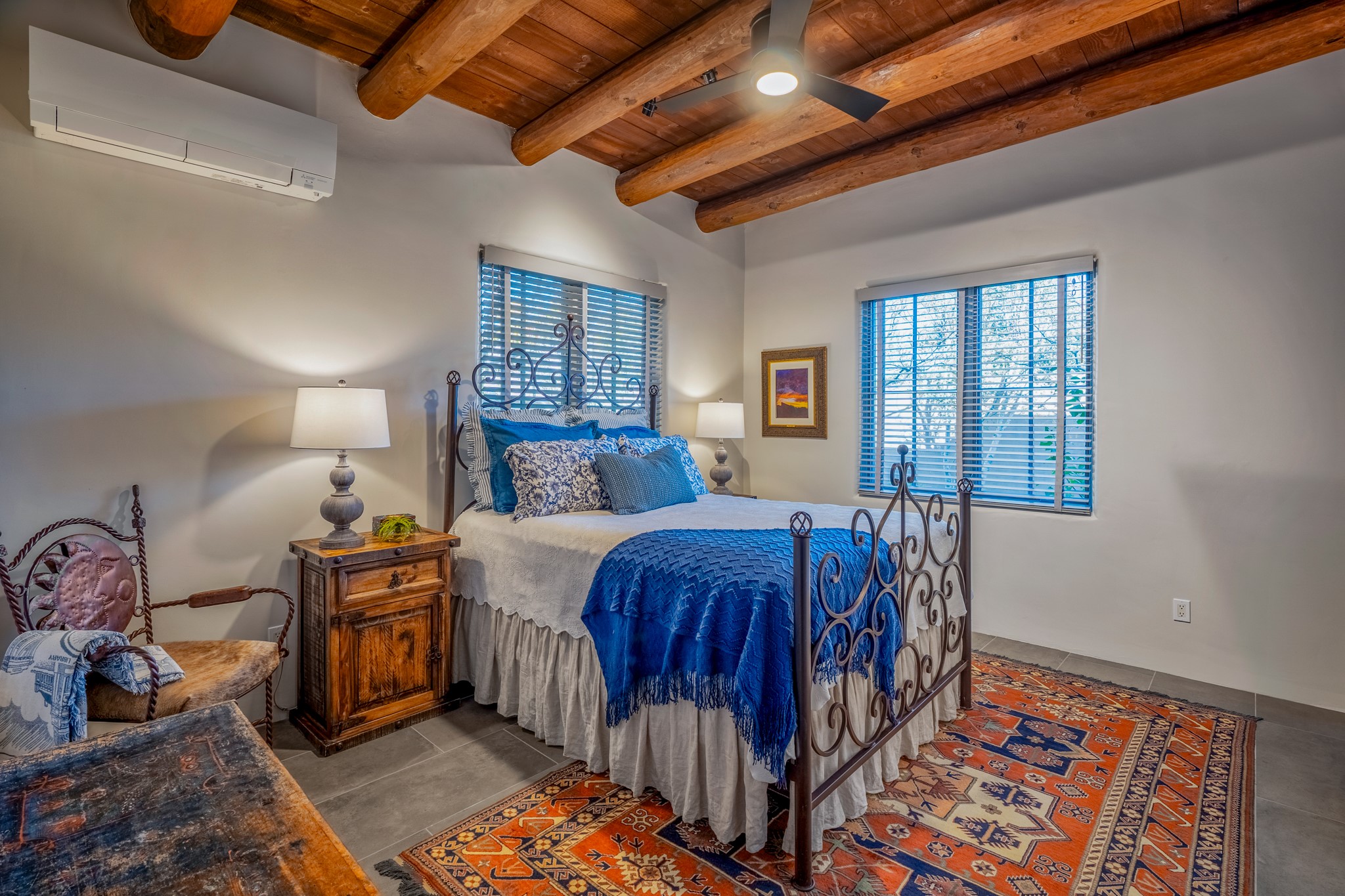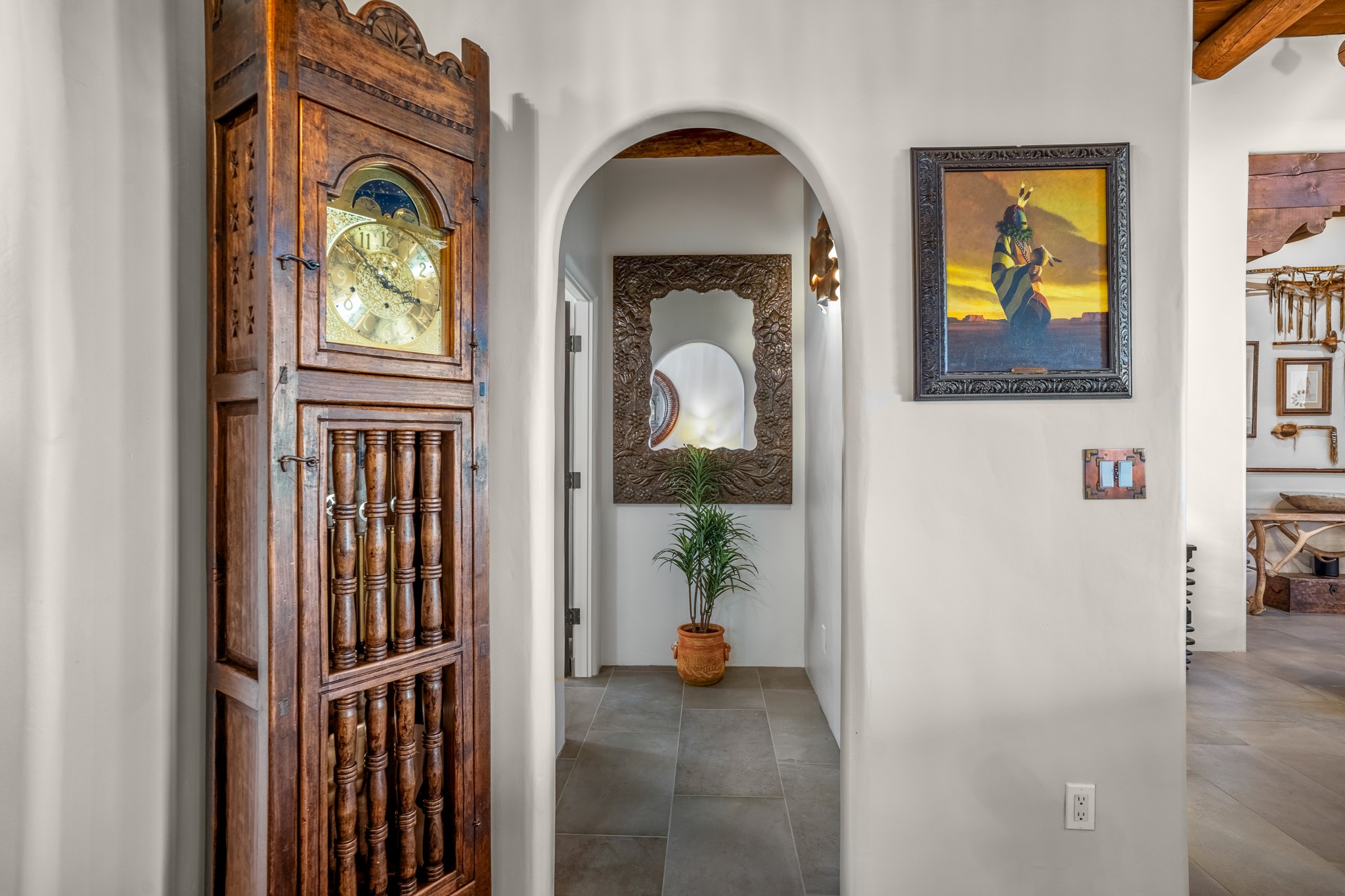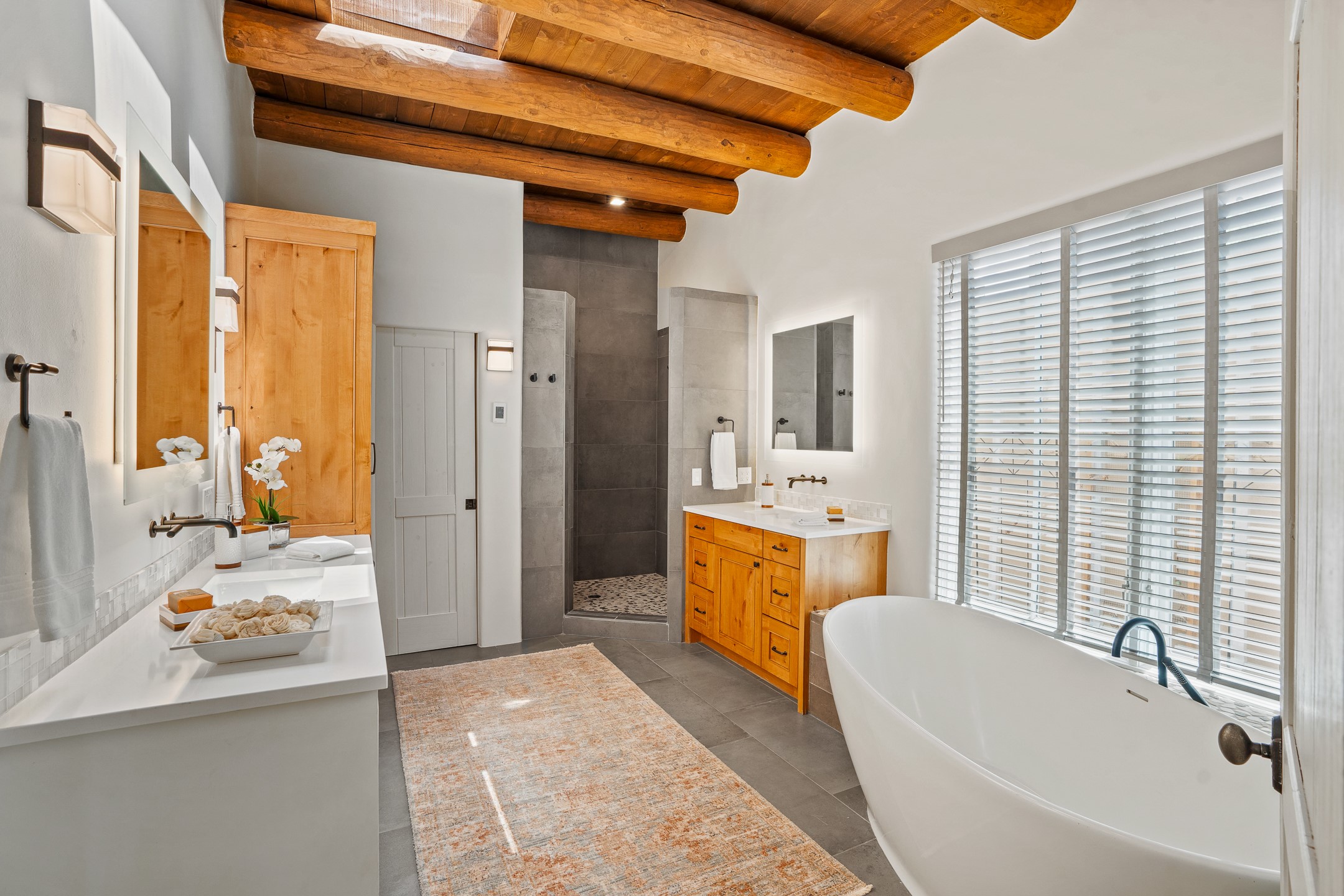 Sometimes, a home just fits. From the moment you step inside 46 E Via Plaza Nueva, it's clear: this isn't a house you have to fix or tolerate or remake, it's a house you can finally live in. Recently reinvented from the ground up, this 3,947-square-foot residence combines classic Pueblo Revival architecture with modern elegance and uncompromising upgrades. Every inch reflects thoughtful design and enduring quality from the brand-new roof and mechanicals to the luxurious Miele kitchen, spa-like baths, and three distinct outdoor patios, each with its own view of the surrounding mountains. The heart of the home is its open living space, anchored by beamed ceilings and twin fireplaces, flooded with light and warmth. The chef's kitchen was designed to be used and loved, with high-end appliances, generous prep space, and a walk-in pantry. The primary suite is a retreat unto itself, with a soaking tub, radiant floors, and light that shifts beautifully throughout the day. Each of the three bedrooms has its own private en suite bath and custom walk-in closet. Whether you're entertaining weekend guests or settling in with family, there's space, privacy, and comfort for everyone. And outside? Three portals sunlit, starlit, and mountain-kissed, invite you to sip, savor, and breathe. Highlights Include: Complete renovation (2019-2022): mechanical systems, roof, finishes, appliances, gorgeous landscaping.3 bedrooms, 3.5 bathrooms, all en suite. Chef's kitchen with Miele appliances and walk-in pantry. Three outdoor patios with expansive mountain views. Radiant floor heat, new HVAC, and energy-efficient systems. Finished 2-car garage. Located in the peaceful Aldea neighborhood with low HOA and quick access to trails. Minutes from downtown Santa Fe, but a world away in peace and quiet.The seller's VA loan is assumable for qualified buyers the rate is 2.625%. You do not have to be a vet to assume it.