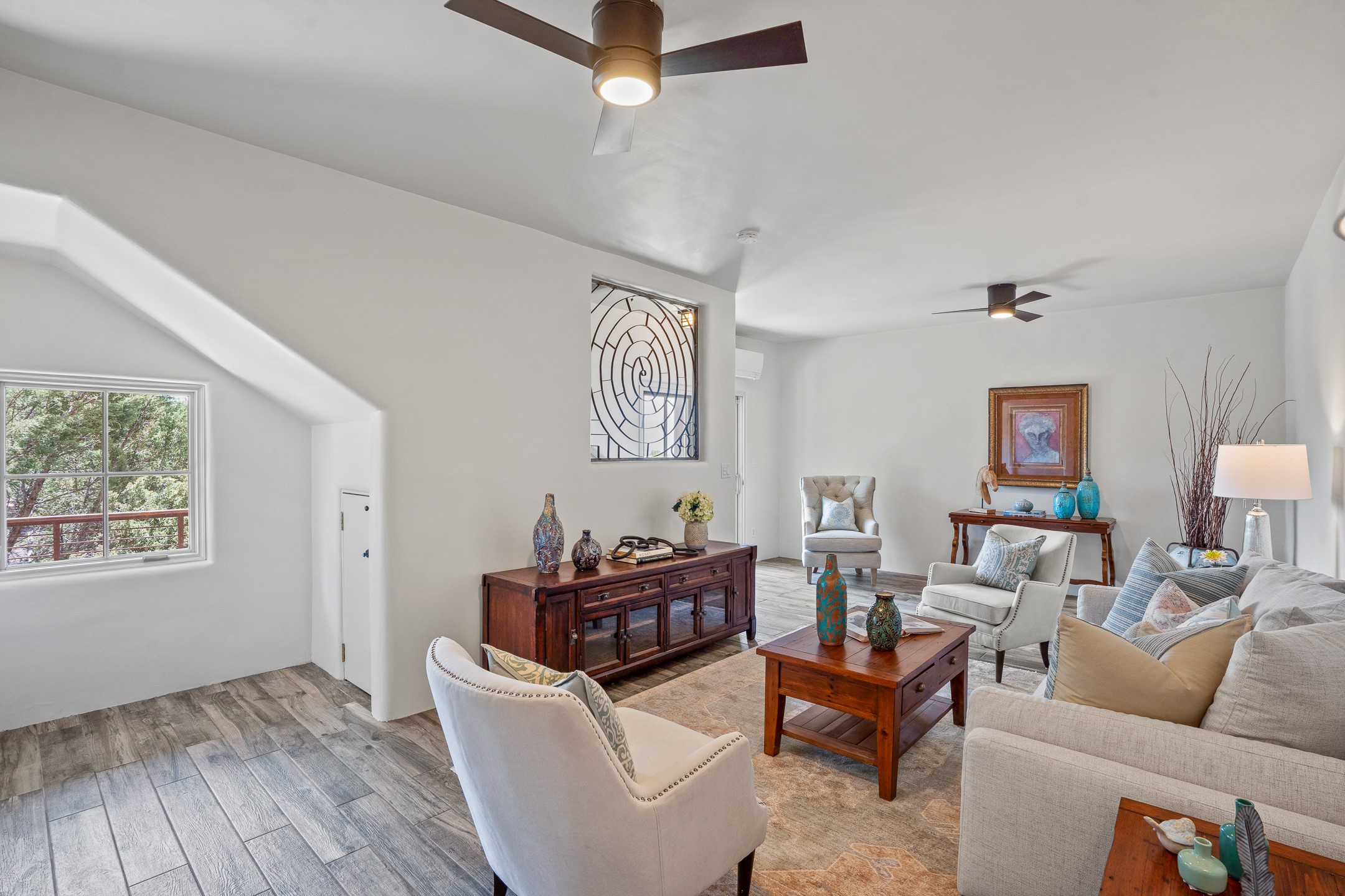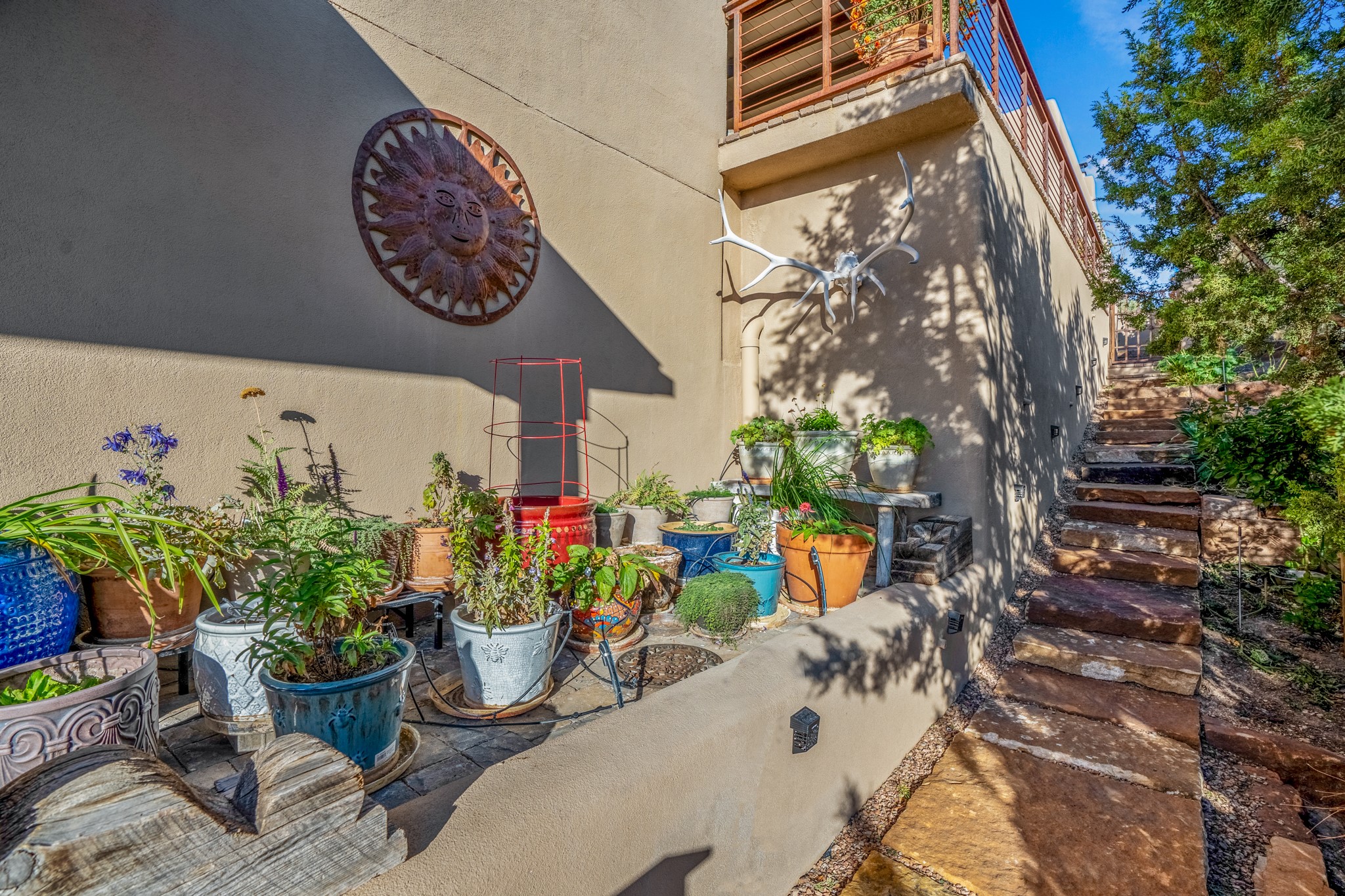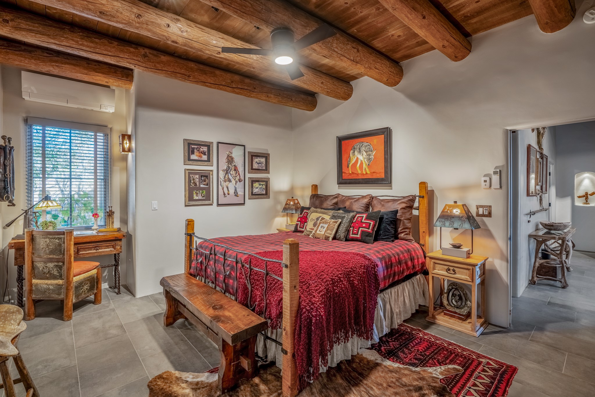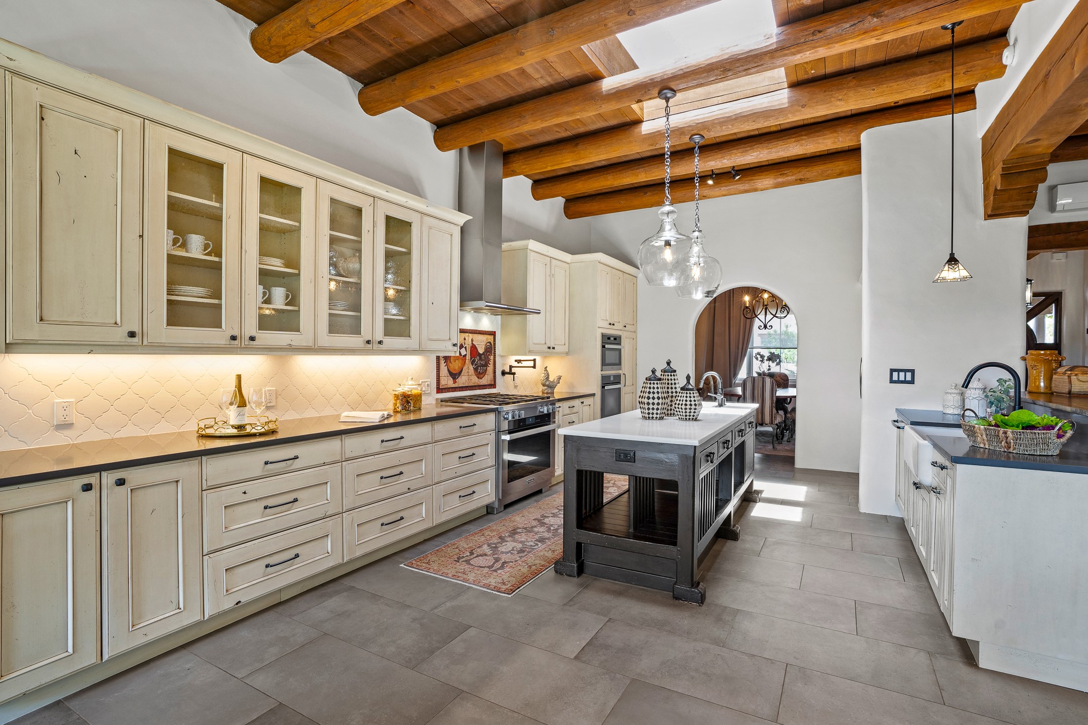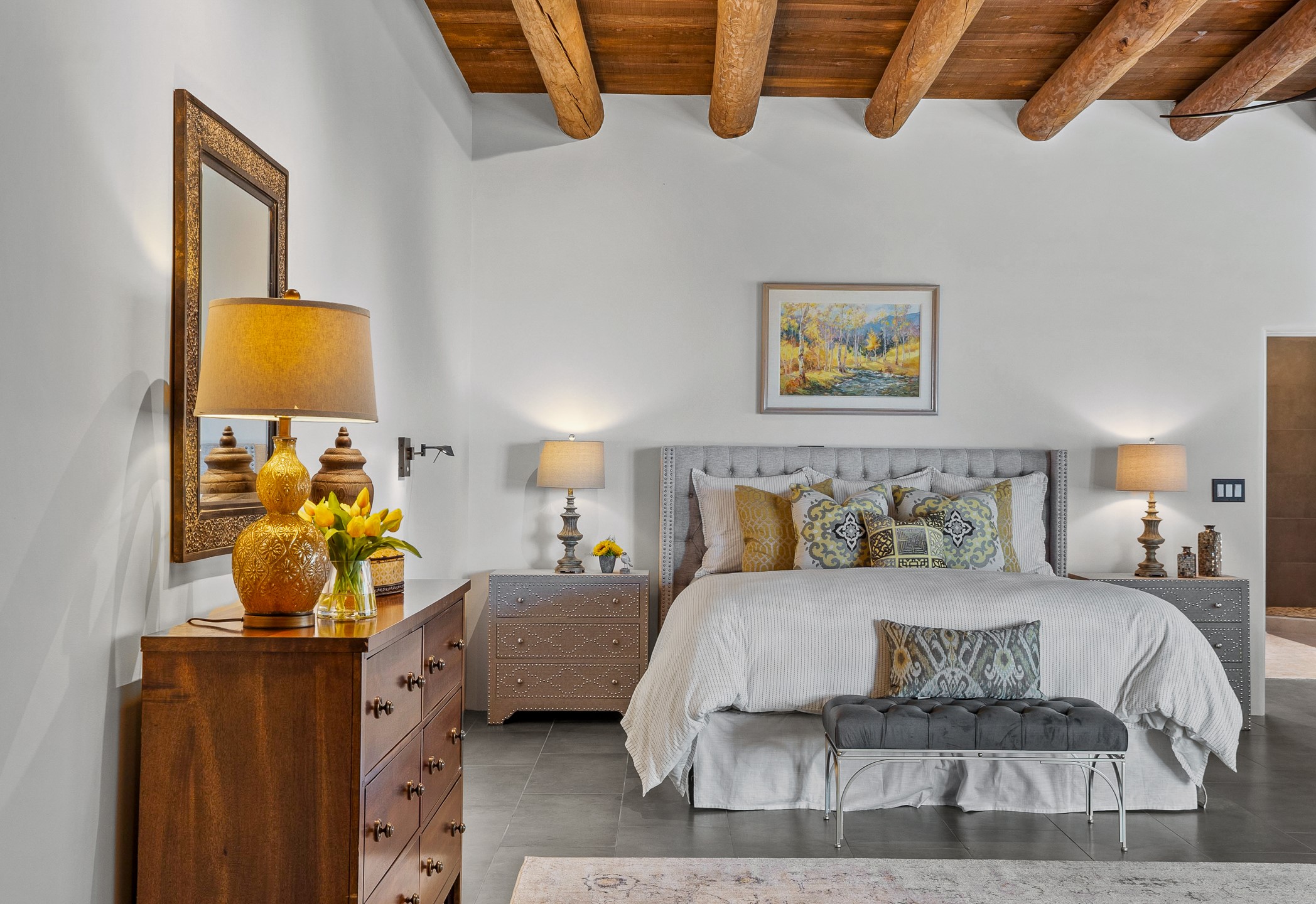 Sometimes, a home just fits. From the moment you step inside 46 E Via Plaza Nueva, it's clear: this isn't a house you have to fix or tolerate or remake, it's a house you can finally live in. Recently reinvented from the ground up, this 3,947-square-foot residence combines classic Pueblo Revival architecture with modern elegance and uncompromising upgrades. Every inch reflects thoughtful design and enduring quality from the brand-new roof and mechanicals to the luxurious Miele kitchen, spa-like baths, and three distinct outdoor patios, each with its own view of the surrounding mountains. The heart of the home is its open living space, anchored by beamed ceilings and twin fireplaces, flooded with light and warmth. The chef's kitchen was designed to be used and loved, with high-end appliances, generous prep space, and a walk-in pantry. The primary suite is a retreat unto itself, with a soaking tub, radiant floors, and light that shifts beautifully throughout the day. Each of the three bedrooms has its own private en suite bath and custom walk-in closet. Whether you're entertaining weekend guests or settling in with family, there's space, privacy, and comfort for everyone. And outside? Three portals sunlit, starlit, and mountain-kissed, invite you to sip, savor, and breathe. Highlights Include: Complete renovation (2019-2022): mechanical systems, roof, finishes, appliances, gorgeous landscaping.3 bedrooms, 3.5 bathrooms, all en suite. Chef's kitchen with Miele appliances and walk-in pantry. Three outdoor patios with expansive mountain views. Radiant floor heat, new HVAC, and energy-efficient systems. Finished 2-car garage. Located in the peaceful Aldea neighborhood with low HOA and quick access to trails. Minutes from downtown Santa Fe, but a world away in peace and quiet.The seller's VA loan is assumable for qualified buyers the rate is 2.625%. You do not have to be a vet to assume it.