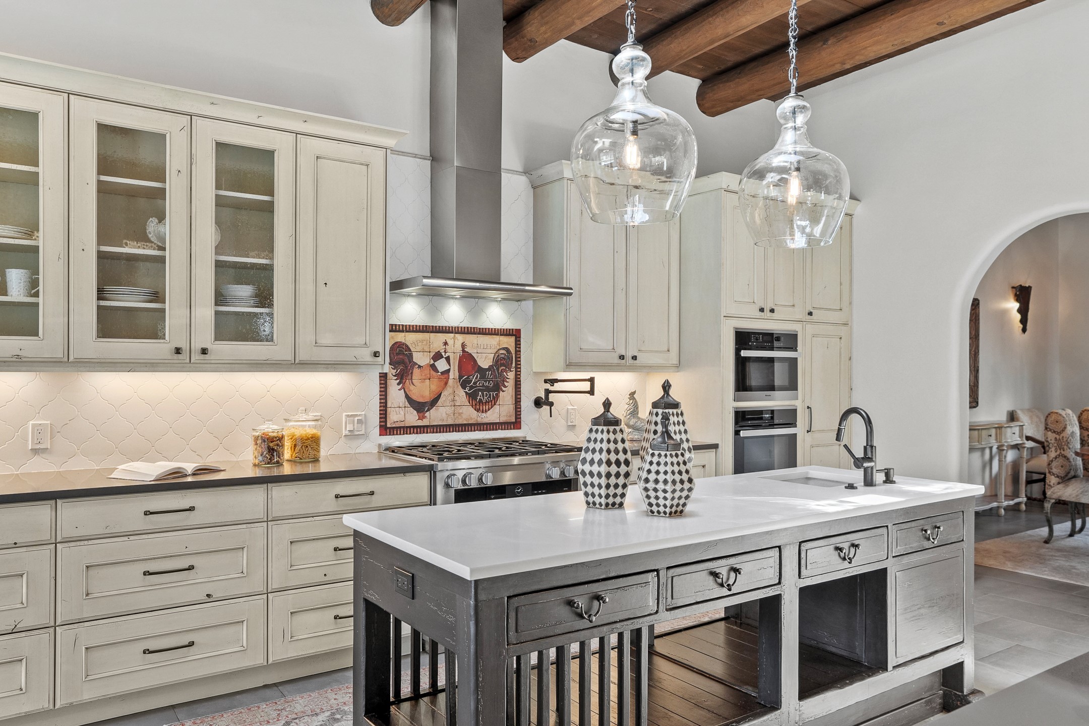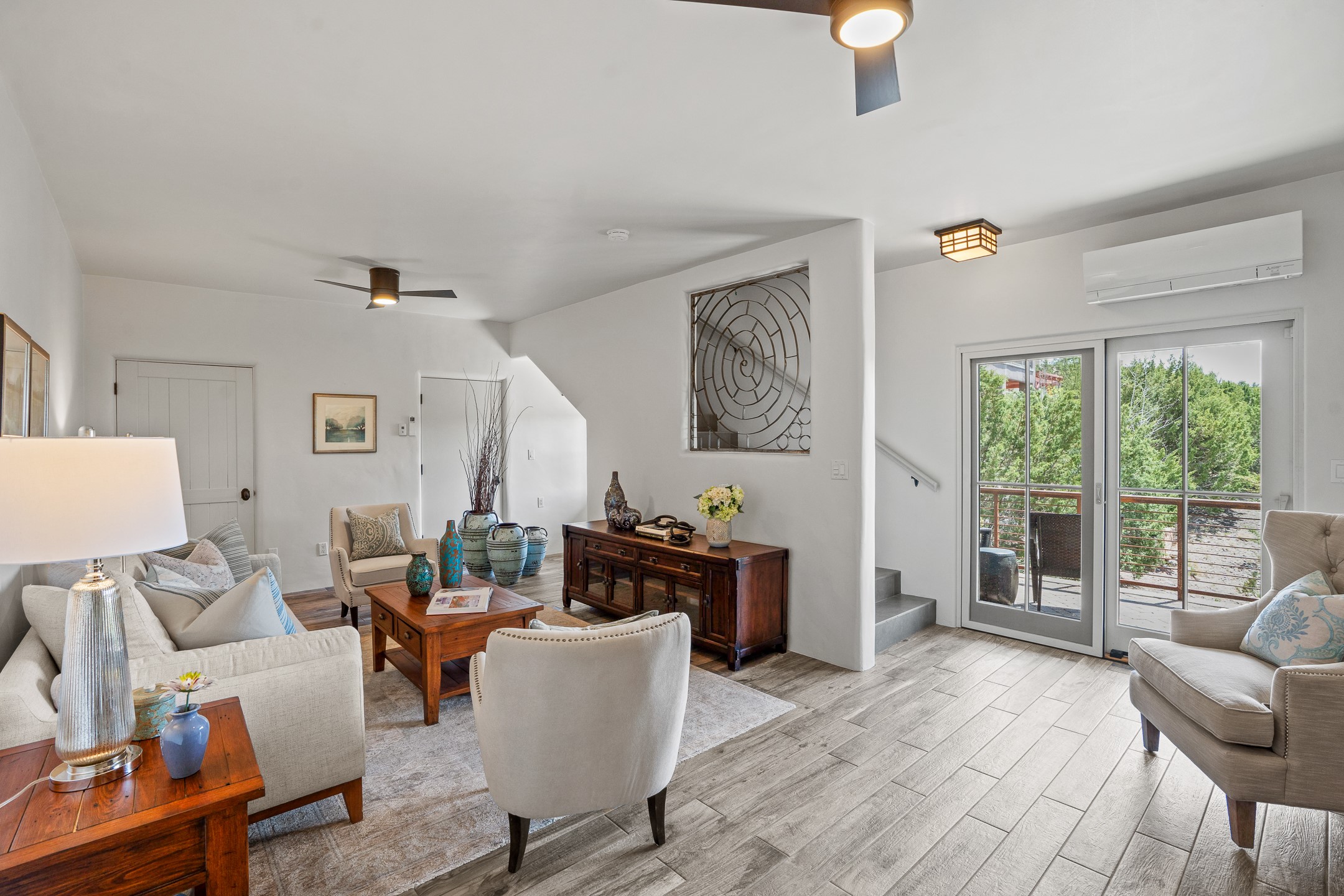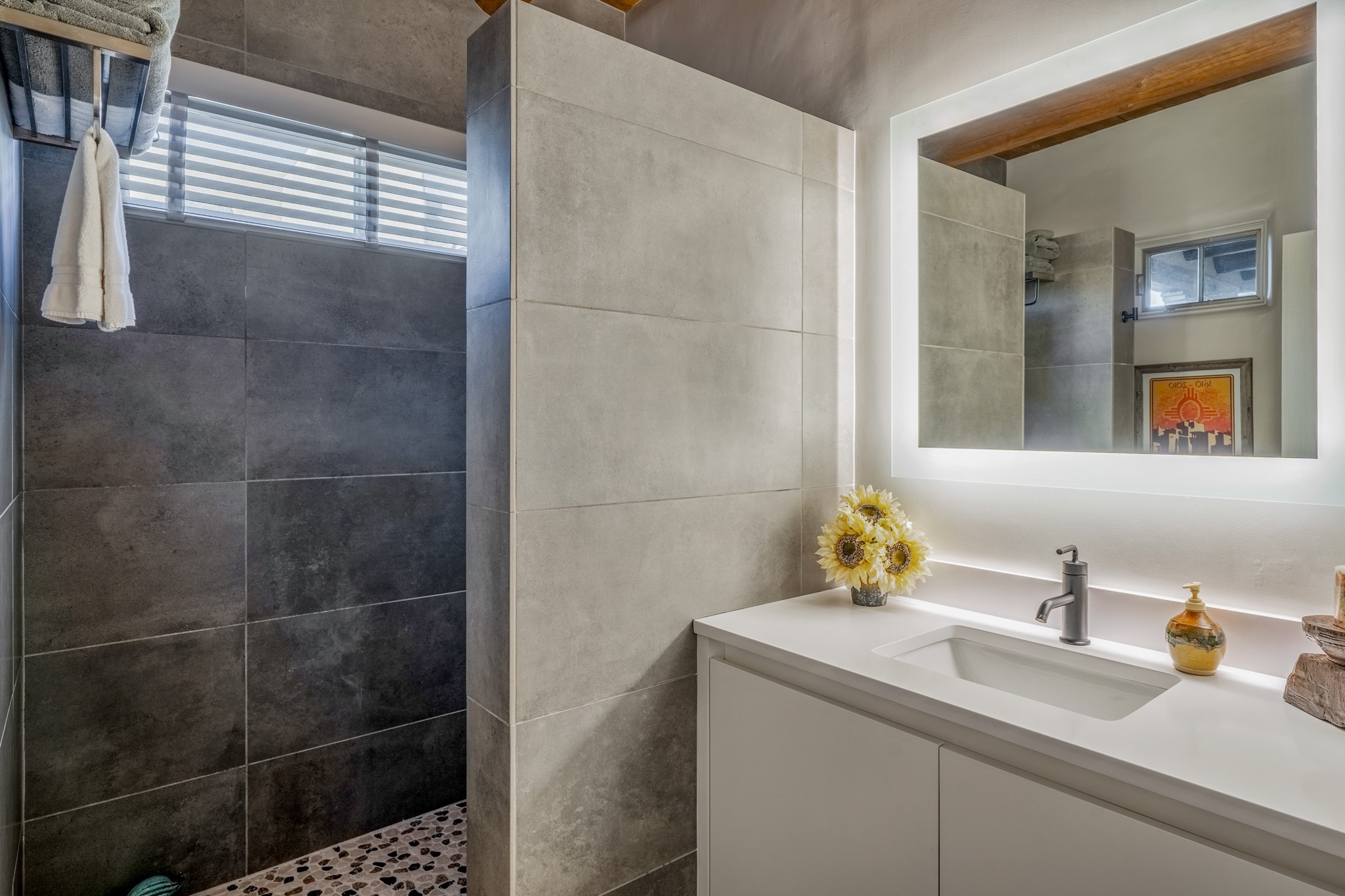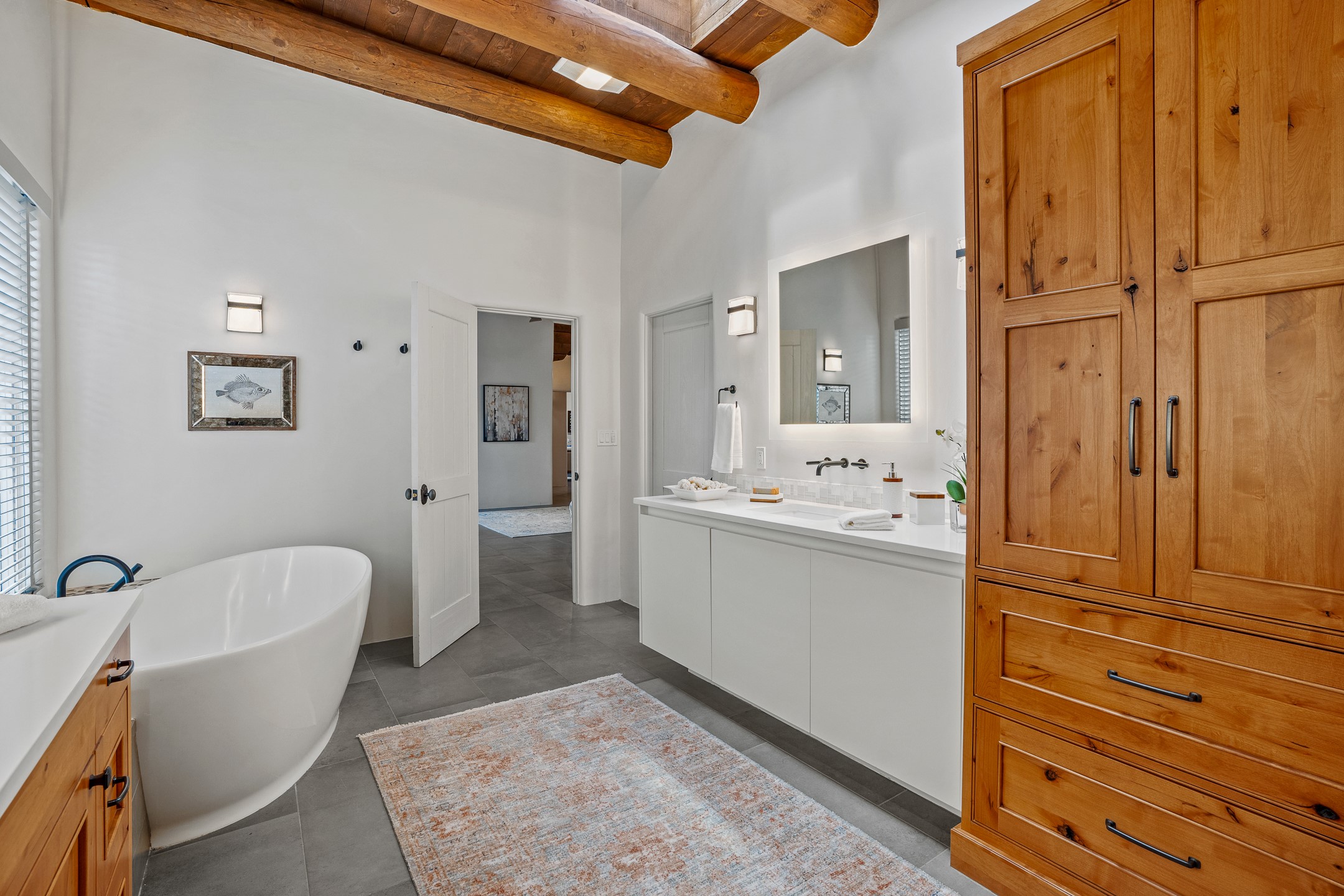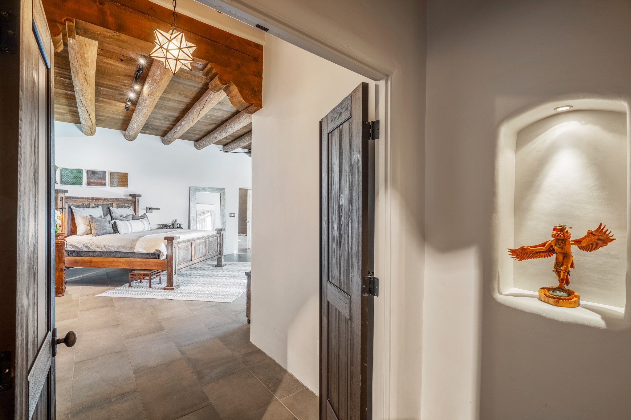 Sometimes, a home just fits. From the moment you step inside 46 E Via Plaza Nueva, it's clear: this isn't a house you have to fix or tolerate or remake, it's a house you can finally live in. Recently reinvented from the ground up, this 3,947-square-foot residence combines classic Pueblo Revival architecture with modern elegance and uncompromising upgrades. Every inch reflects thoughtful design and enduring quality from the brand-new roof and mechanicals to the luxurious Miele kitchen, spa-like baths, and three distinct outdoor patios, each with its own view of the surrounding mountains. The heart of the home is its open living space, anchored by beamed ceilings and twin fireplaces, flooded with light and warmth. The chef's kitchen was designed to be used and loved, with high-end appliances, generous prep space, and a walk-in pantry. The primary suite is a retreat unto itself, with a soaking tub, radiant floors, and light that shifts beautifully throughout the day. Each of the three bedrooms has its own private en suite bath and custom walk-in closet. Whether you're entertaining weekend guests or settling in with family, there's space, privacy, and comfort for everyone. And outside? Three portals sunlit, starlit, and mountain-kissed, invite you to sip, savor, and breathe. Highlights Include: Complete renovation (2019-2022): mechanical systems, roof, finishes, appliances, gorgeous landscaping.3 bedrooms, 3.5 bathrooms, all en suite. Chef's kitchen with Miele appliances and walk-in pantry. Three outdoor patios with expansive mountain views. Radiant floor heat, new HVAC, and energy-efficient systems. Finished 2-car garage. Located in the peaceful Aldea neighborhood with low HOA and quick access to trails. Minutes from downtown Santa Fe, but a world away in peace and quiet.The seller's VA loan is assumable for qualified buyers the rate is 2.625%. You do not have to be a vet to assume it.