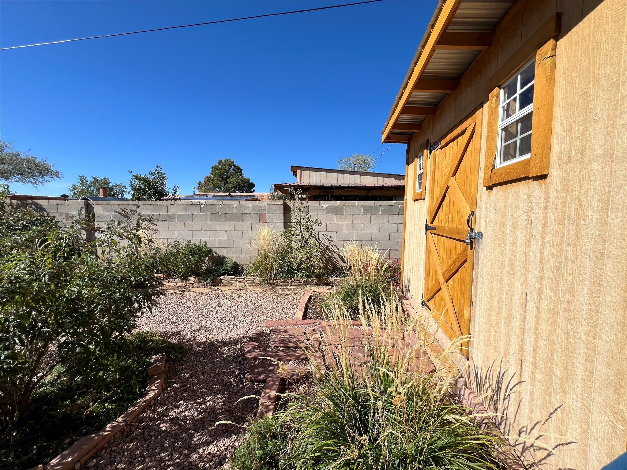 A beautiful 3 bedroom 2 bath house with both wood flooring and tile through out. Two fireplaces the warm space; one fire place insert in the great room and one traditional Kiva in the den. The den is complete with stunning vigas across the ceiling. An open kitchen, home office, and covered patio add to the appeal of the home. Stainless steel appliances throughout the house. There is a new roof scheduled to be installed with transferable warranty. The home is located on a great lot with beautiful landscaping and an additional storage shed in the back yard.