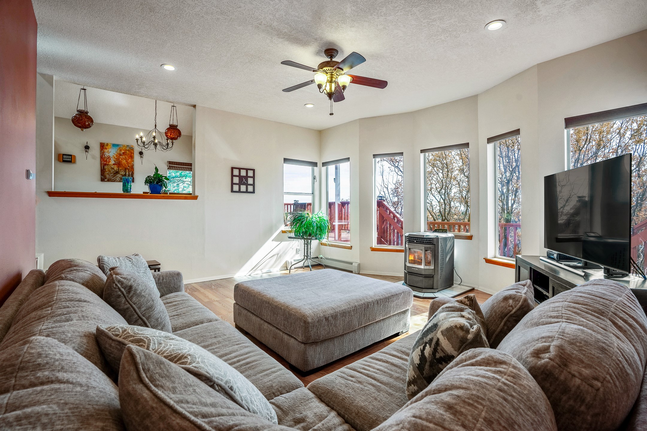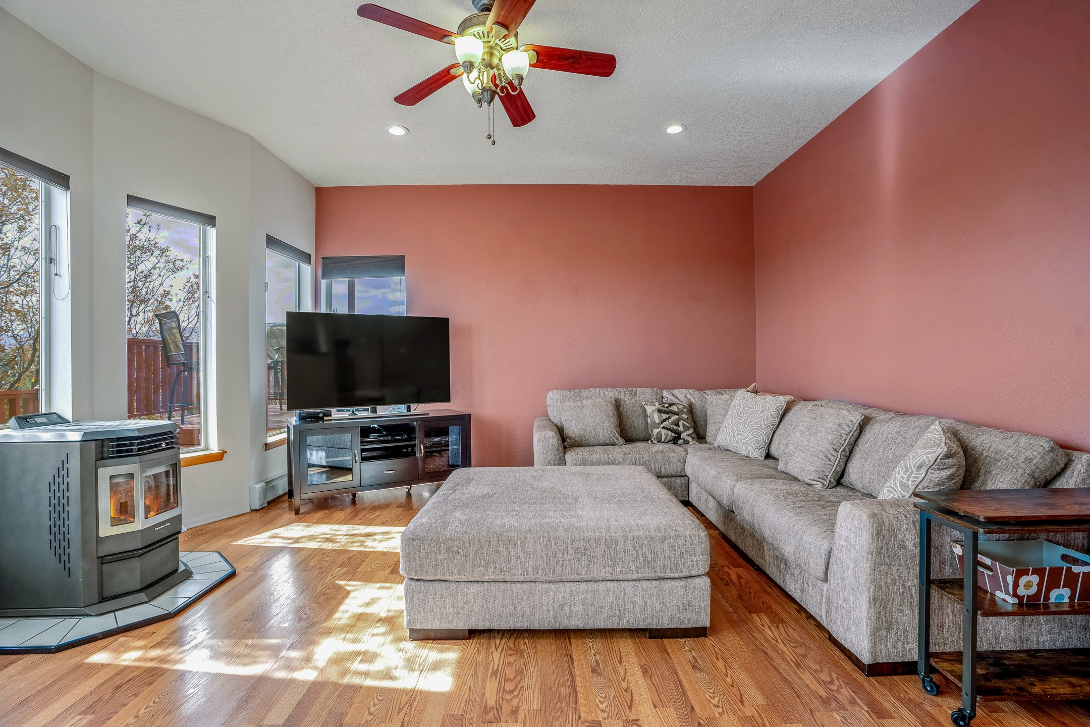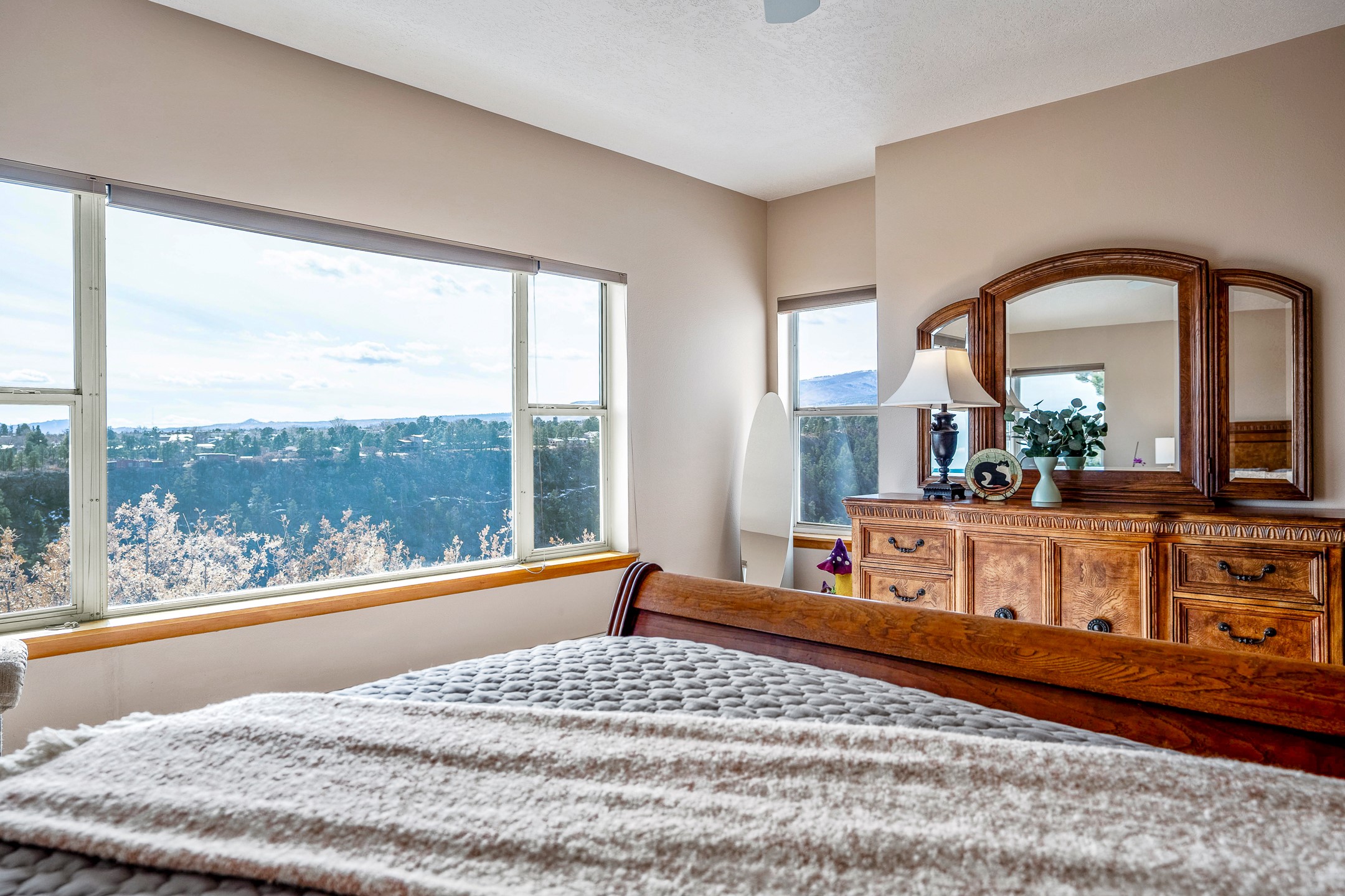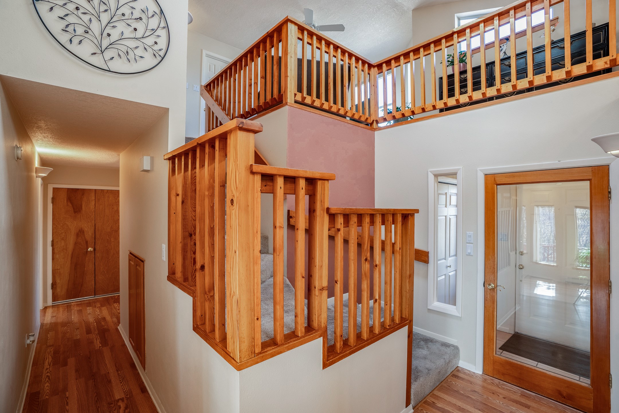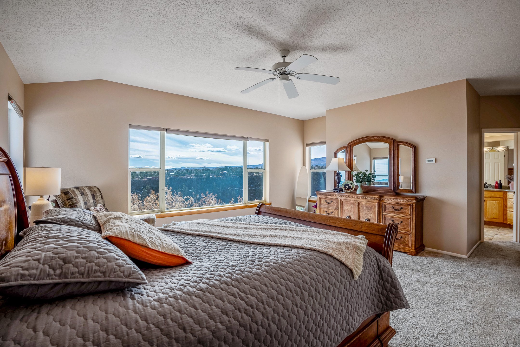 Beautiful Canyon Lot, 3 Bed, 2.5 Bath, Home Office, Lofted Ceilings, 2 Car Garage, Amazing Views, and More! Welcome to 831 Scott Way! The 3-bedroom home is perched on the side of the canyon on North Mesa and offers a great floor plan and phenomenal views of Los Alamos and the Jemez Mountains. As you enter, you are greeted by cathedral ceilings, open living spaces, and an abundance of natural light. The kitchen features generous cabinet space, gas cooking, a prep island, and peninsula bar seating... a perfect set-up for cooking gourmet meals while entertaining guests! The dining area has great views of the canyon and seamlessly flows onto the spacious balcony where you can enjoy sunrise views of the Sangre de Cristos, as well as sunset views of the Jemez Mountains. Adjacent to the dining area is a living room space with south facing windows and a pellet stove to keep you cozy in the winter. Two spacious guest bedrooms and a full bath round out the first floor. At the top of the stairs on the second level, you are greeted by an open loft, perfect for your home office or additional living space, along with a powder room for convenience. The primary suite is situated on the second floor to take advantage of the views, and includes panoramic windows overlooking the canyon, a walk-in closet, and a large bathroom. The bathroom features dual vanities, a shower, and a jetted tub with windows providing a great view while you enjoy a good soak after a long day in the mountains. The garage will accommodate two vehicles and includes built-in shelved storage. This great property will sell quickly, so schedule your showing today so you don't miss out on your chance to own this gem!