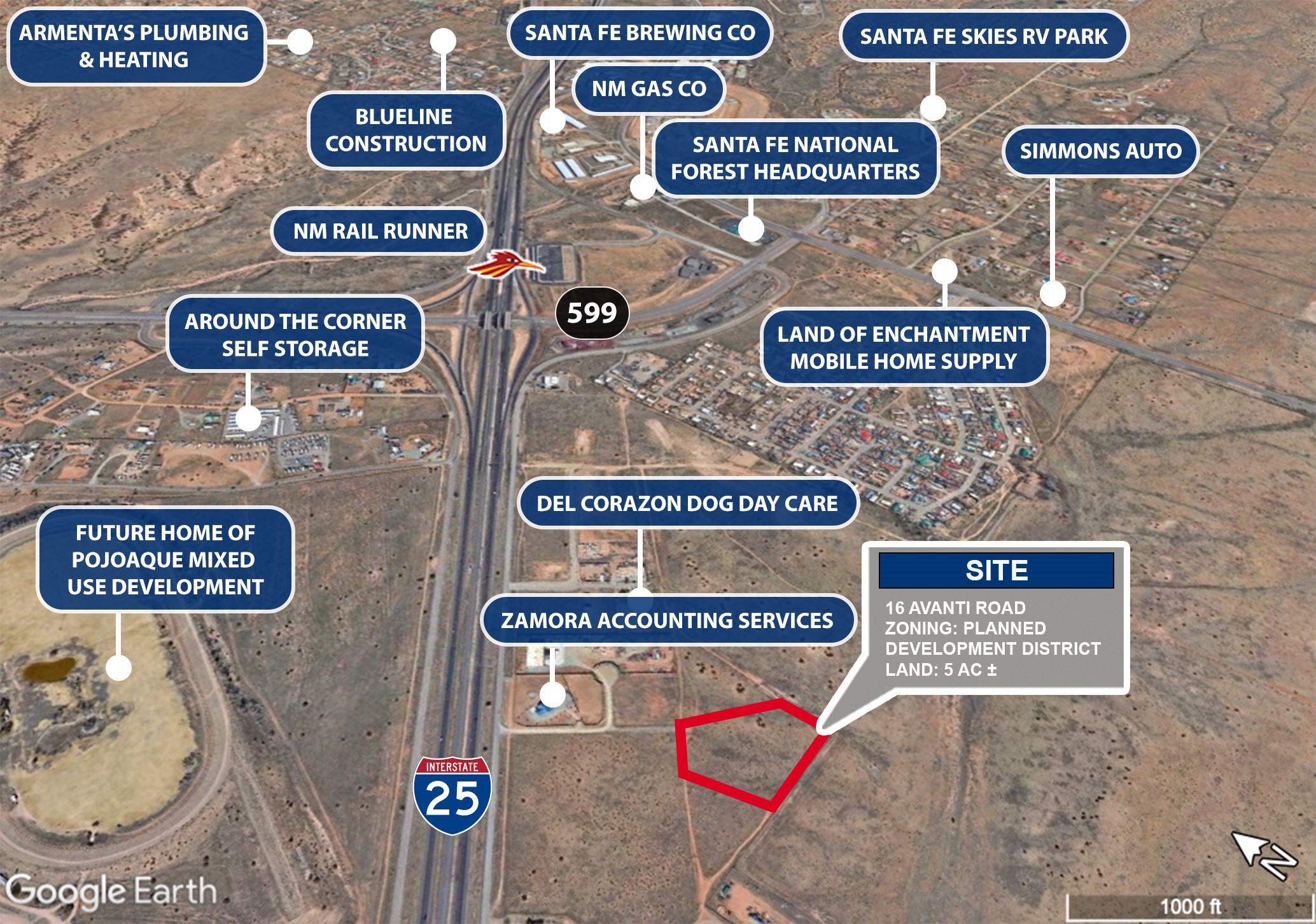 Commercial land near the I-25 East Frontage Road in Santa Fe County. Water, gas and electrical utilities are available on the frontage road and need to be extended. Zoning is Planned Development District allowing for commercial, industrial, residential, hotel/motel, religious, educational, and more. Sale is subject to a lot split by seller prior to closing.