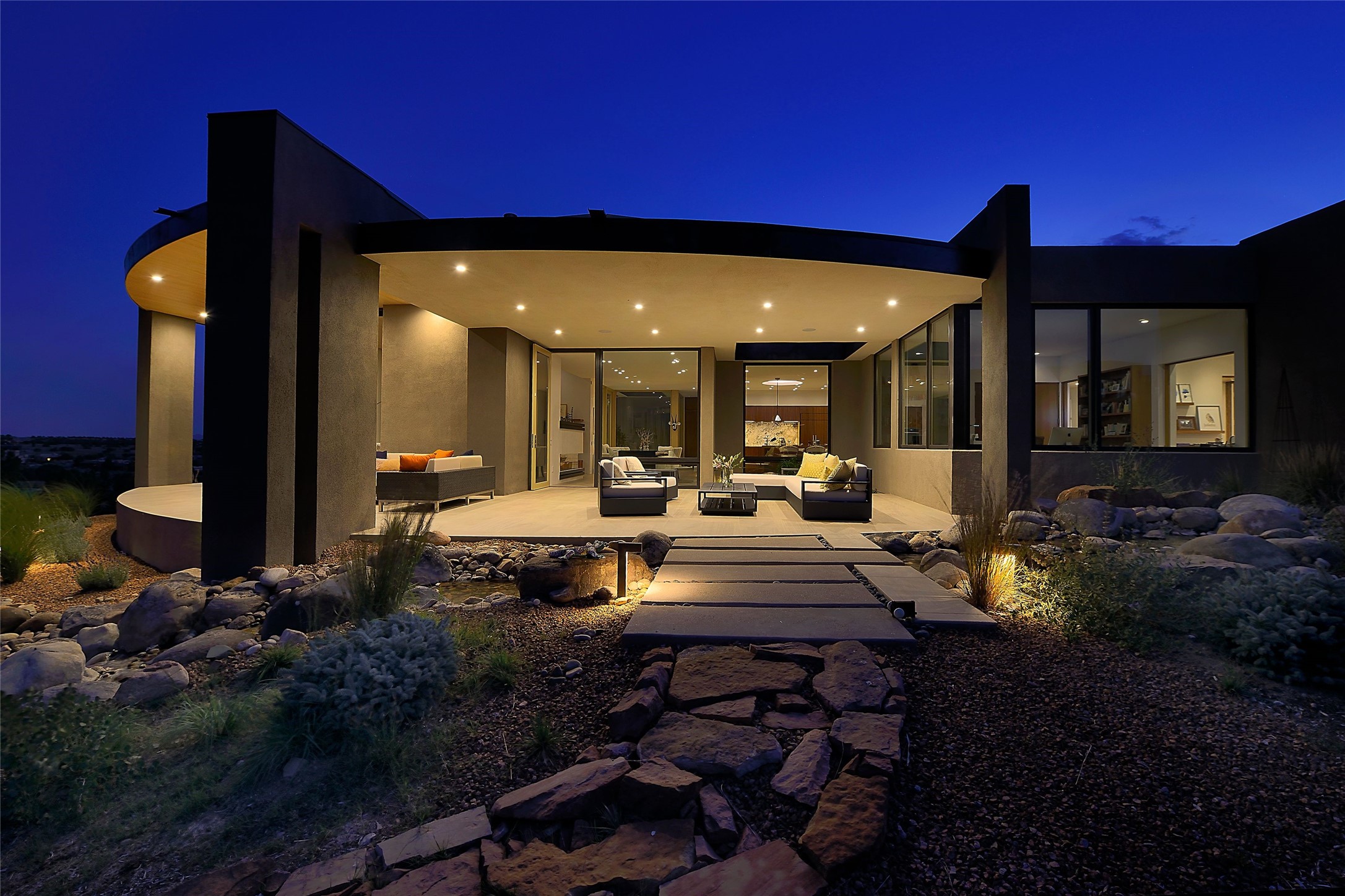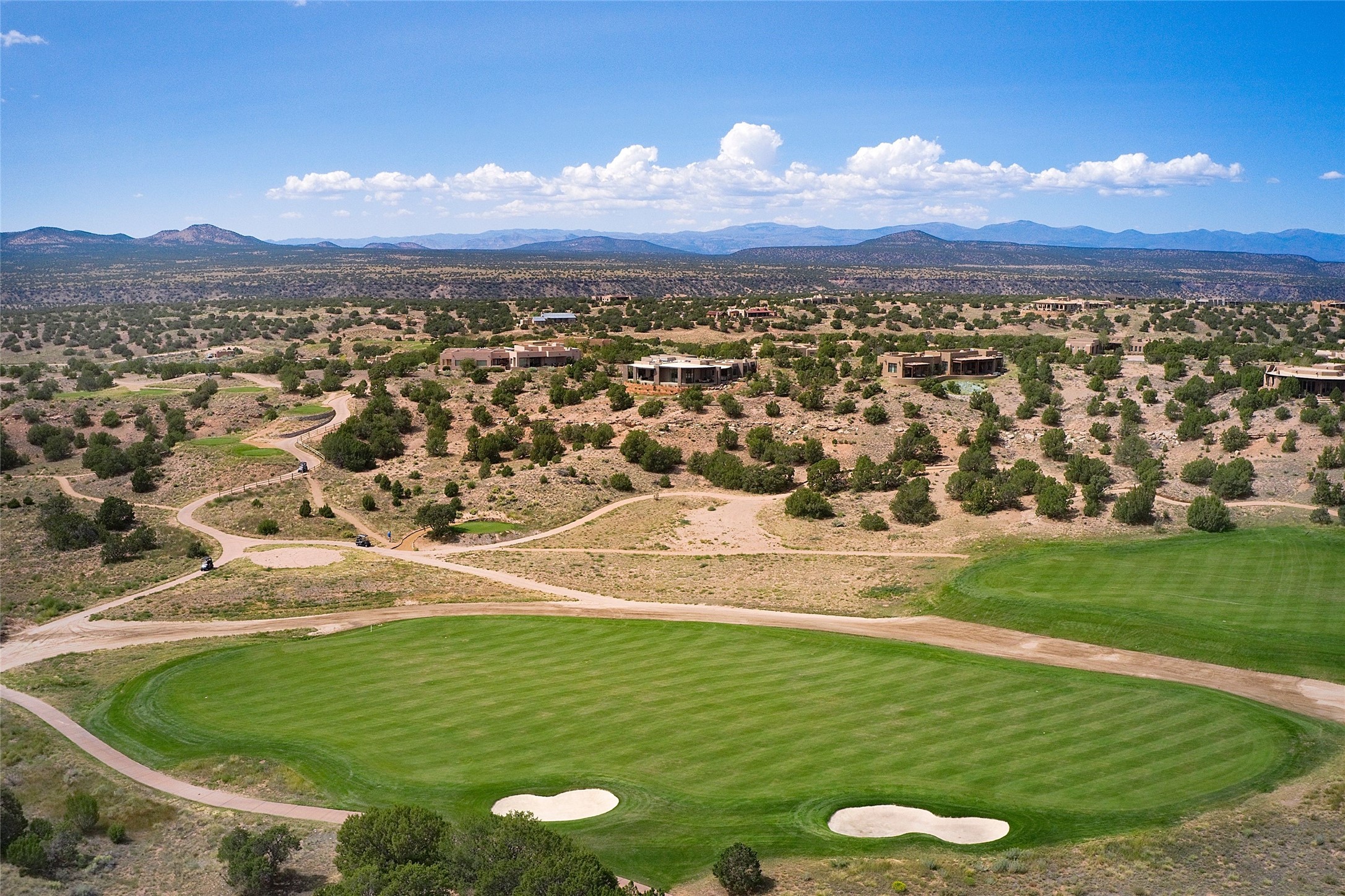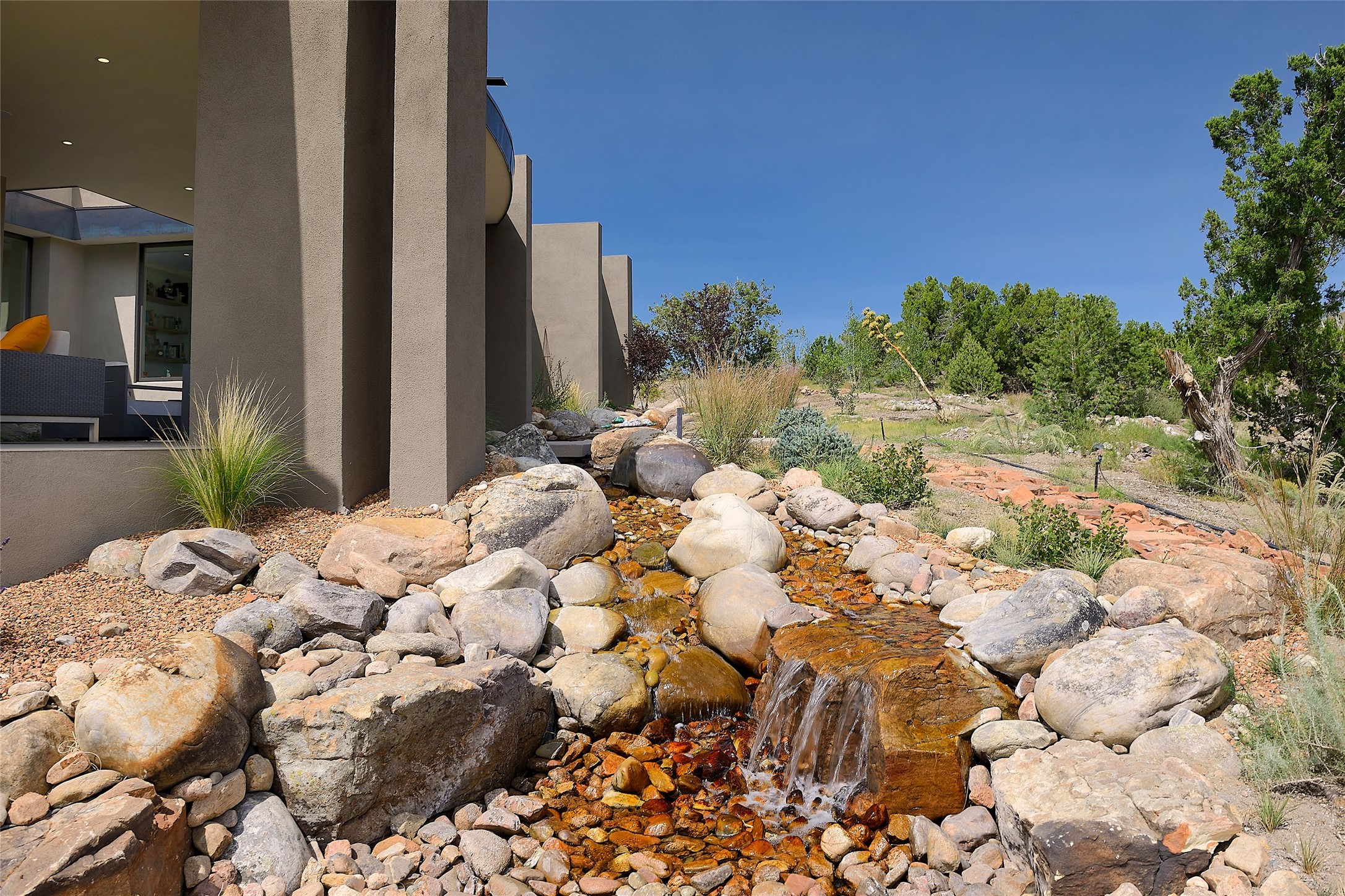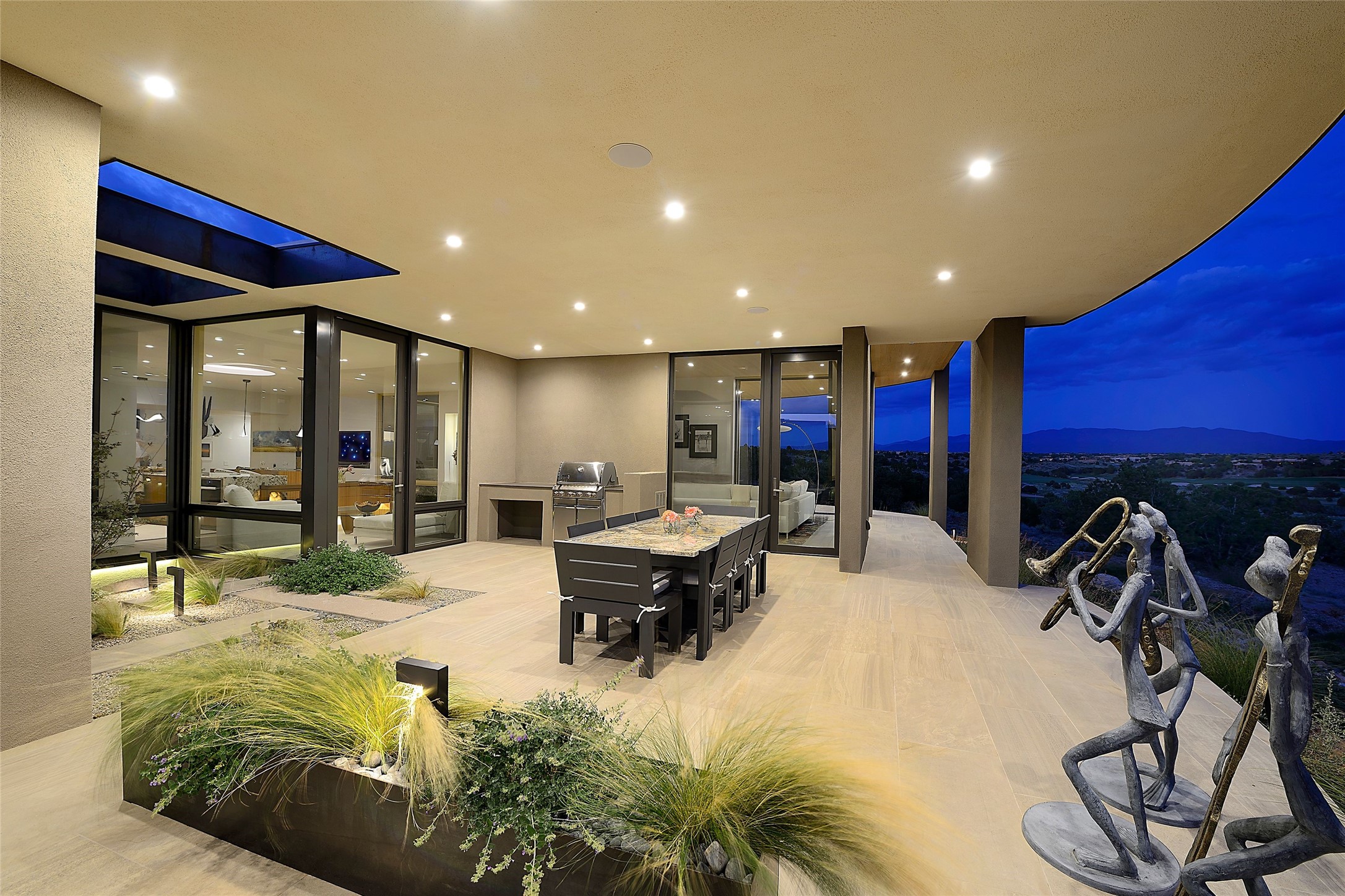 Elegant 2020 Haciendas Parade of Homes Winner, by Tierra Concepts and architect Craig Hoopes, offers a captivating blend of creative comfort and architectural surprises at every turn. This 3-bedroom 3 bath masterpiece commands magnificent views of the Sangre de Cristo, Jemez, and Ortiz mountains. The interplay between intimacy and expansiveness is beautifully executed, with numerous strategically placed windows for breathtaking view corridors. Enter through the custom-crafted steel and glass pivot doors into 12-foot-high living room which opens to a voluminous wrap-around portal overlooking seven holes of the Las Campanas golf courses. The kitchen is a culinary delight with backlit, waterfall Alpine granite countertops, solid walnut cabinetry with soft-touch drawers, Miele appliances, and Subzero refrigerator. Celestial skylights overhead add a touch of wonder. Luxury primary suite with fireplace, asymmetrical backlit bookshelves, linen-covered wall panels, silk padded headboard, bathroom with dual-headed shower, soaking tub, and towel heating bar. Second suite, divided by walnut sliding pocket doors, offers flexibility as either a two-room guest suite or a guest room and studio. In addition, there is a third bedroom/office. Miniature gardens and a four-season bubbling brook. Landscaping by Serquis + Associates. Solar and 240-volt wiring in the oversized garage. Designed for the discerning homebuyer, this home is in the heart of the desirable Park Estates in Las Campanas.