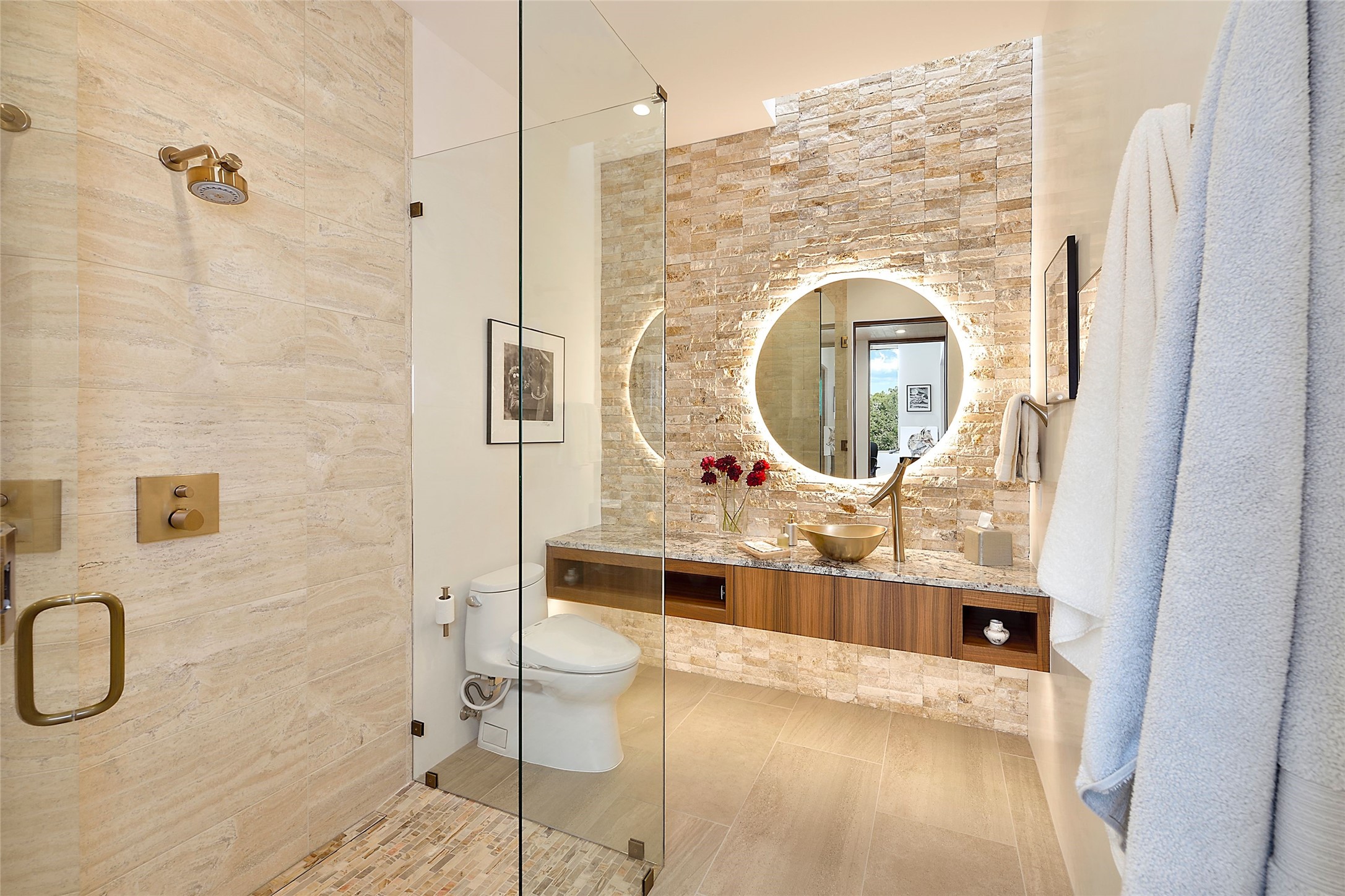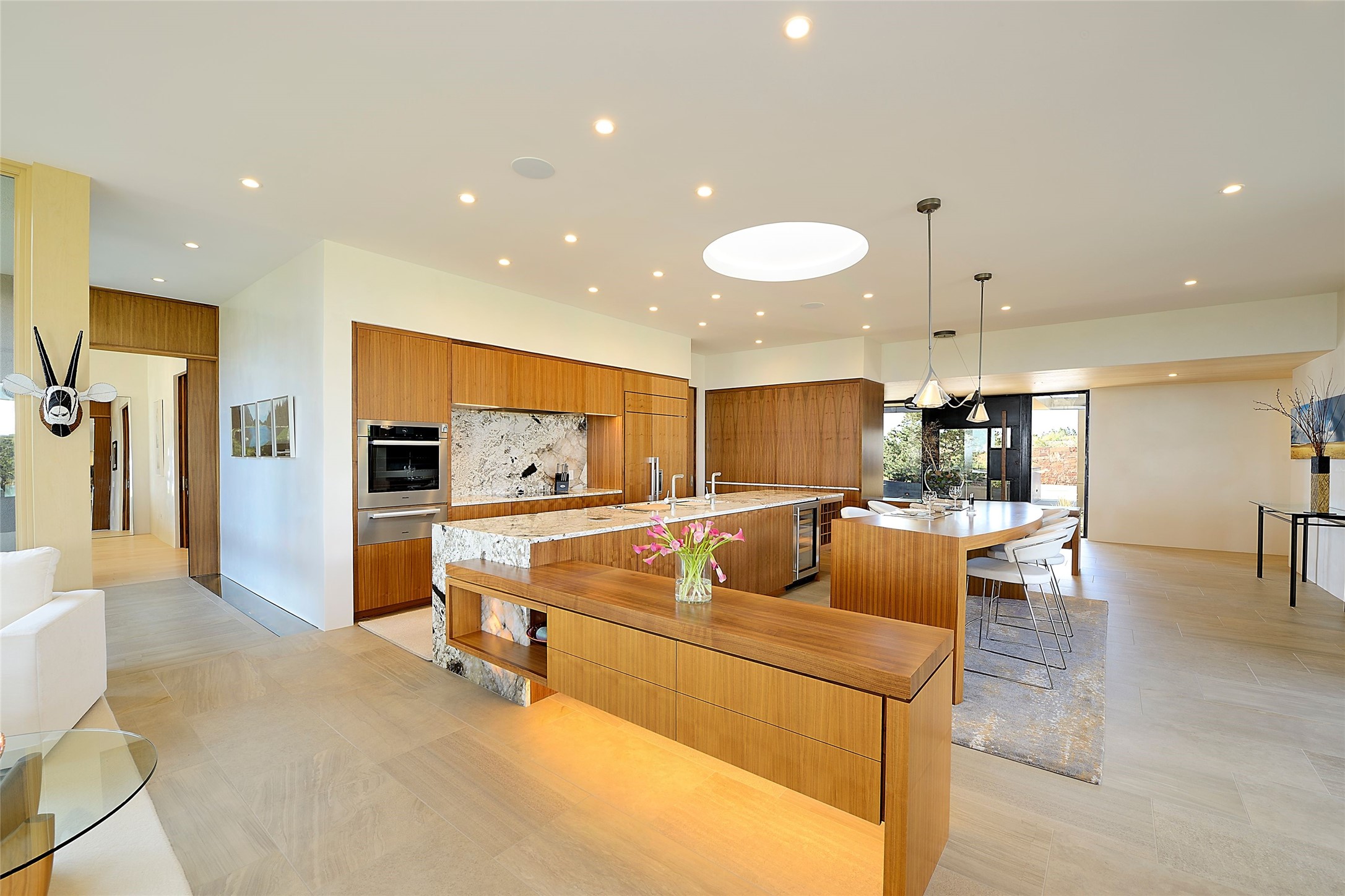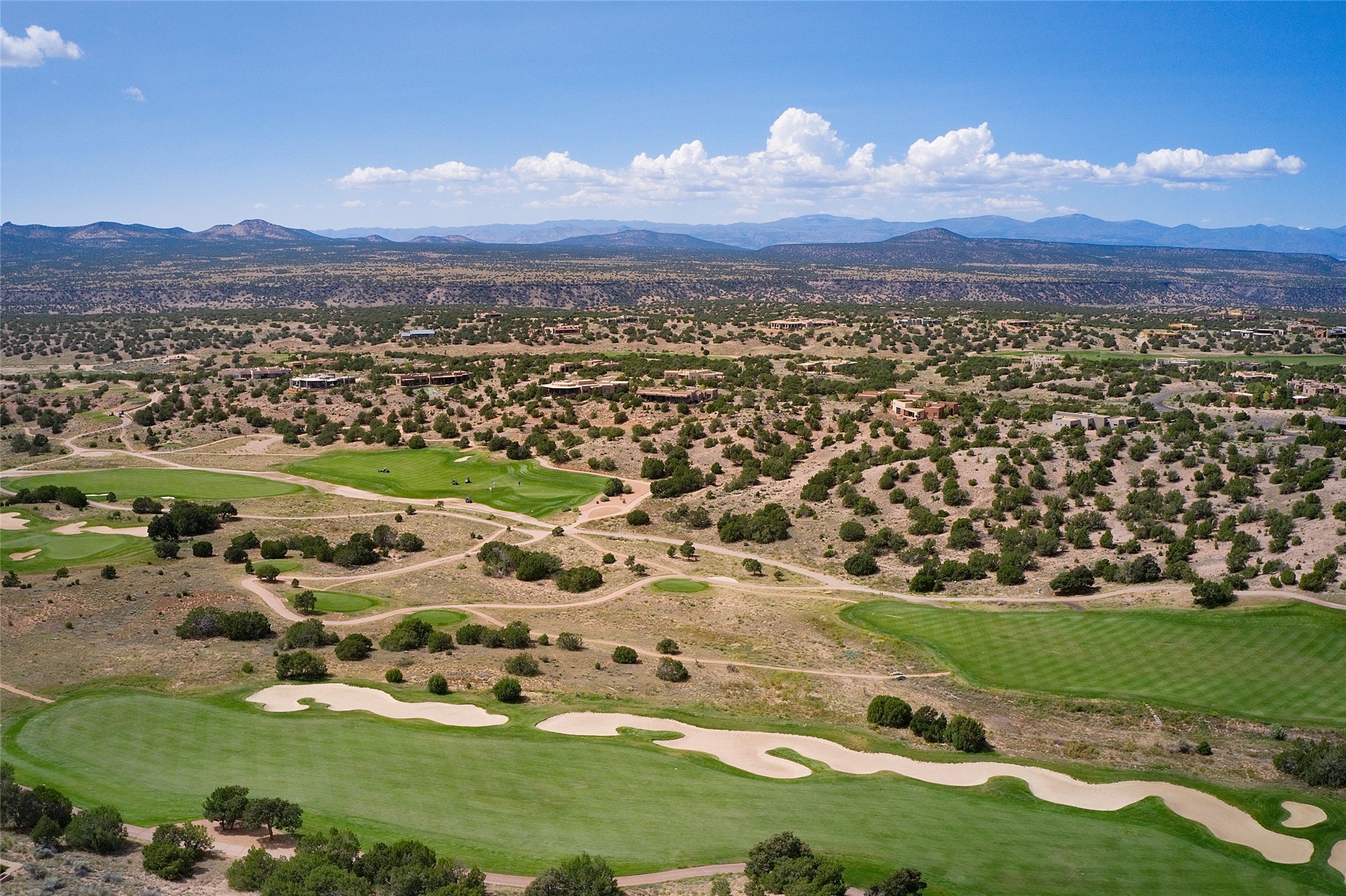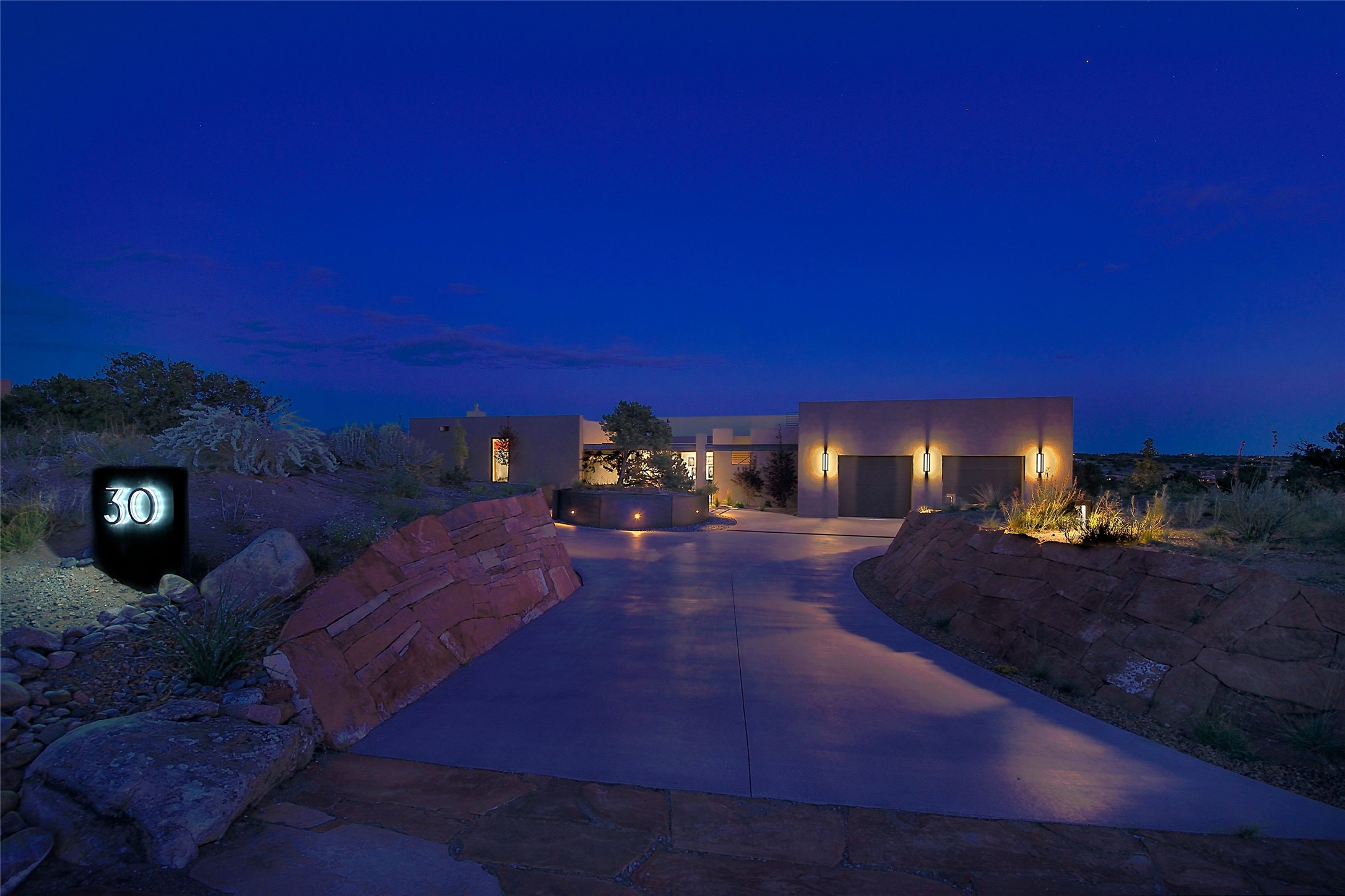 Elegant 2020 Haciendas Parade of Homes Winner, by Tierra Concepts and architect Craig Hoopes, offers a captivating blend of creative comfort and architectural surprises at every turn. This 3-bedroom 3 bath masterpiece commands magnificent views of the Sangre de Cristo, Jemez, and Ortiz mountains. The interplay between intimacy and expansiveness is beautifully executed, with numerous strategically placed windows for breathtaking view corridors. Enter through the custom-crafted steel and glass pivot doors into 12-foot-high living room which opens to a voluminous wrap-around portal overlooking seven holes of the Las Campanas golf courses. The kitchen is a culinary delight with backlit, waterfall Alpine granite countertops, solid walnut cabinetry with soft-touch drawers, Miele appliances, and Subzero refrigerator. Celestial skylights overhead add a touch of wonder. Luxury primary suite with fireplace, asymmetrical backlit bookshelves, linen-covered wall panels, silk padded headboard, bathroom with dual-headed shower, soaking tub, and towel heating bar. Second suite, divided by walnut sliding pocket doors, offers flexibility as either a two-room guest suite or a guest room and studio. In addition, there is a third bedroom/office. Miniature gardens and a four-season bubbling brook. Landscaping by Serquis + Associates. Solar and 240-volt wiring in the oversized garage. Designed for the discerning homebuyer, this home is in the heart of the desirable Park Estates in Las Campanas.