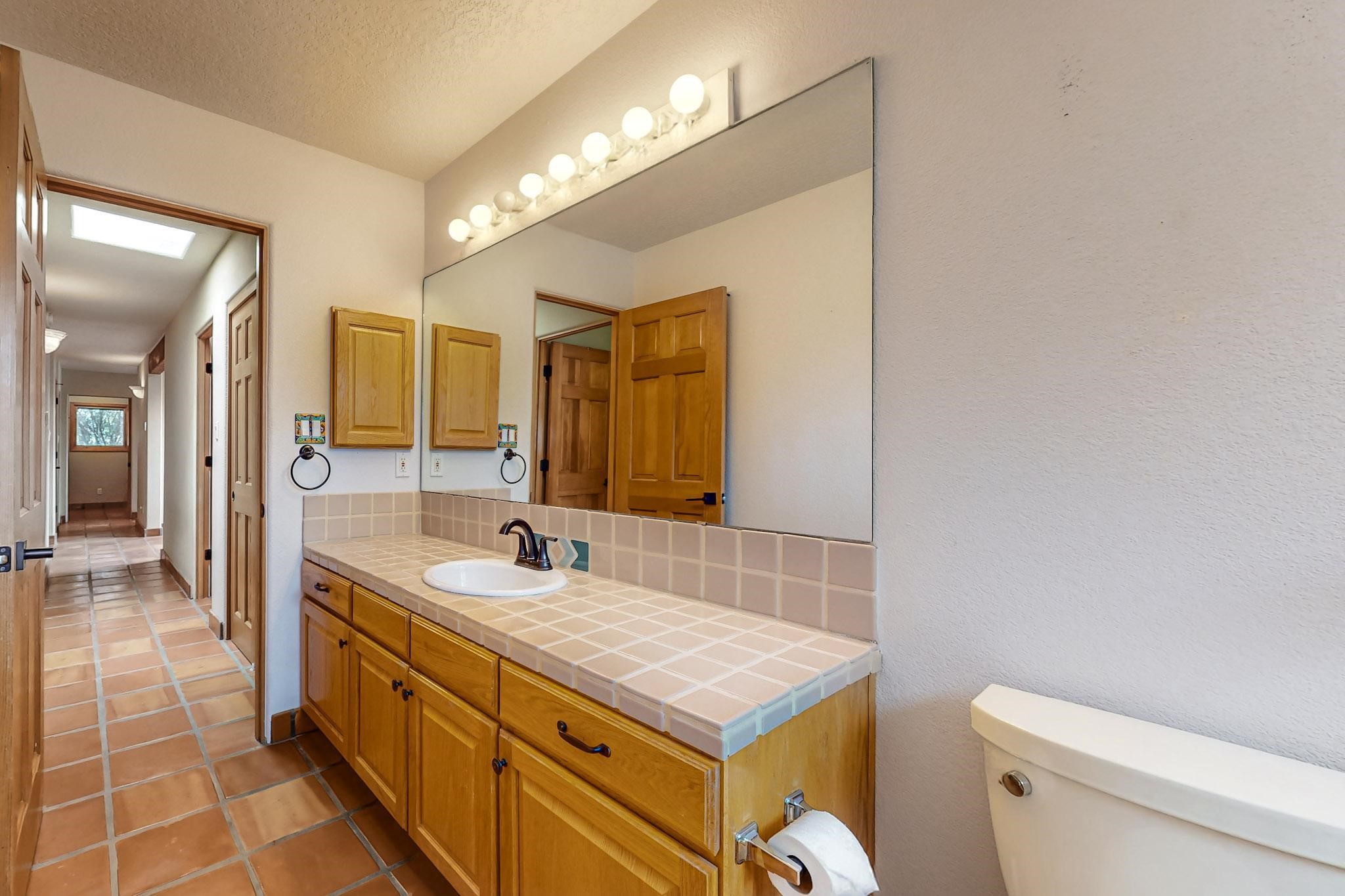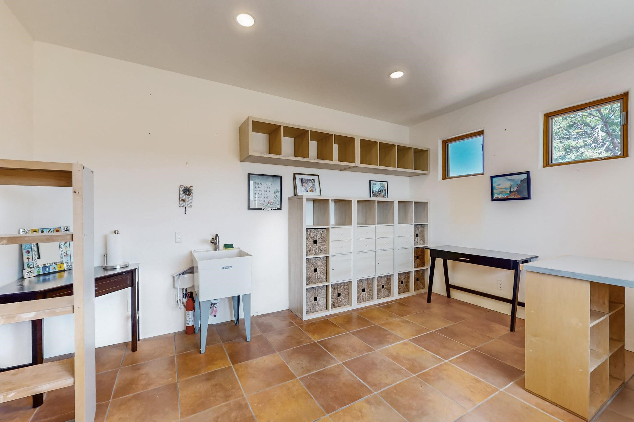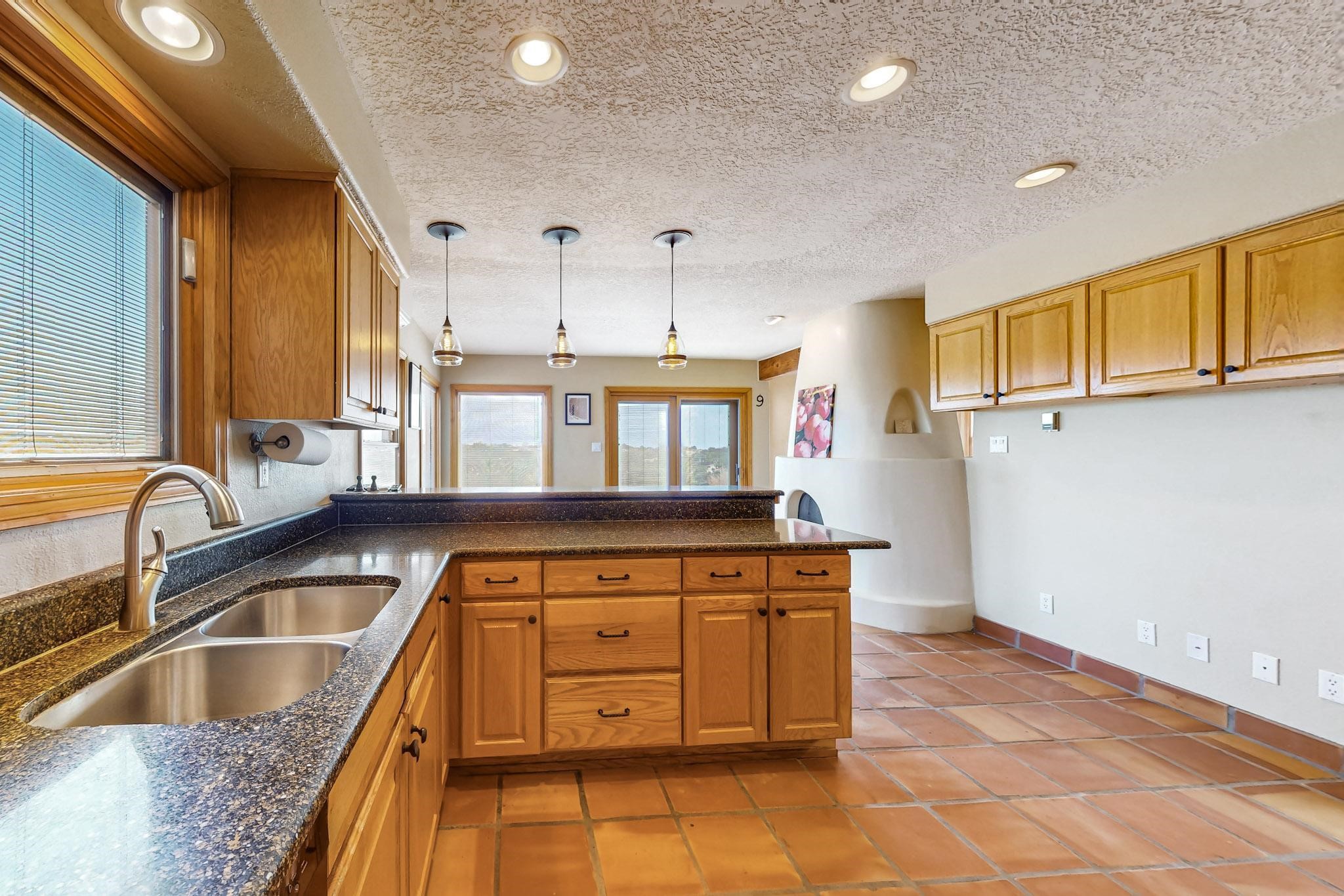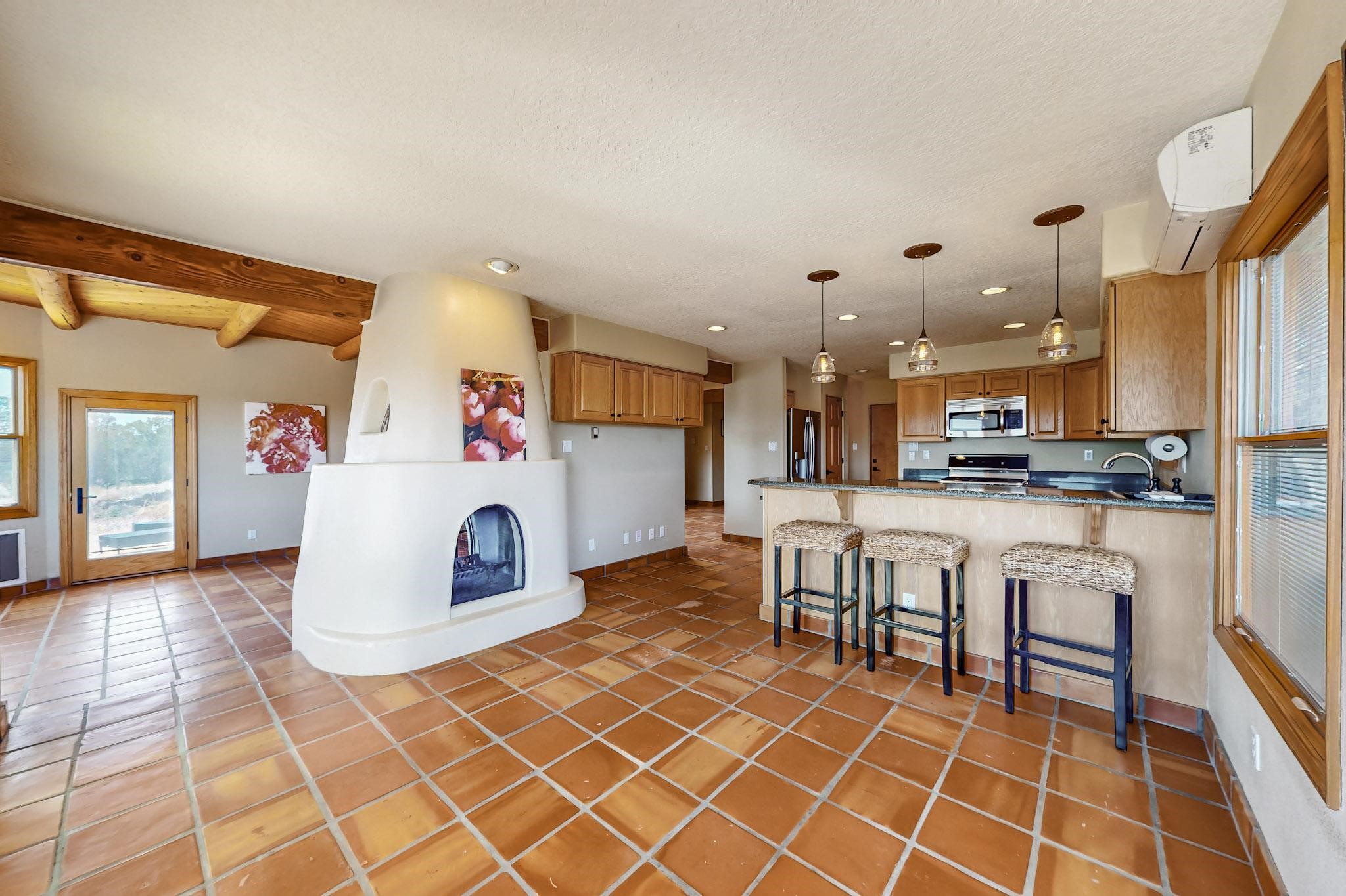 A rare find in Eldorado bordering a 62acre greenbelt dramatically visible through a large picture window on entering this home. Lovely romantic design custom built by Homes by Marie for the original artist owner in 1995 plus a detached studio added by the new artist owner only 3 years ago. A contemporary pueblo look with Santa Fe detailing throughout. A central 2 way kiva fireplace between the dining and living room, beam ceilings, Saltillo floors, bancos and carved twisted beams add southwest charm and character. Natural gas radiant heating, re stuccoed in 2019, community water, high speed internet and interior window blinds. One of the two guest bedrooms was originally a studio and has Saltillo tile, the other has an older carpet. The main bedroom suite, dining room and living room access the patio and fenced rear yard overlooking the greenbelt to sunset and mountain views, There is a large 2 car finished garage with plenty of parking, and a wonderful heat/ac studio, artist ready with a sink and plenty of storage. On 1.33 acres, centrally located in Eldorado within easy reach of all amenities, local shopping, schools, trails, parks, library and senior centre only minutes into Santa Fe.
