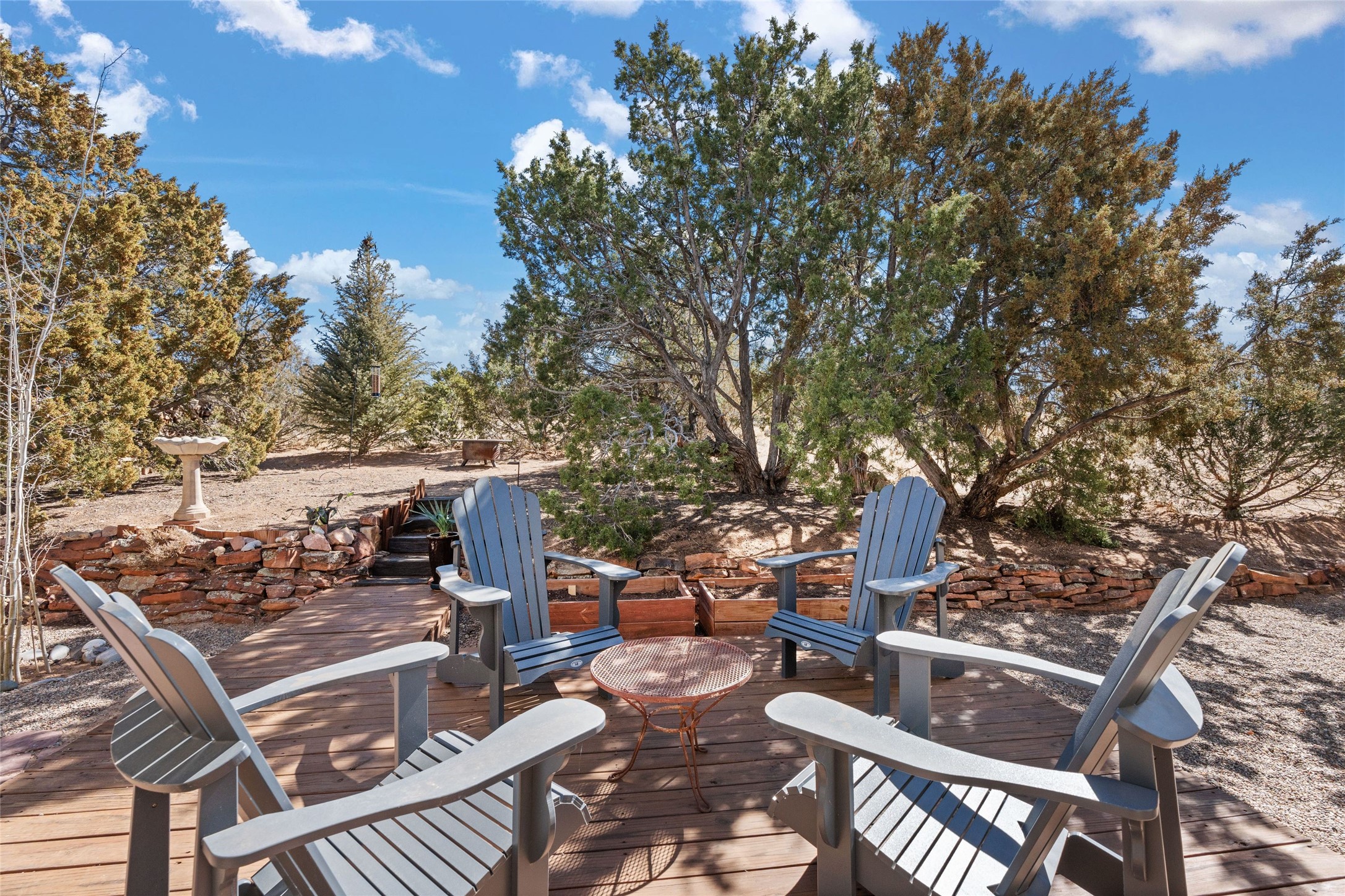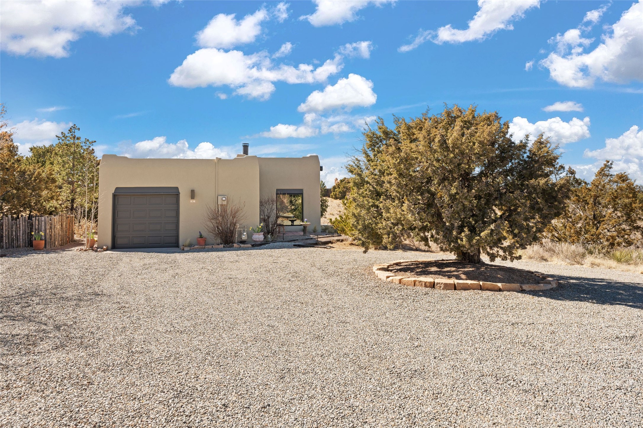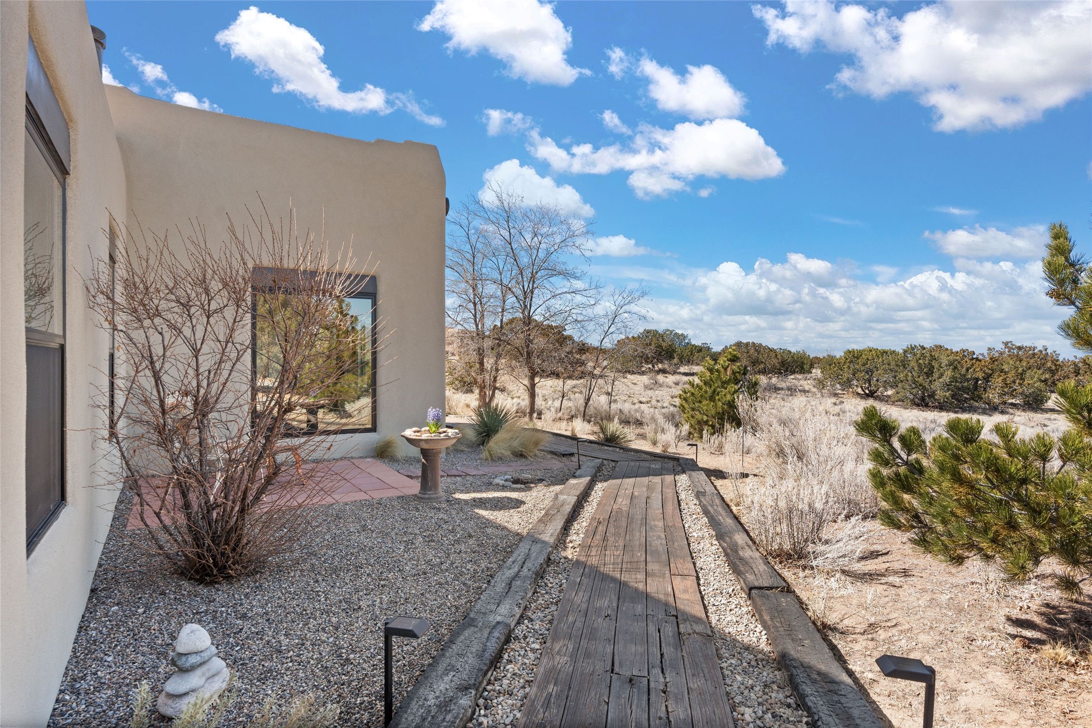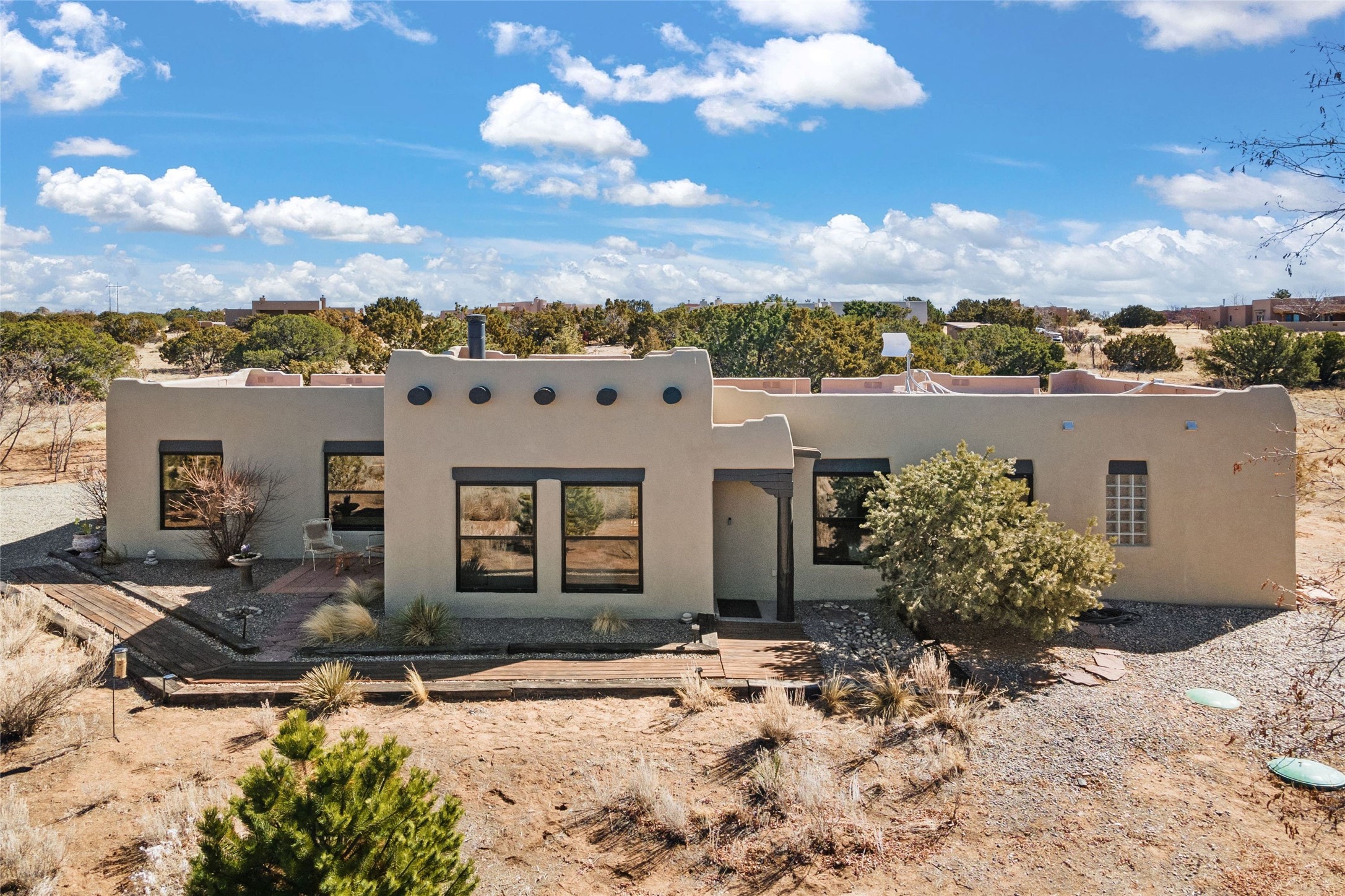 Nestled in the desirable Eldorado Community, this beautifully updated home seamlessly combines modern innovation with timeless Southwestern charm. Located in a certified dark sky community, Eldorado features expansive landscapes, scenic walking trails, a community pool, tennis courts, and a vibrant clubhouse, all just minutes away from Santa Fe. Set on a serene 1.4-acre lot, 21 Estambre Rd offers privacy with mature native trees, xeriscaped landscaping, and solar-lit pathways leading to a spacious back deck--an ideal setting to unwind and take in the breathtaking views of the Sangre De Cristo mountains and sunsets over the Jemez Mountains. Inside, meticulous attention to detail is evident throughout. The remodeled kitchen boasts high-end stainless steel appliances, custom KraftMaid cabinetry, and butcher block countertops, seamlessly flowing into sun-drenched open living spaces framed by energy-efficient Pella windows that showcase stunning views. The primary suite serves as a private retreat, featuring a spa-inspired bath with a curbless walk-in shower. The guest bath exudes vintage elegance with a classic cast iron clawfoot tub. Solid wood doors, premium fixtures, and refined finishes elevate the home's warm and inviting atmosphere. Designed for comfort and efficiency, the home includes a newly installed Mitsubishi heat pump offering climate-controlled heating and cooling, an upgraded electrical panel with whole-house surge protection, a high-performance Rheem water heater, and a North Star water treatment system with a 5-stage reverse osmosis system. Thoughtful details such as smart combination outlets and energy-efficient windows enhance everyday living. Fresh stucco adds to the home's curb appeal, ensuring a timeless look for years to come. With extensive upgrades, incredible views, and quick access to Eldorado's shopping, dining, and community amenities, this home perfectly blends modern convenience, natural beauty, and classic Santa Fe living.