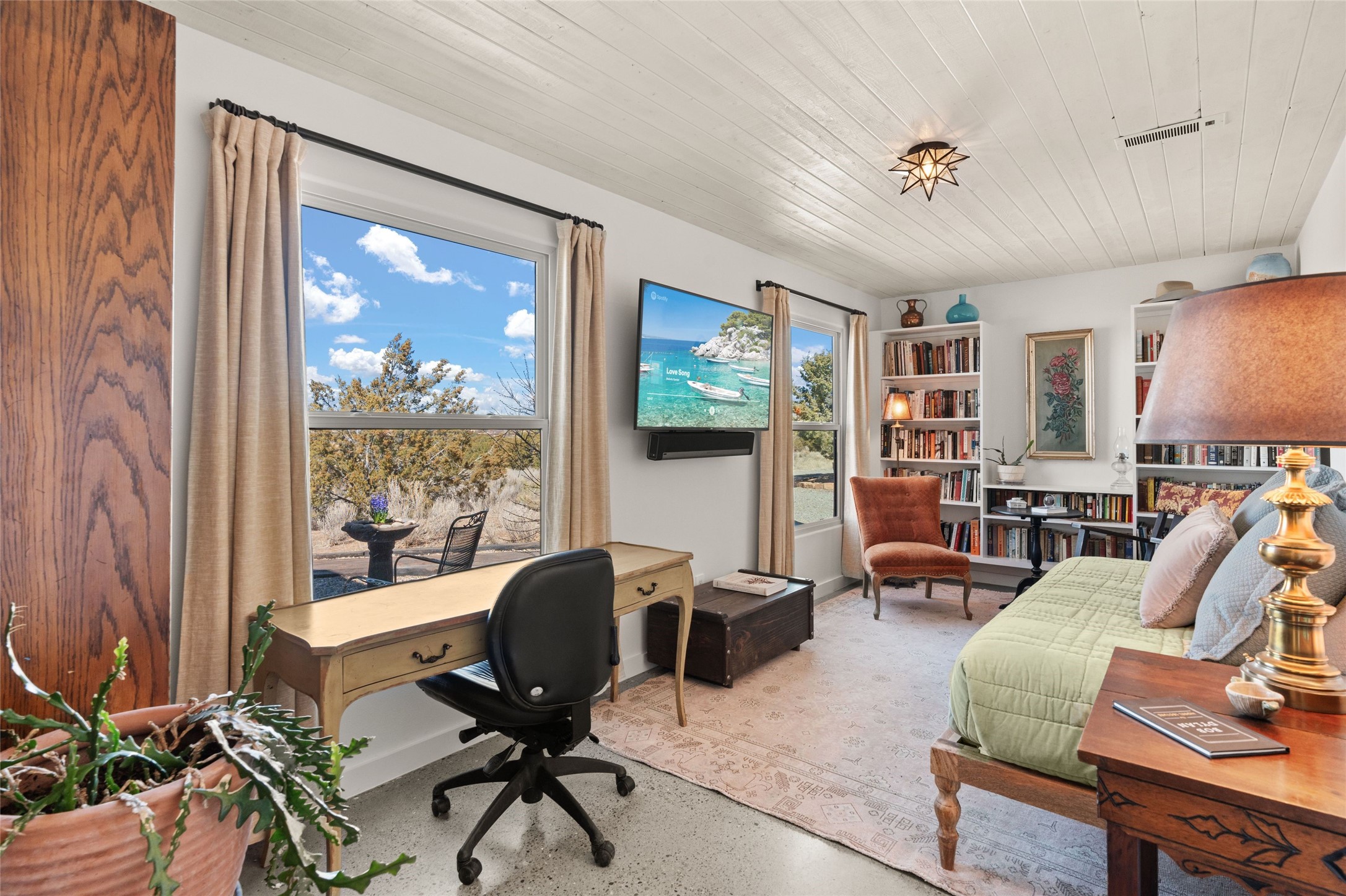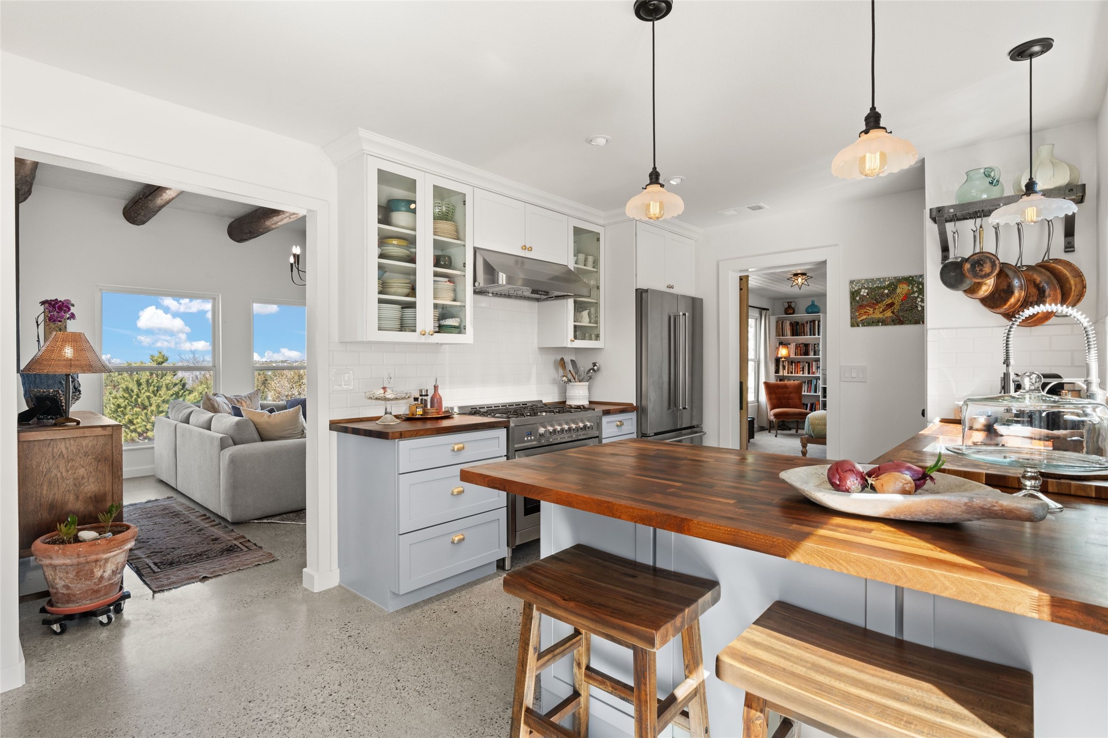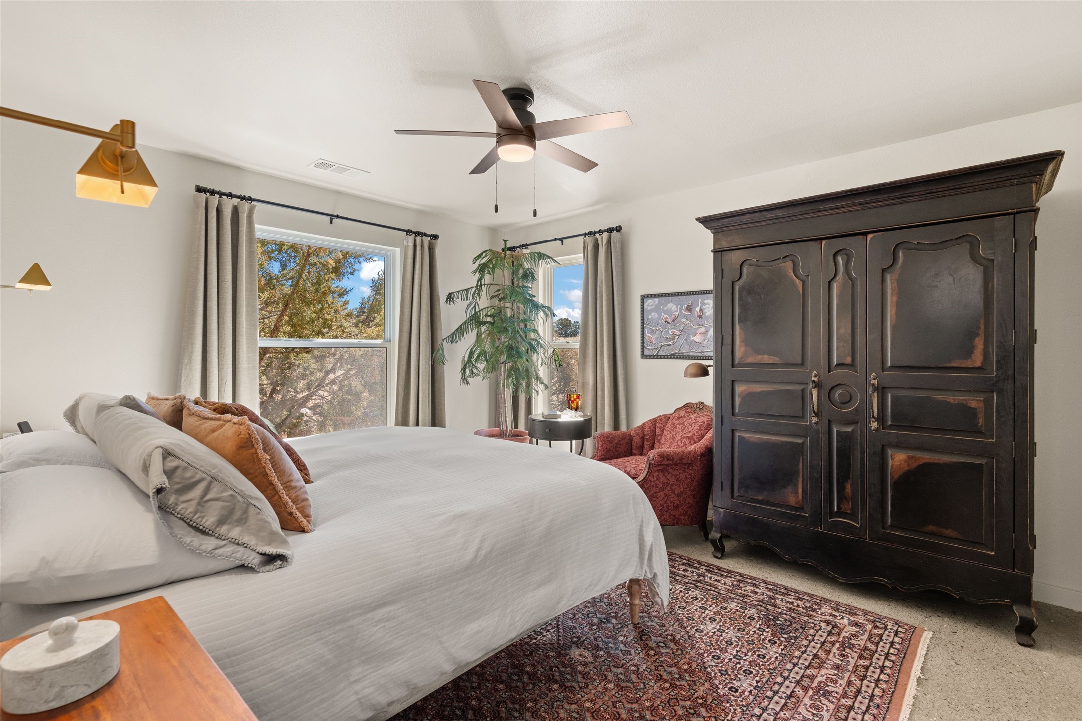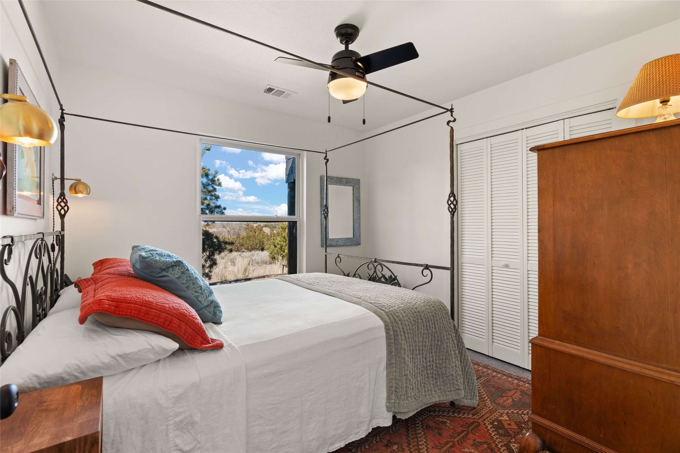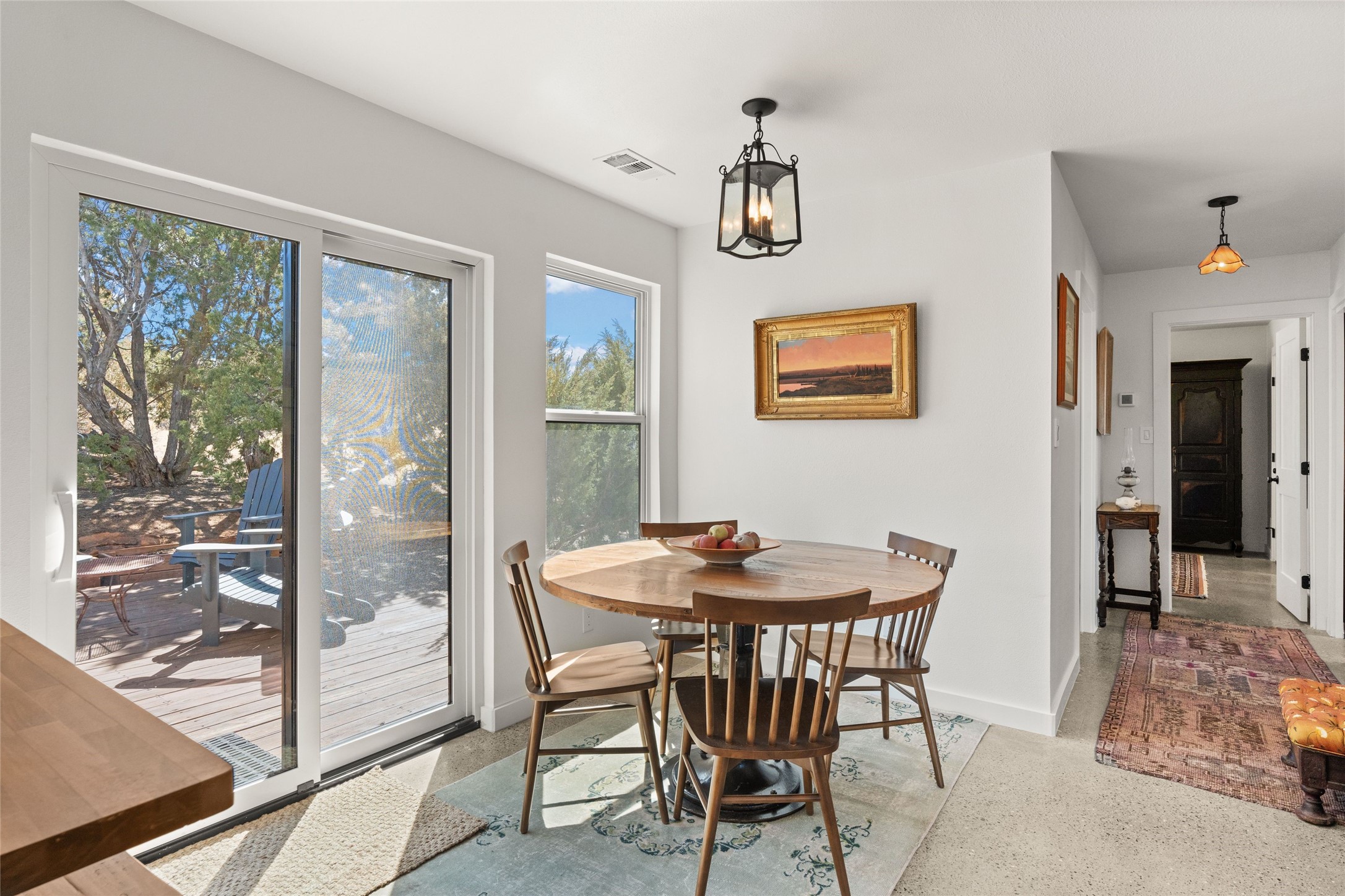 Nestled in the desirable Eldorado Community, this beautifully updated home seamlessly combines modern innovation with timeless Southwestern charm. Located in a certified dark sky community, Eldorado features expansive landscapes, scenic walking trails, a community pool, tennis courts, and a vibrant clubhouse, all just minutes away from Santa Fe. Set on a serene 1.4-acre lot, 21 Estambre Rd offers privacy with mature native trees, xeriscaped landscaping, and solar-lit pathways leading to a spacious back deck--an ideal setting to unwind and take in the breathtaking views of the Sangre De Cristo mountains and sunsets over the Jemez Mountains. Inside, meticulous attention to detail is evident throughout. The remodeled kitchen boasts high-end stainless steel appliances, custom KraftMaid cabinetry, and butcher block countertops, seamlessly flowing into sun-drenched open living spaces framed by energy-efficient Pella windows that showcase stunning views. The primary suite serves as a private retreat, featuring a spa-inspired bath with a curbless walk-in shower. The guest bath exudes vintage elegance with a classic cast iron clawfoot tub. Solid wood doors, premium fixtures, and refined finishes elevate the home's warm and inviting atmosphere. Designed for comfort and efficiency, the home includes a newly installed Mitsubishi heat pump offering climate-controlled heating and cooling, an upgraded electrical panel with whole-house surge protection, a high-performance Rheem water heater, and a North Star water treatment system with a 5-stage reverse osmosis system. Thoughtful details such as smart combination outlets and energy-efficient windows enhance everyday living. Fresh stucco adds to the home's curb appeal, ensuring a timeless look for years to come. With extensive upgrades, incredible views, and quick access to Eldorado's shopping, dining, and community amenities, this home perfectly blends modern convenience, natural beauty, and classic Santa Fe living.